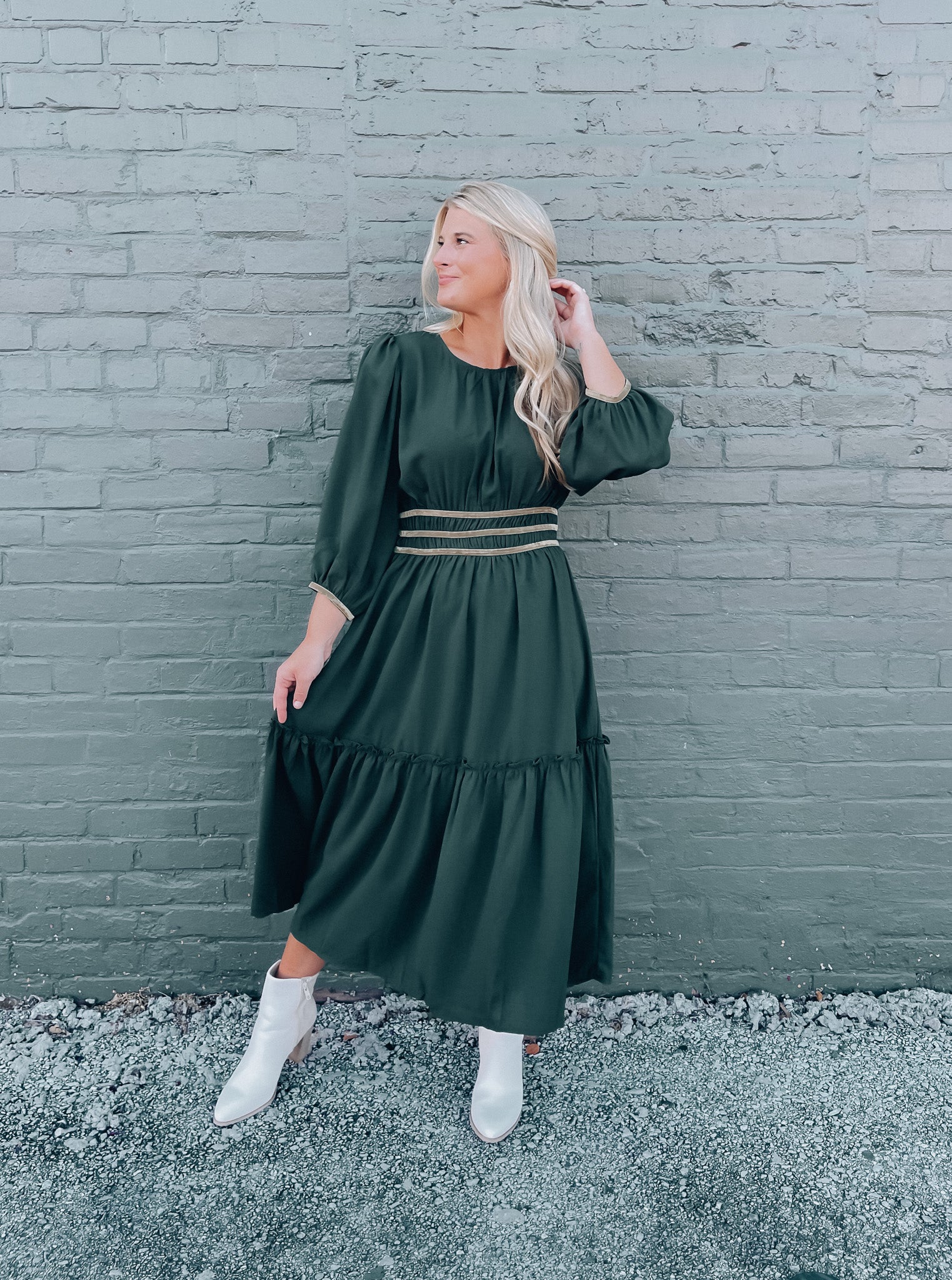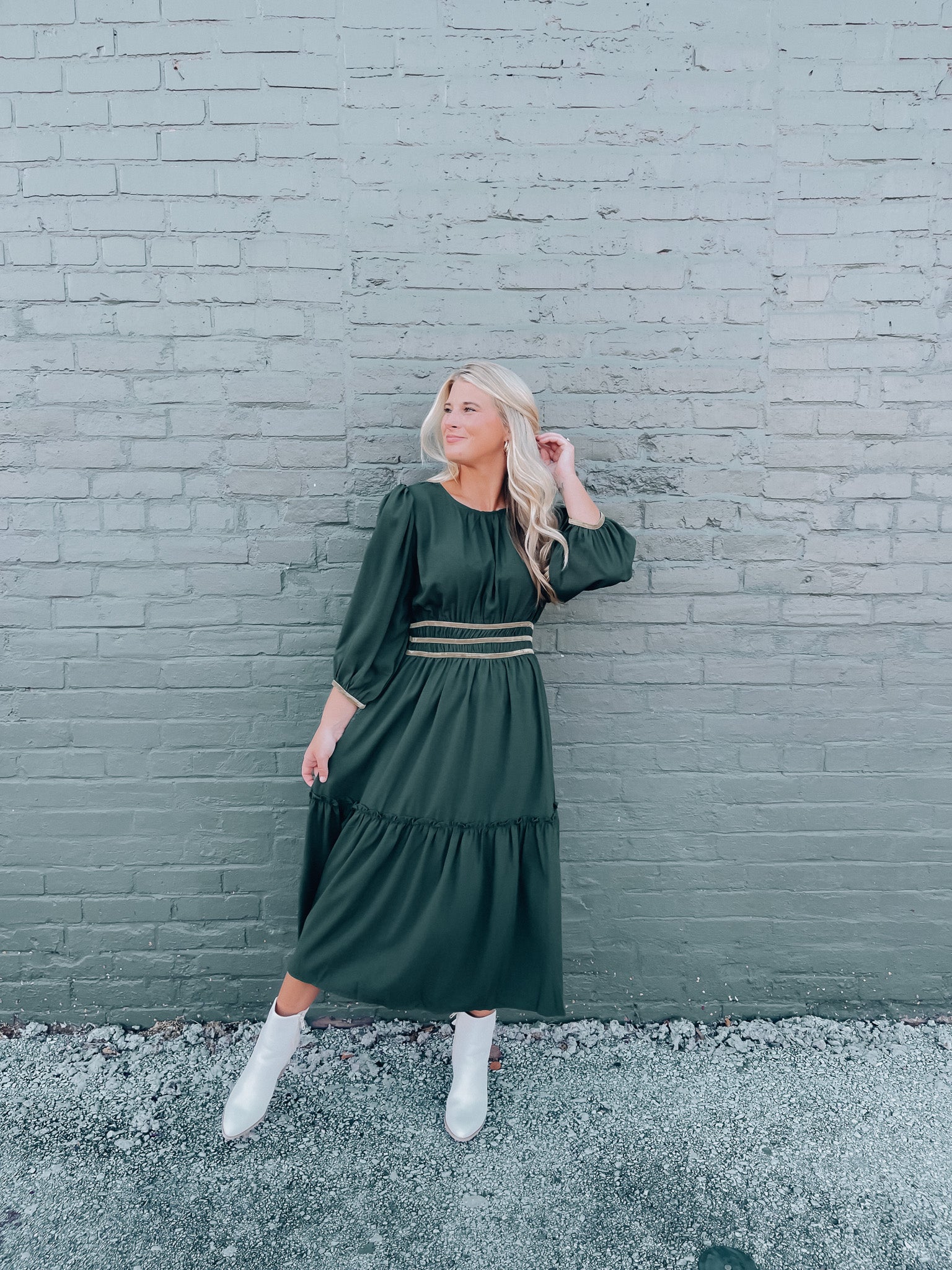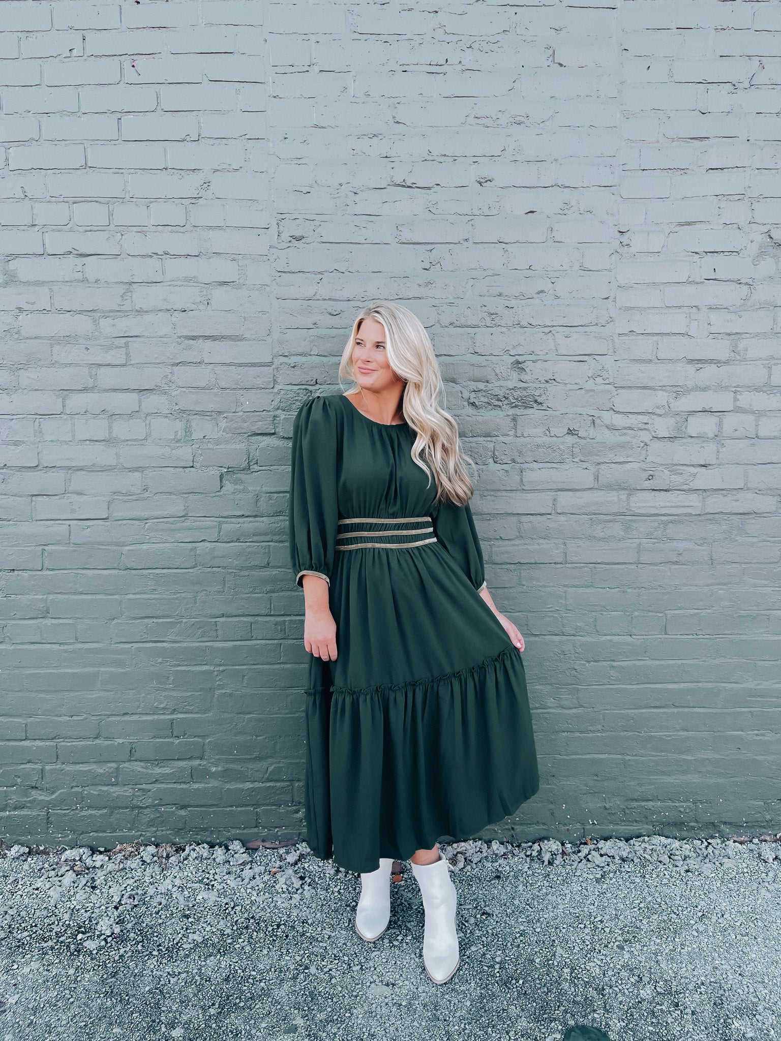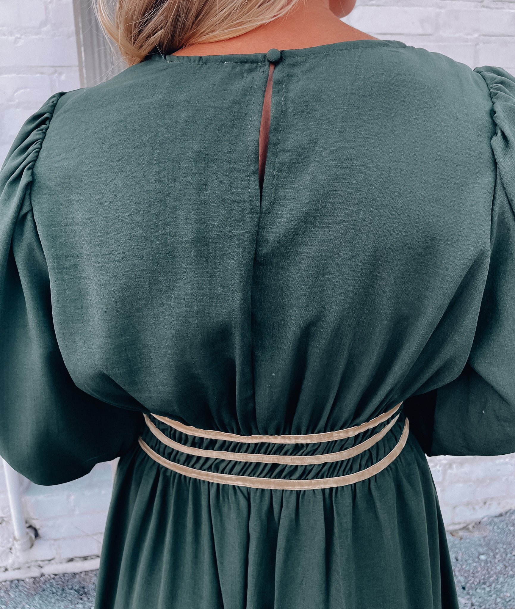 Elevate your fashion game with our Beautiful Botanicals Midi Dress! This stunning olive dress features a unique velvet trim and elastic waistband for a comfortable fit. Show off your style in this eye-catching piece that will have you feeling confident and chic.