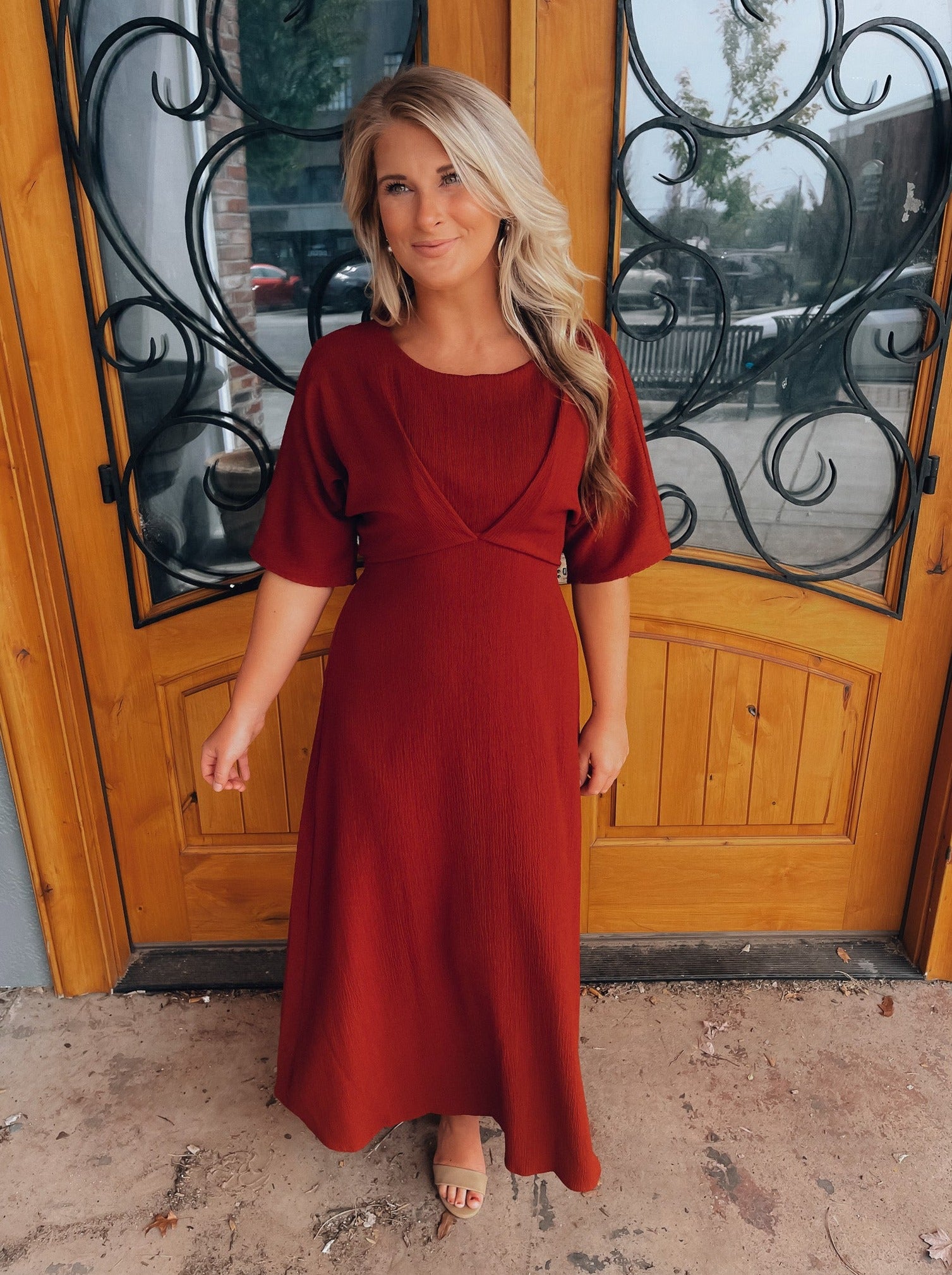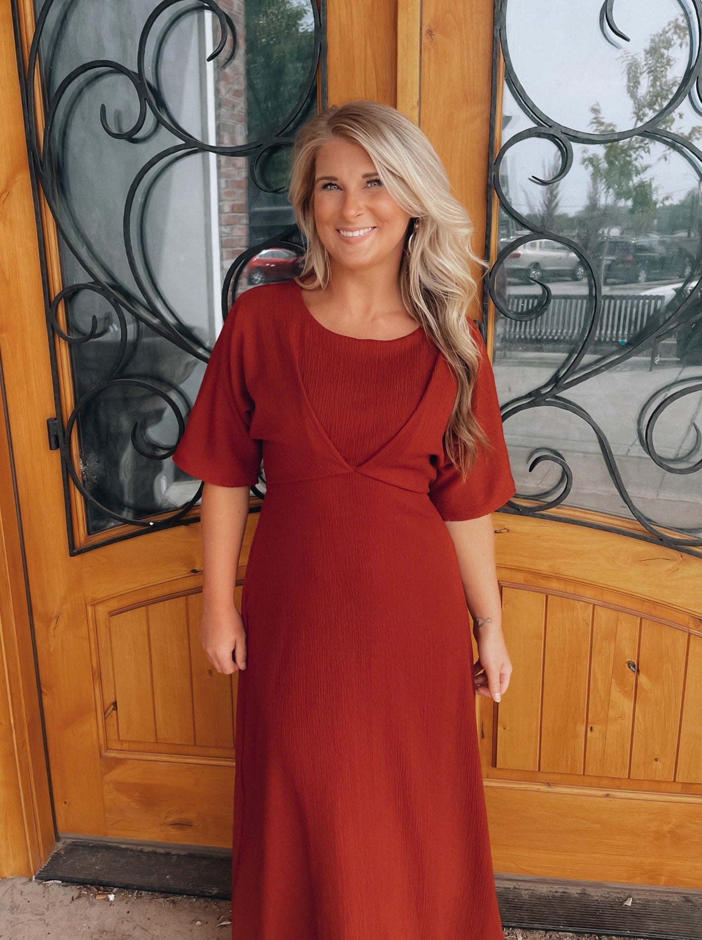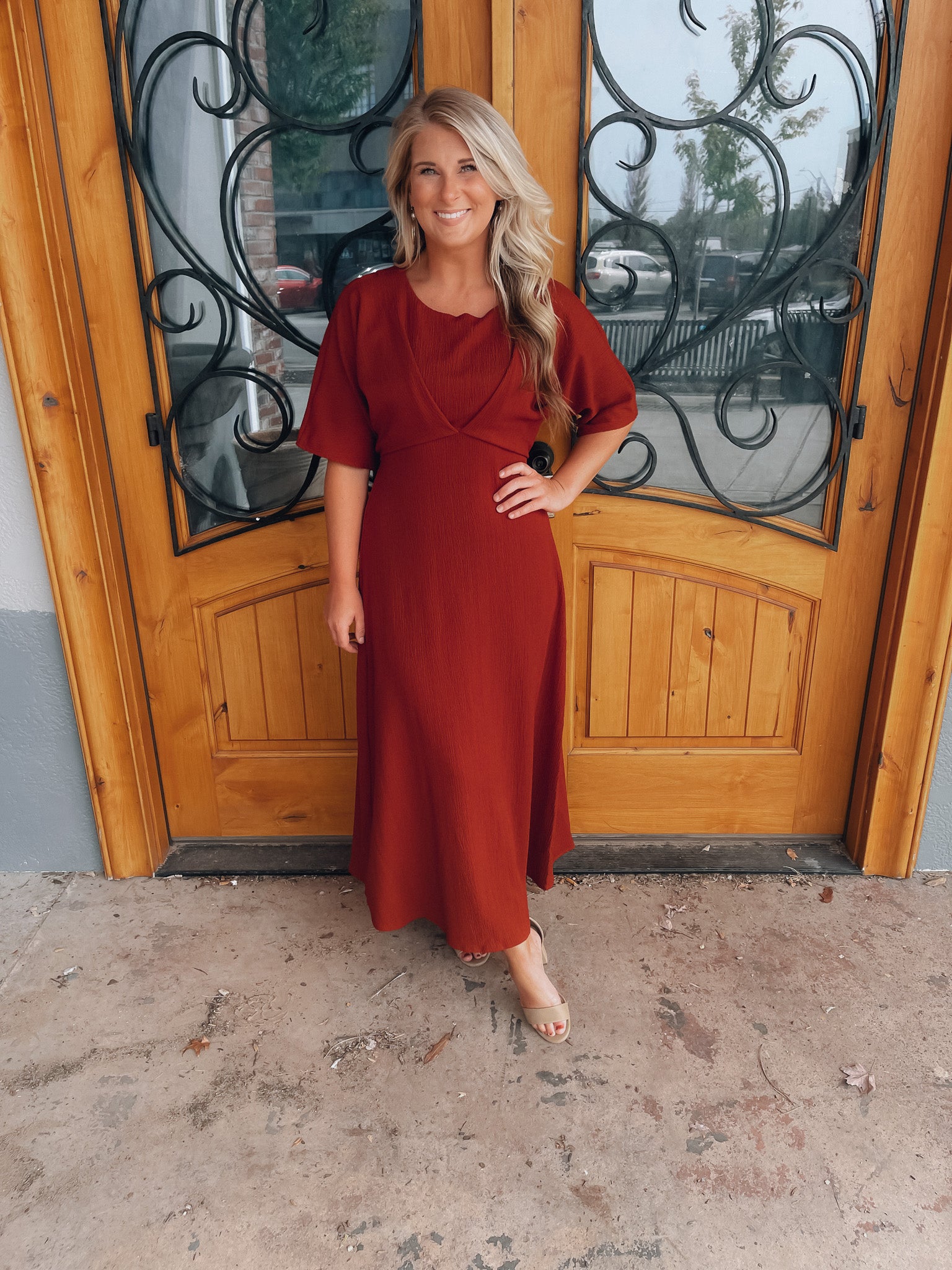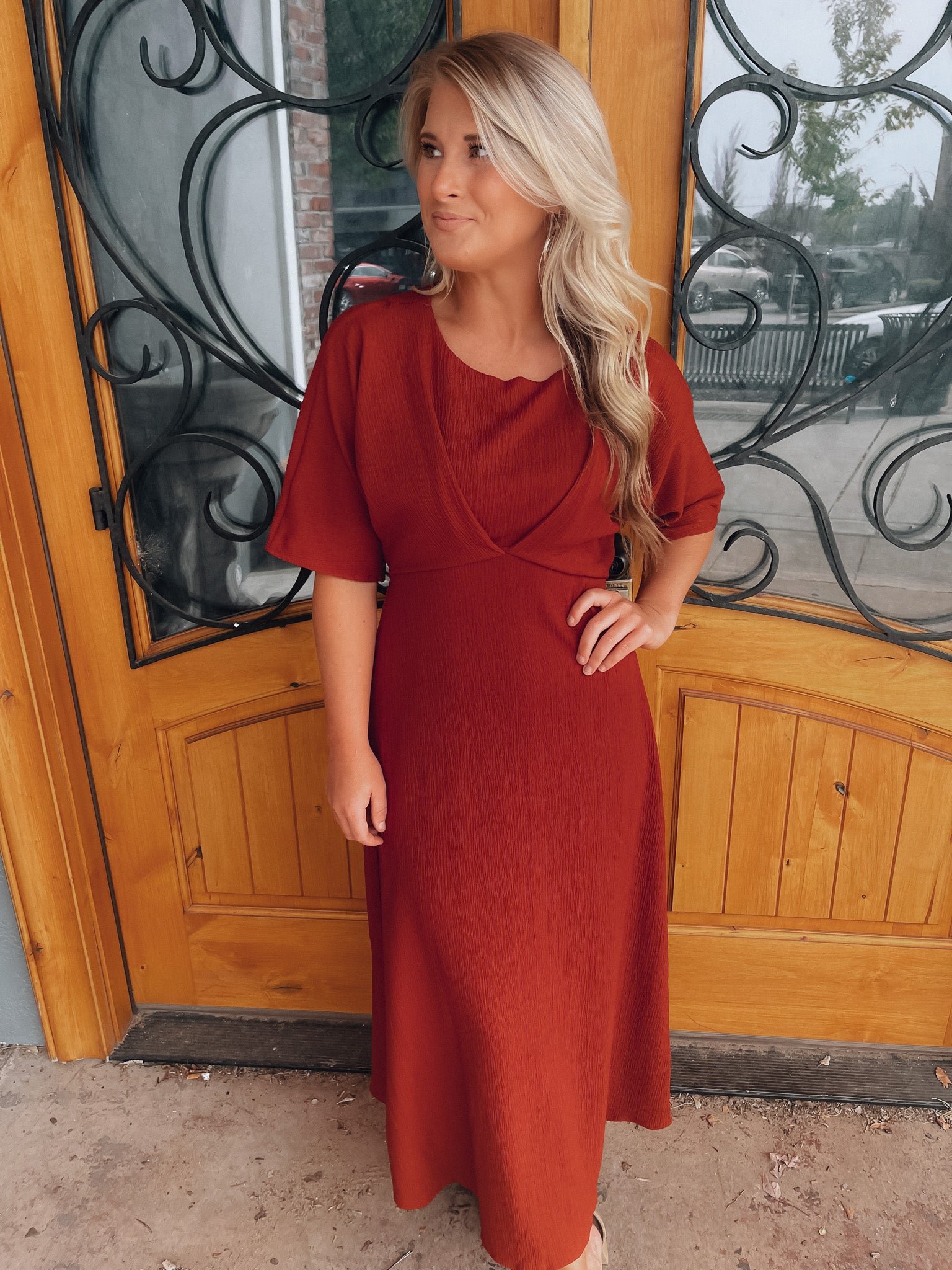 Make a bold statement in the Believing In You Rust Midi Dress. This rust-colored midi dress features kimono sleeves and a high waist pleated textured, giving you a fashion-forward look that's sure to turn heads. Perfect for special occasions or a night out, you'll love the confidence this dress brings. Believe in yourself and make a lasting impression!