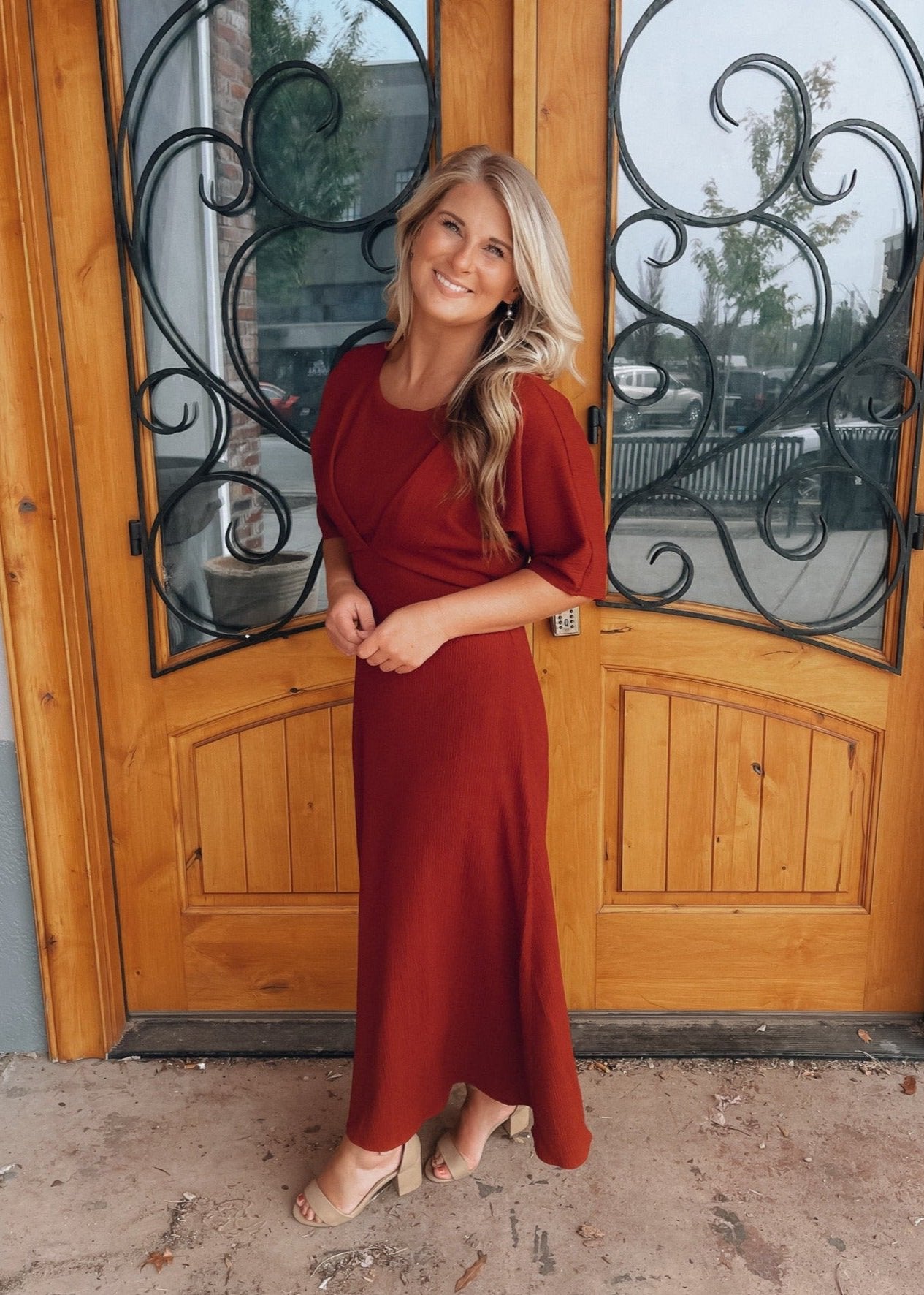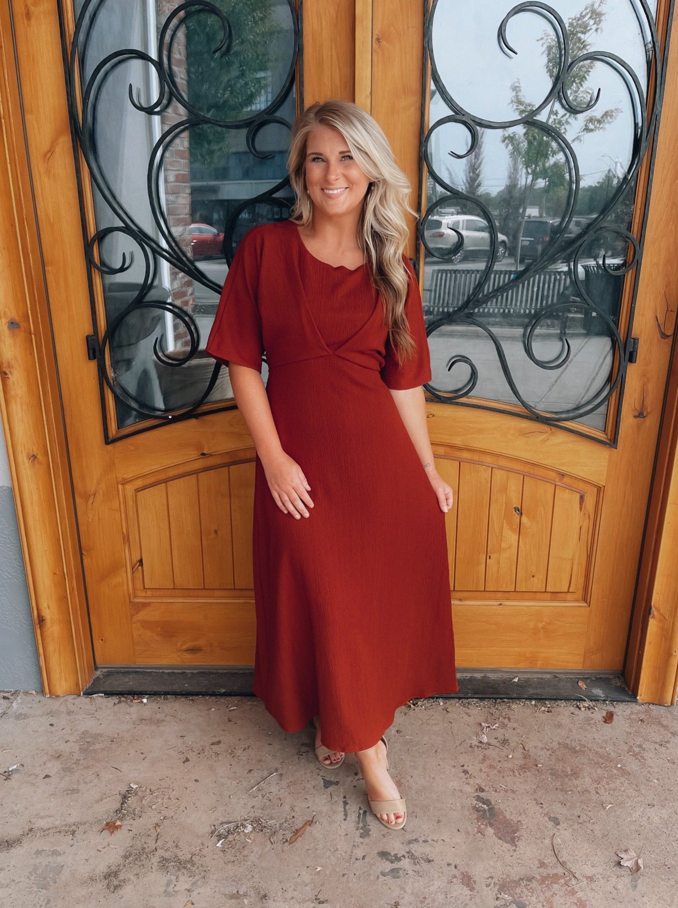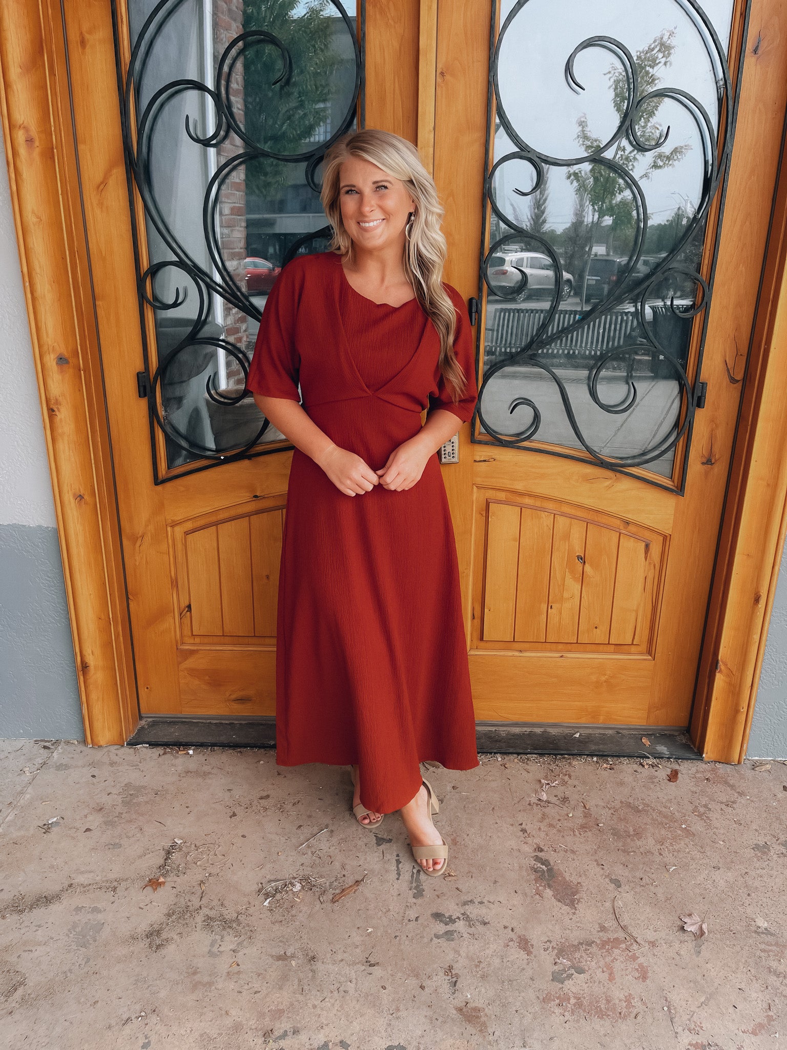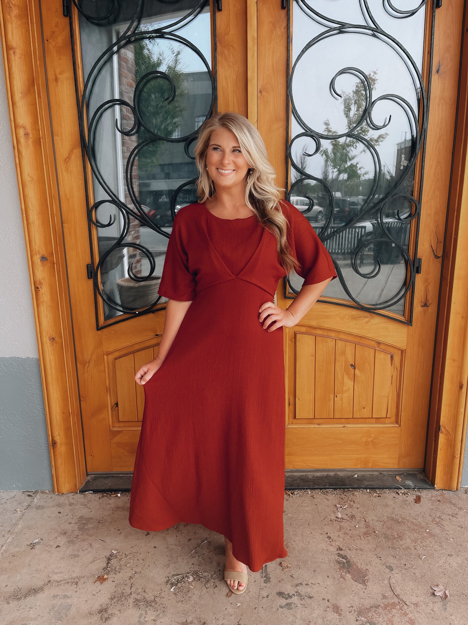 Make a bold statement in the Believing In You Rust Midi Dress. This rust-colored midi dress features kimono sleeves and a high waist pleated textured, giving you a fashion-forward look that's sure to turn heads. Perfect for special occasions or a night out, you'll love the confidence this dress brings. Believe in yourself and make a lasting impression!