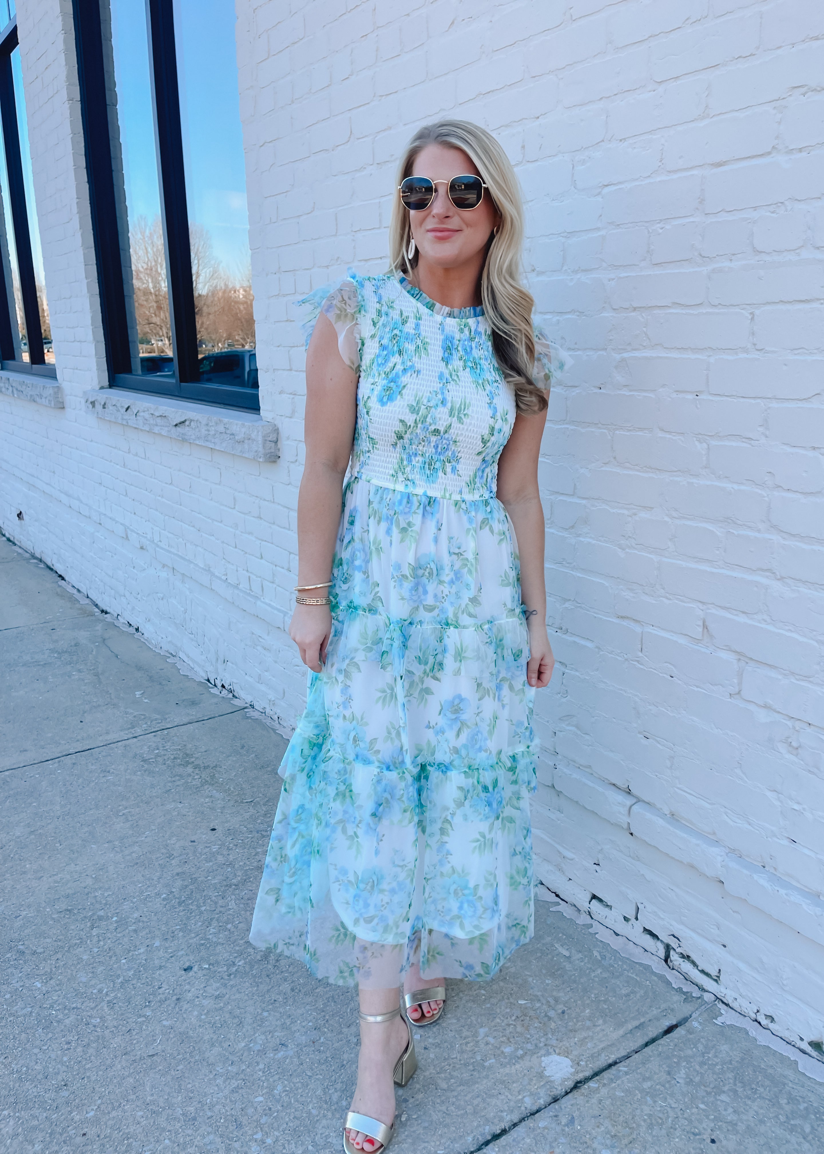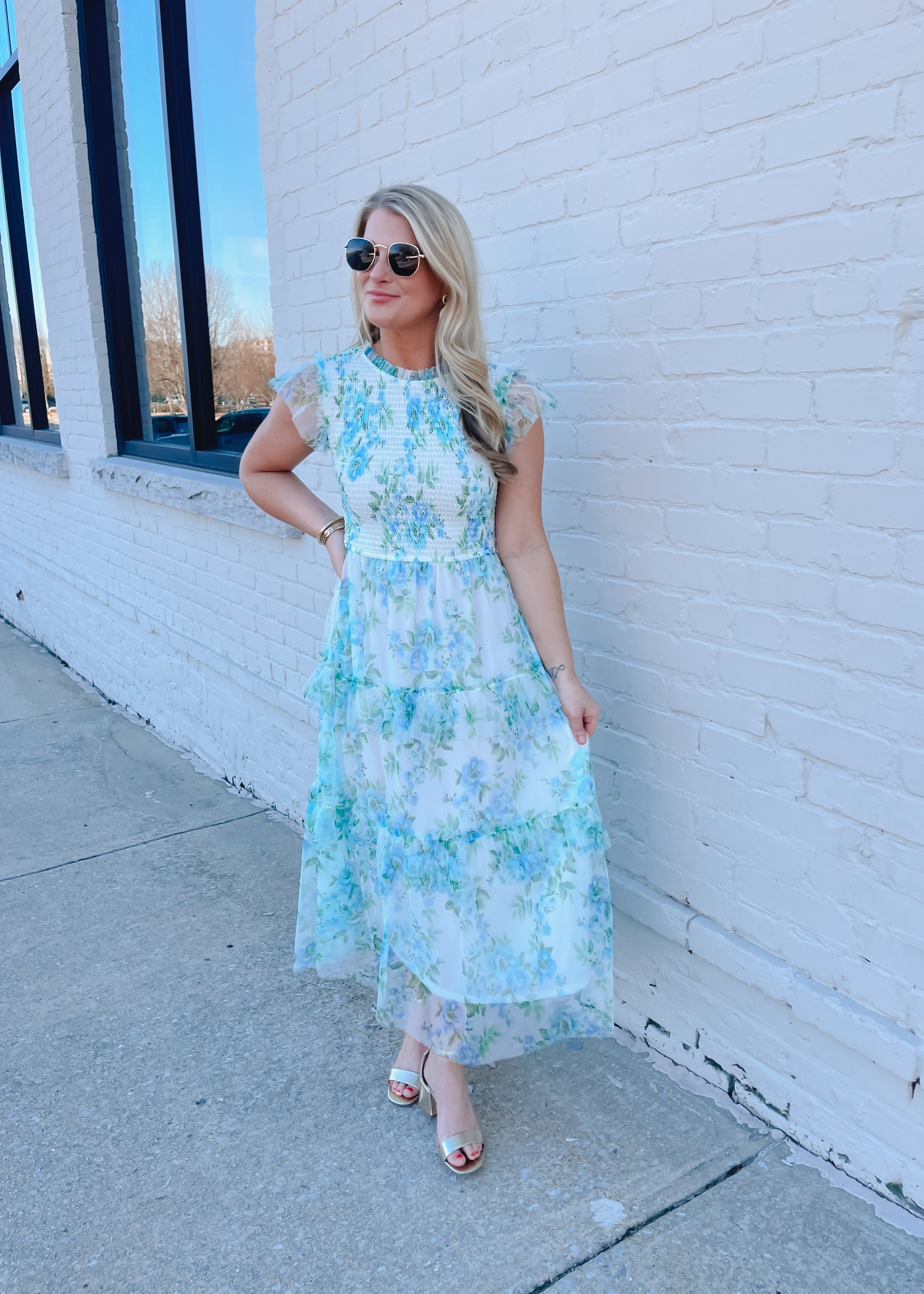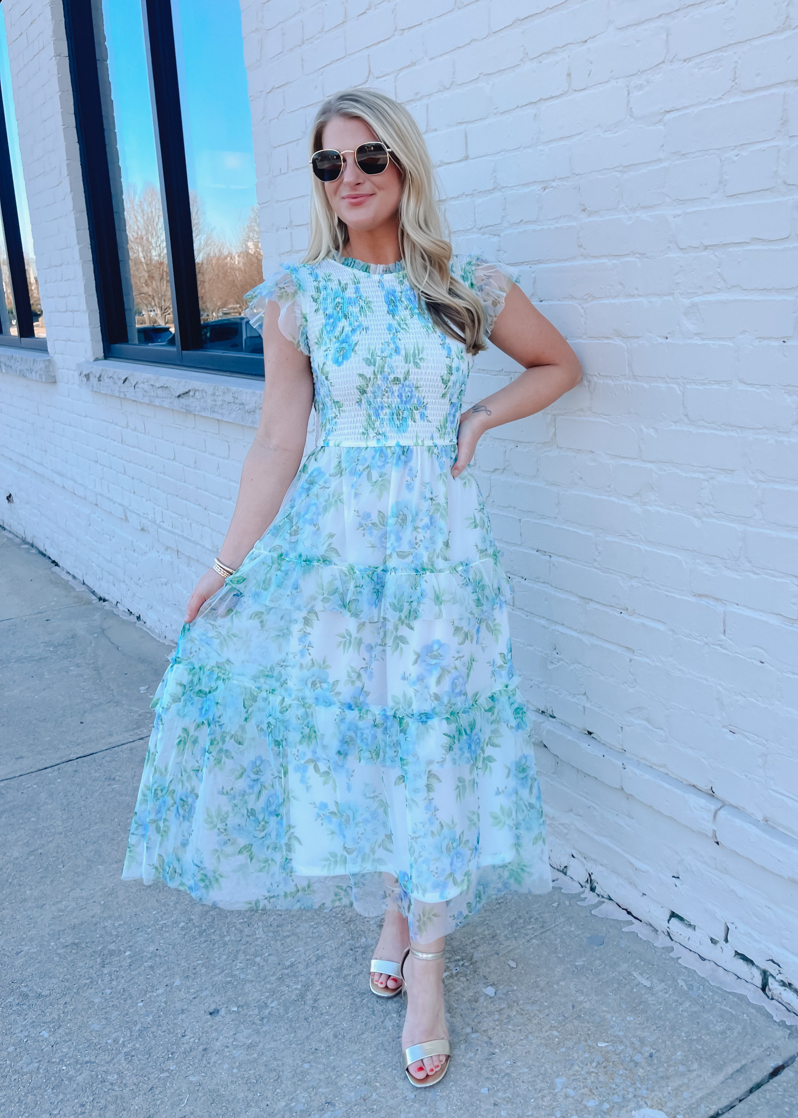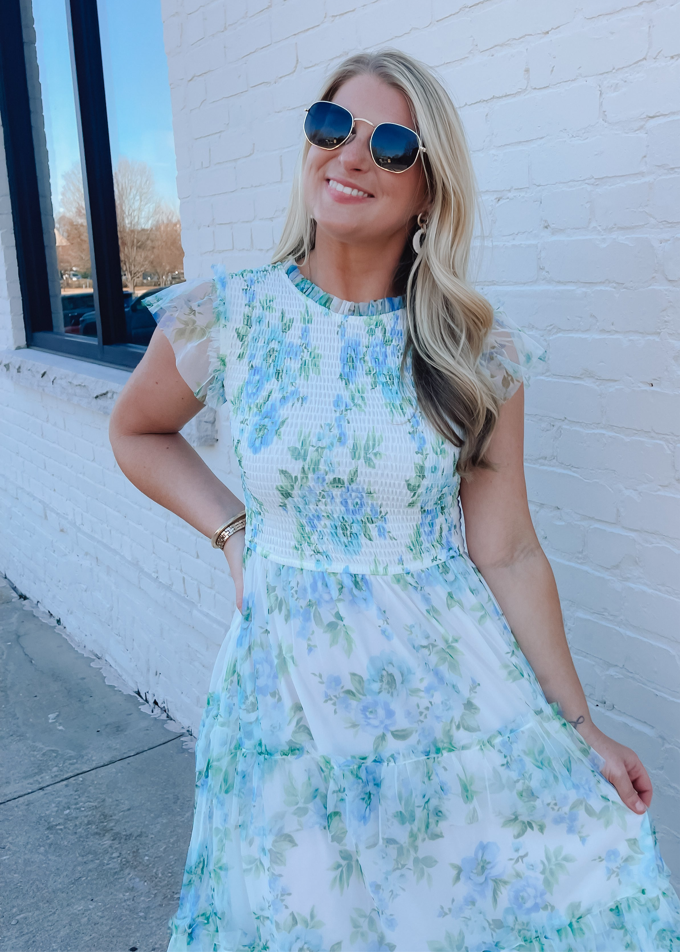 Transform into a vision of blooming beauty with our Blooming With Love Midi Dress. The white midi mesh fabric and vibrant blue and green floral pattern will make you stand out in any crowd. With smocked chest short sleeves and tiered detailing, this dress provides both comfort and style for any occasion!