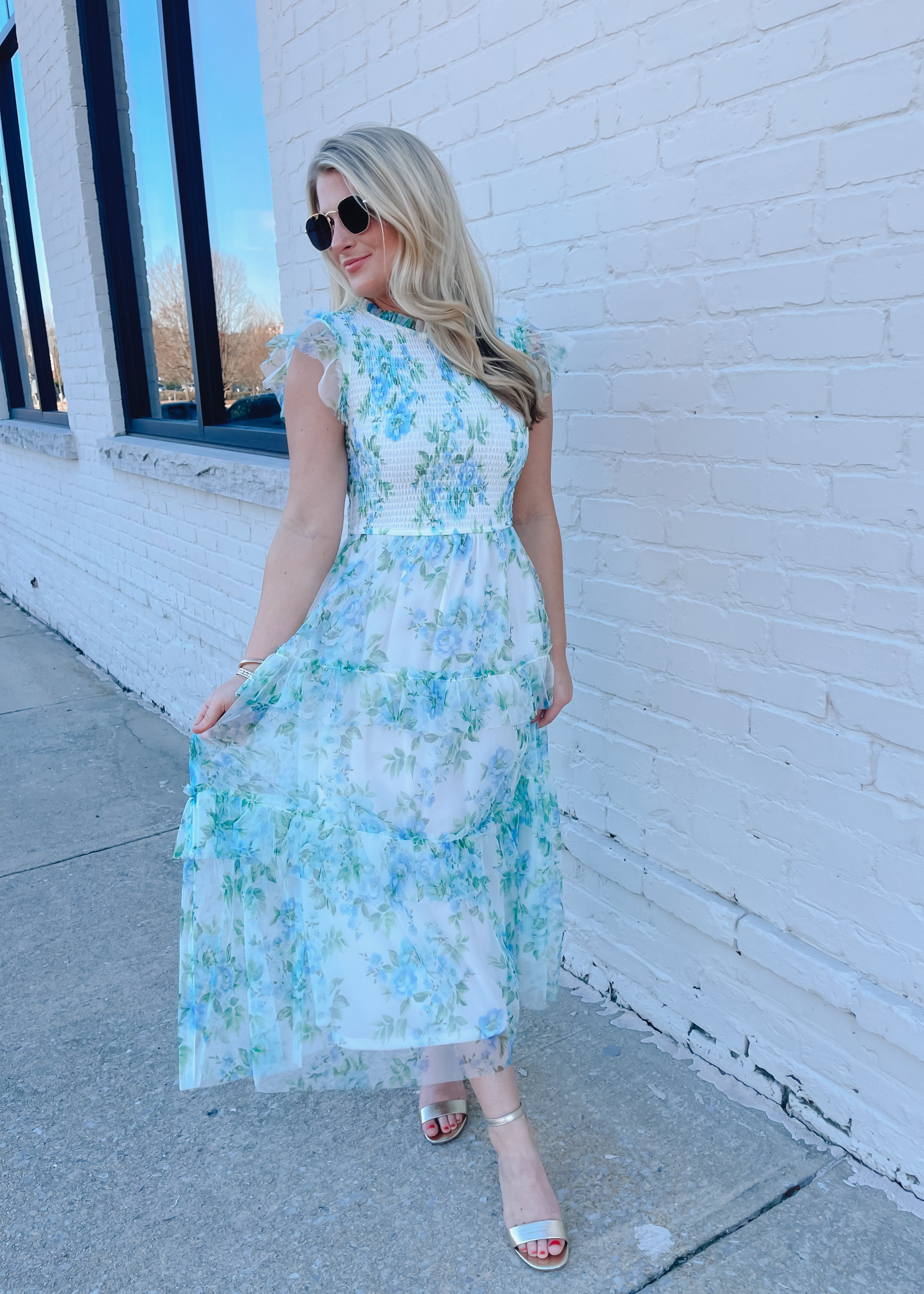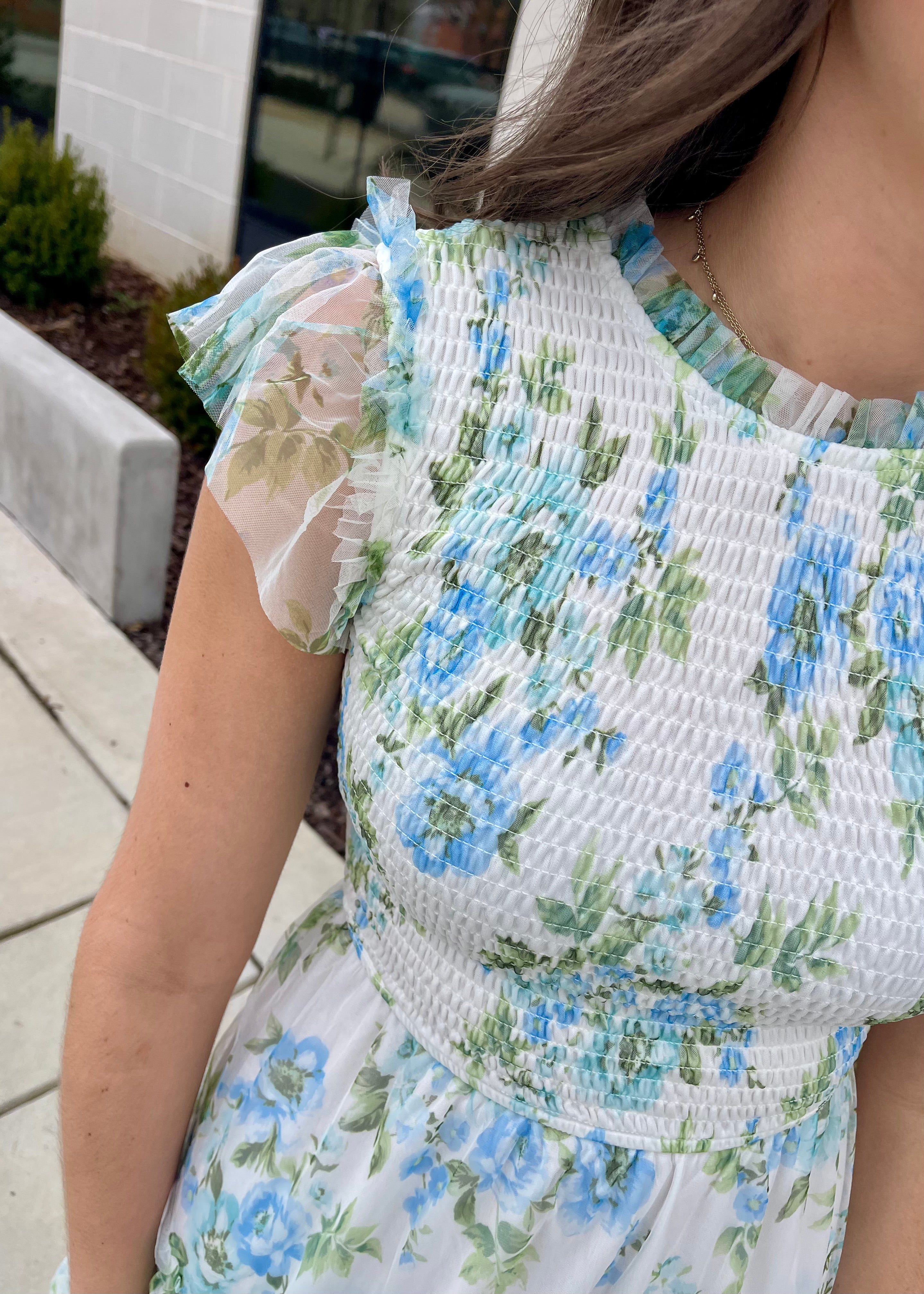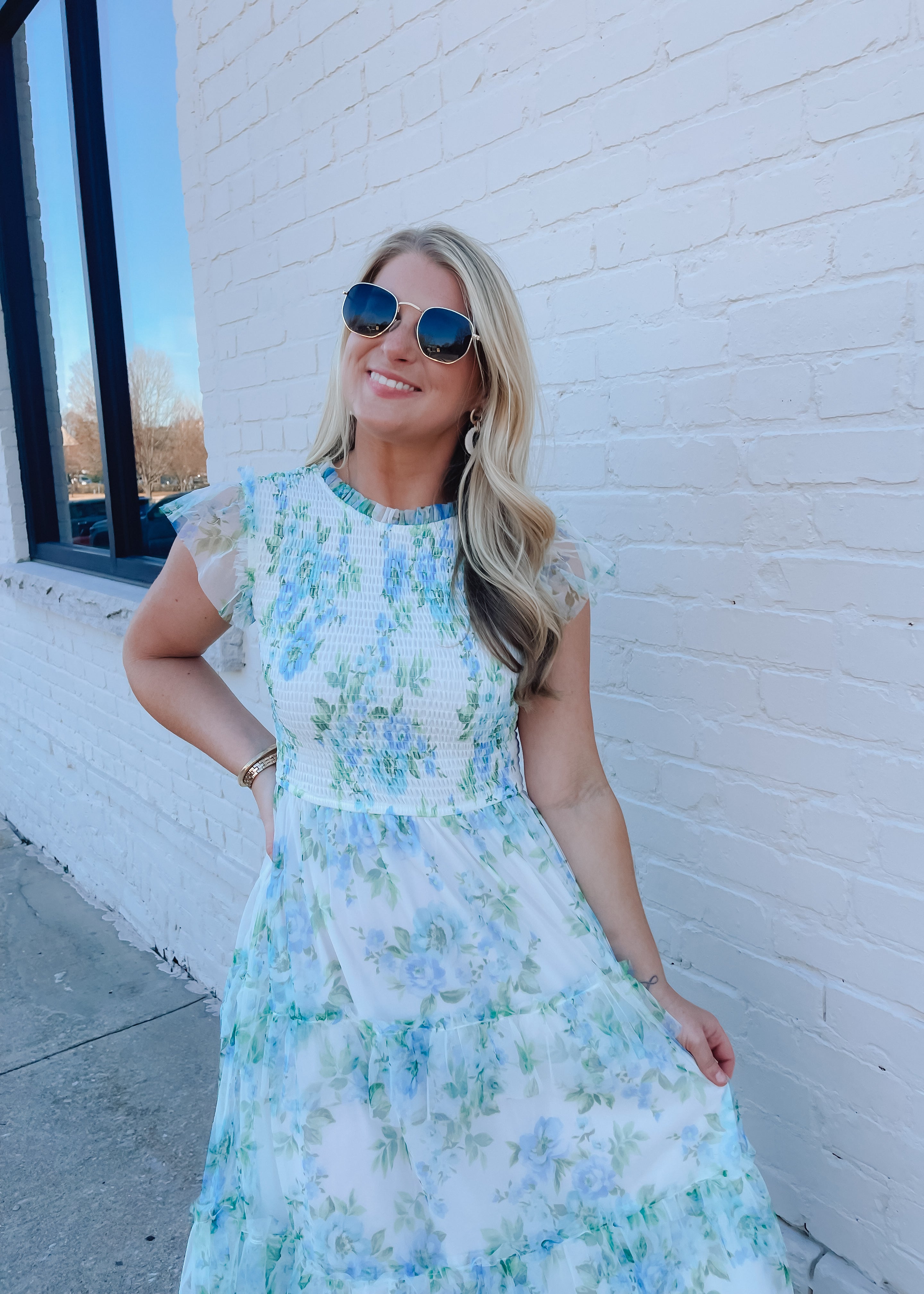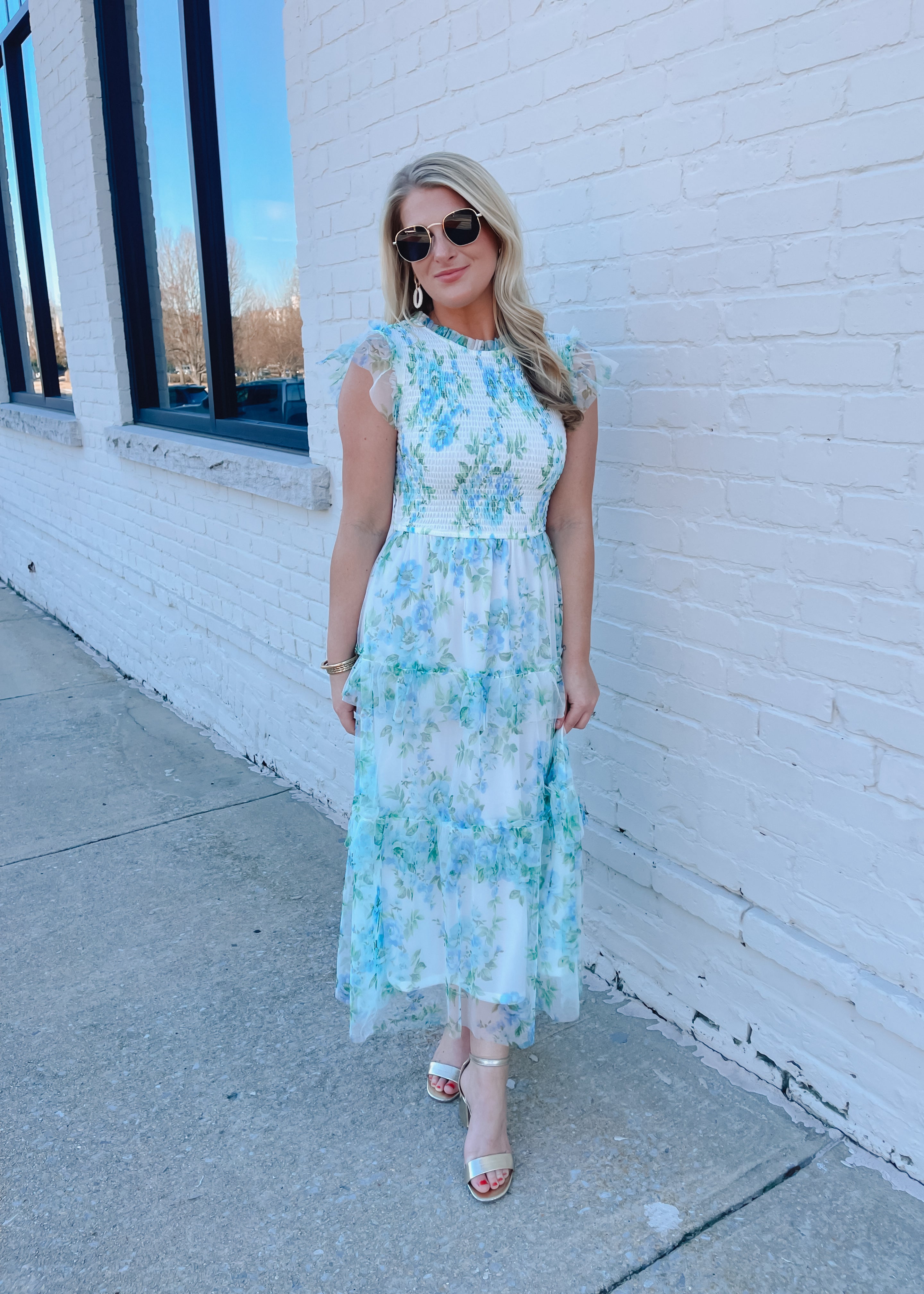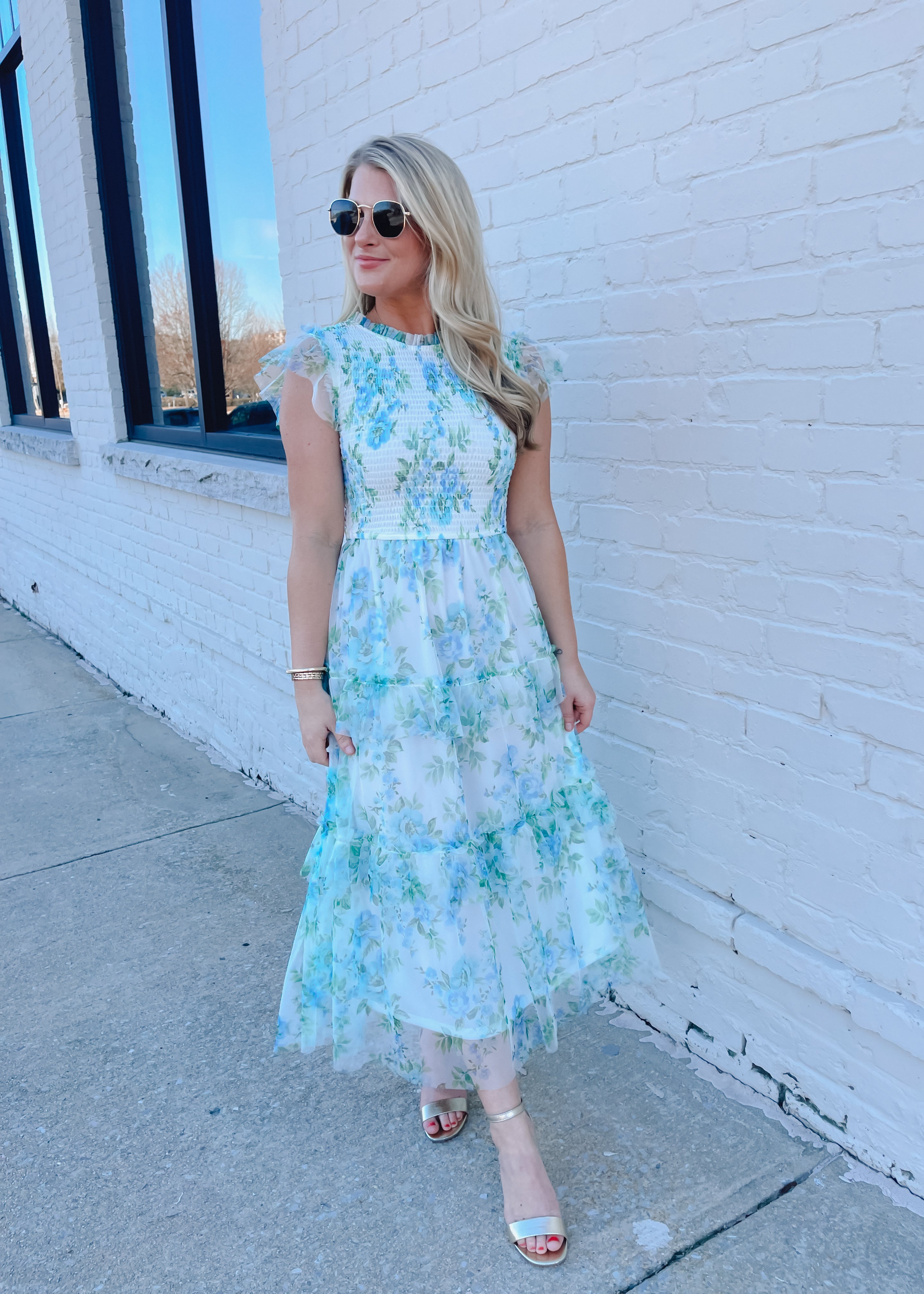 Transform into a vision of blooming beauty with our Blooming With Love Midi Dress. The white midi mesh fabric and vibrant blue and green floral pattern will make you stand out in any crowd. With smocked chest short sleeves and tiered detailing, this dress provides both comfort and style for any occasion!