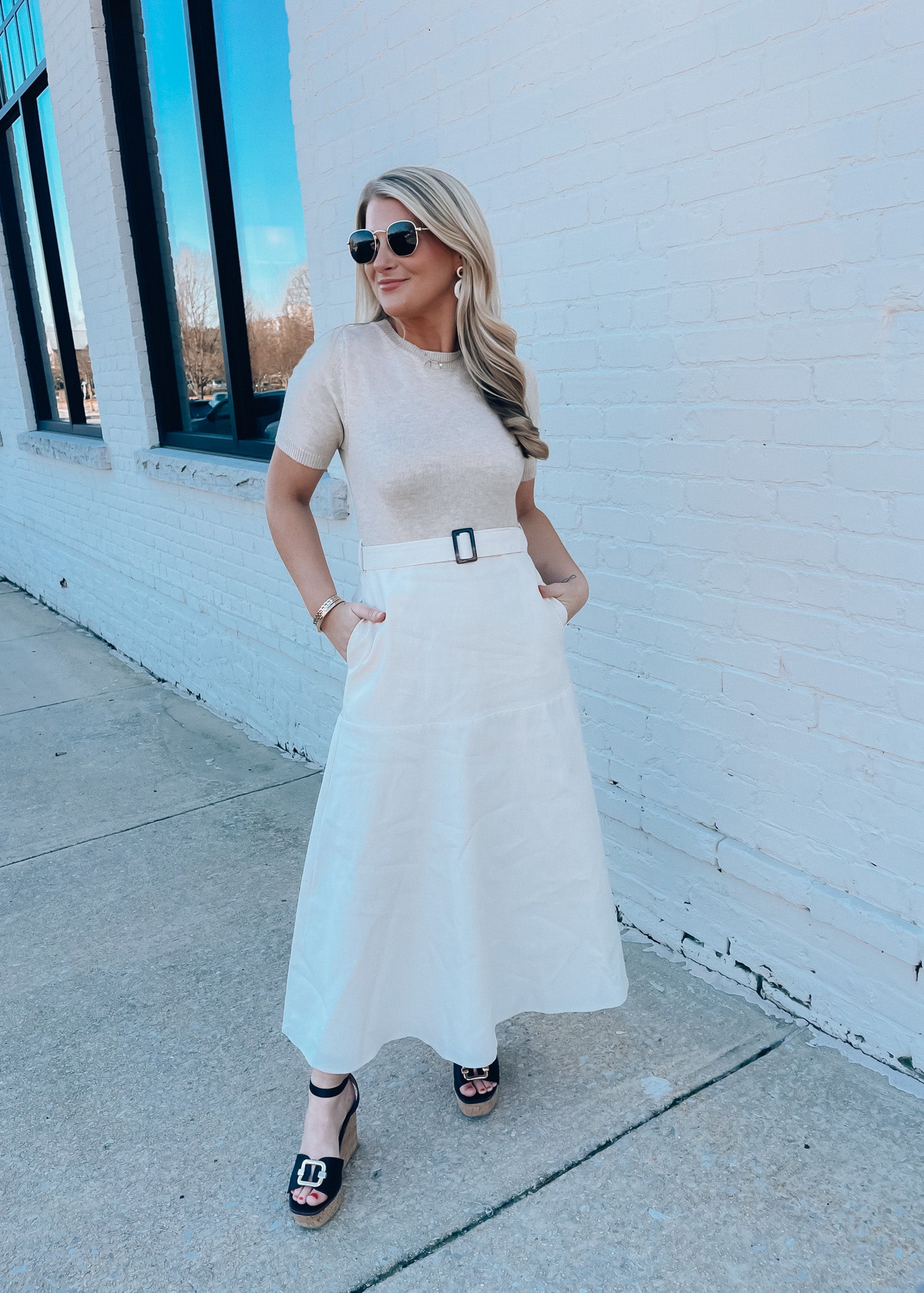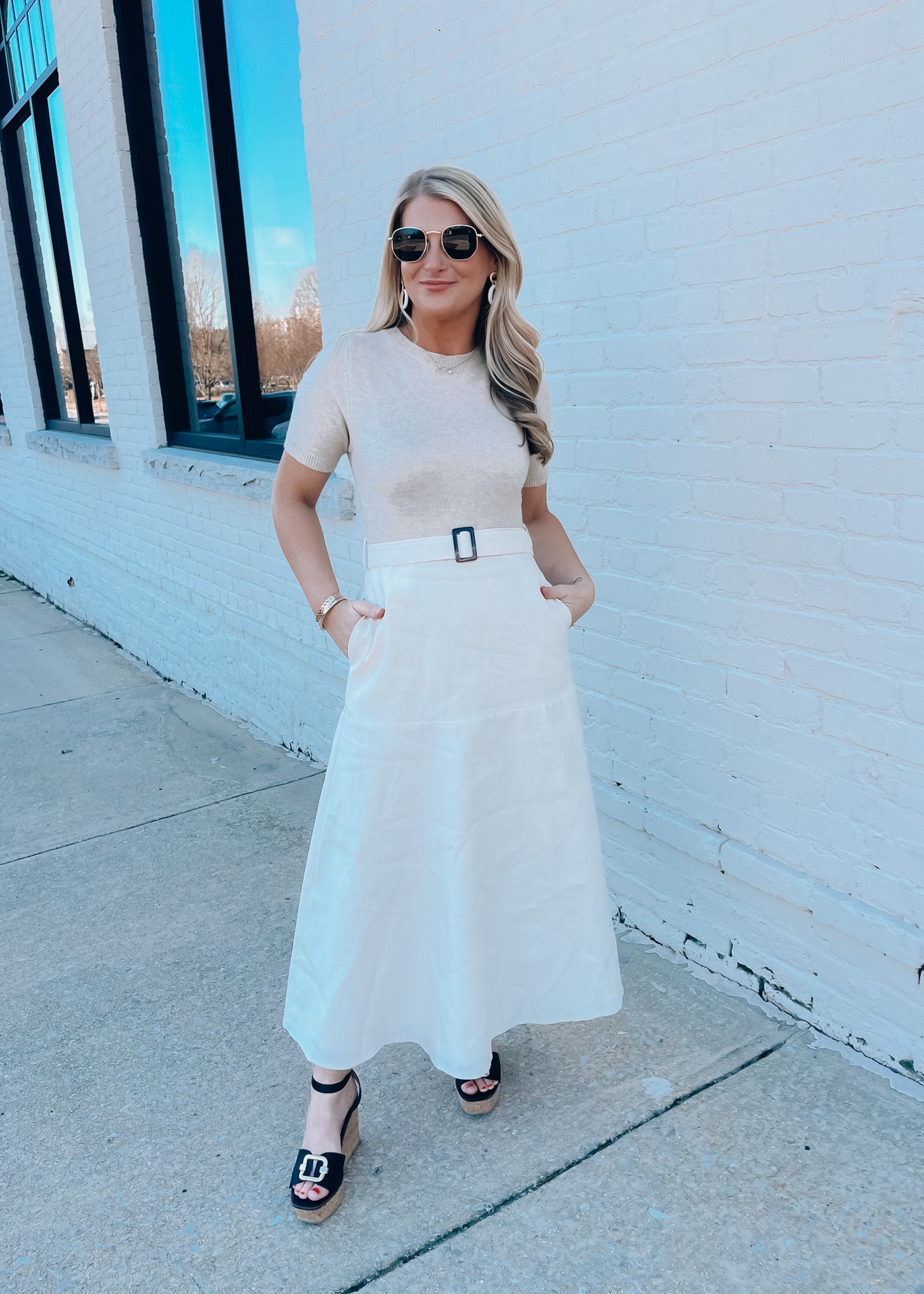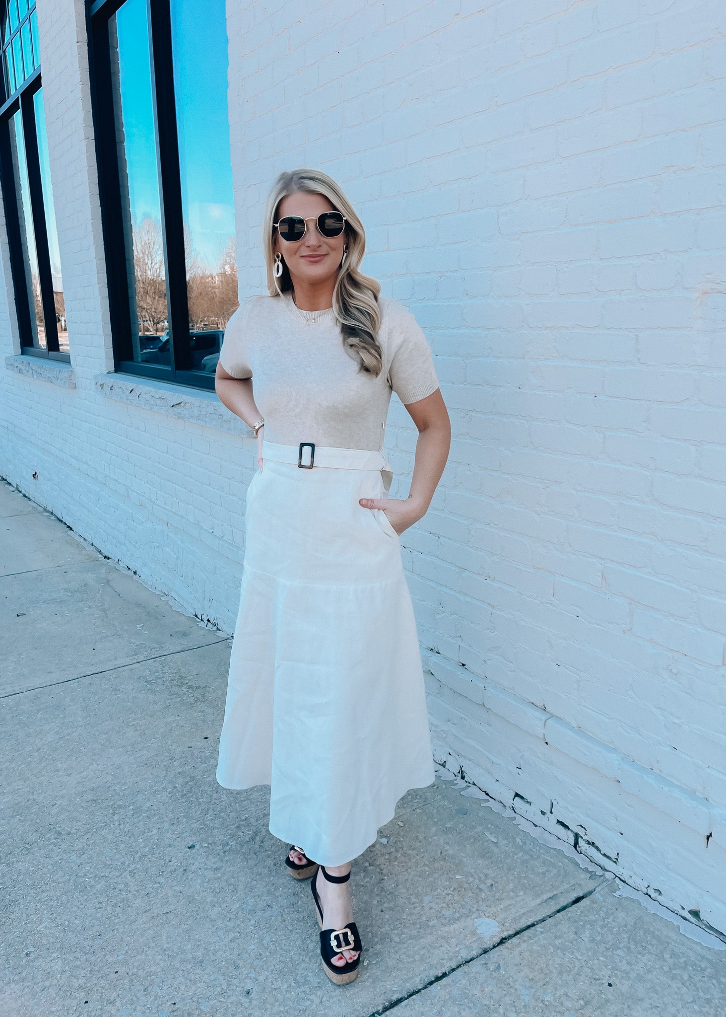 Take a chance on our By Chance Midi Dress! This dress combines a cozy, natural-colored sweater top with a stylish fit and flare linen skirt. With a cinching belt to accentuate your waist, you'll love the comfort and versatility of this twofer dress. Perfect for any occasion!
