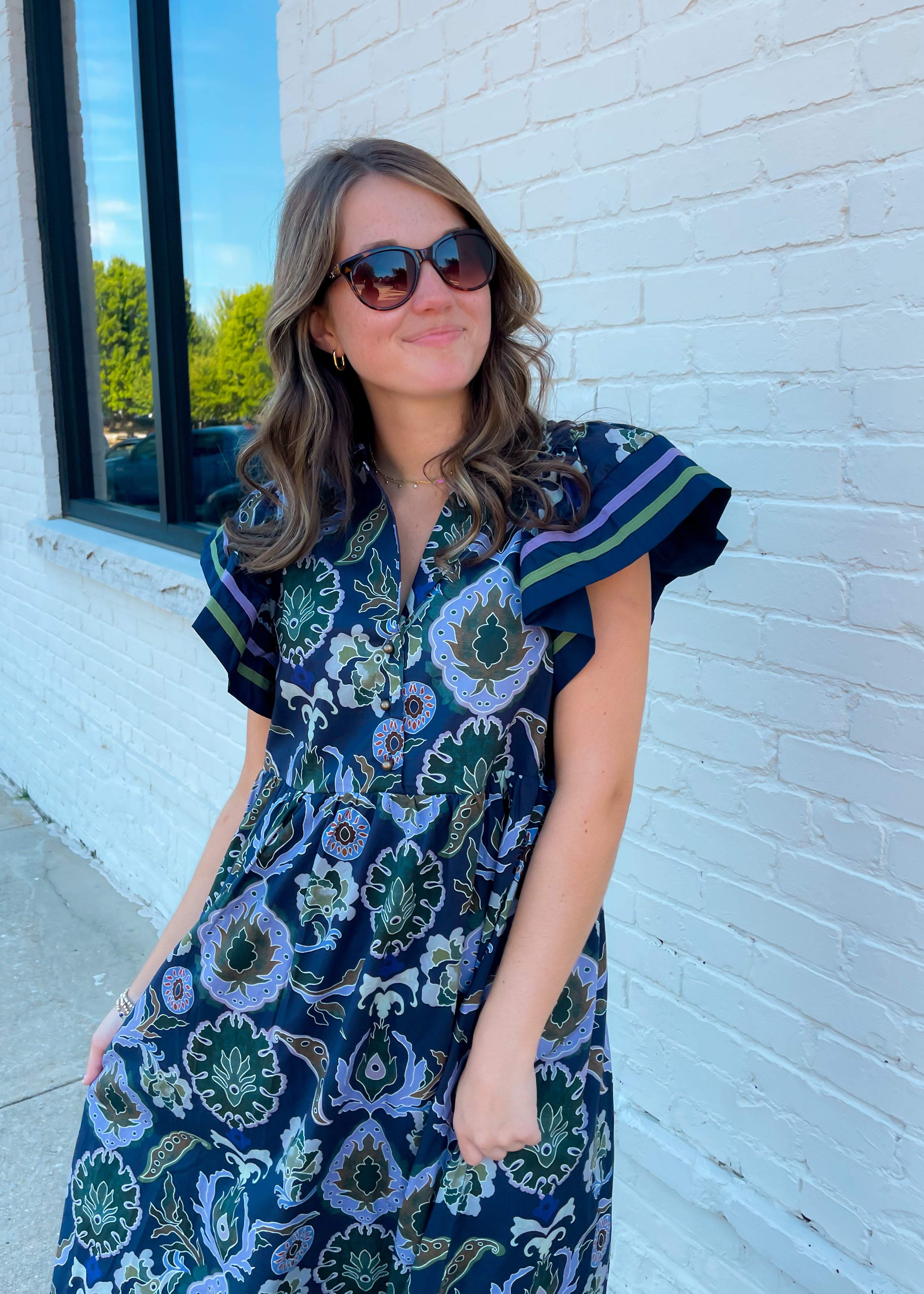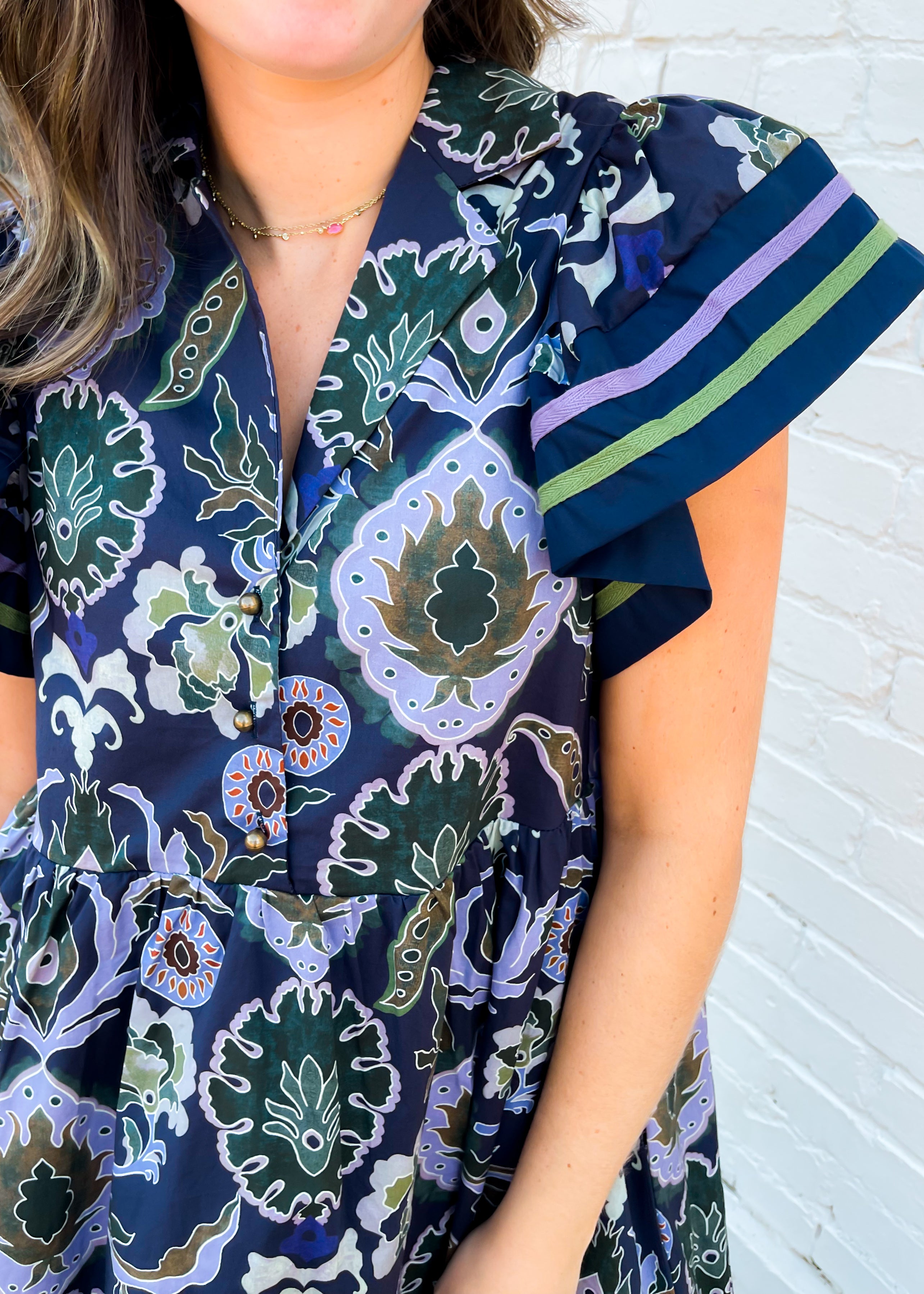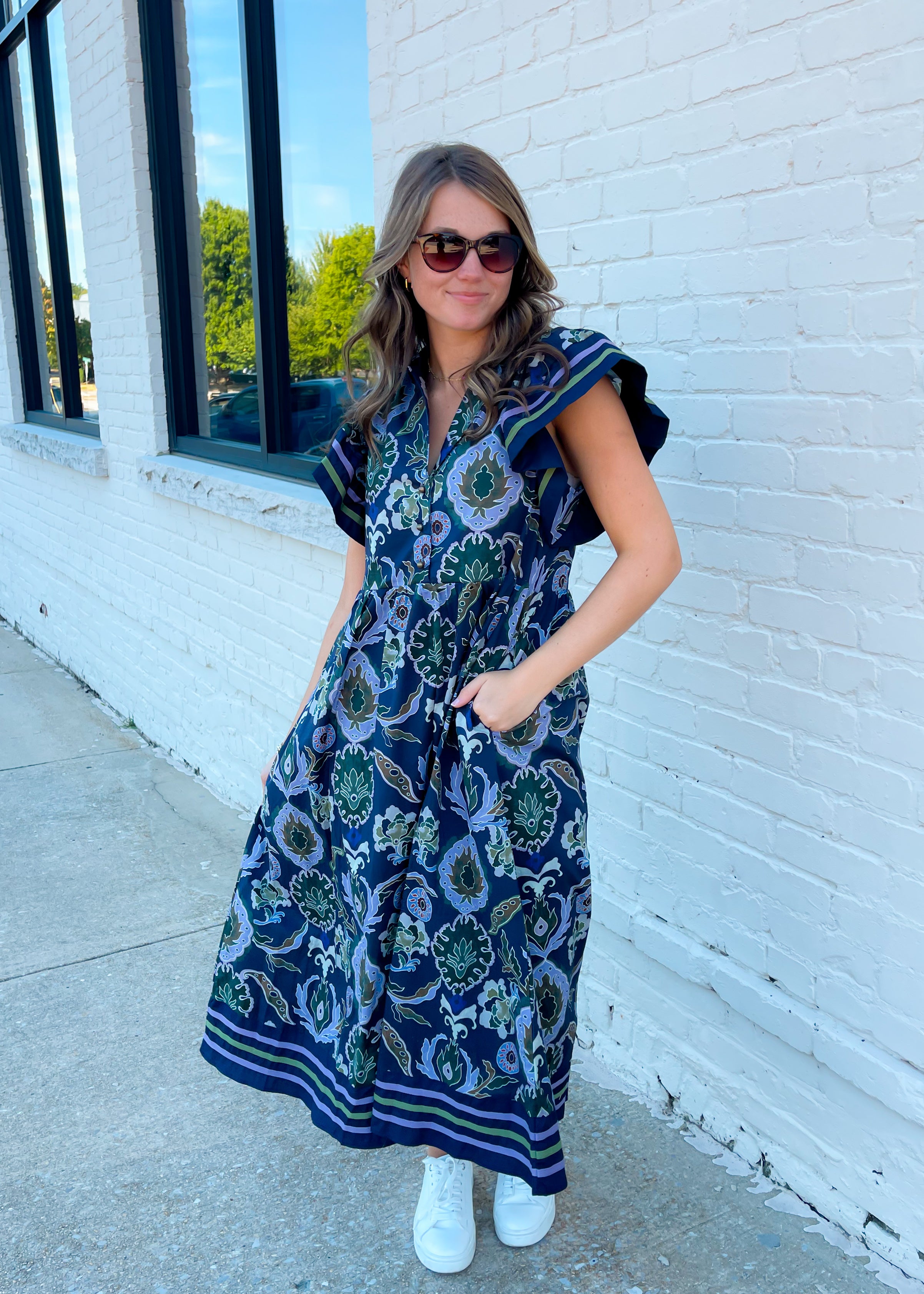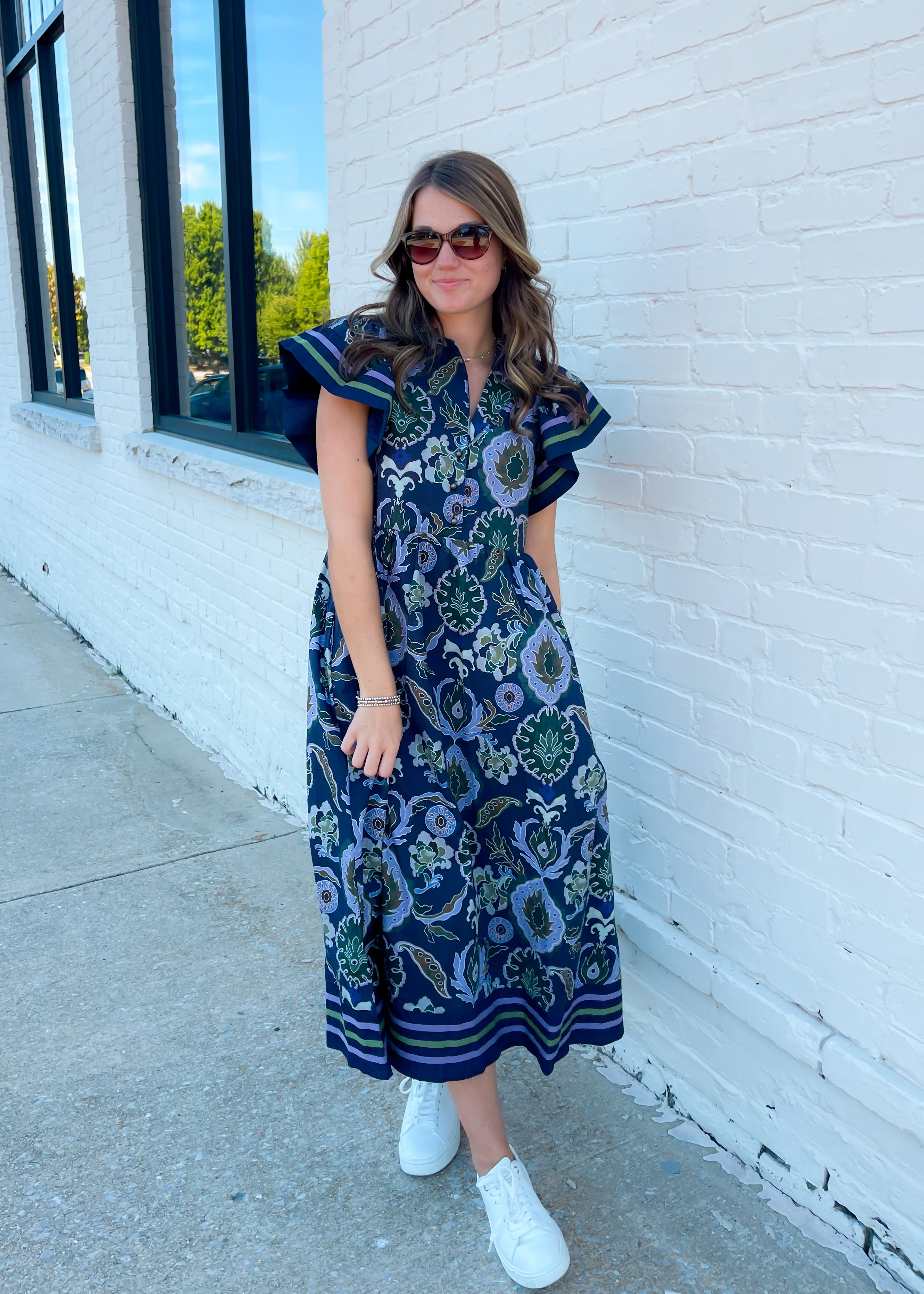 The Come Back Better Midi Dress features a flattering navy base with elegant ruffle sleeves and a chic V-neck collar. Its button-down top offers a structured fit, while the flowy skirt enhances movement and comfort. Featuring a smooth lining for a comfortable fit and hidden pockets for convenience, this dress effortlessly blends style and function, making it an ideal choice for day-to-night wear. Adorned with vibrant blues, greens, and purples in abstract designs, complemented by colorful striped accents on the sleeves and hem, this dress effortlessly blends sophistication with artistic flair��perfect for standing out wherever you go.