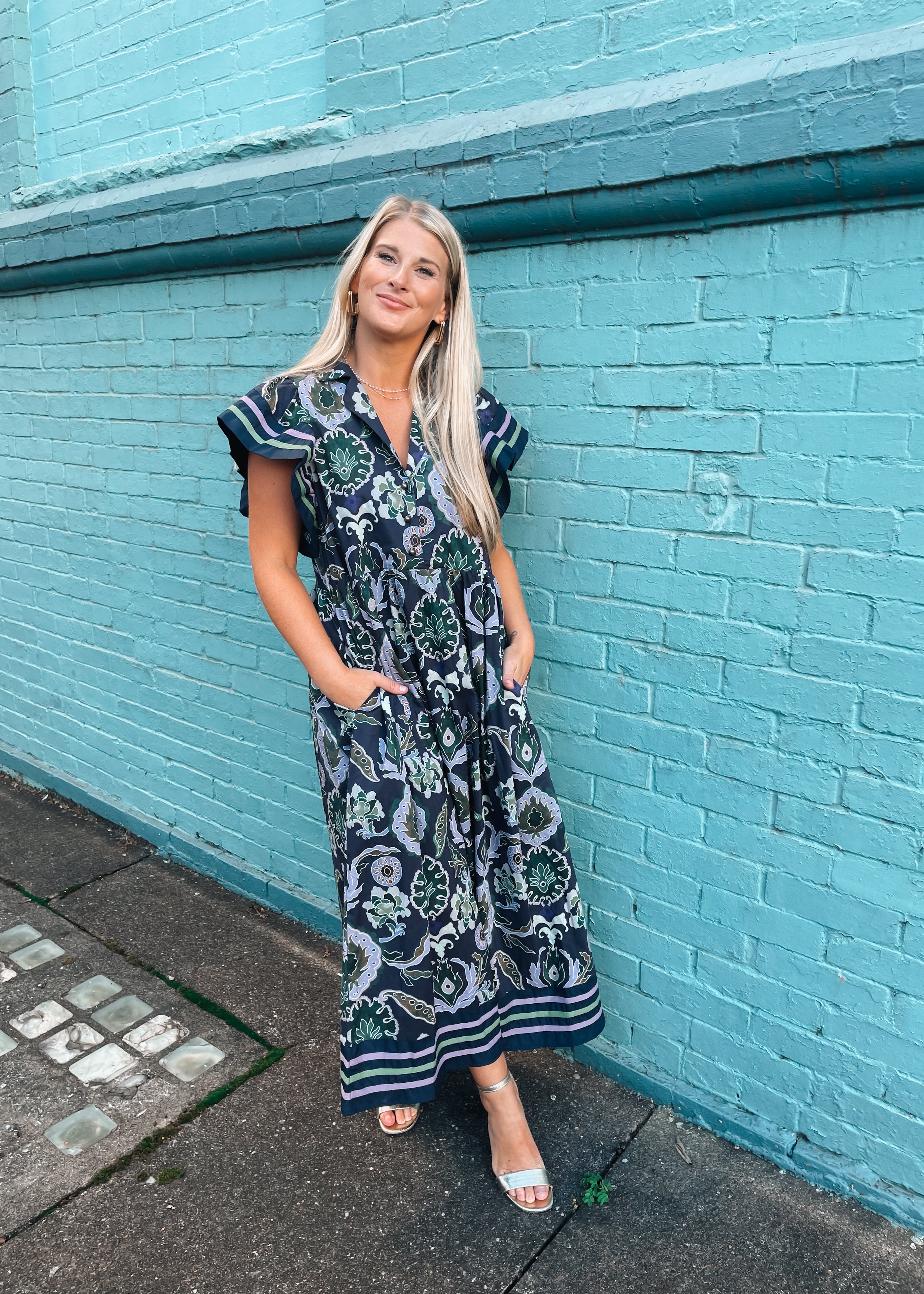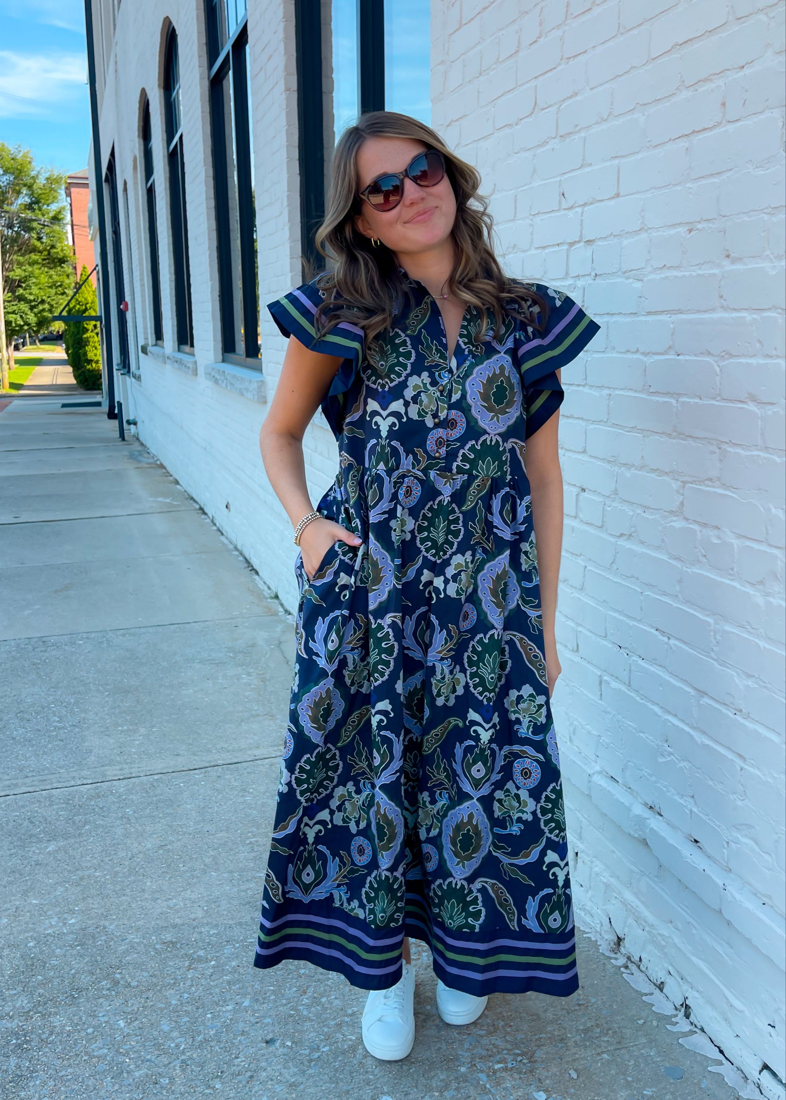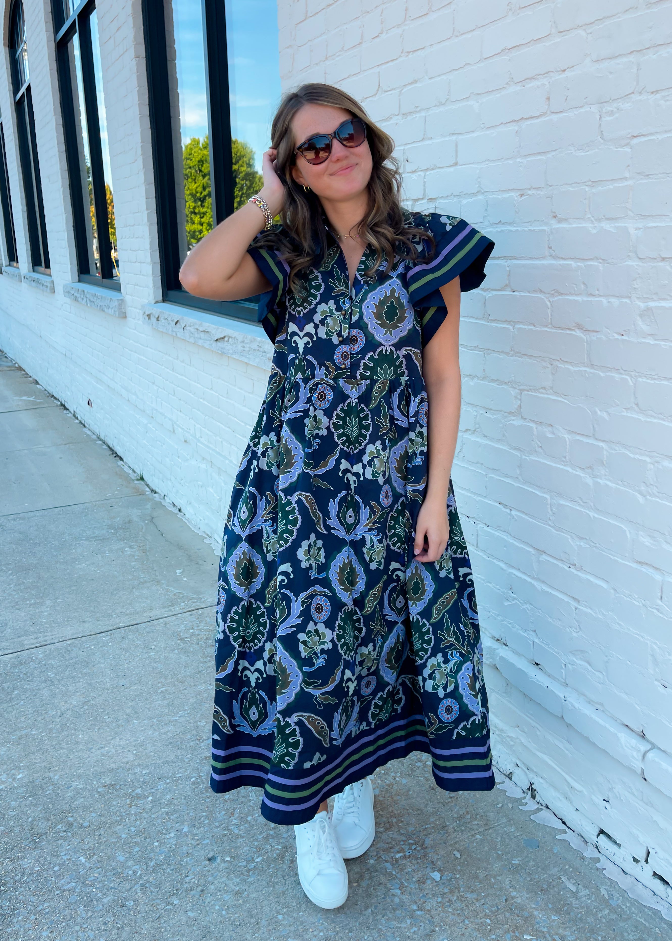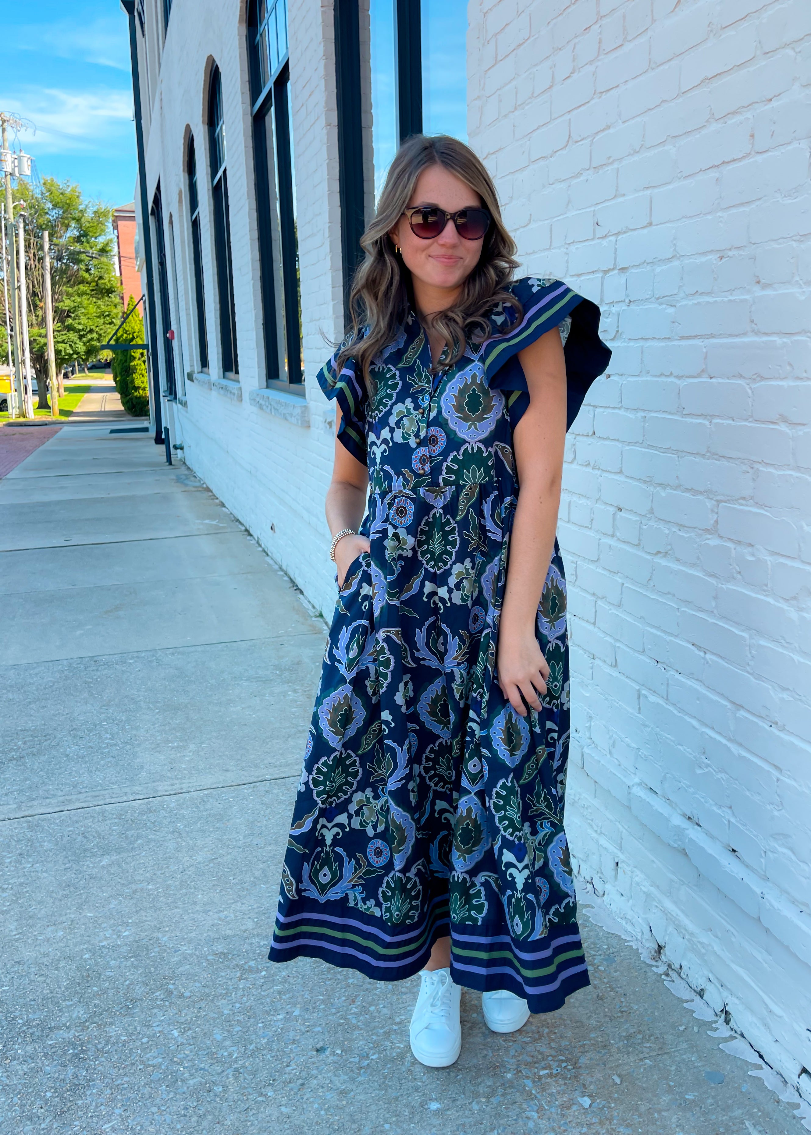 The Come Back Better Midi Dress features a flattering navy base with elegant ruffle sleeves and a chic V-neck collar. Its button-down top offers a structured fit, while the flowy skirt enhances movement and comfort. Featuring a smooth lining for a comfortable fit and hidden pockets for convenience, this dress effortlessly blends style and function, making it an ideal choice for day-to-night wear. Adorned with vibrant blues, greens, and purples in abstract designs, complemented by colorful striped accents on the sleeves and hem, this dress effortlessly blends sophistication with artistic flair��perfect for standing out wherever you go.