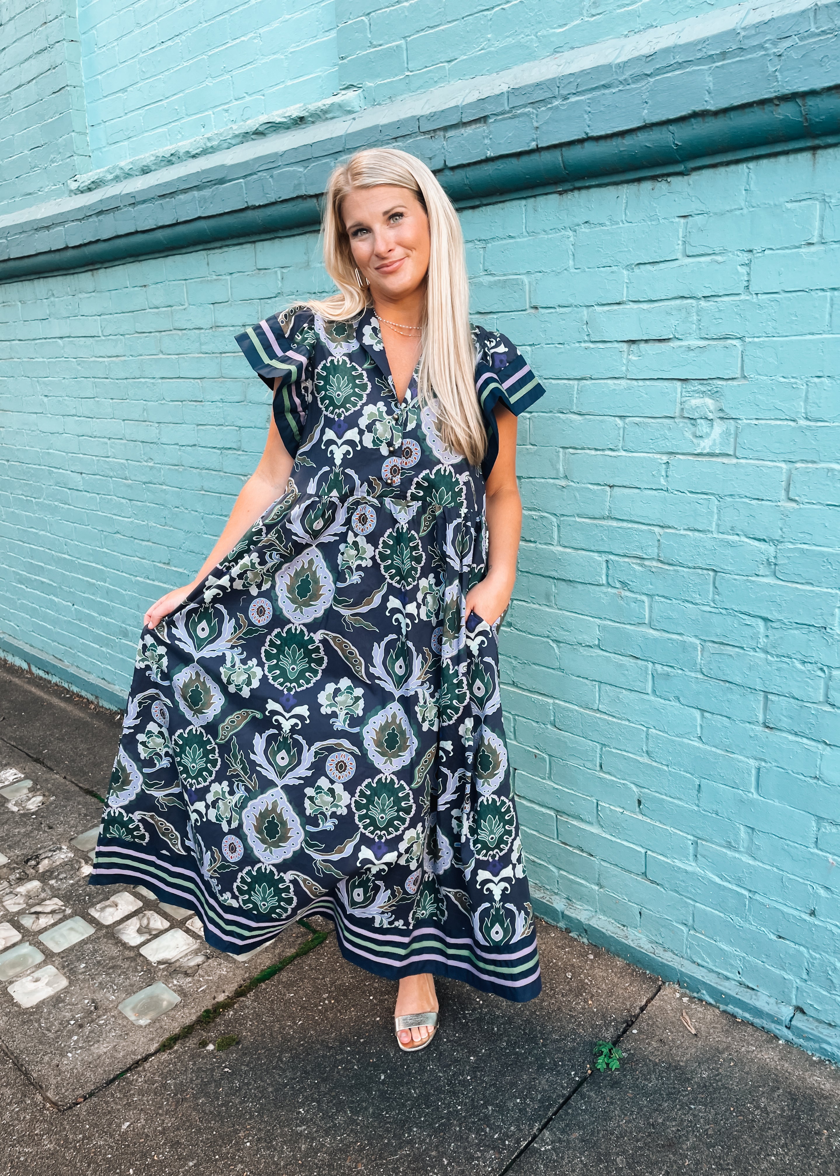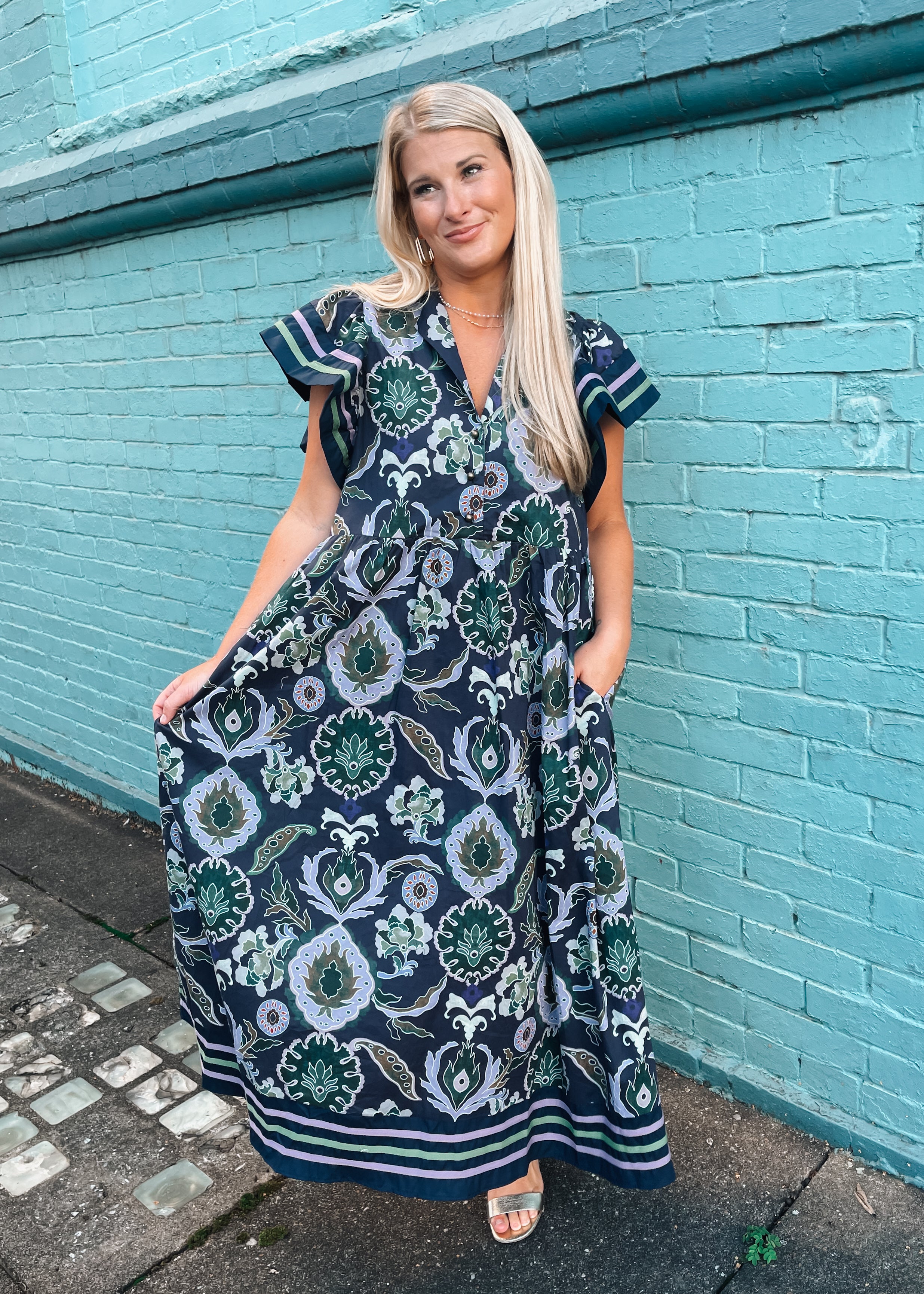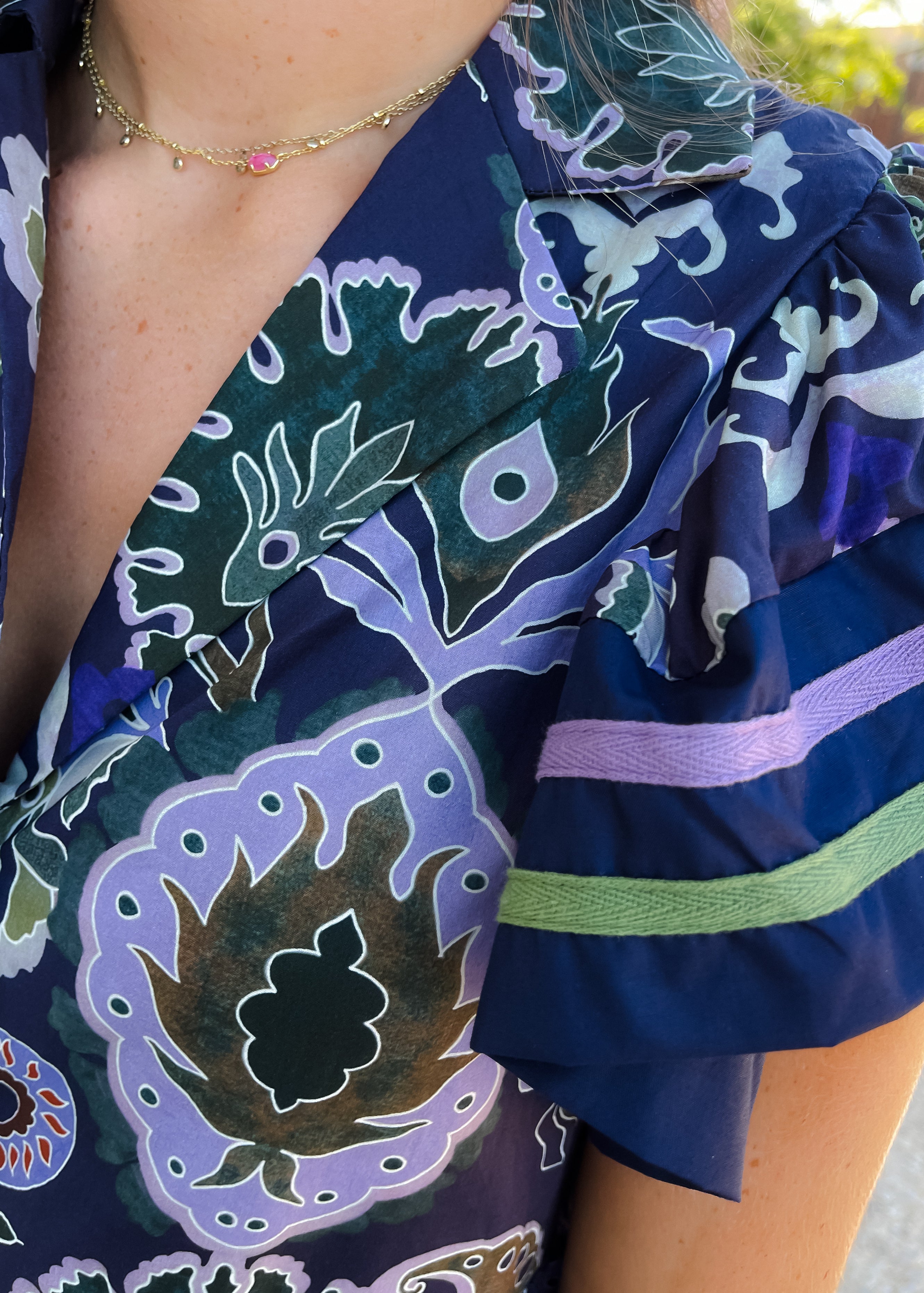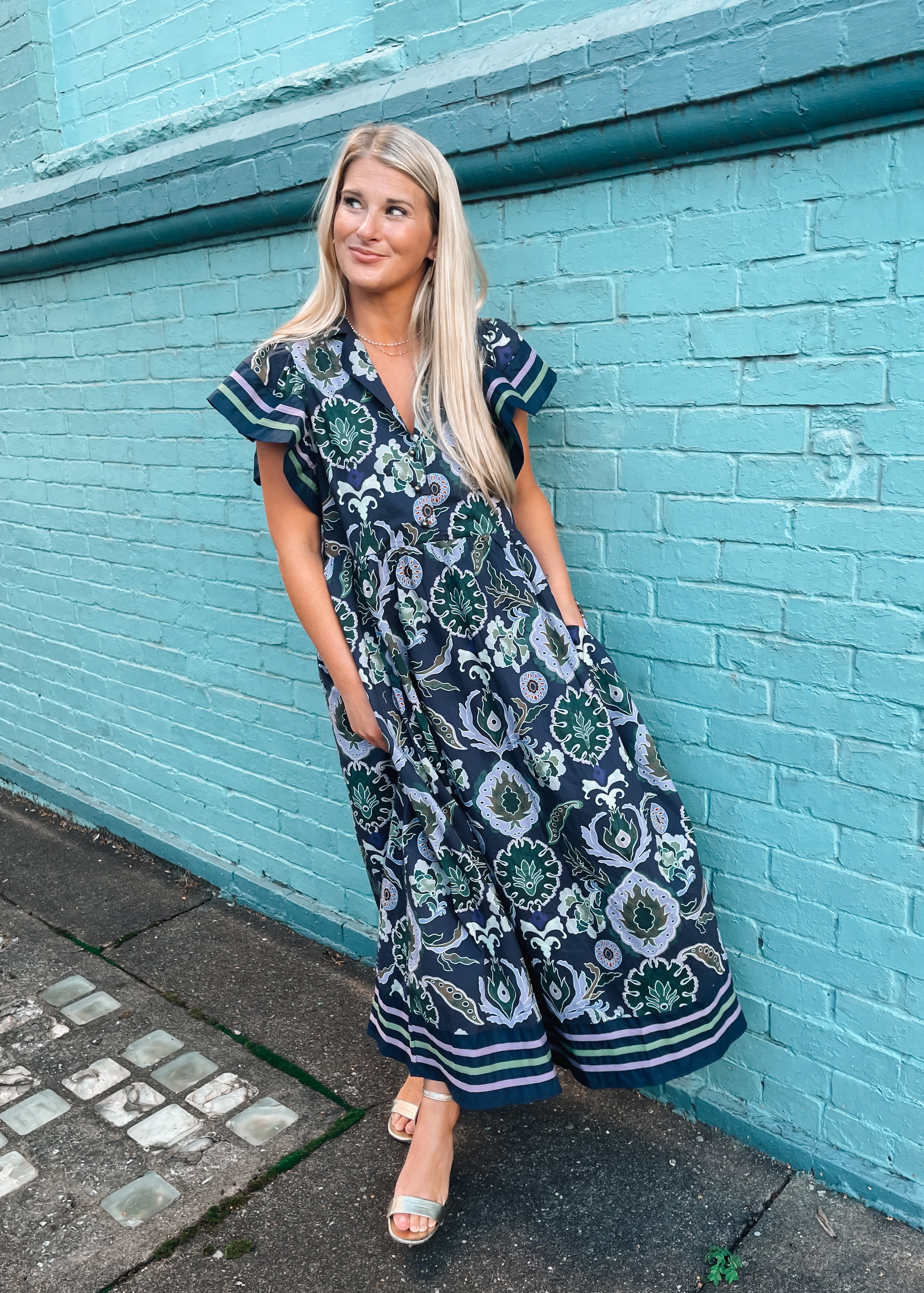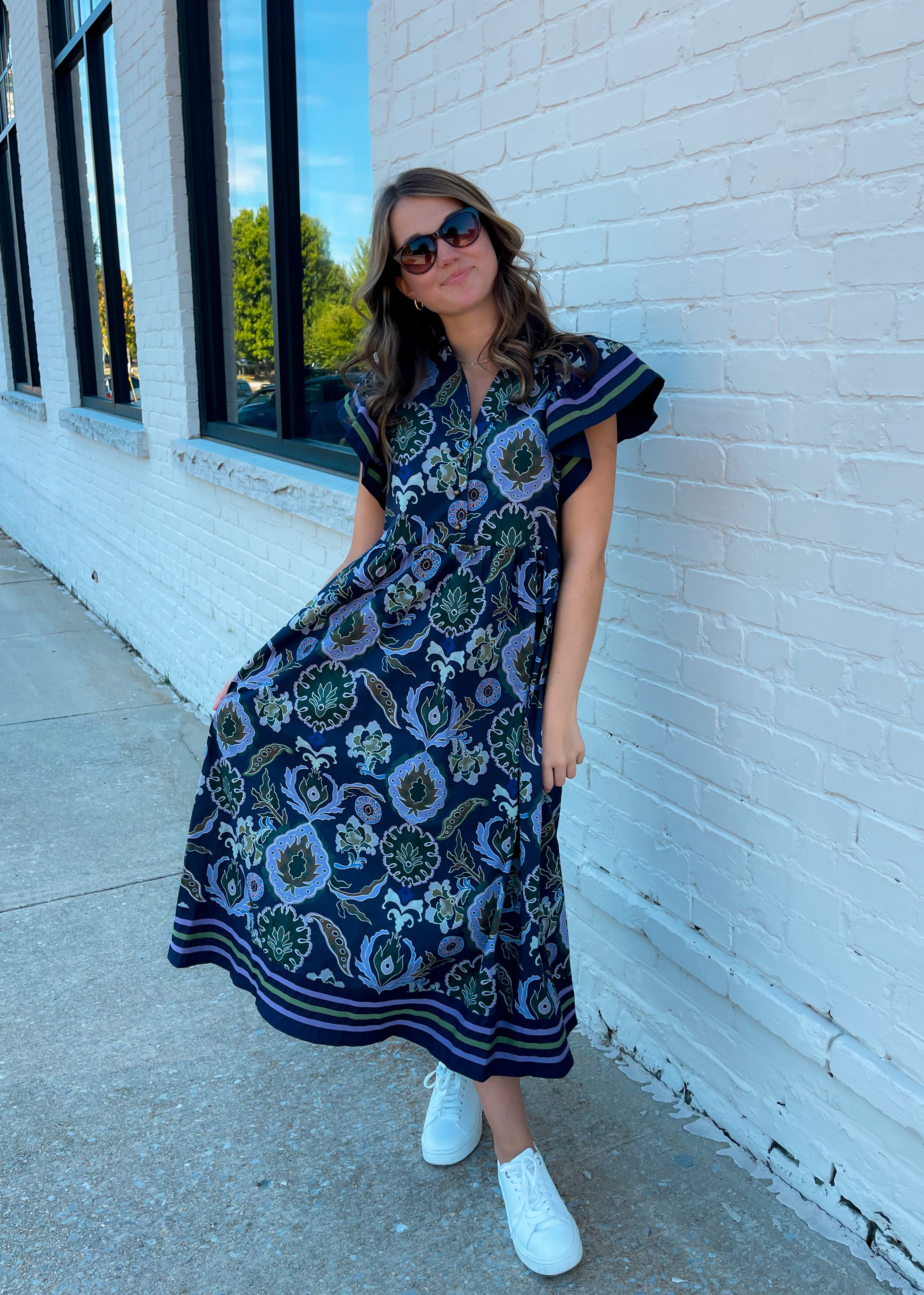 The Come Back Better Midi Dress features a flattering navy base with elegant ruffle sleeves and a chic V-neck collar. Its button-down top offers a structured fit, while the flowy skirt enhances movement and comfort. Featuring a smooth lining for a comfortable fit and hidden pockets for convenience, this dress effortlessly blends style and function, making it an ideal choice for day-to-night wear. Adorned with vibrant blues, greens, and purples in abstract designs, complemented by colorful striped accents on the sleeves and hem, this dress effortlessly blends sophistication with artistic flair��perfect for standing out wherever you go.