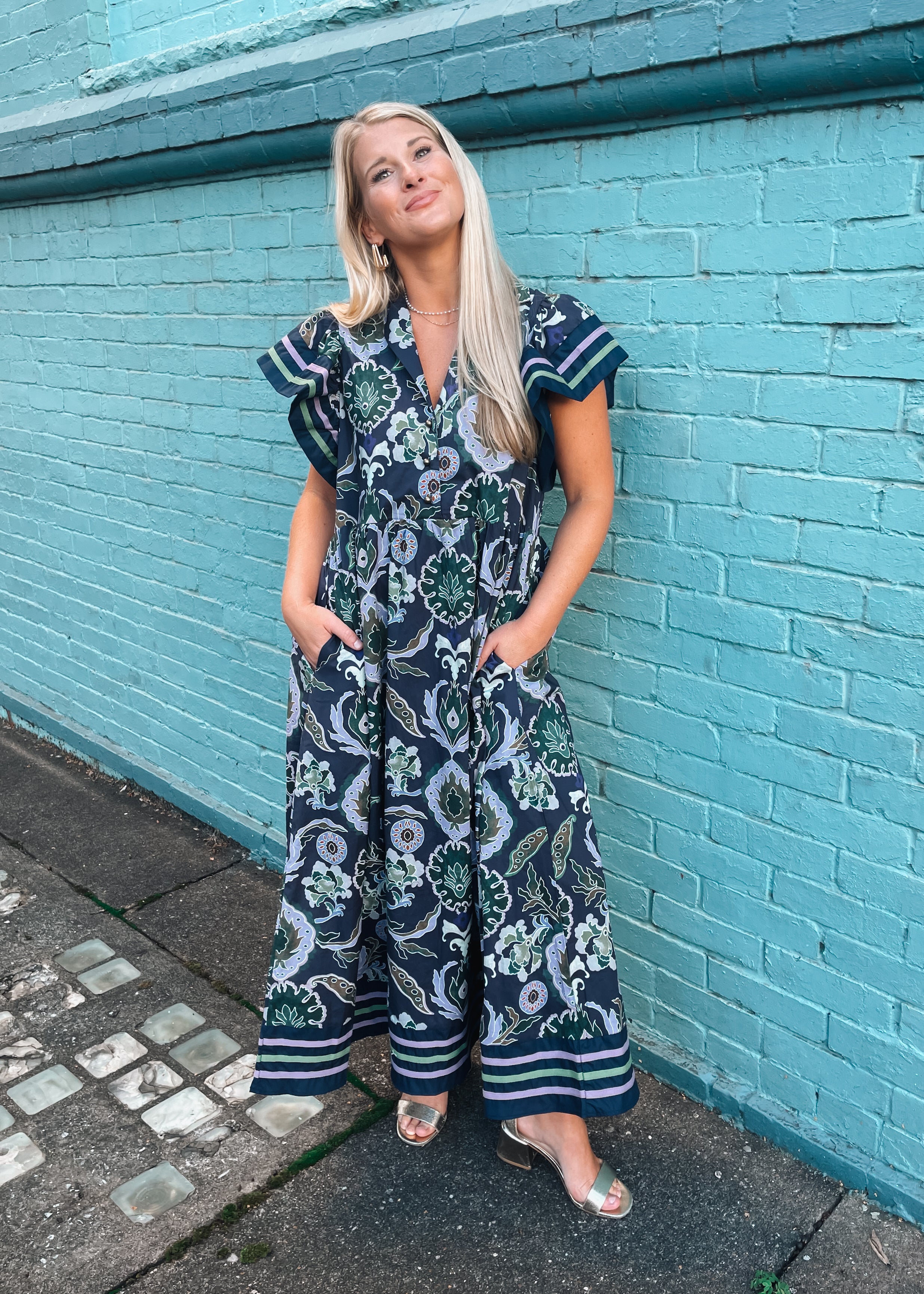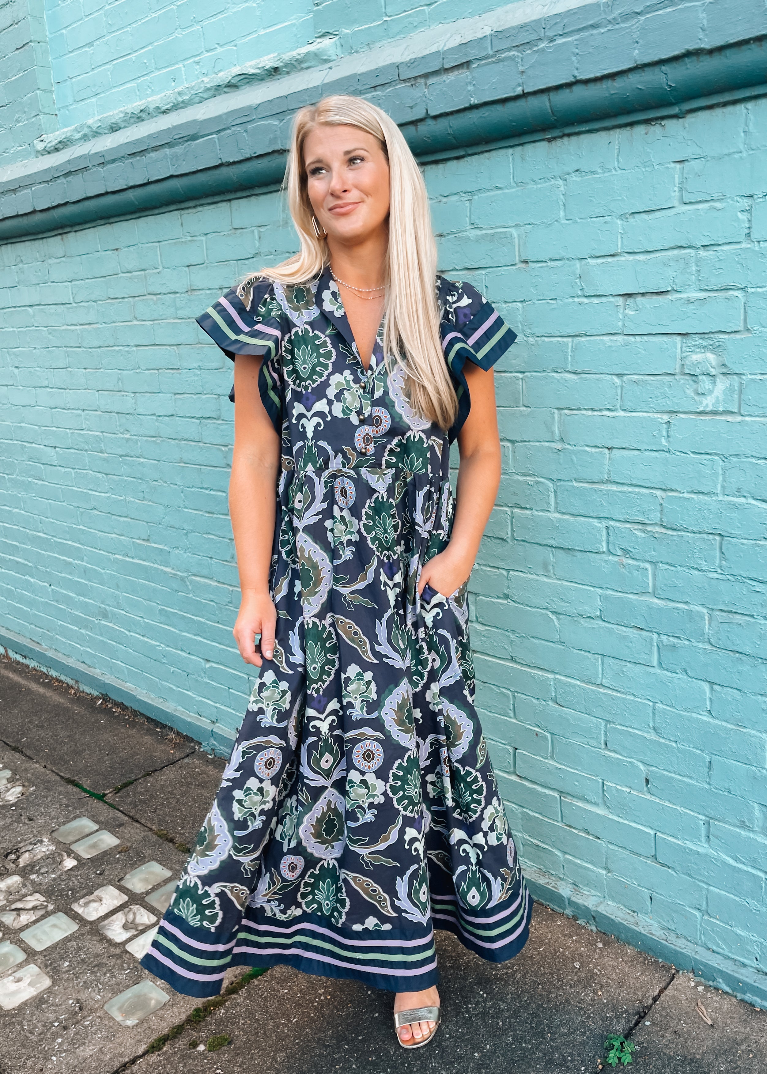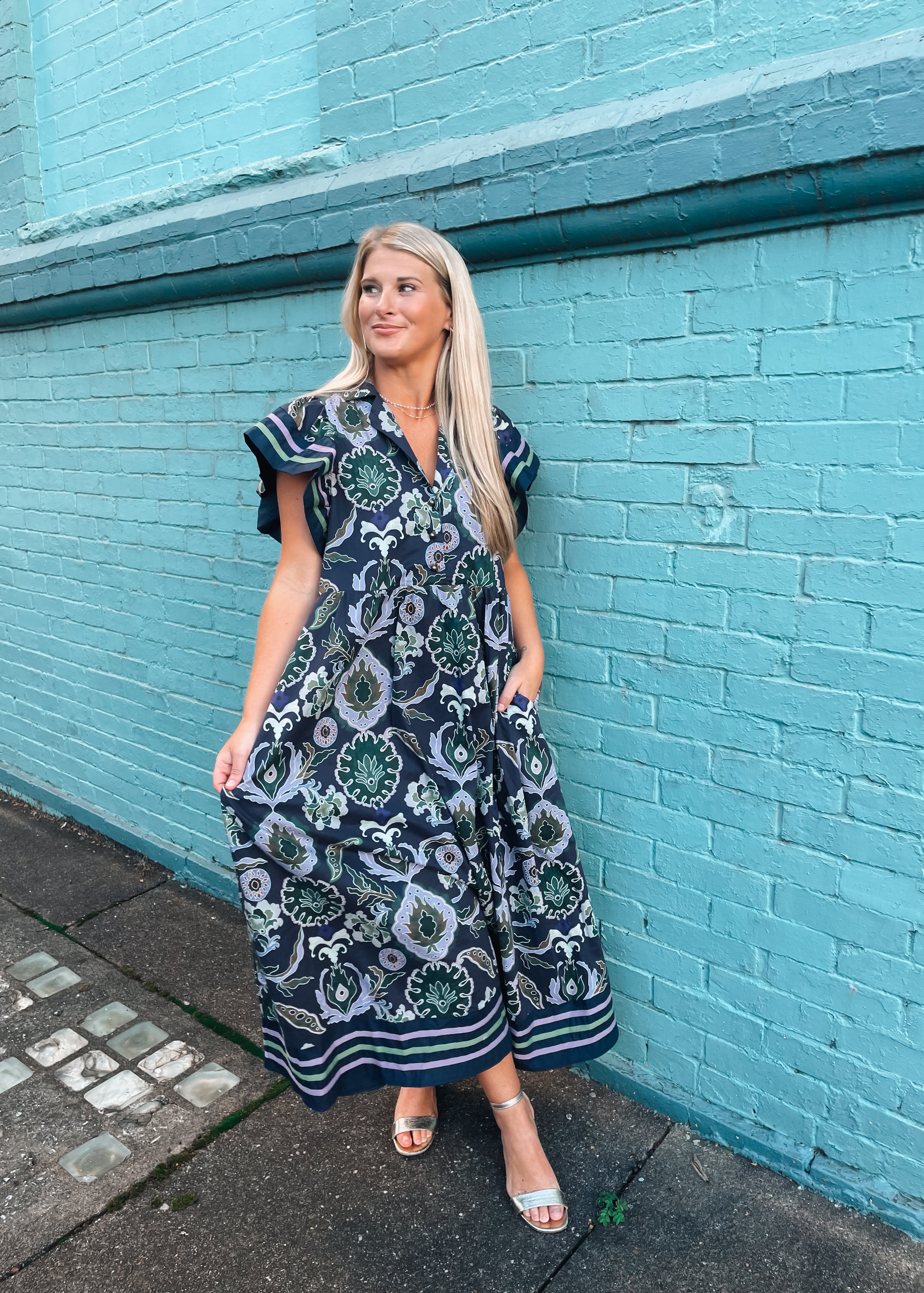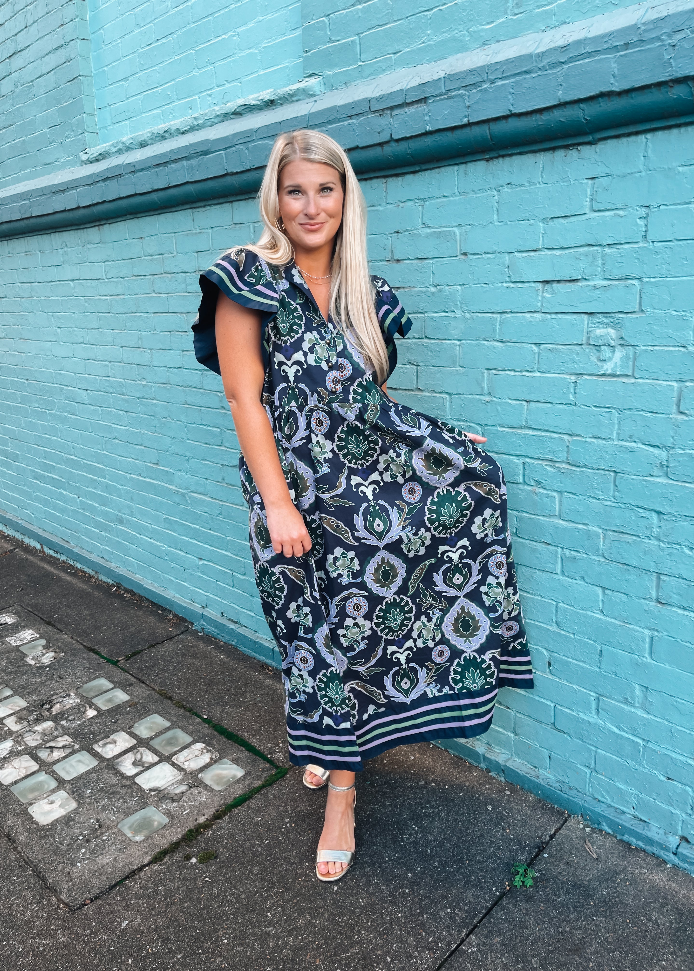 The Come Back Better Midi Dress features a flattering navy base with elegant ruffle sleeves and a chic V-neck collar. Its button-down top offers a structured fit, while the flowy skirt enhances movement and comfort. Featuring a smooth lining for a comfortable fit and hidden pockets for convenience, this dress effortlessly blends style and function, making it an ideal choice for day-to-night wear. Adorned with vibrant blues, greens, and purples in abstract designs, complemented by colorful striped accents on the sleeves and hem, this dress effortlessly blends sophistication with artistic flair��perfect for standing out wherever you go.