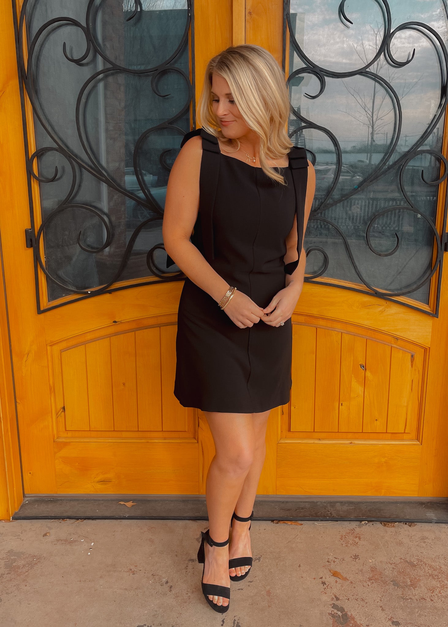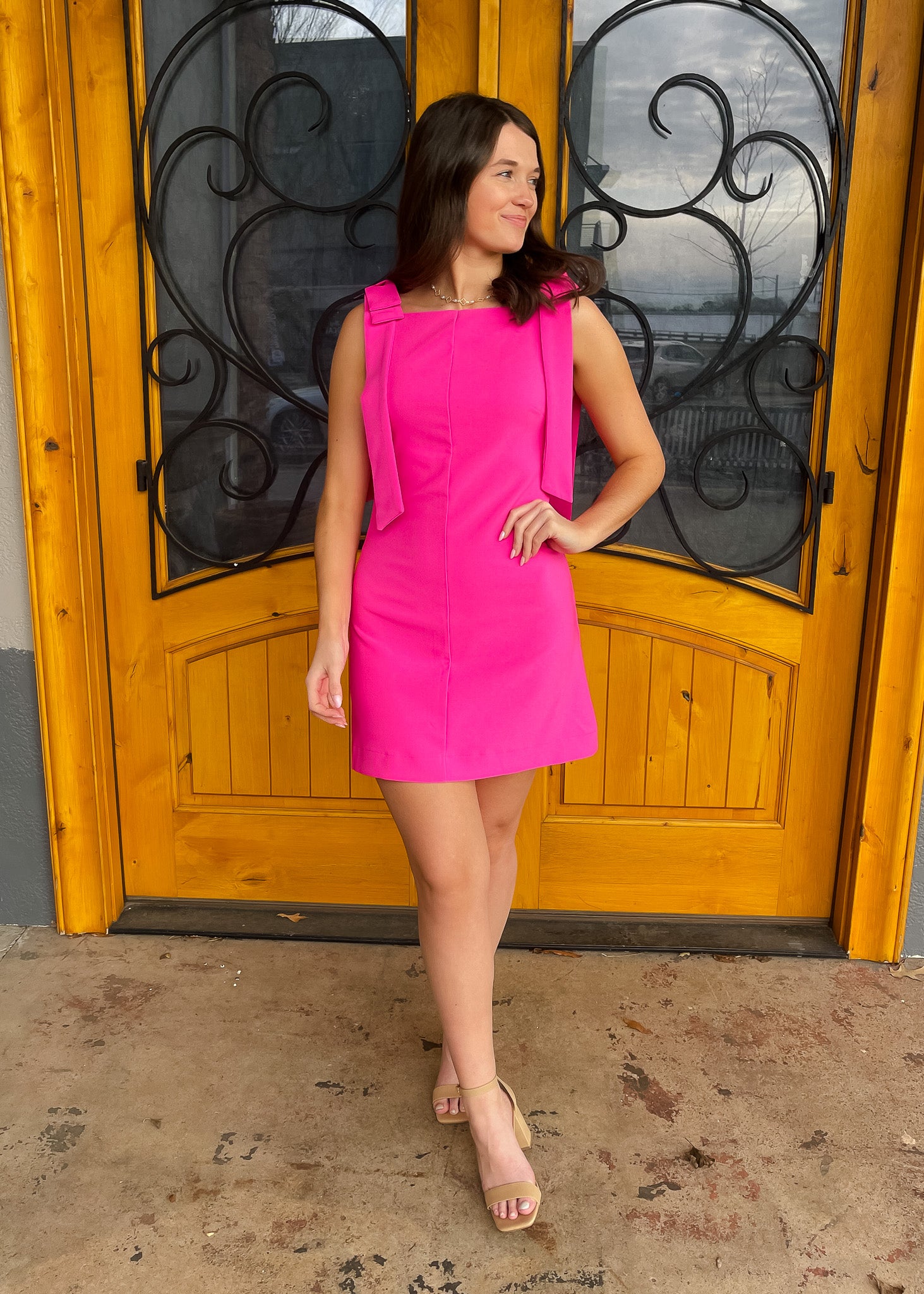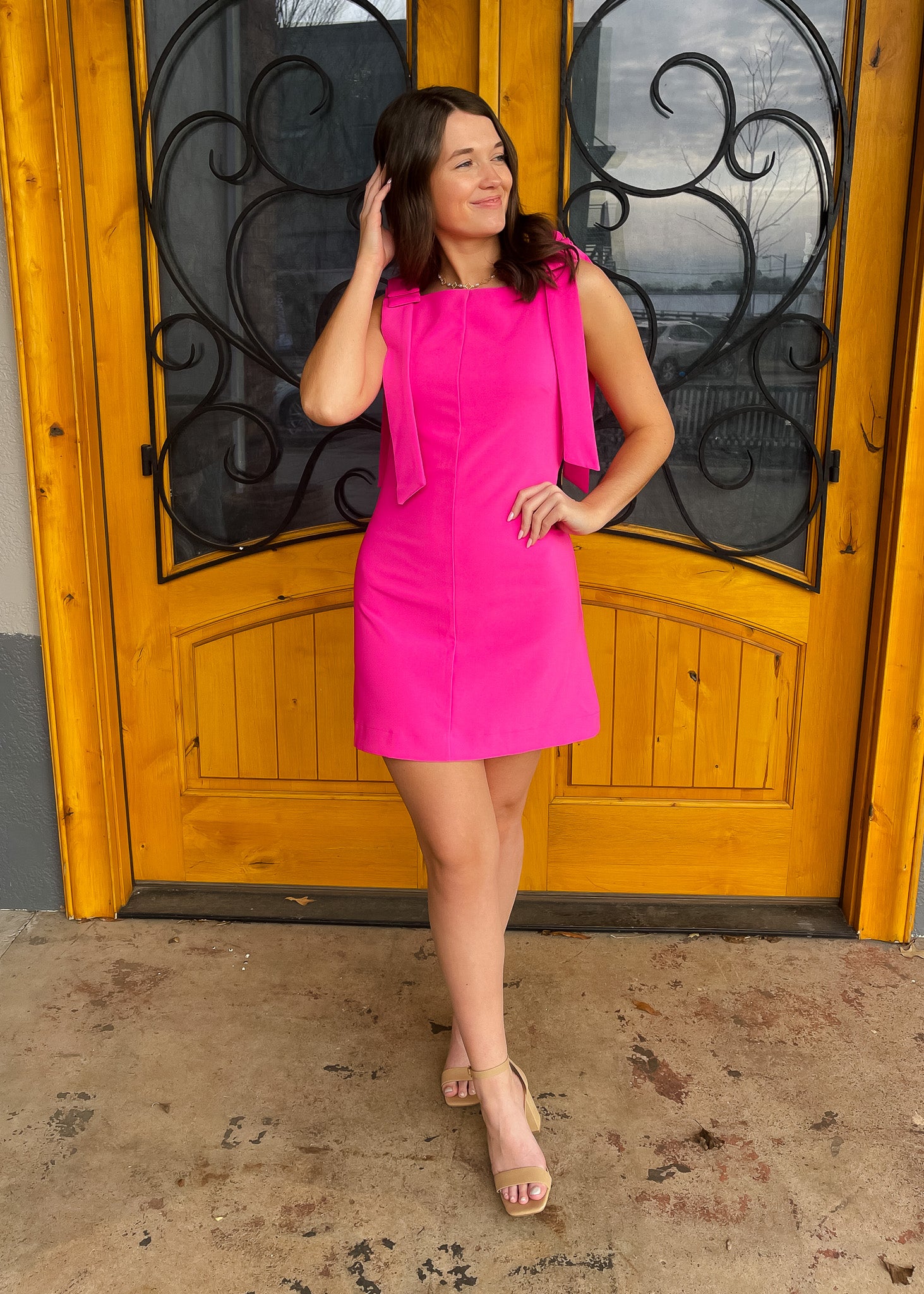 Get down to business in this dress with a playful straight neckline and adorable bow sleeves. Available in both black and pink, this dress is perfect for a day at the office or a night out on the town. Dress up and feel confident in this versatile and stylish option.