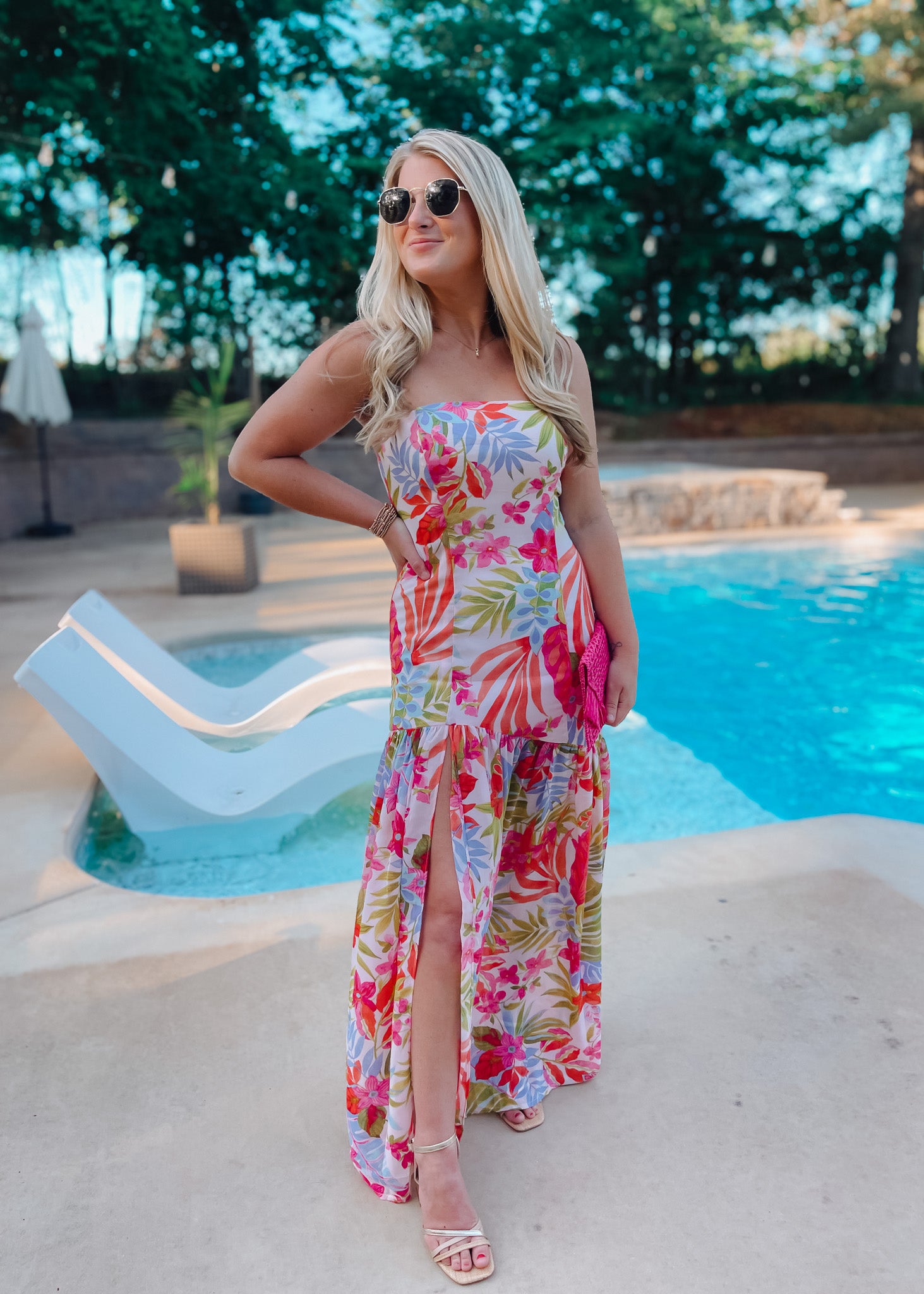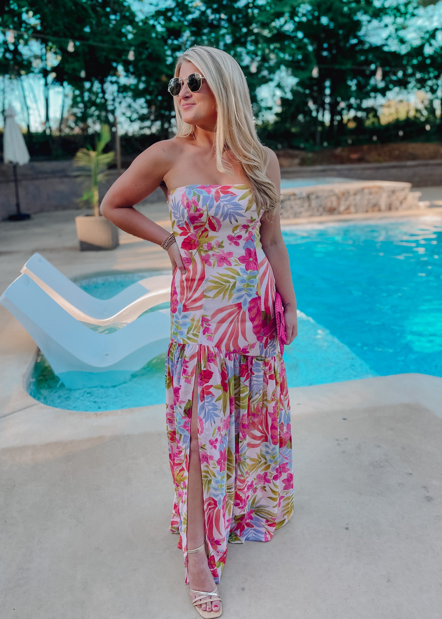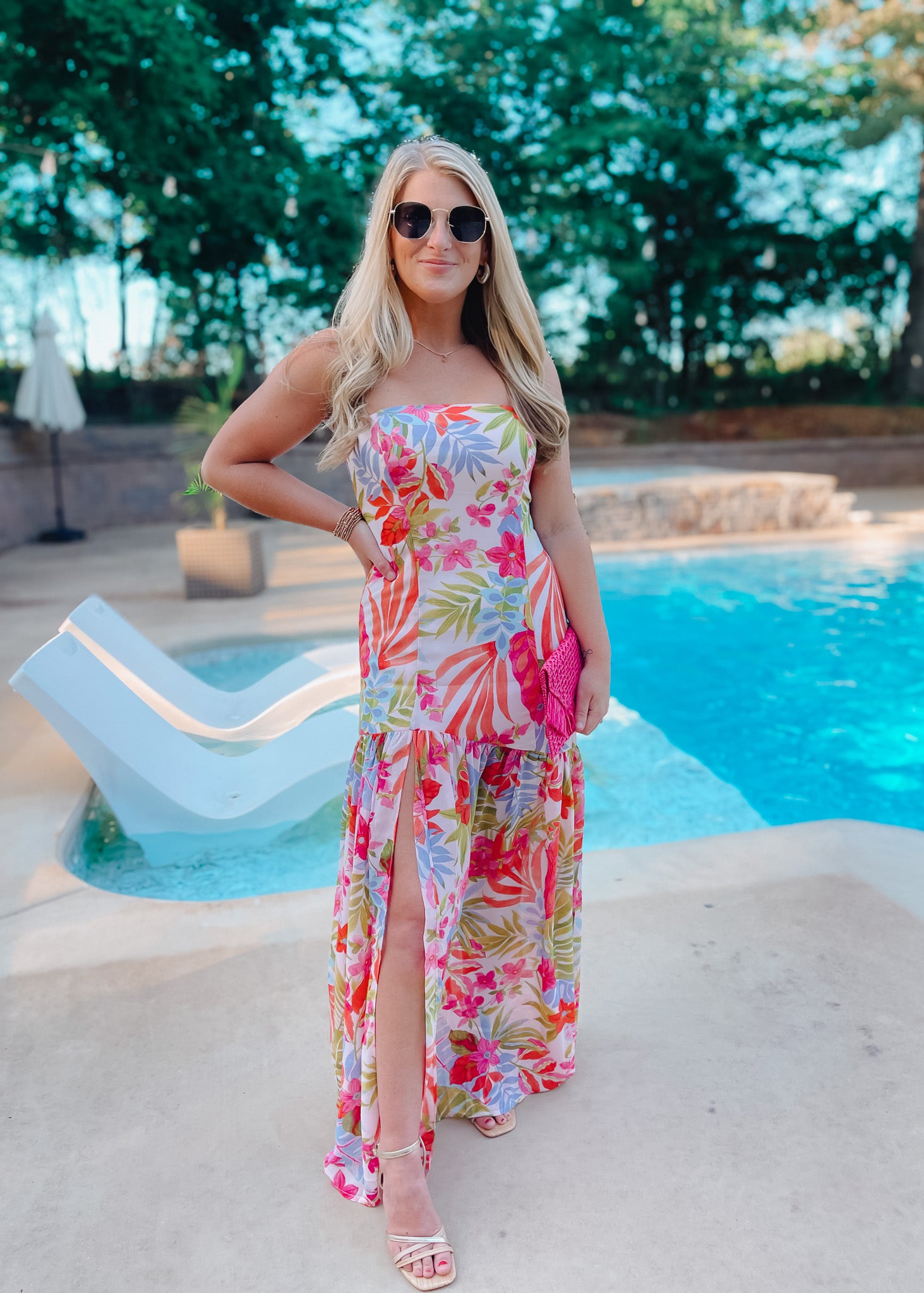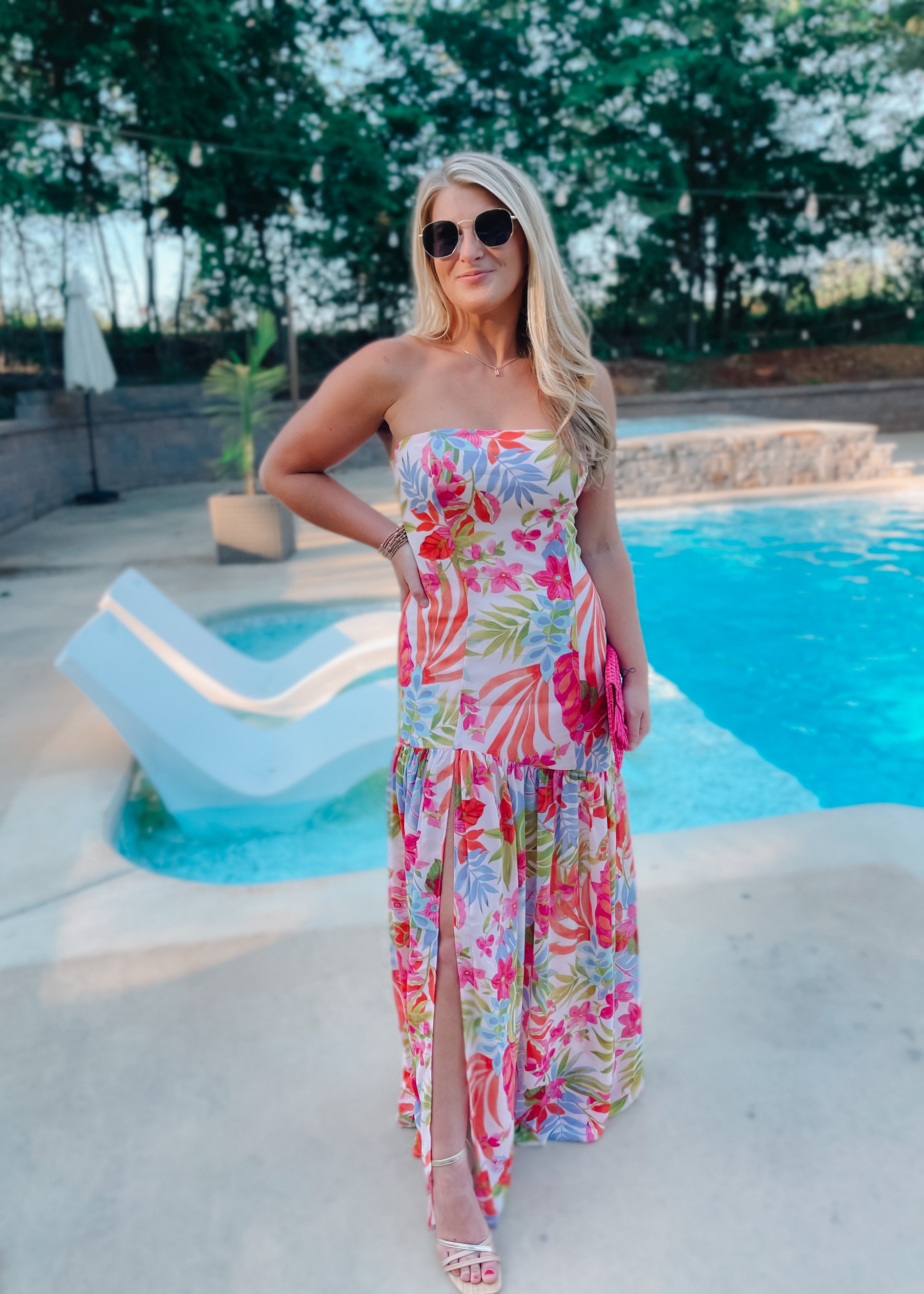 Indulge in effortless, tropical style with our strapless maxi dress! The light pink base is adorned with a vibrant print in shades of orange, green, blue, and hot pink. The smocked panel with center zipper closure guarantees a perfect fit, while the gripper tape keeps the dress in place. Fully lined for ultimate comfort.