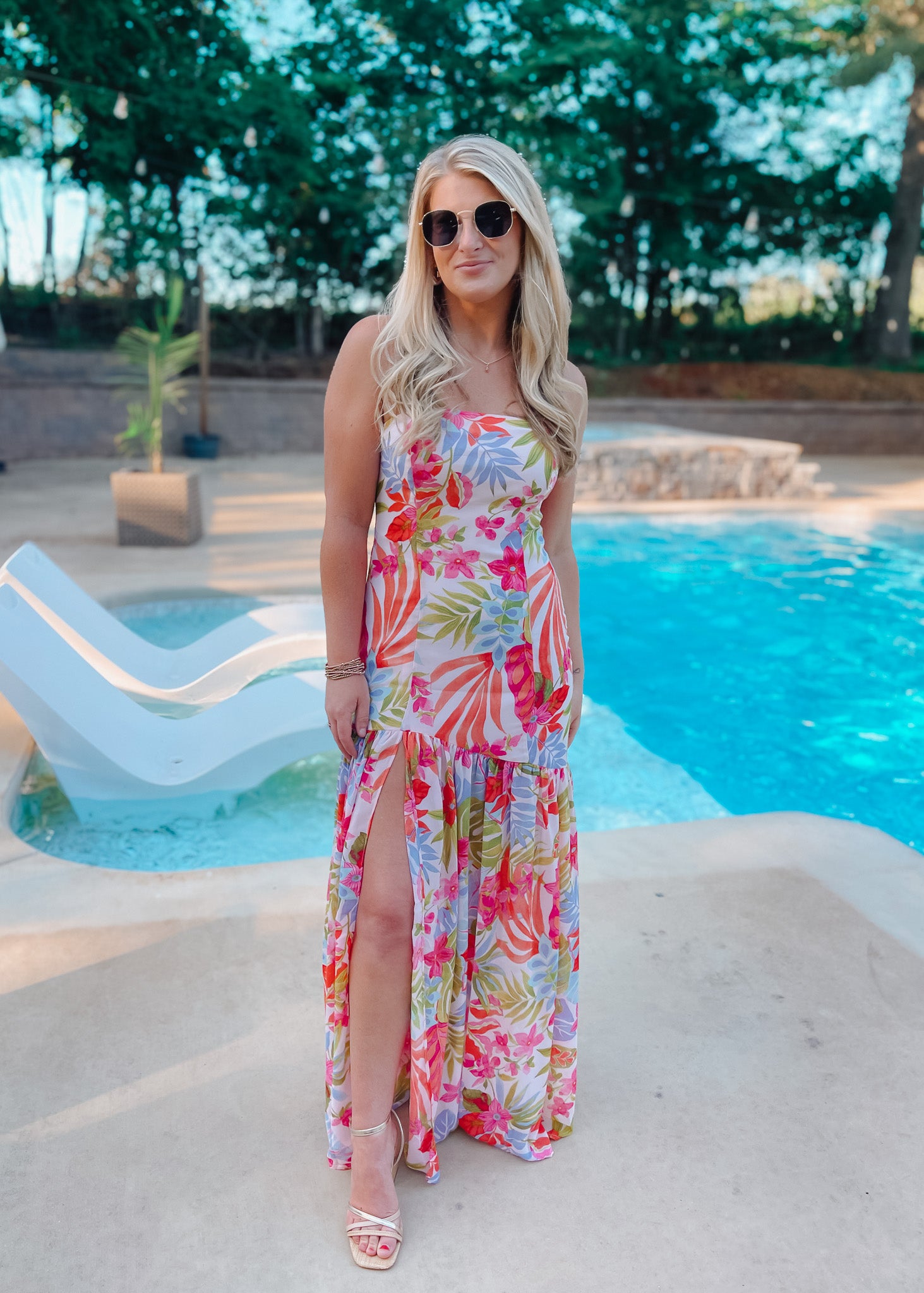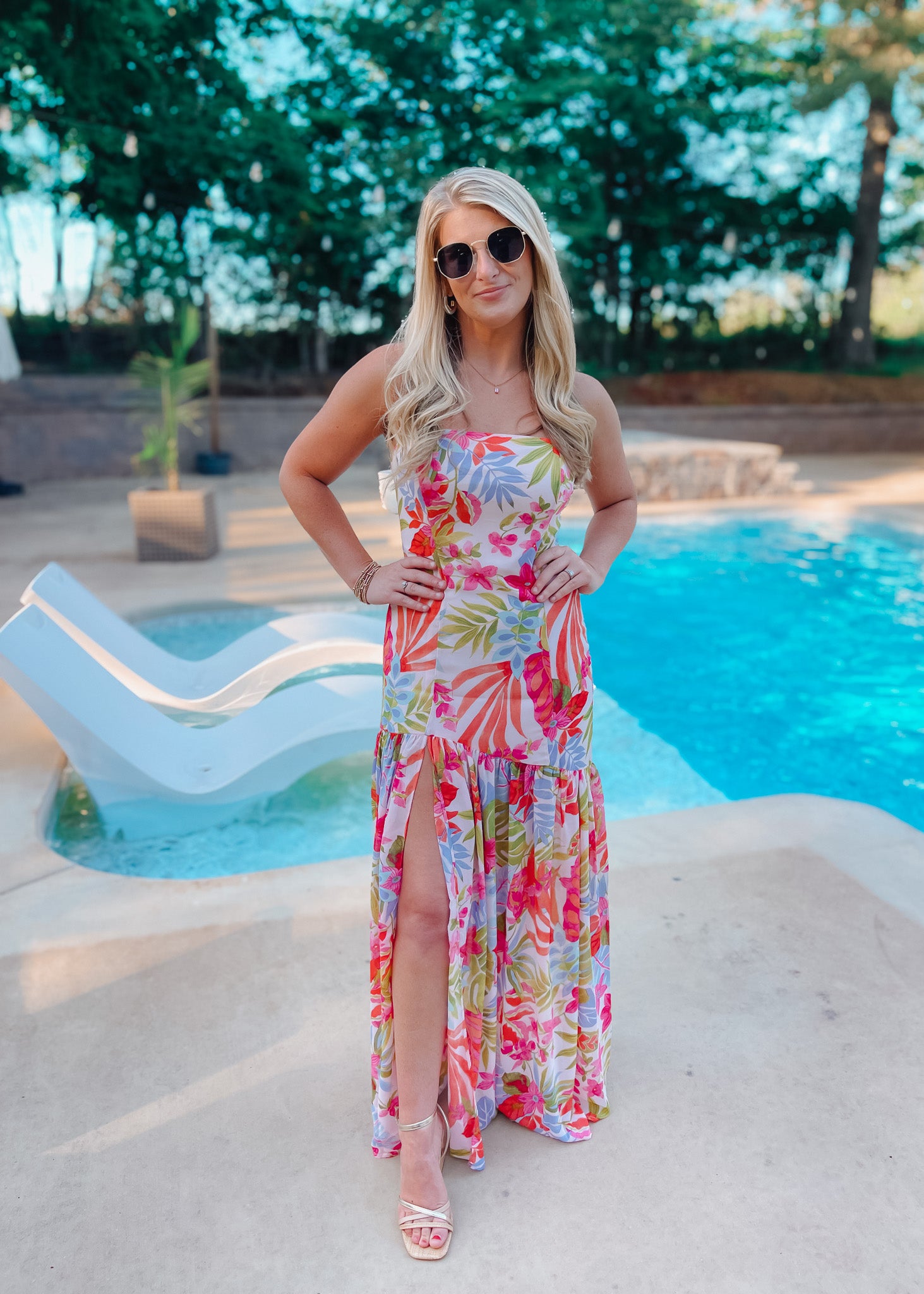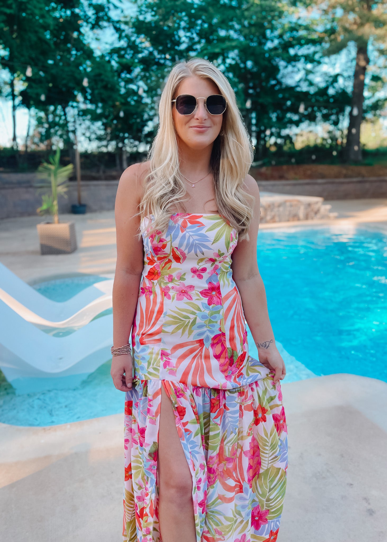 Indulge in effortless, tropical style with our strapless maxi dress! The light pink base is adorned with a vibrant print in shades of orange, green, blue, and hot pink. The smocked panel with center zipper closure guarantees a perfect fit, while the gripper tape keeps the dress in place. Fully lined for ultimate comfort.