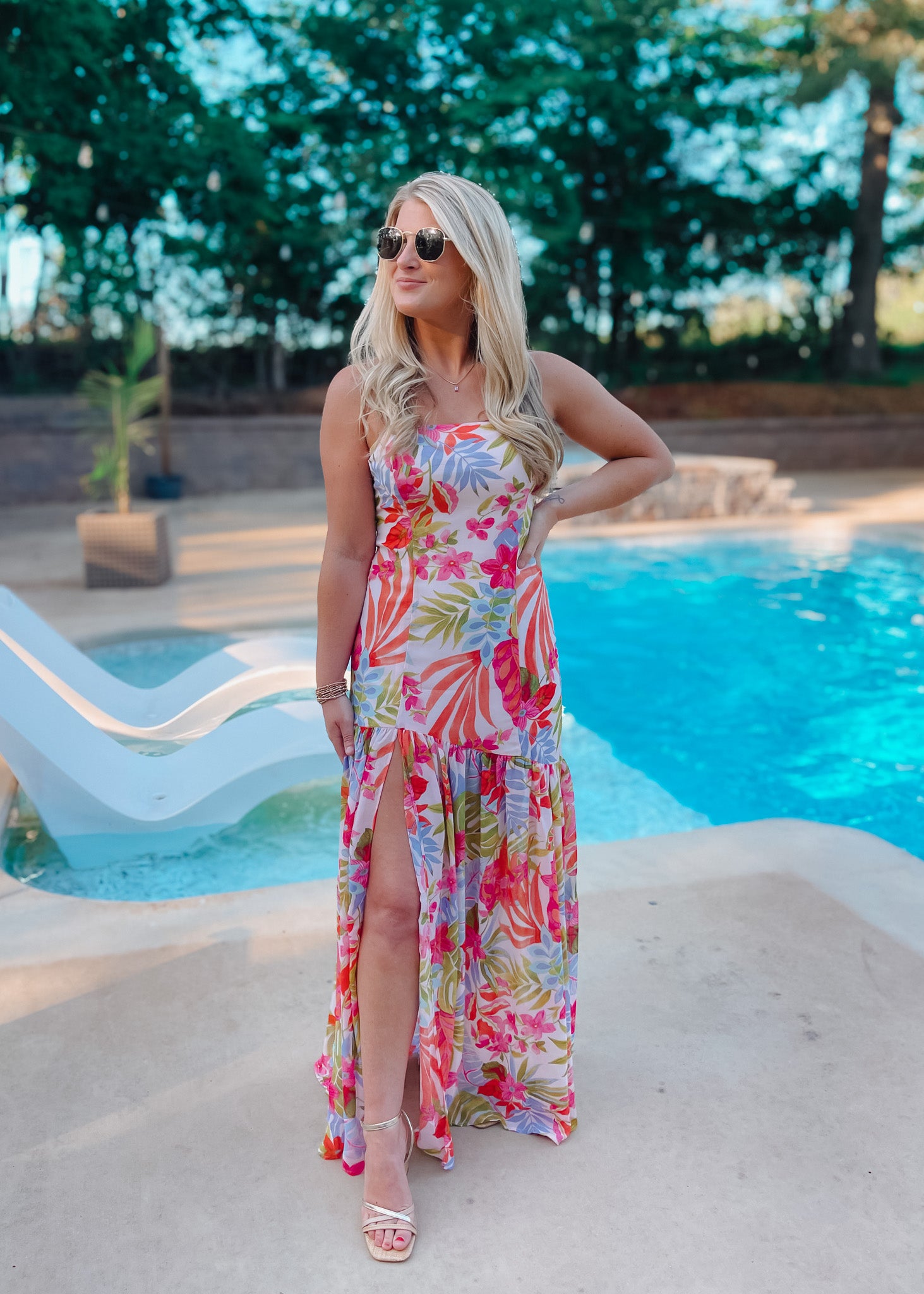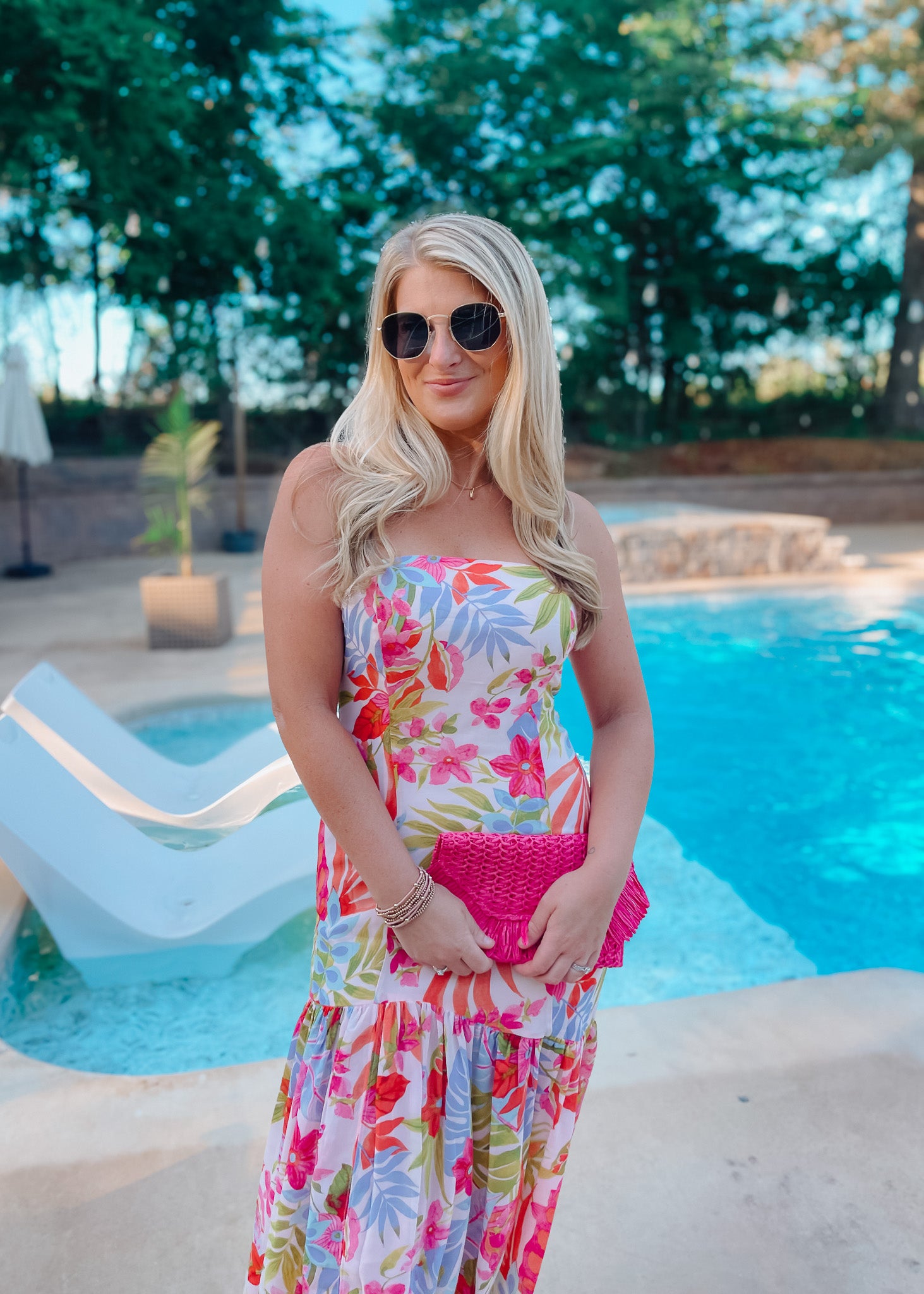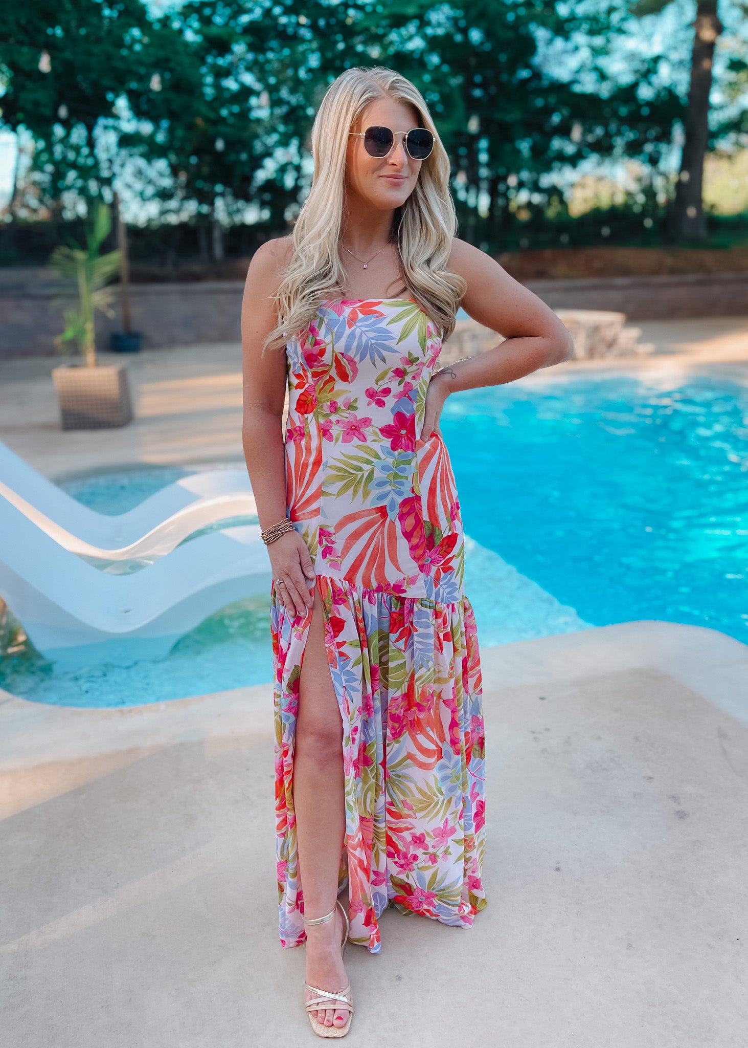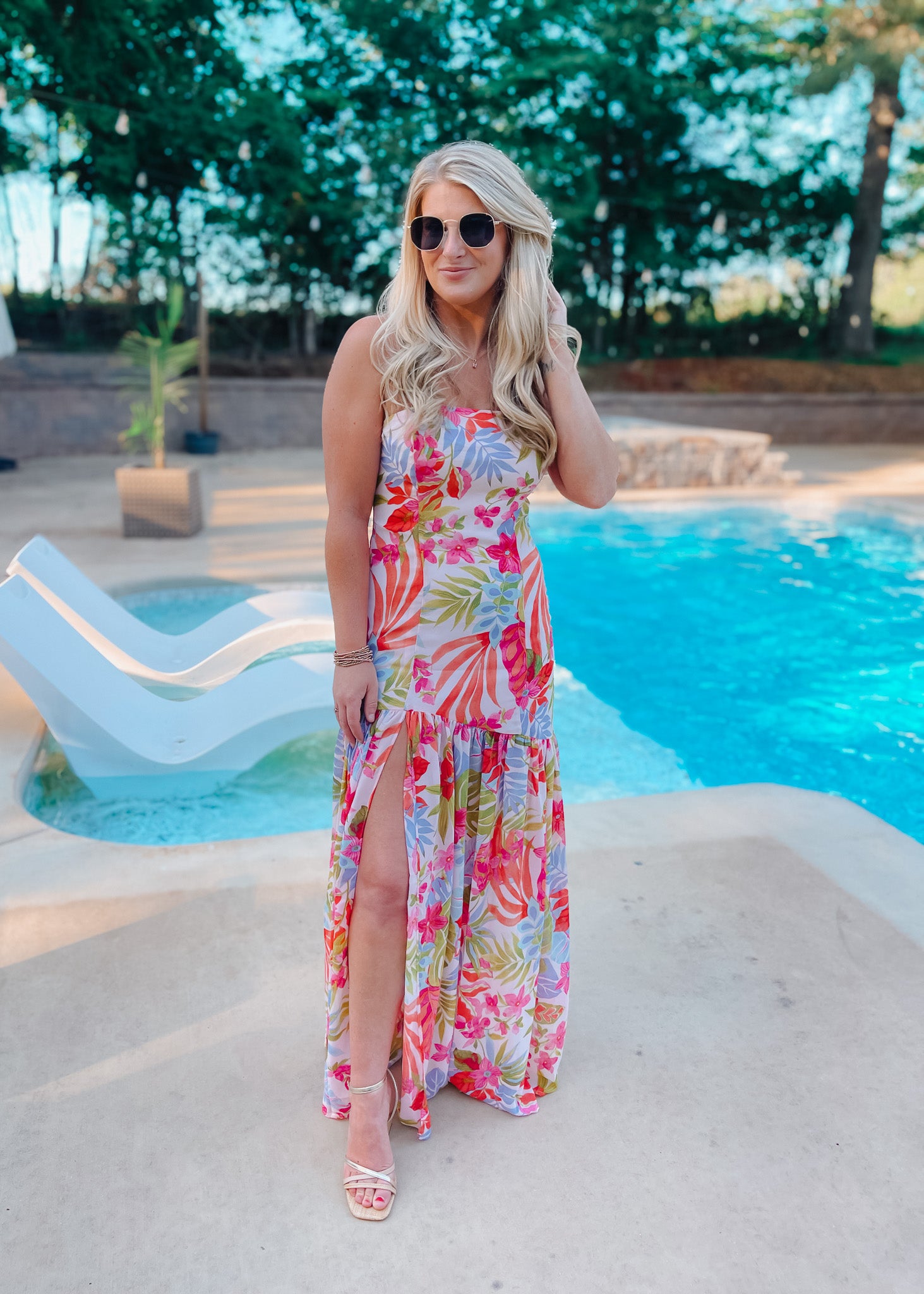 Indulge in effortless, tropical style with our strapless maxi dress! The light pink base is adorned with a vibrant print in shades of orange, green, blue, and hot pink. The smocked panel with center zipper closure guarantees a perfect fit, while the gripper tape keeps the dress in place. Fully lined for ultimate comfort.