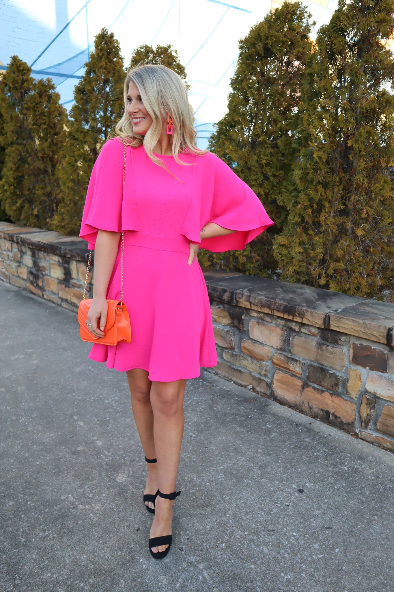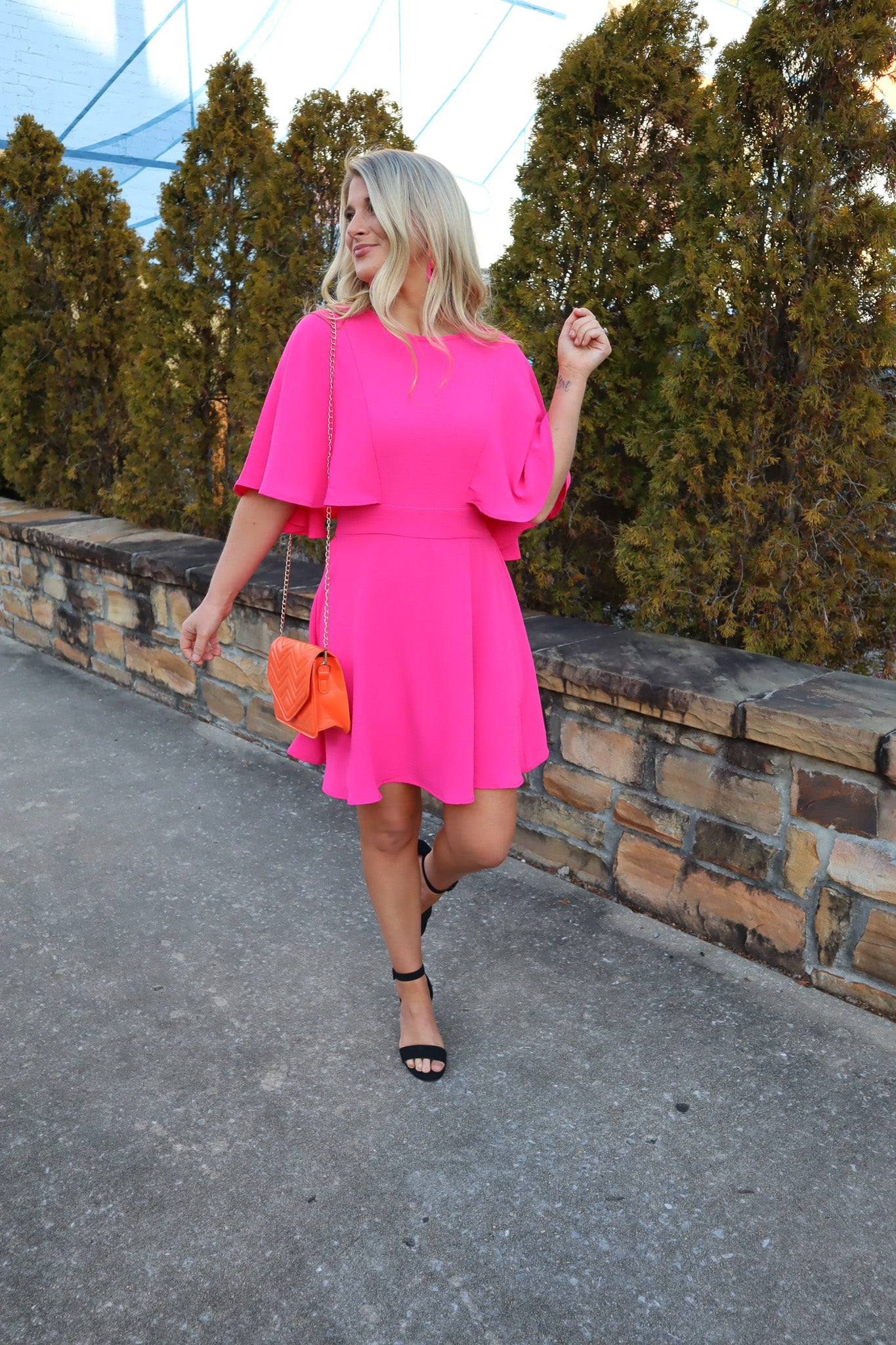 Dress features a stunning fuchsia color, flared short sleeves, crew neck line, keyhole button closure, flared skirt detail and runs true to size!�
