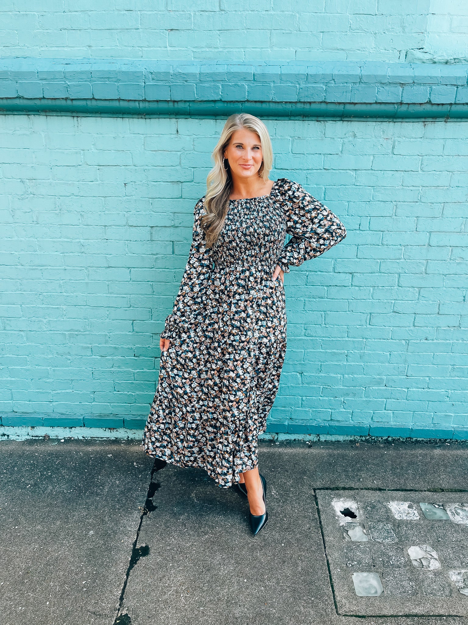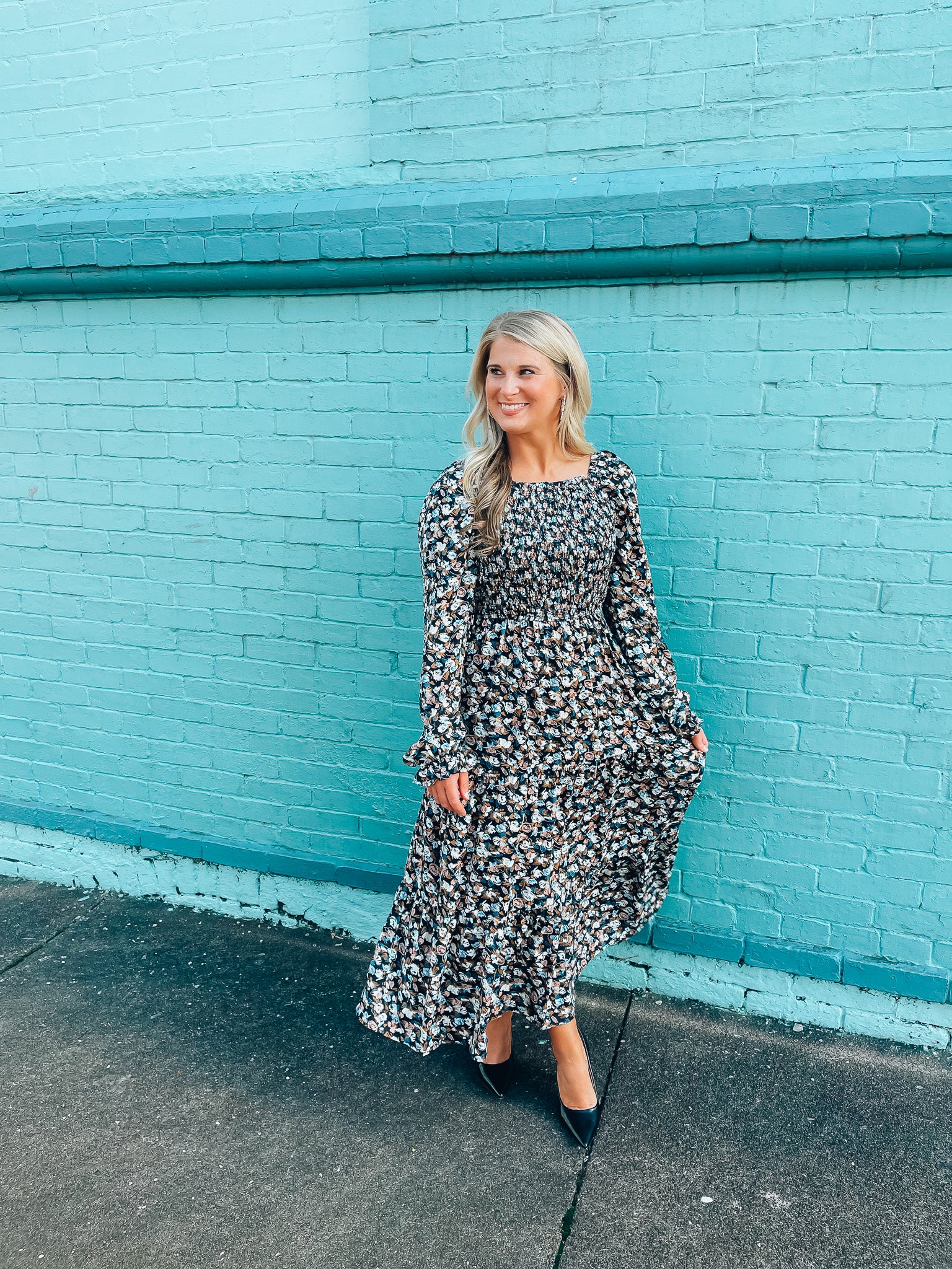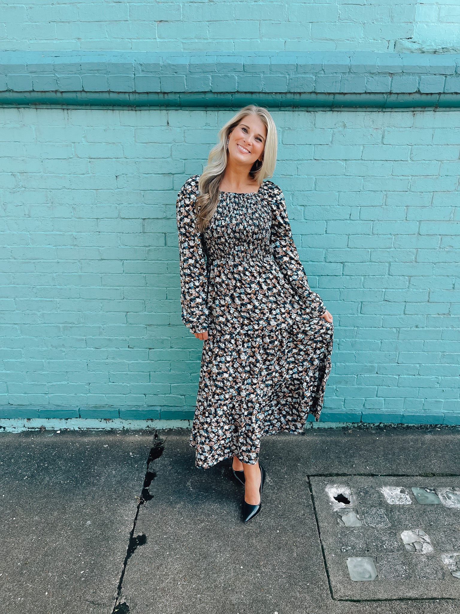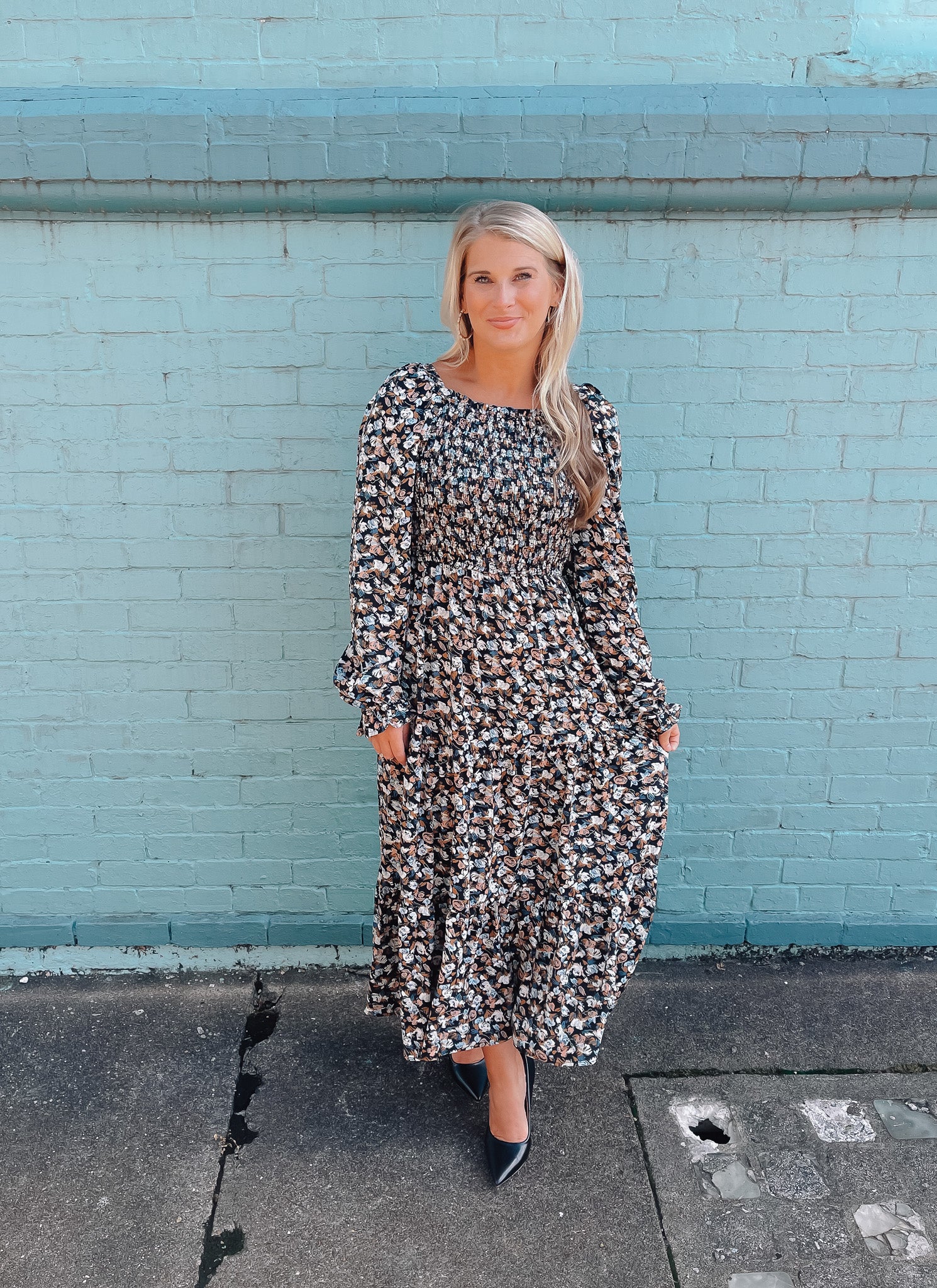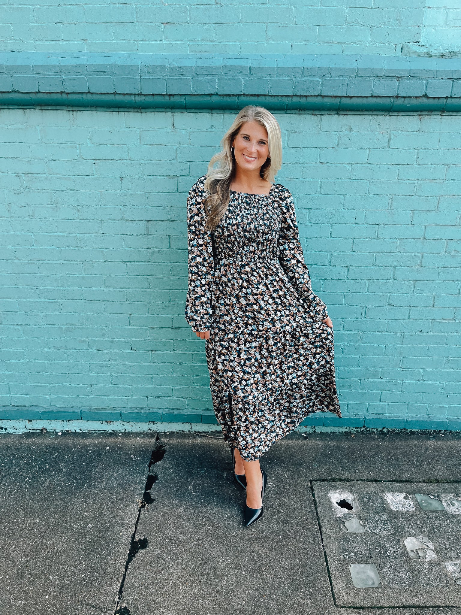 Elevate your look with the Forever With Me Smocked Midi Dress. This chic black dress is decorated with a timeless tan and blue floral print, and stylishly smocked detailing. Enjoy the perfect balance of comfort and style for any occasion. Take your wardrobe to the next level with Forever With Me.