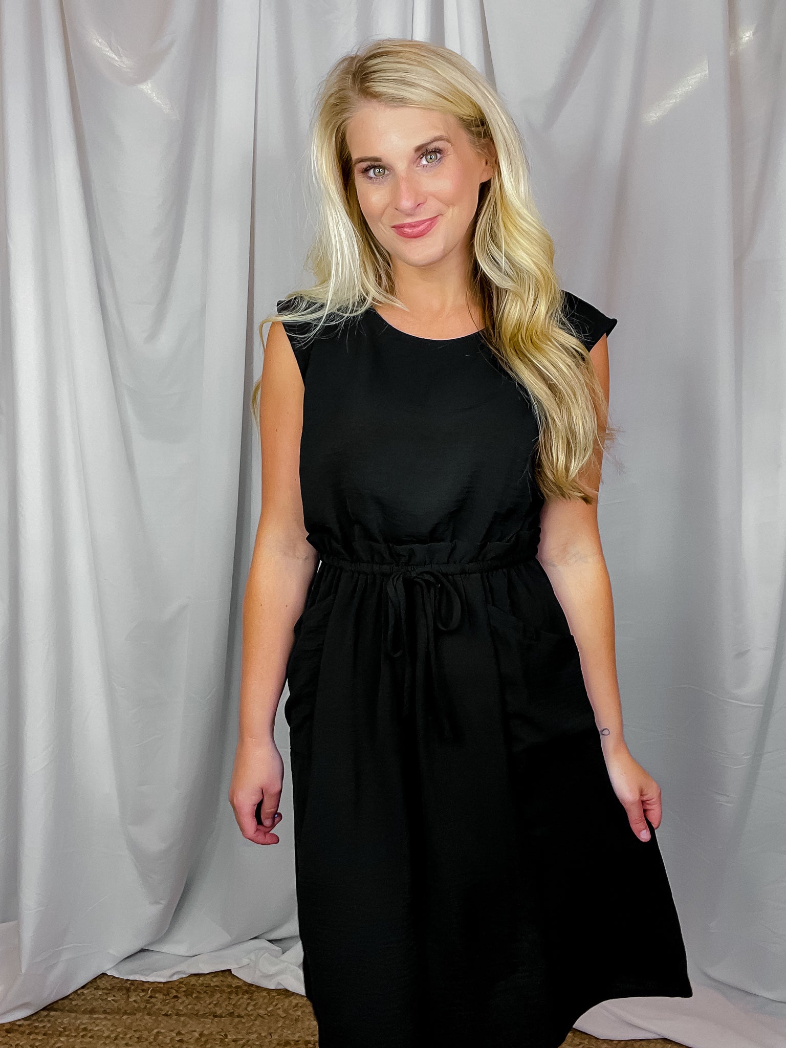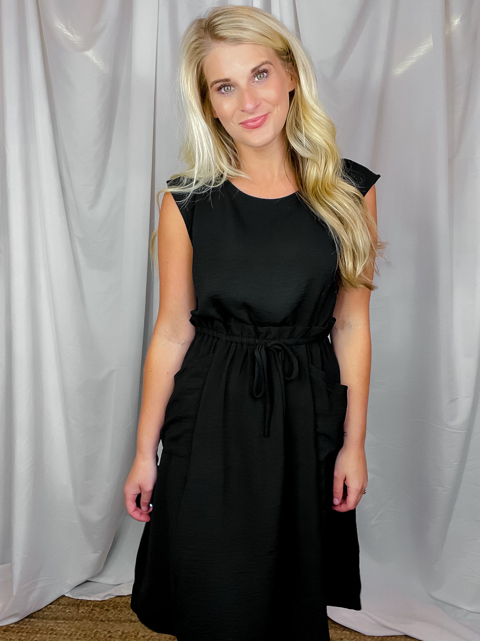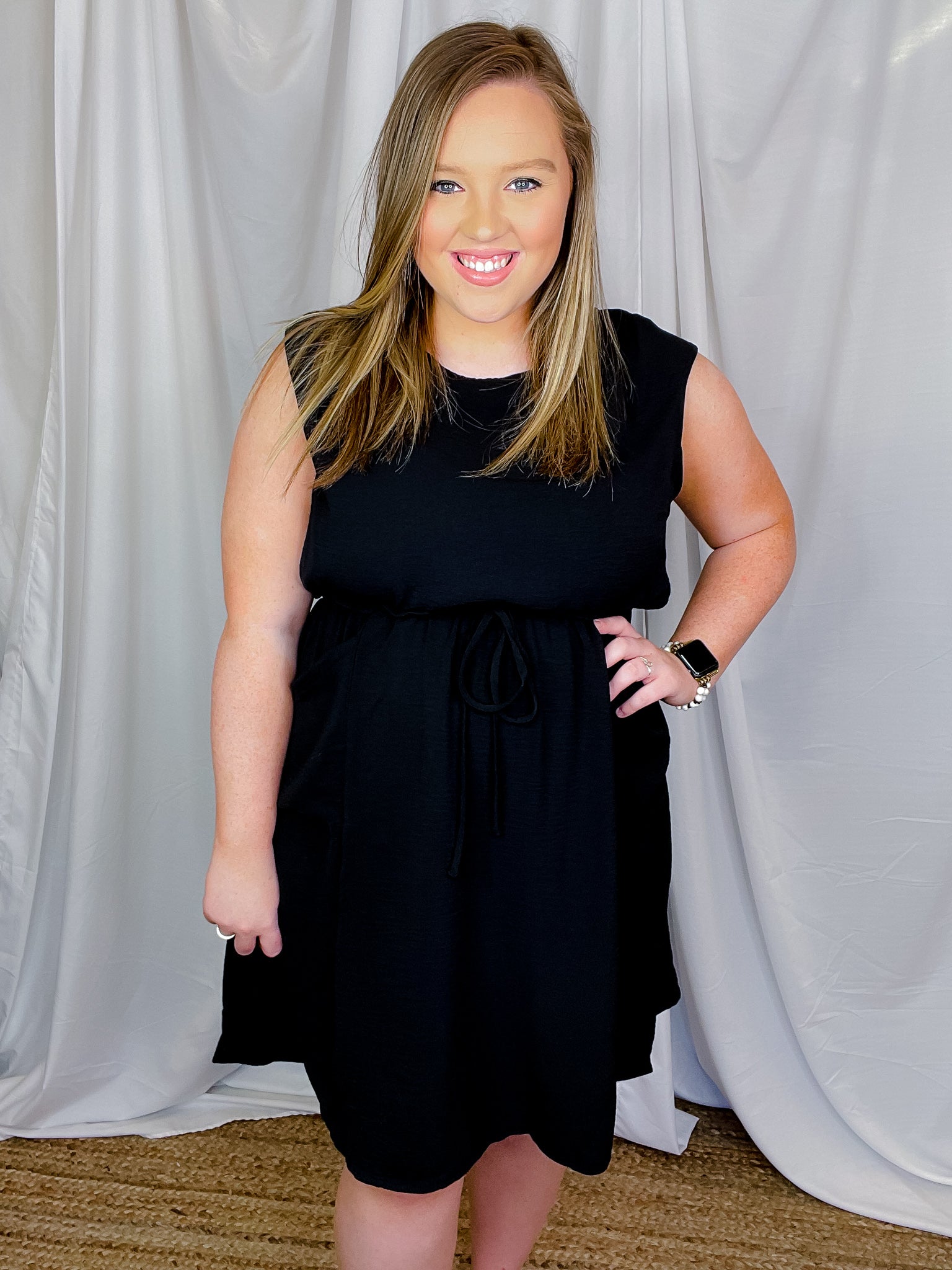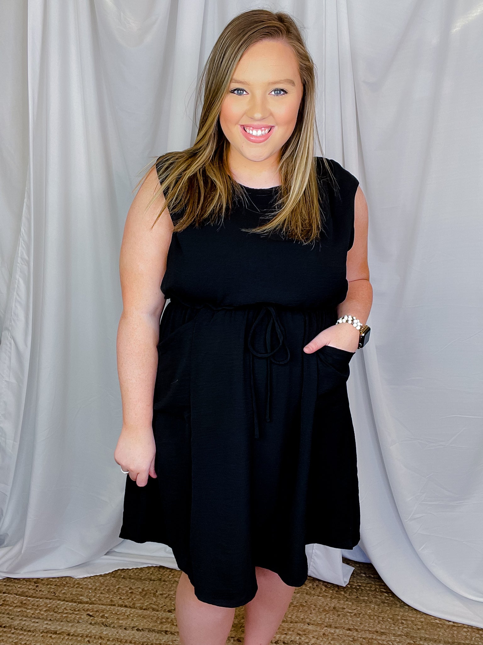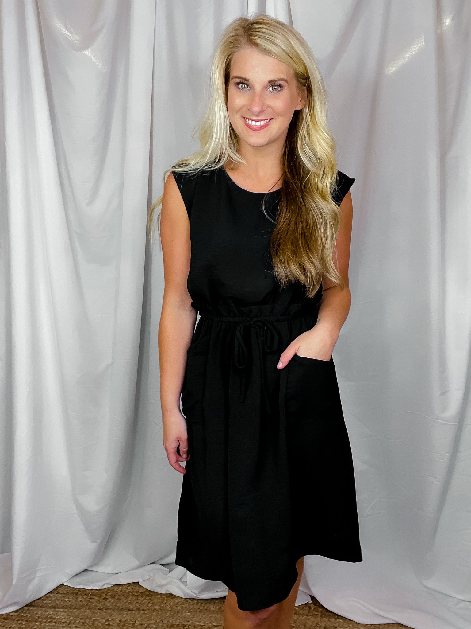 Dress features a solid base color, sleeveless detail, adjustable tie waist, front pocket detail and runs true to size!�