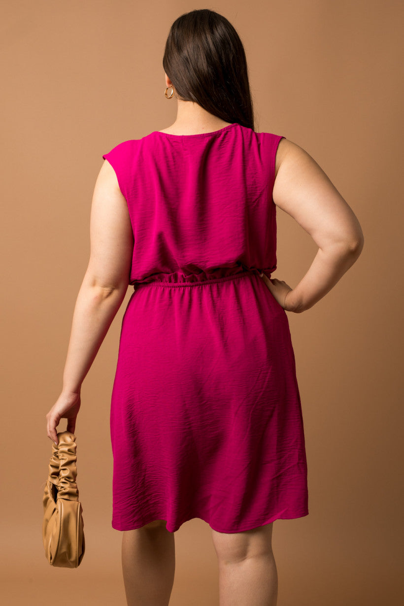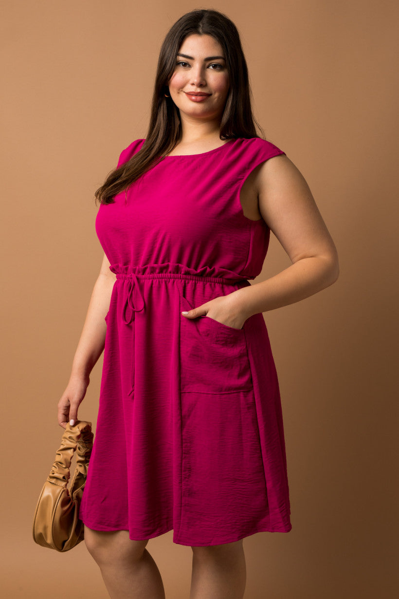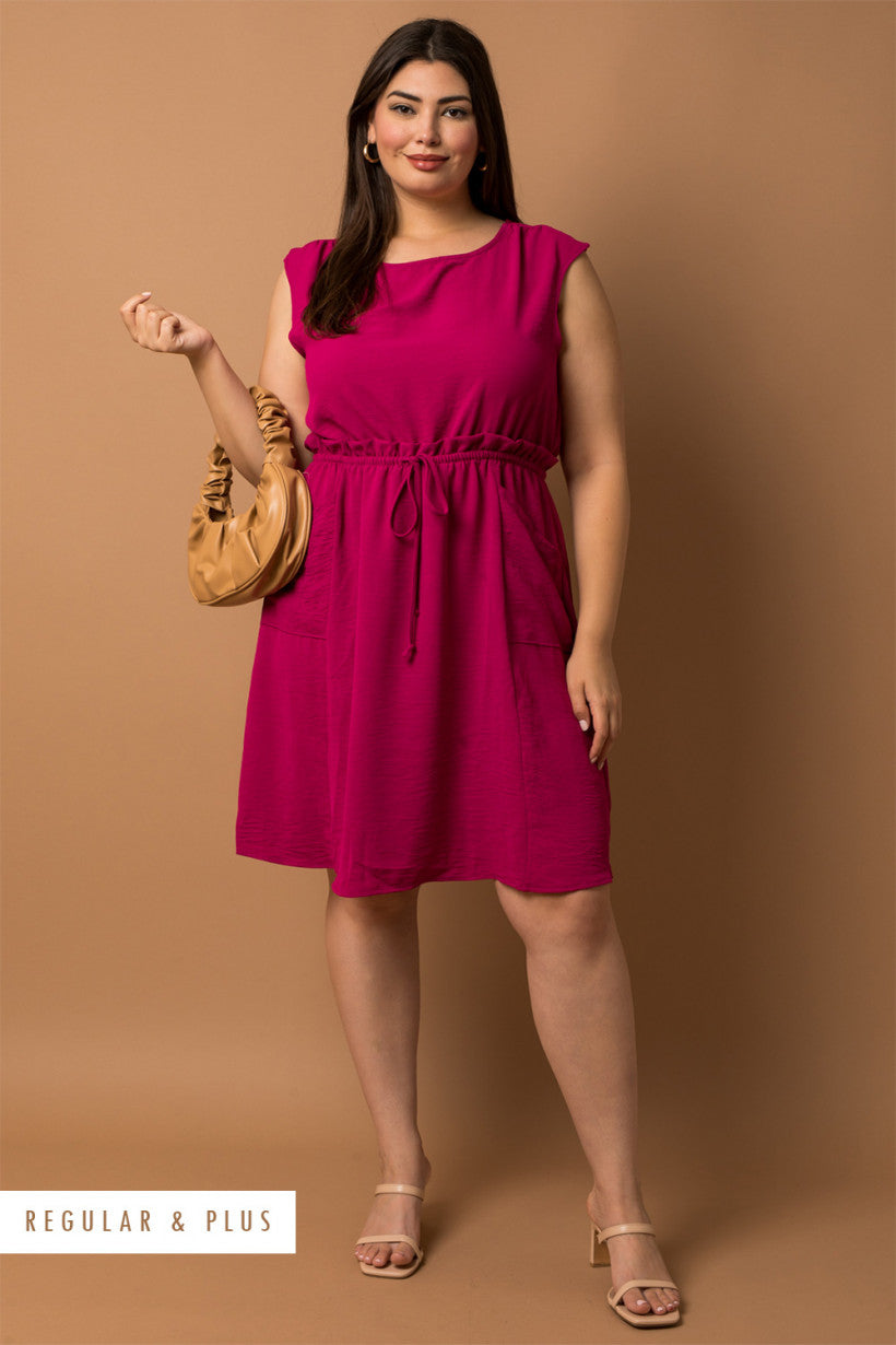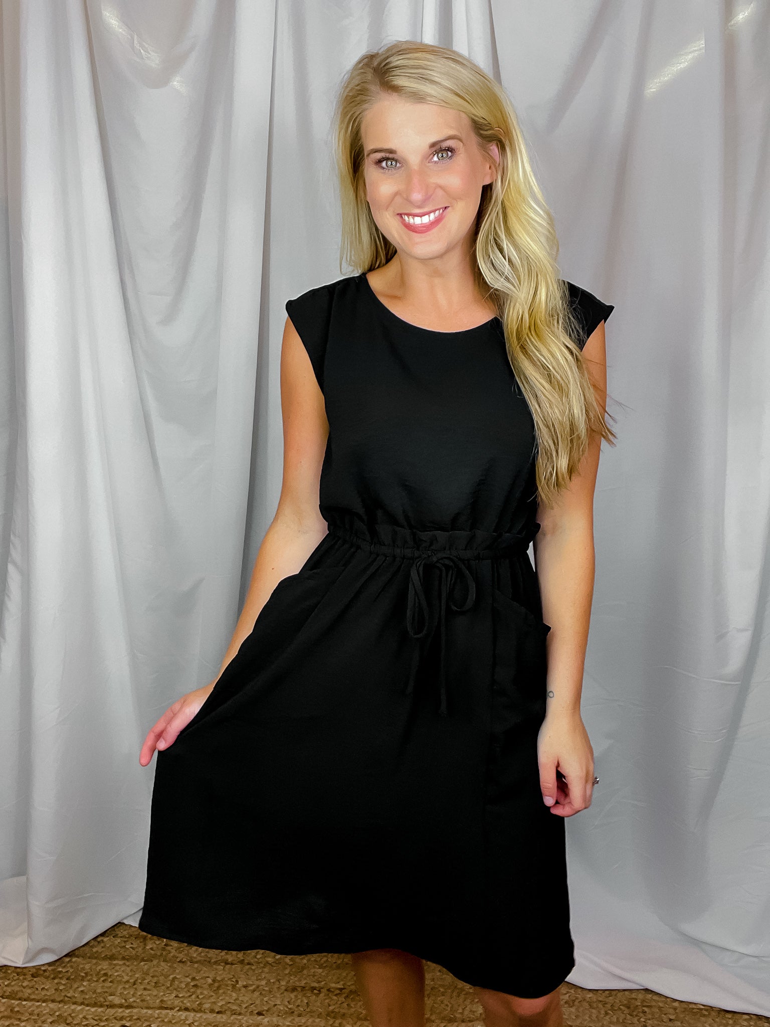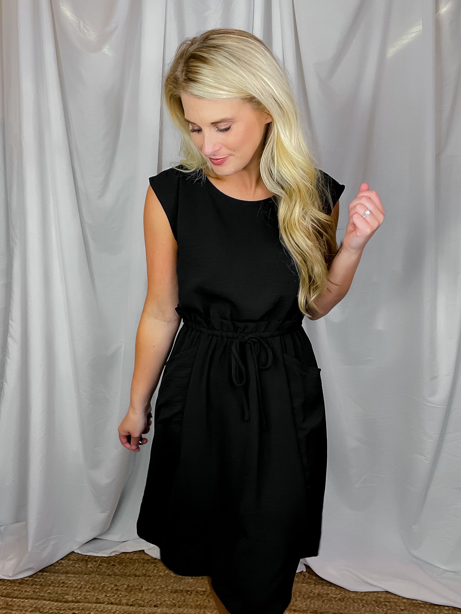 Dress features a solid base color, sleeveless detail, adjustable tie waist, front pocket detail and runs true to size!�