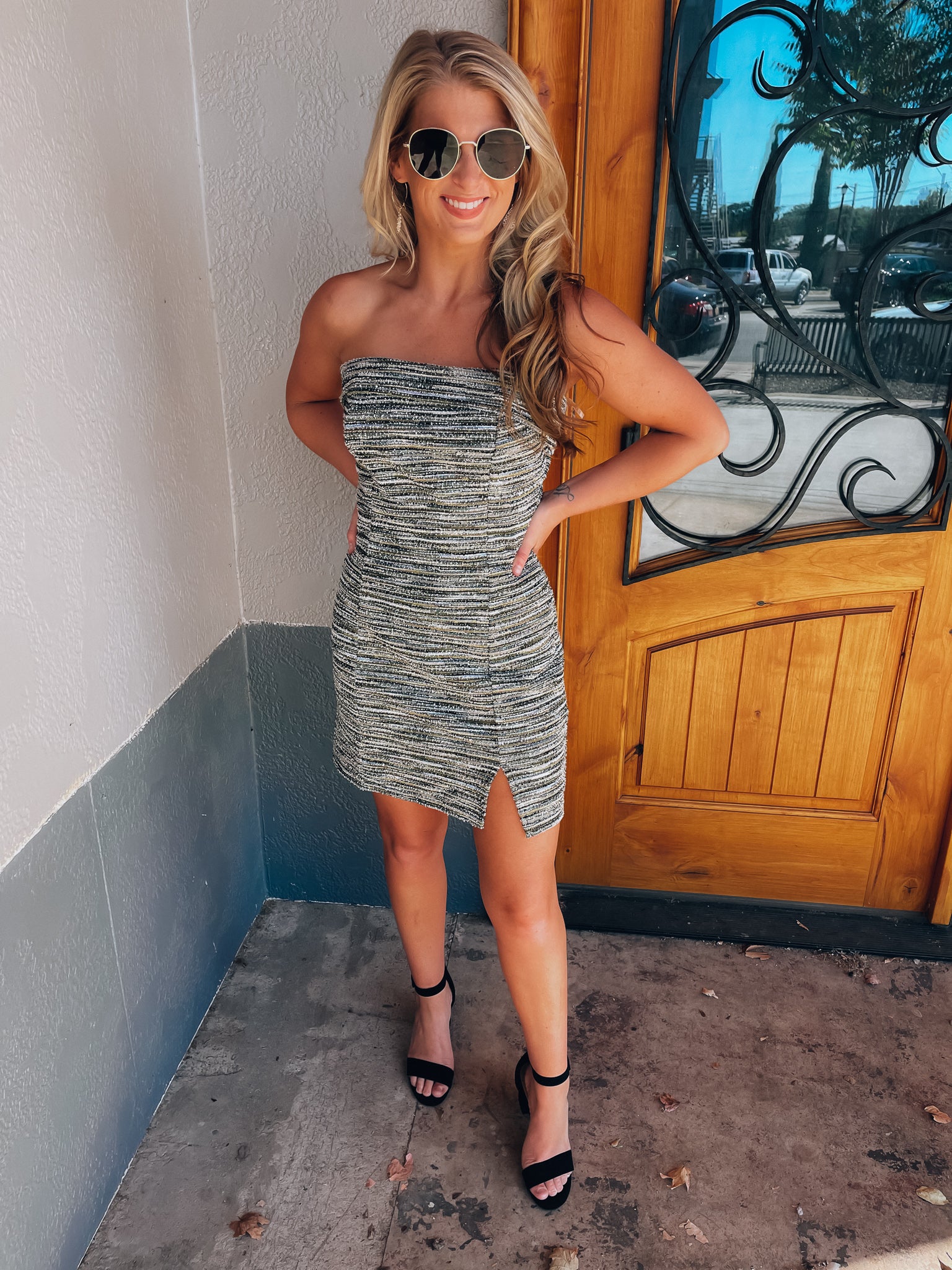 Dress features an olive/ black coloring, tweed material, mini length, strapless detail, fitted and runs true to size!�
