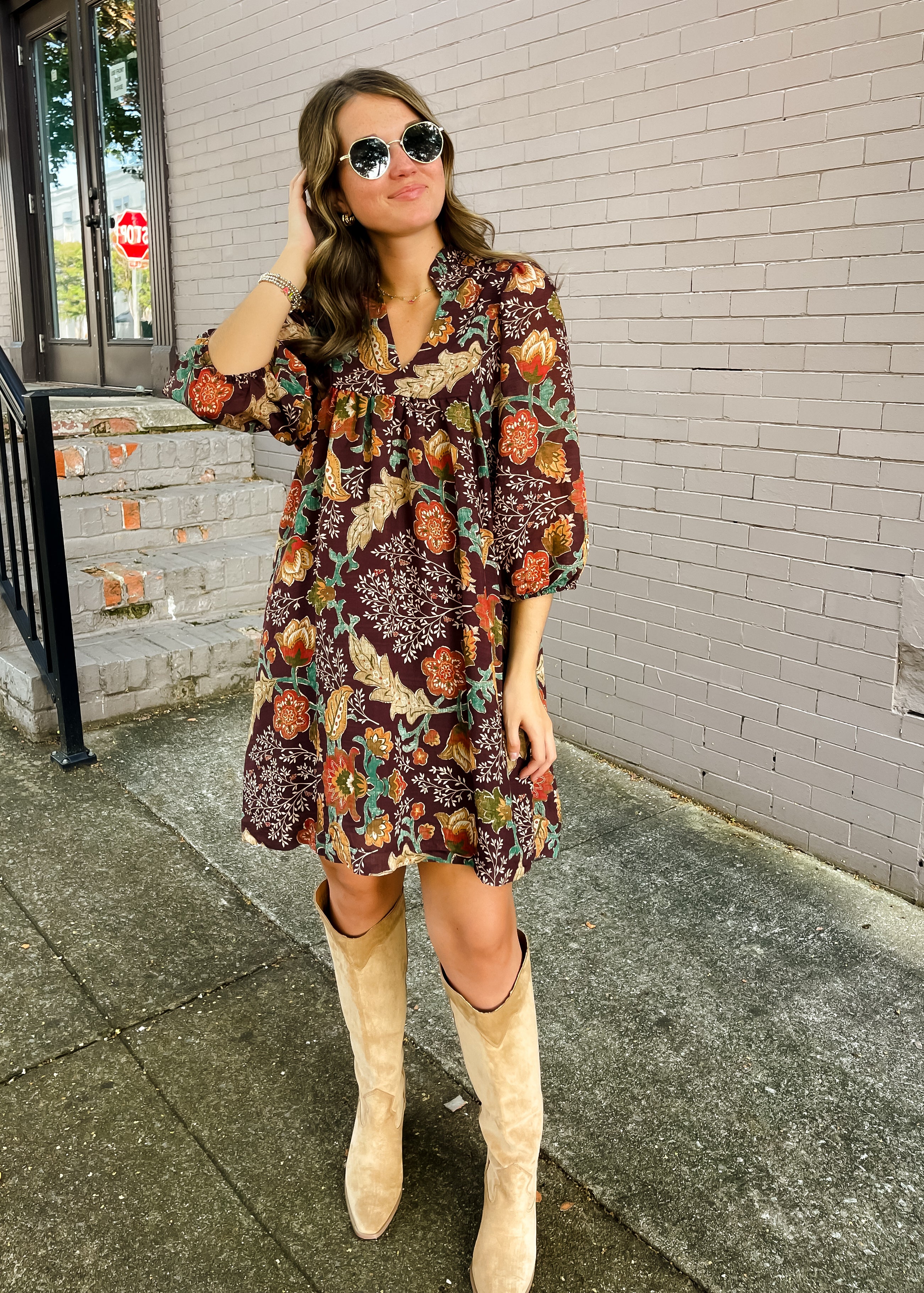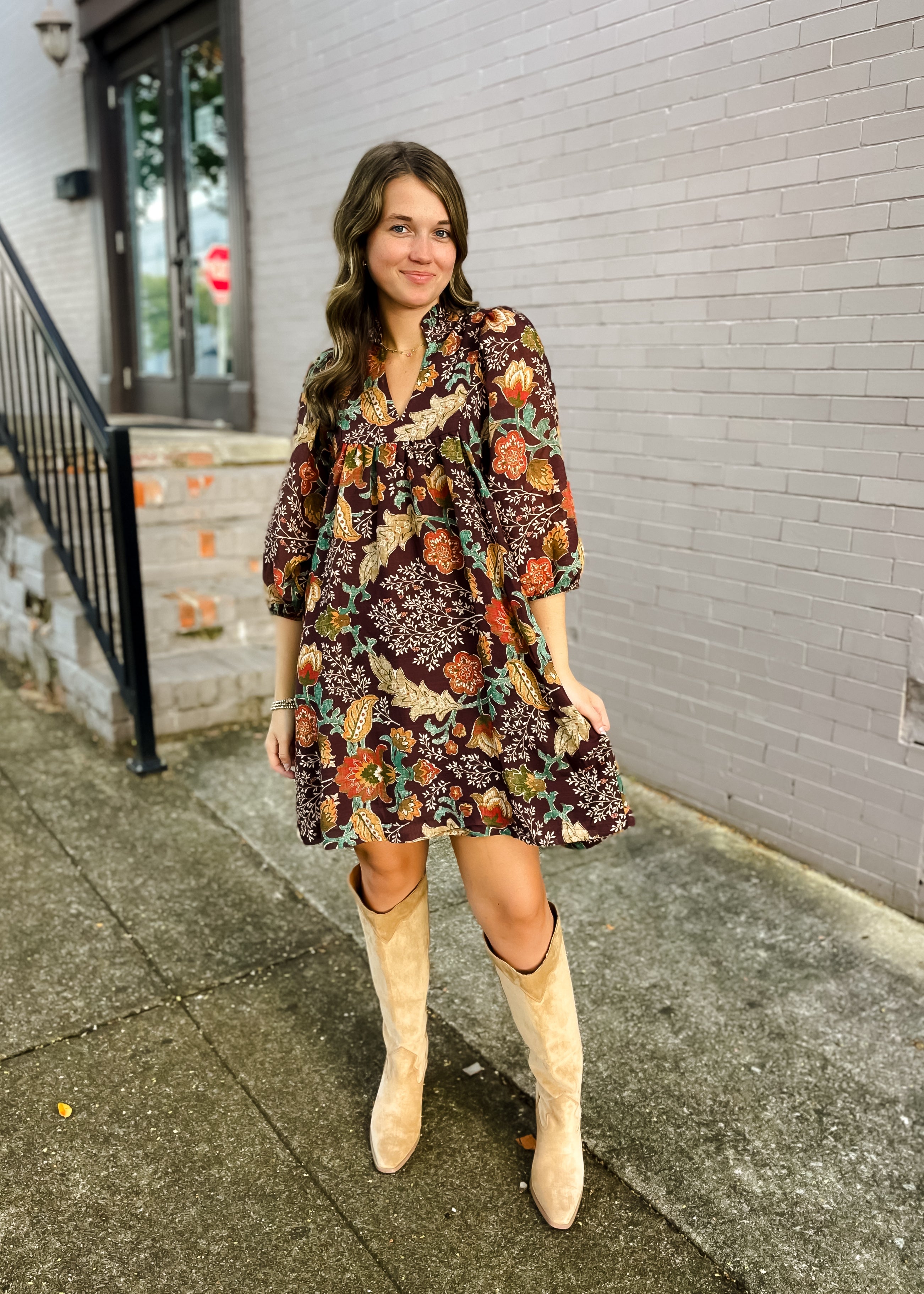 Elevate your wardrobe with the Her Sweet Side Dress, featuring a rich brown base adorned with delicate fall floral patterns. Its flattering V-neck and softly puffed quarter-length sleeves add a touch of romance, while the fully lined design ensures comfort and quality. Perfect for cozy gatherings or stylish outings, this dress combines seasonal charm with effortless elegance.