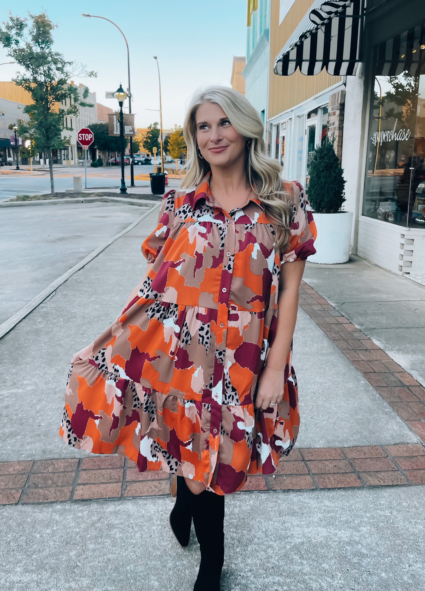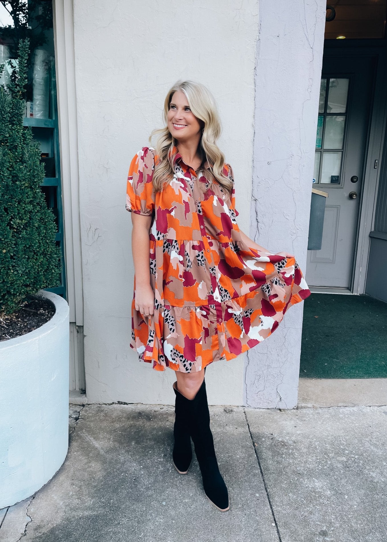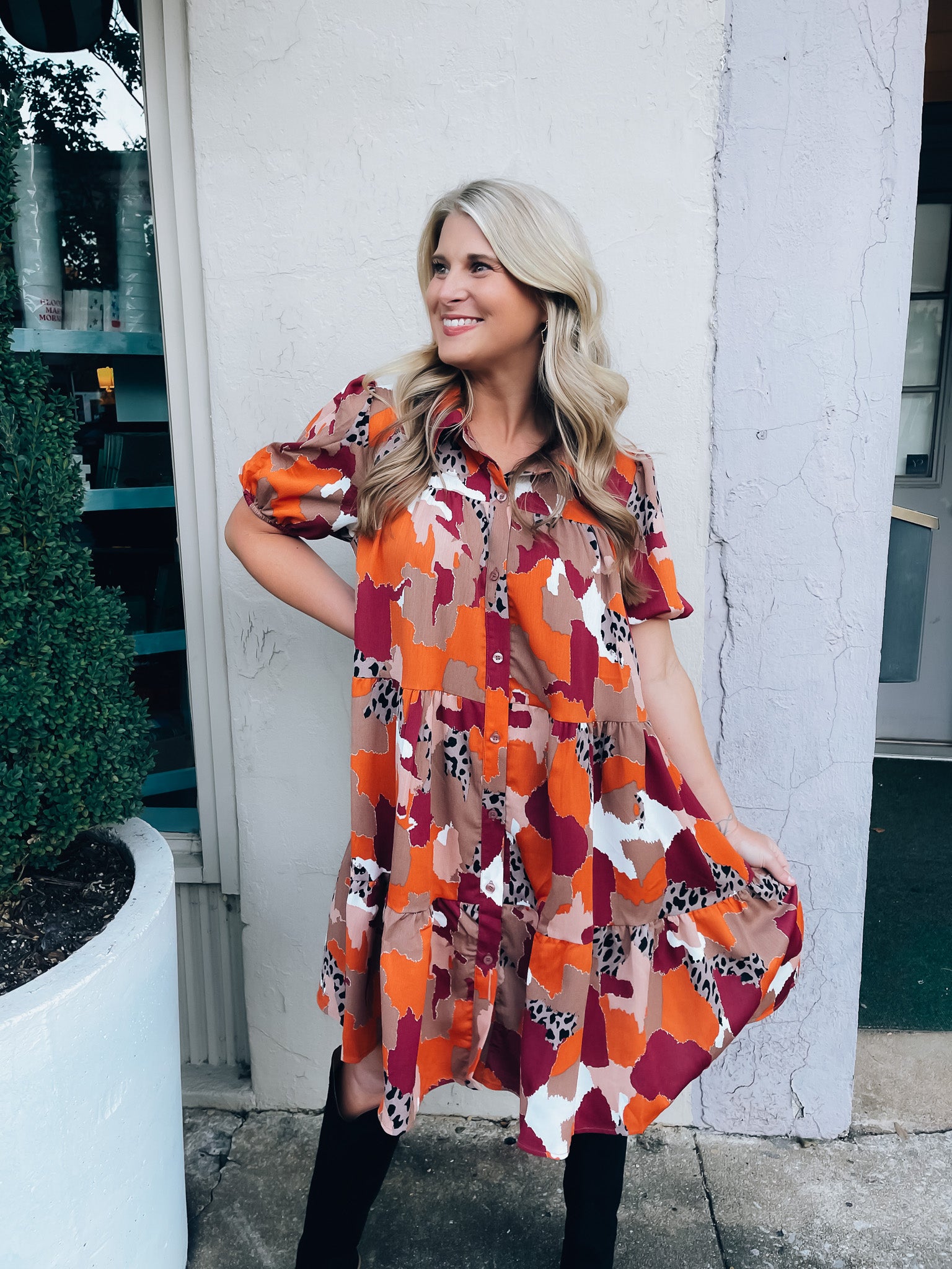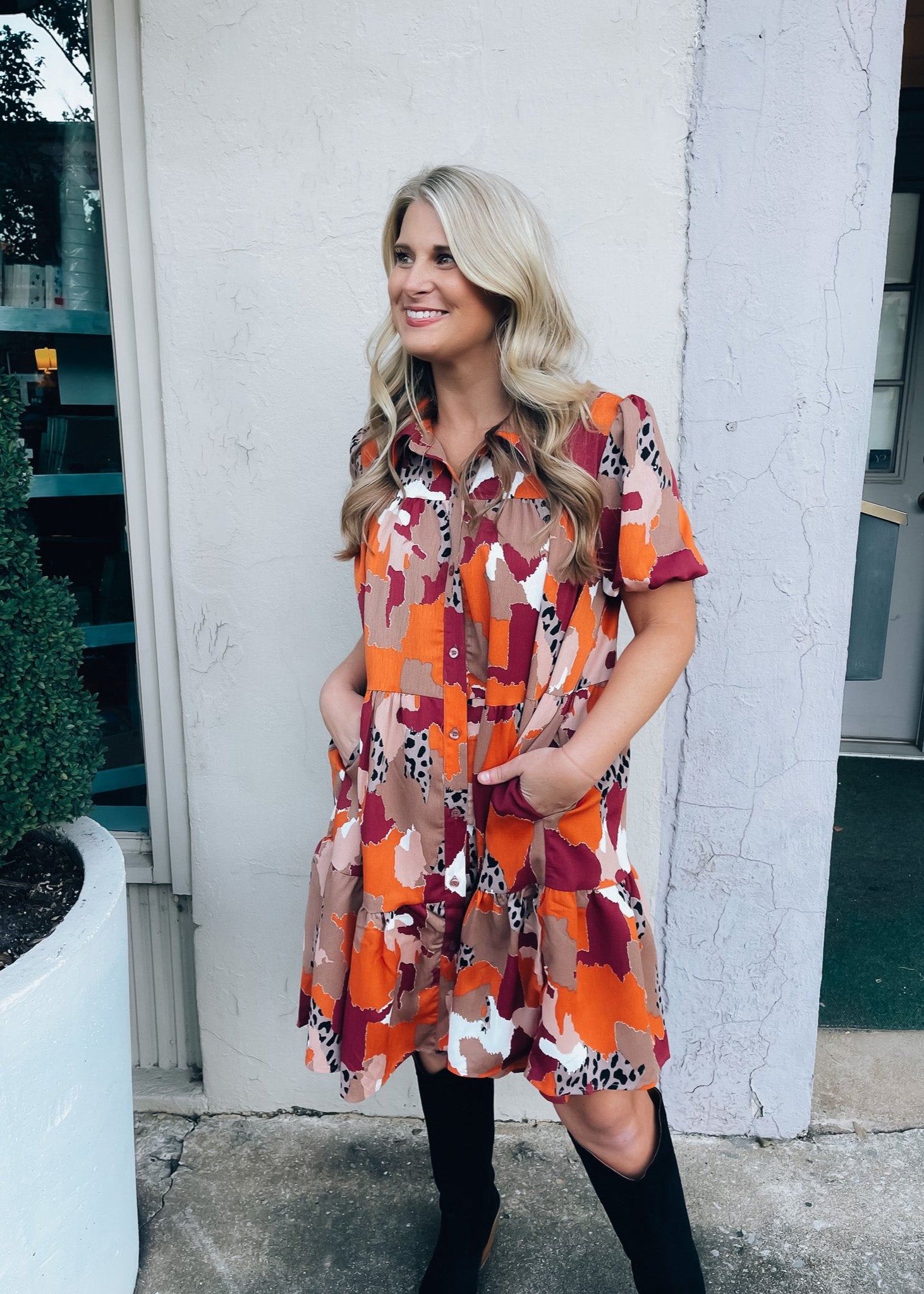 Unleash the inner fashionista in you with our Here To Stay Dress! Featuring a vibrant orange, brown, maroon, white, and black pattern, this dress is perfect for any occasion. The collared neckline and tiered design add a touch of elegance while the puffed sleeves add a playful twist. And with the added convenience of buttons, this dress is here to stay as a staple in your wardrobe! Did we mention this cutie has pockets and completely layered??!