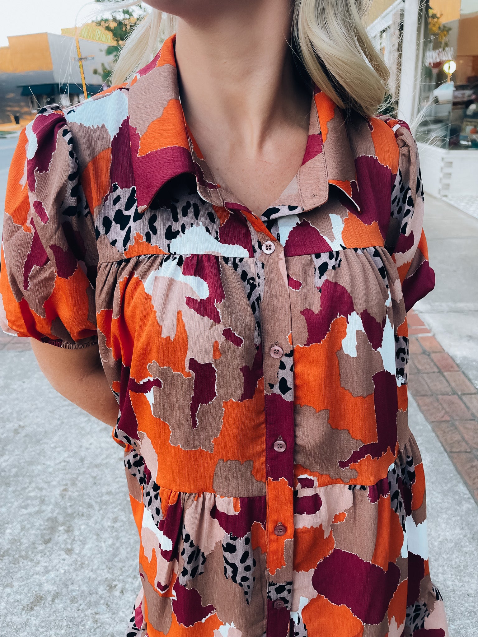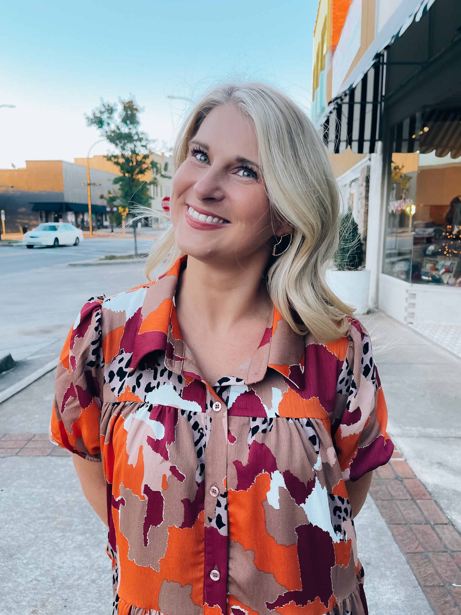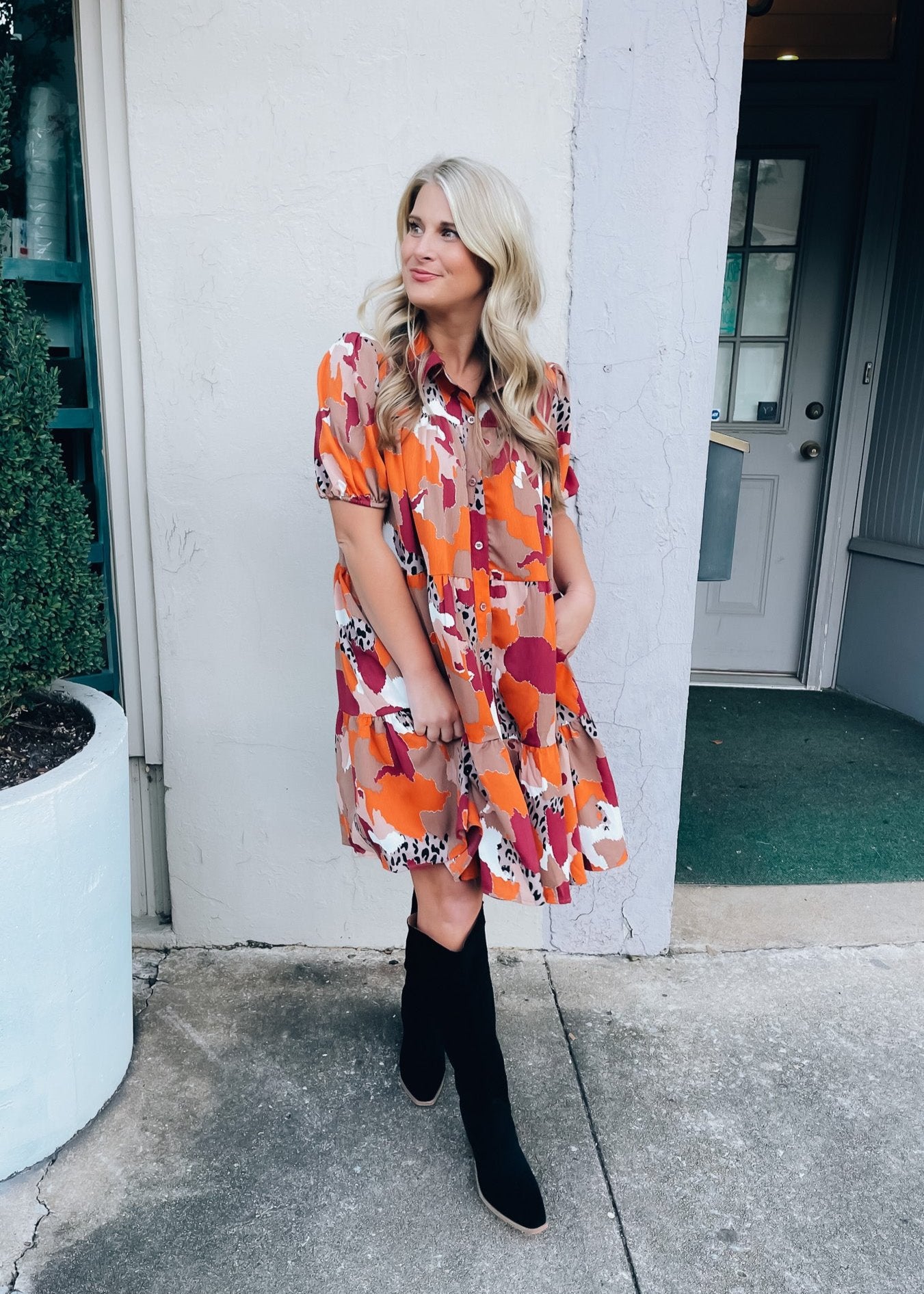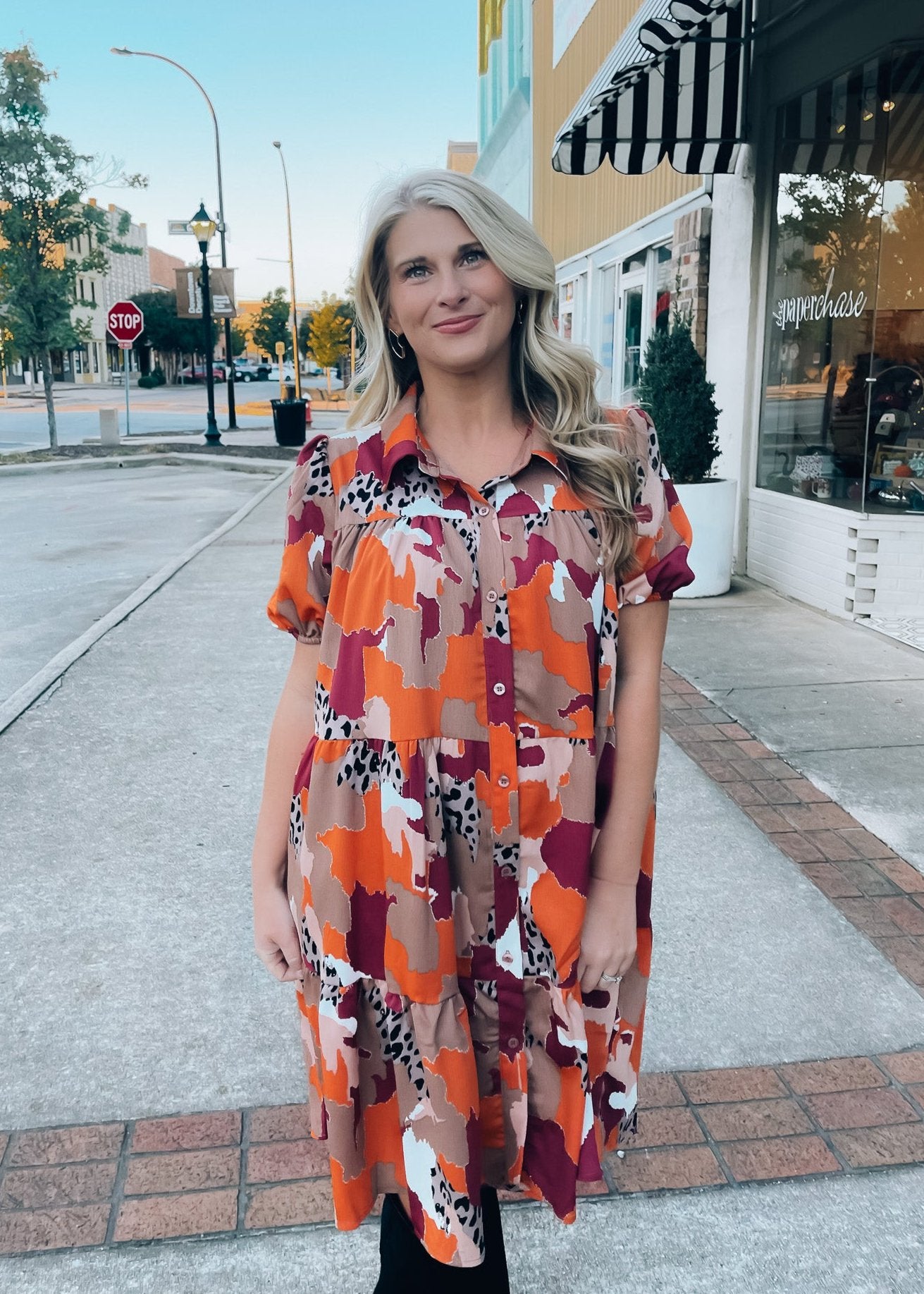 Unleash the inner fashionista in you with our Here To Stay Dress! Featuring a vibrant orange, brown, maroon, white, and black pattern, this dress is perfect for any occasion. The collared neckline and tiered design add a touch of elegance while the puffed sleeves add a playful twist. And with the added convenience of buttons, this dress is here to stay as a staple in your wardrobe! Did we mention this cutie has pockets and completely layered??!