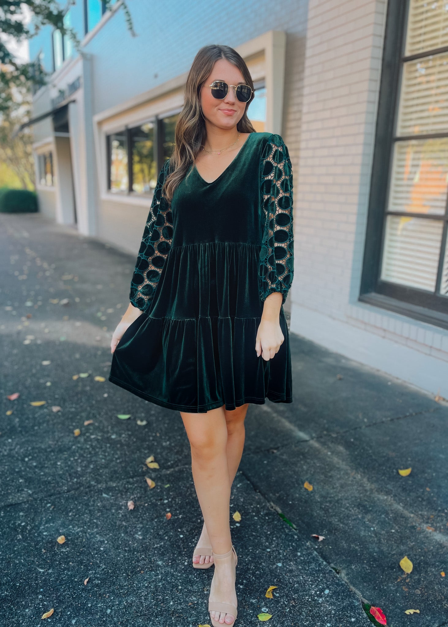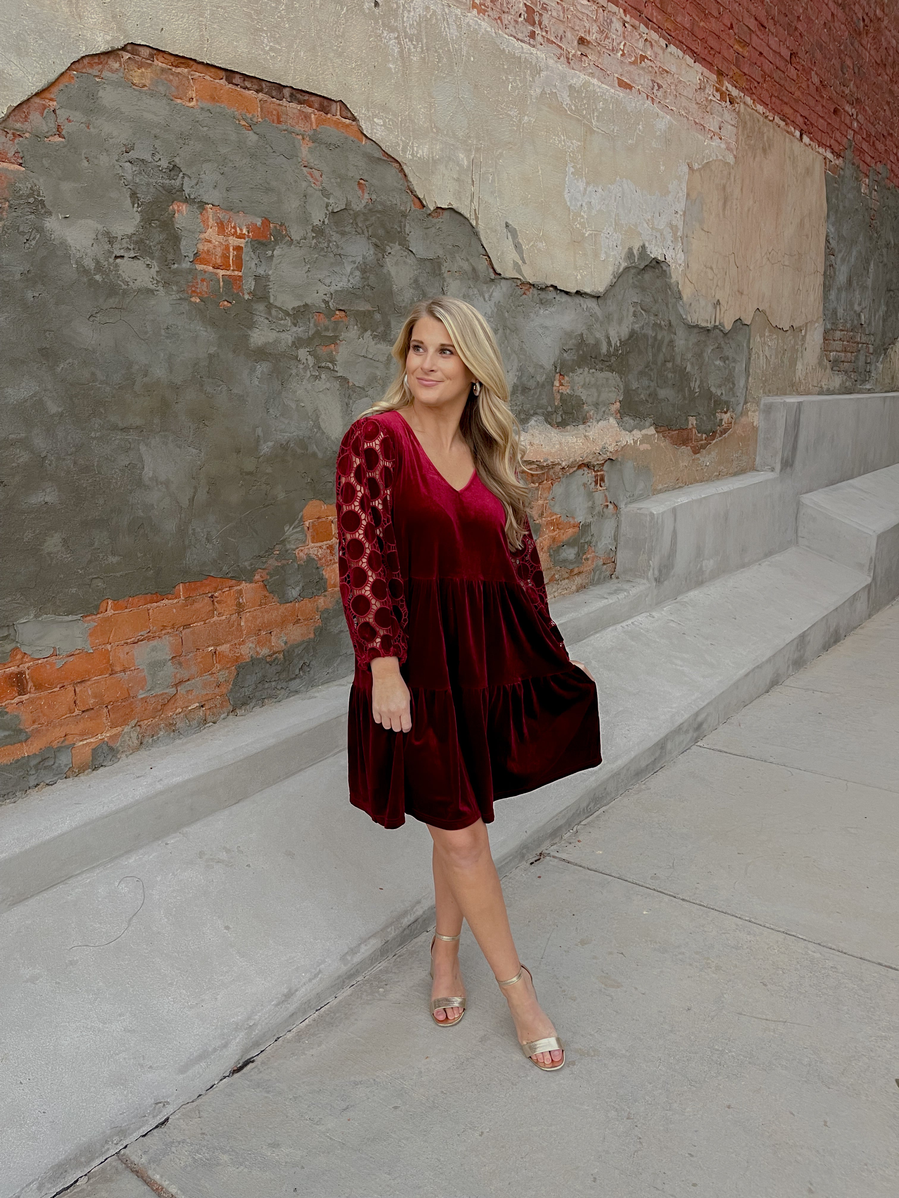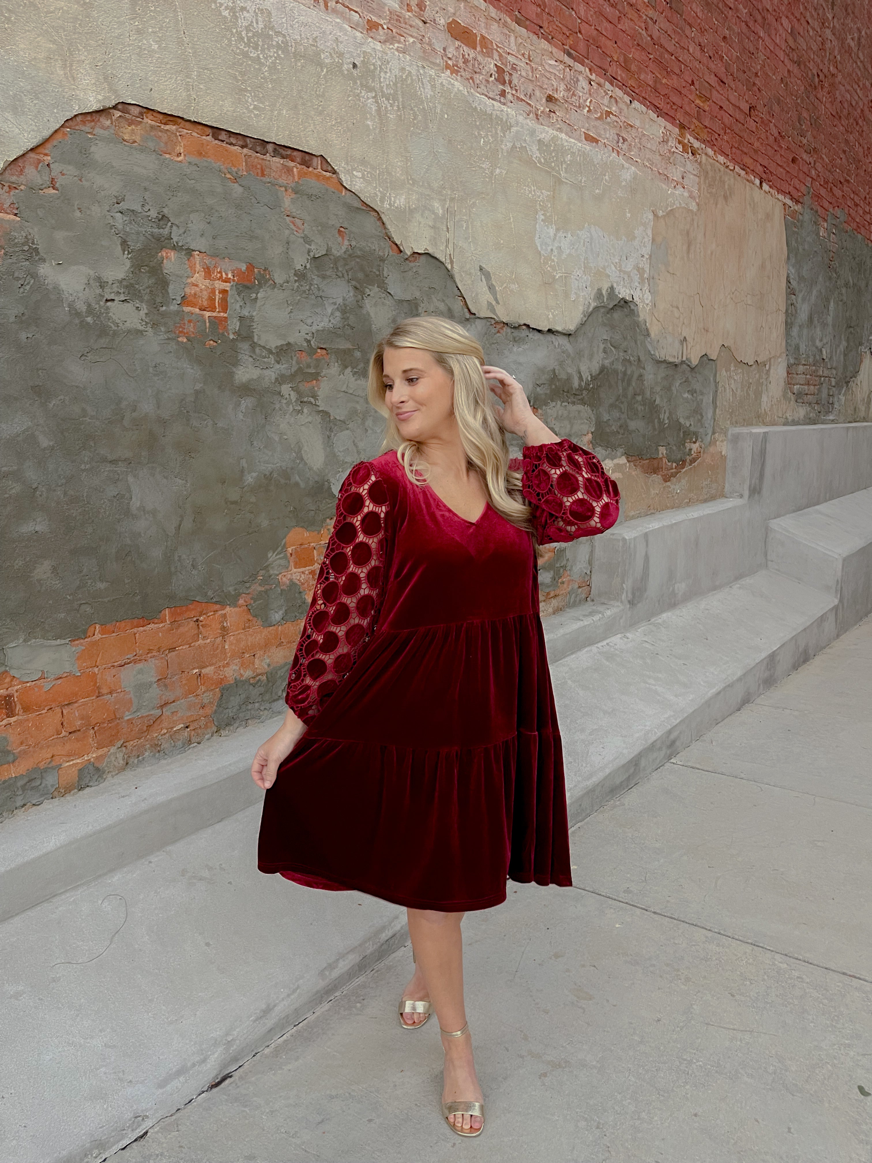 Unleash your inner goddess in our In the Details Velvet Dress! Made of luxurious velvet, this long sleeve v neck dress is both elegant and playful. The lace detailed sleeves with a delicate circle pattern add a touch of romance. Available in a deep emerald or rich wine color, this dress is perfect for any special occasion.