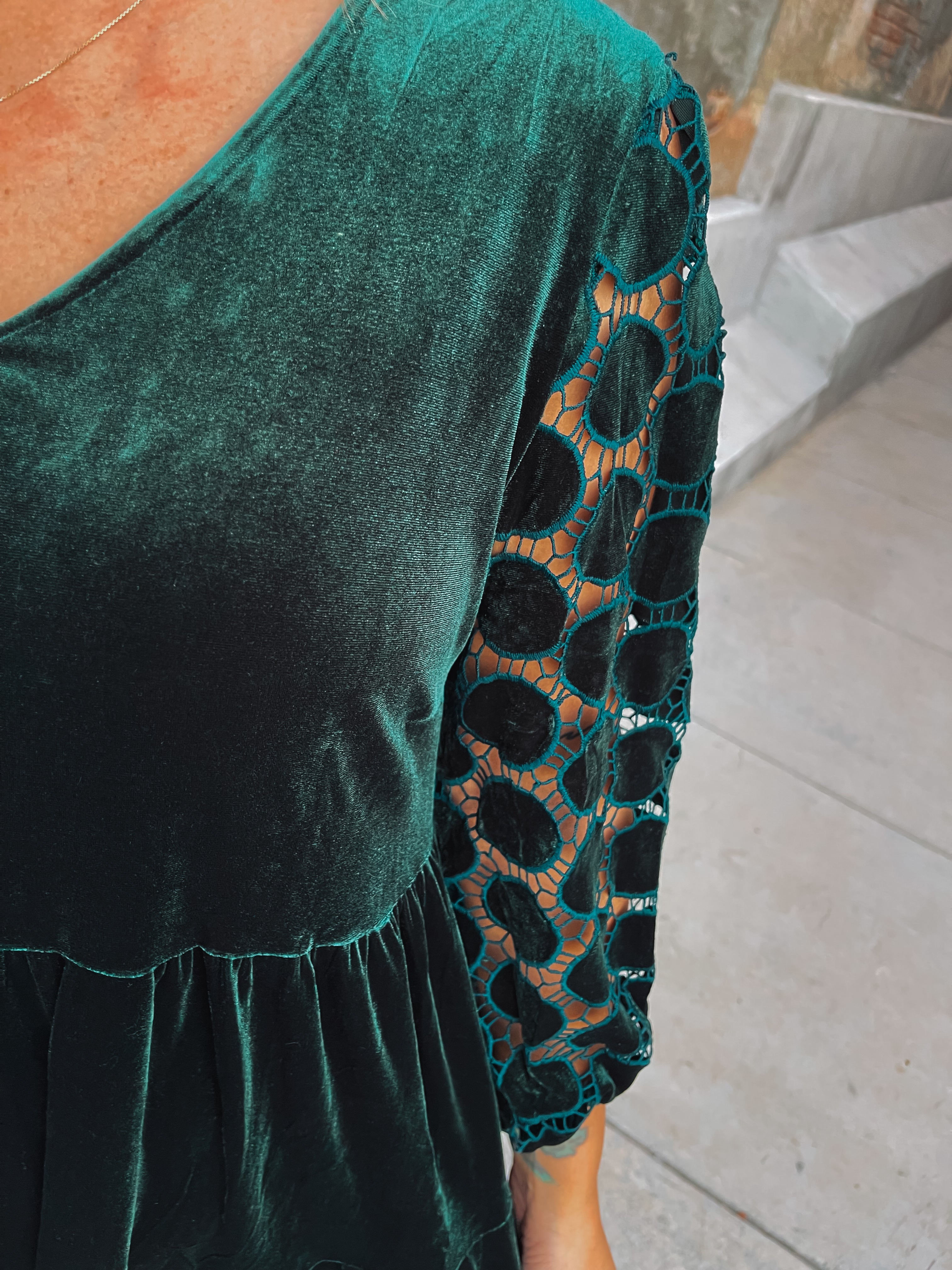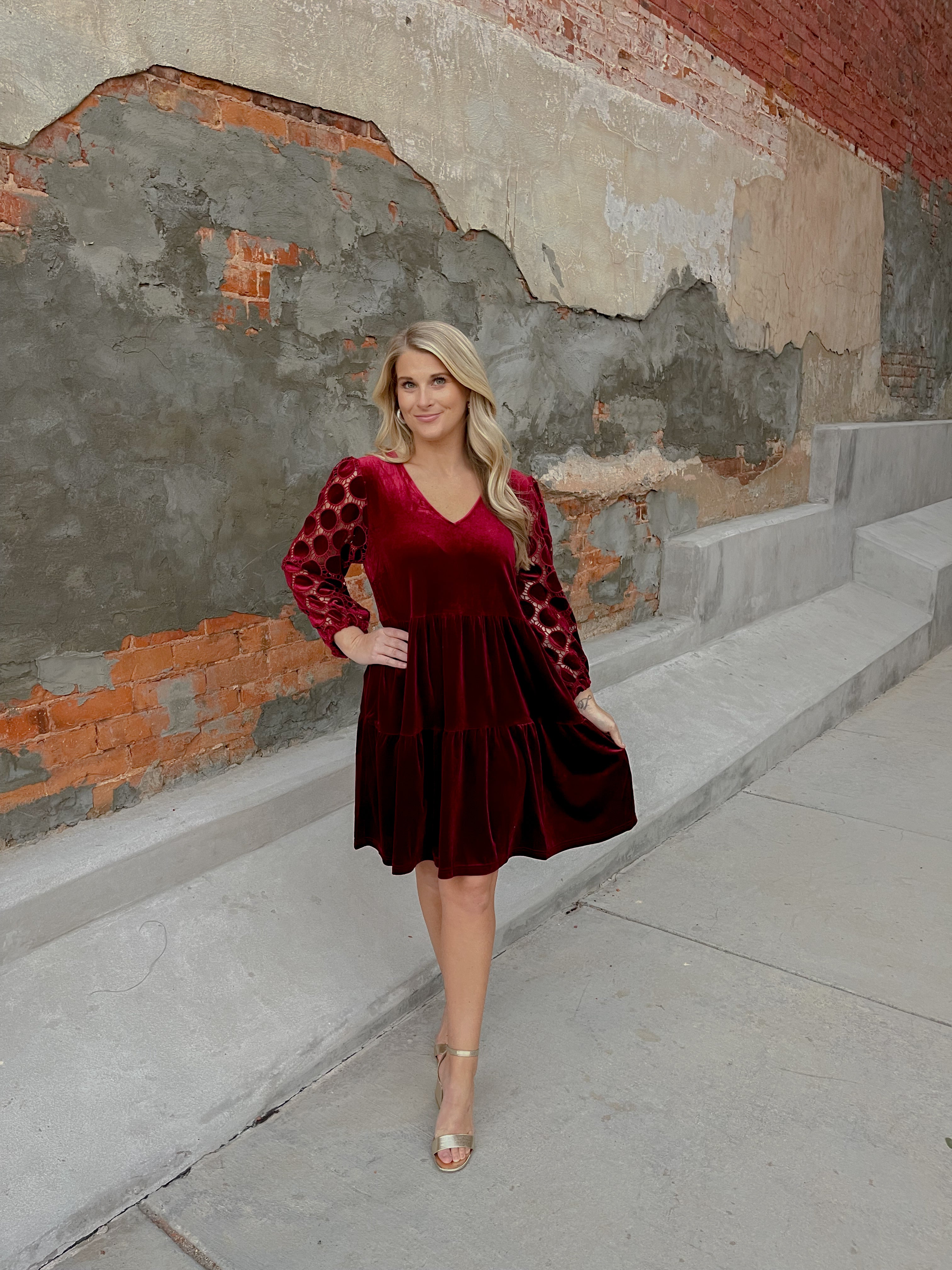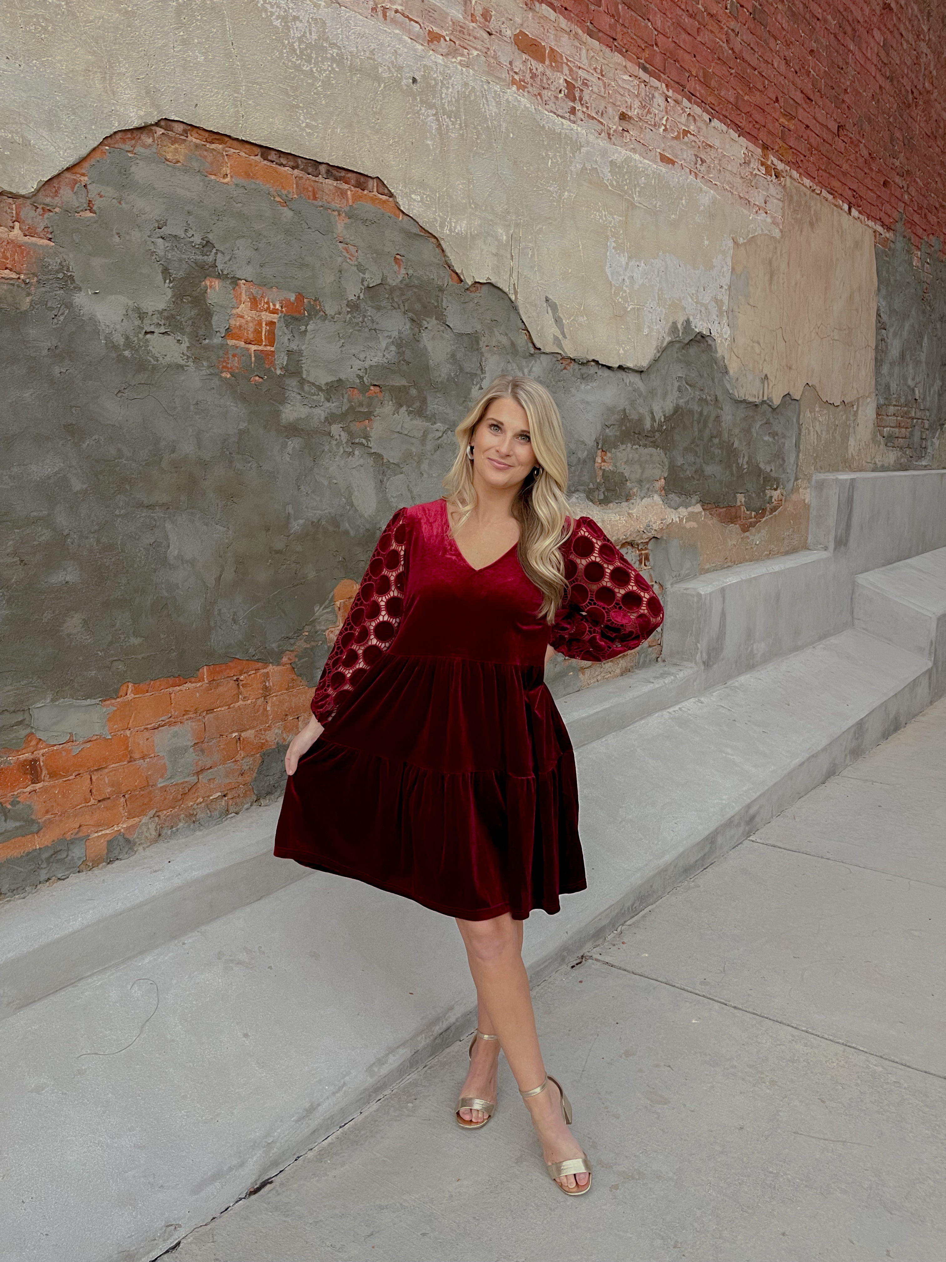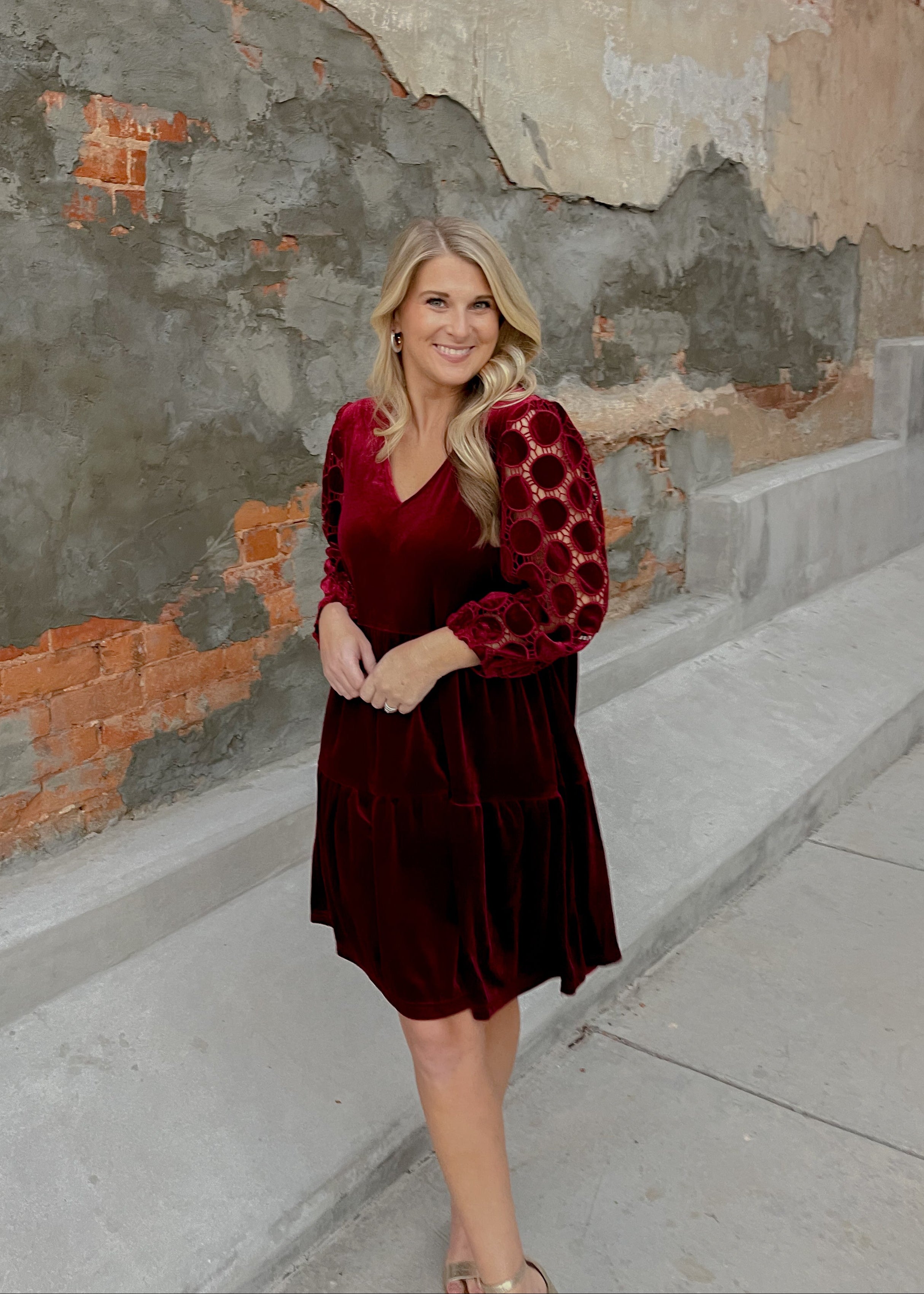 Unleash your inner goddess in our In the Details Velvet Dress! Made of luxurious velvet, this long sleeve v neck dress is both elegant and playful. The lace detailed sleeves with a delicate circle pattern add a touch of romance. Available in a deep emerald or rich wine color, this dress is perfect for any special occasion.