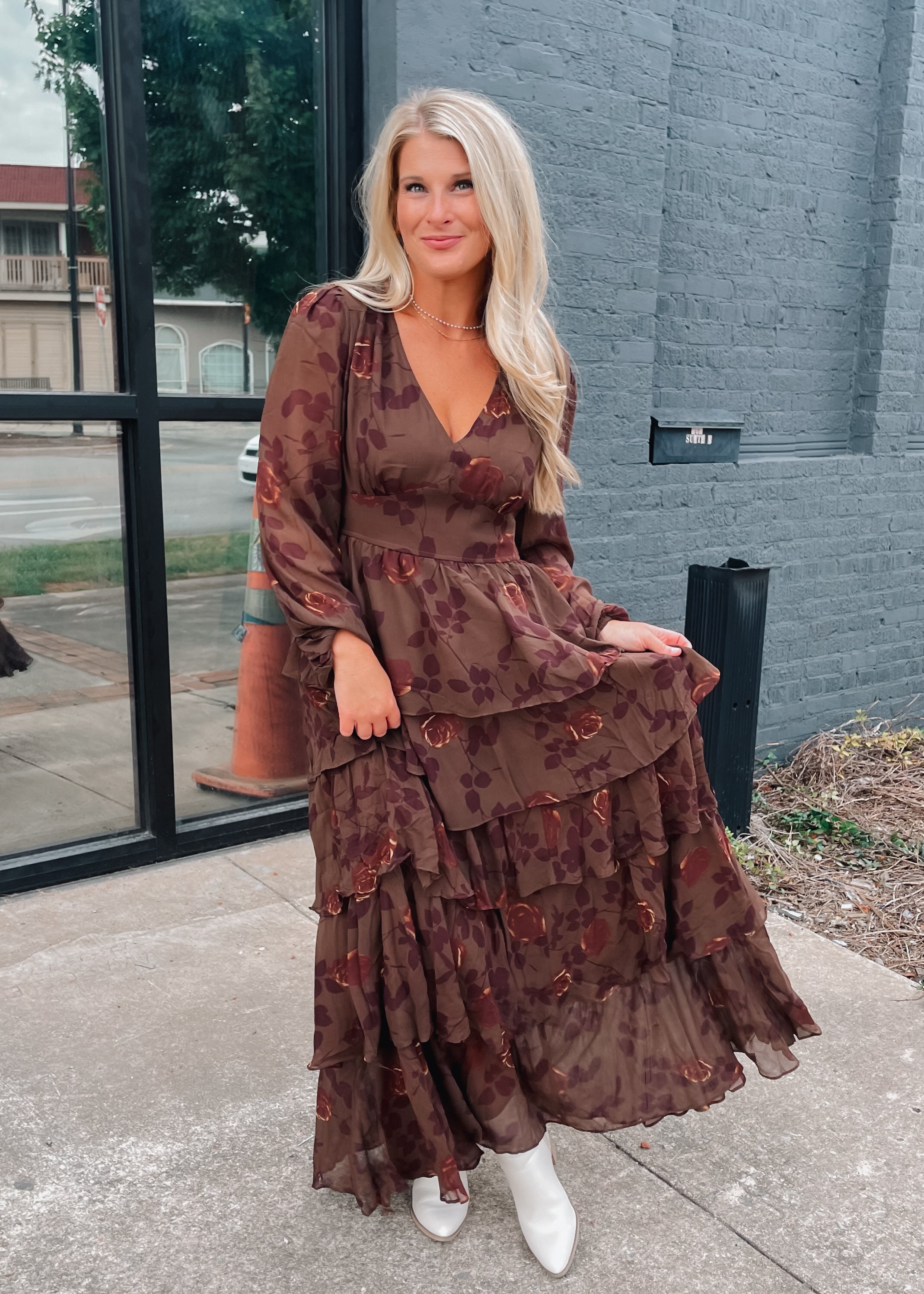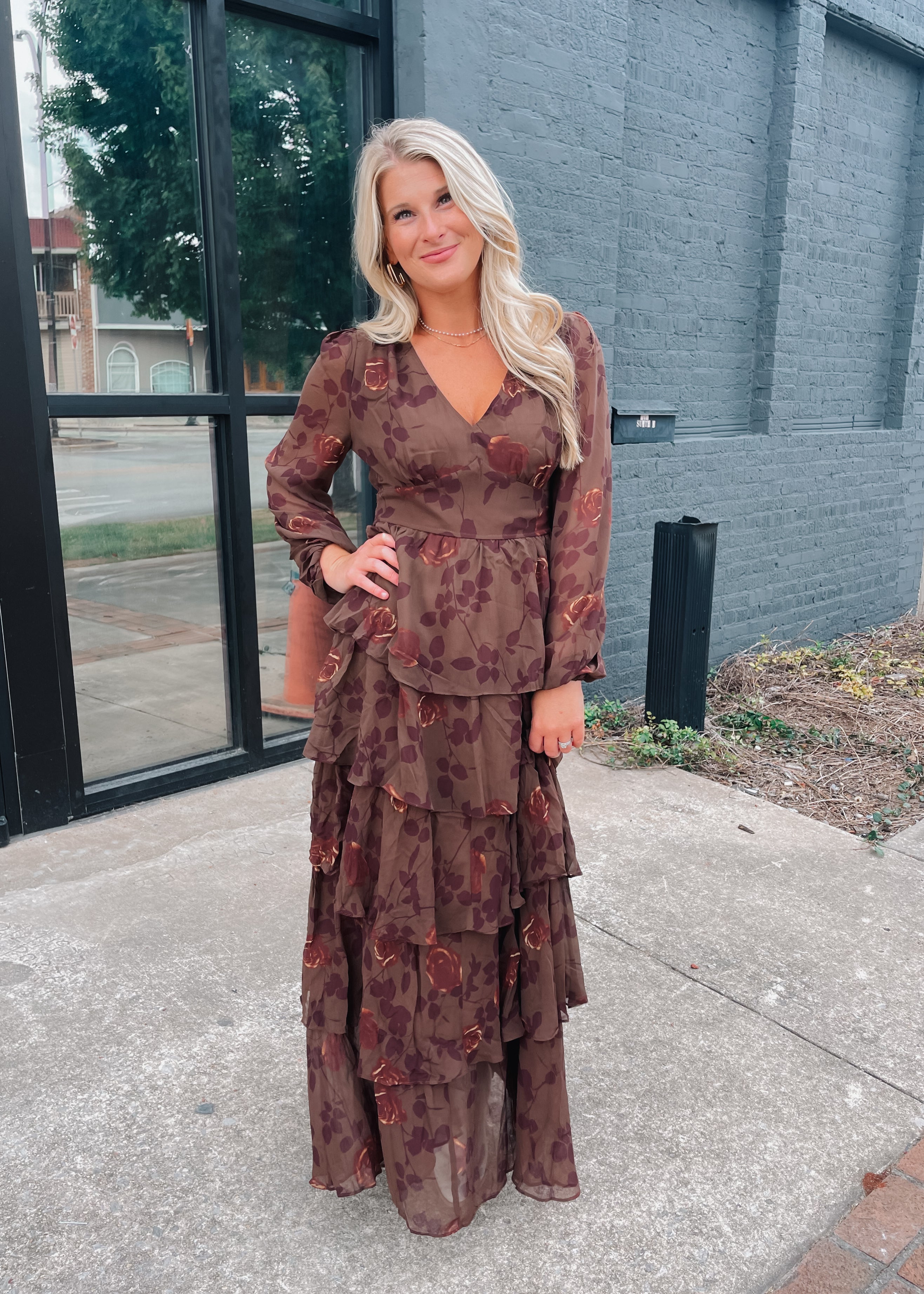 The In The Meantime Maxi Dress in warm amber features elegant tiered layers and a flattering V-neckline. Long sleeves and subtle rouching on the back add refined details, while a side zipper ensures a comfortable, tailored fit. This dress blends comfort and style effortlessly, making it perfect for any occasion where you want to feel confident and graceful.