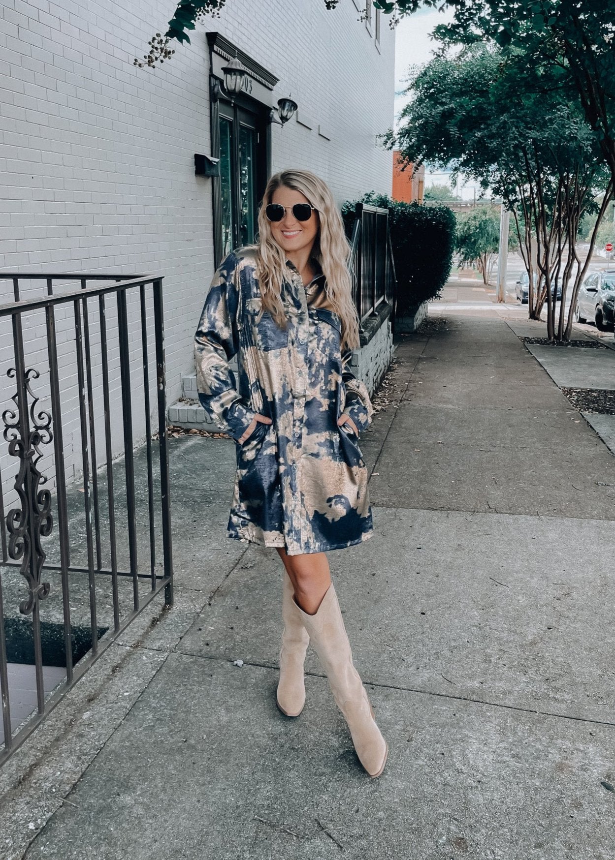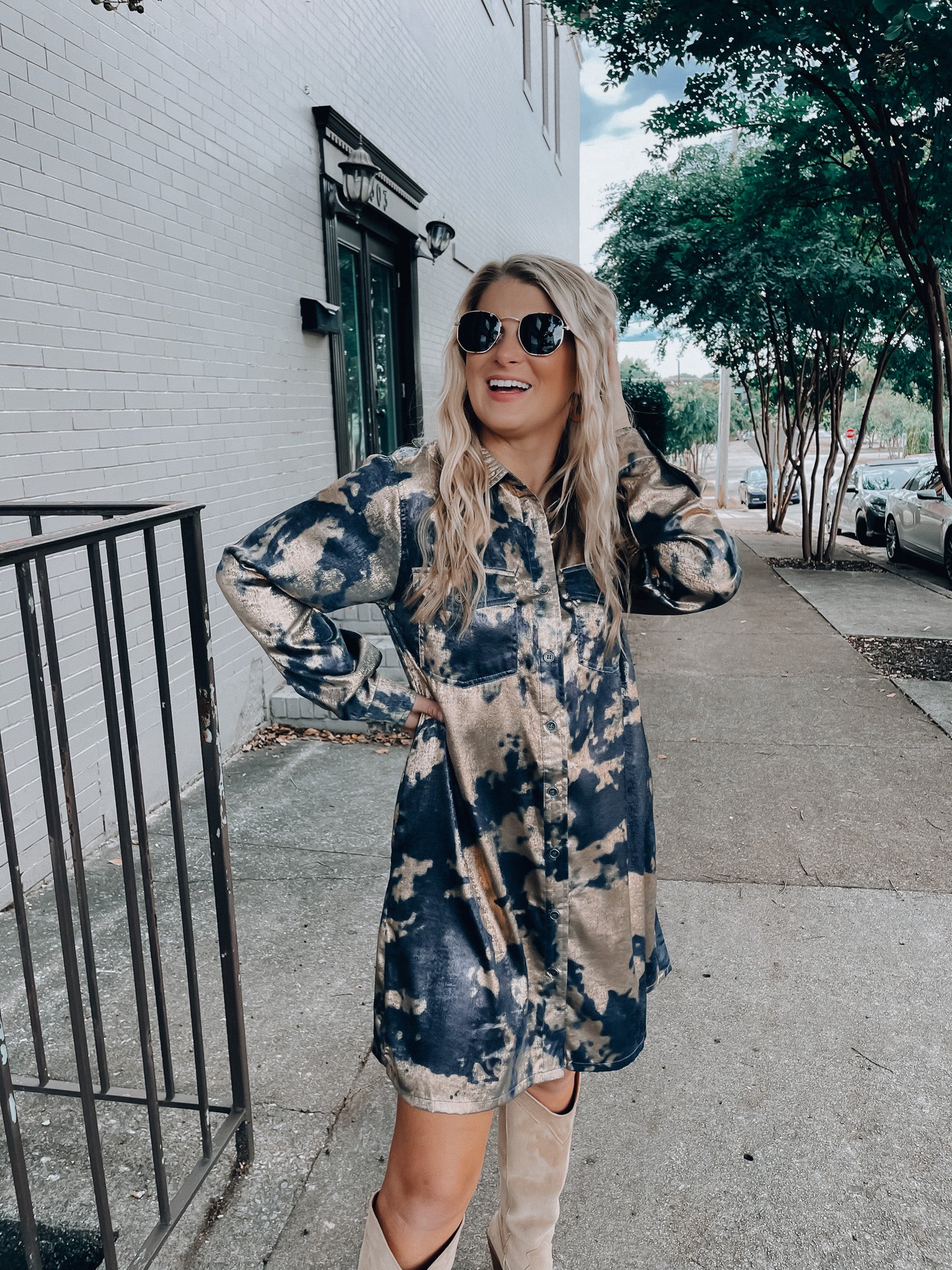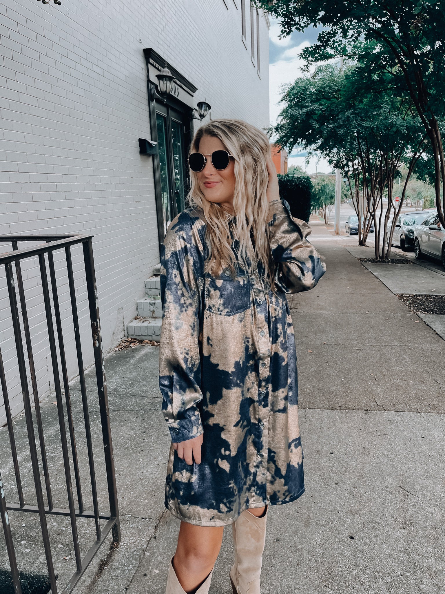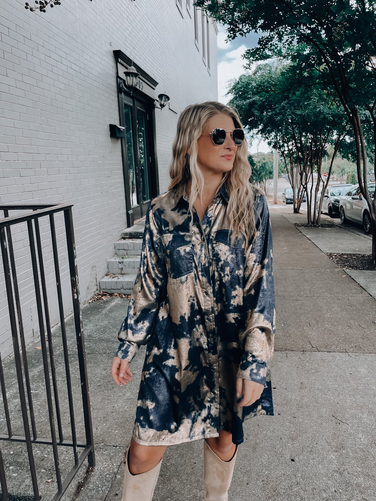 Elevate your style with the It's My Call Dress! This denim and gold colored dress features a stylish collar, convenient button down design, and practical pockets. Perfect for any occasion, add this dress to your wardrobe and exude confidence and sophistication.