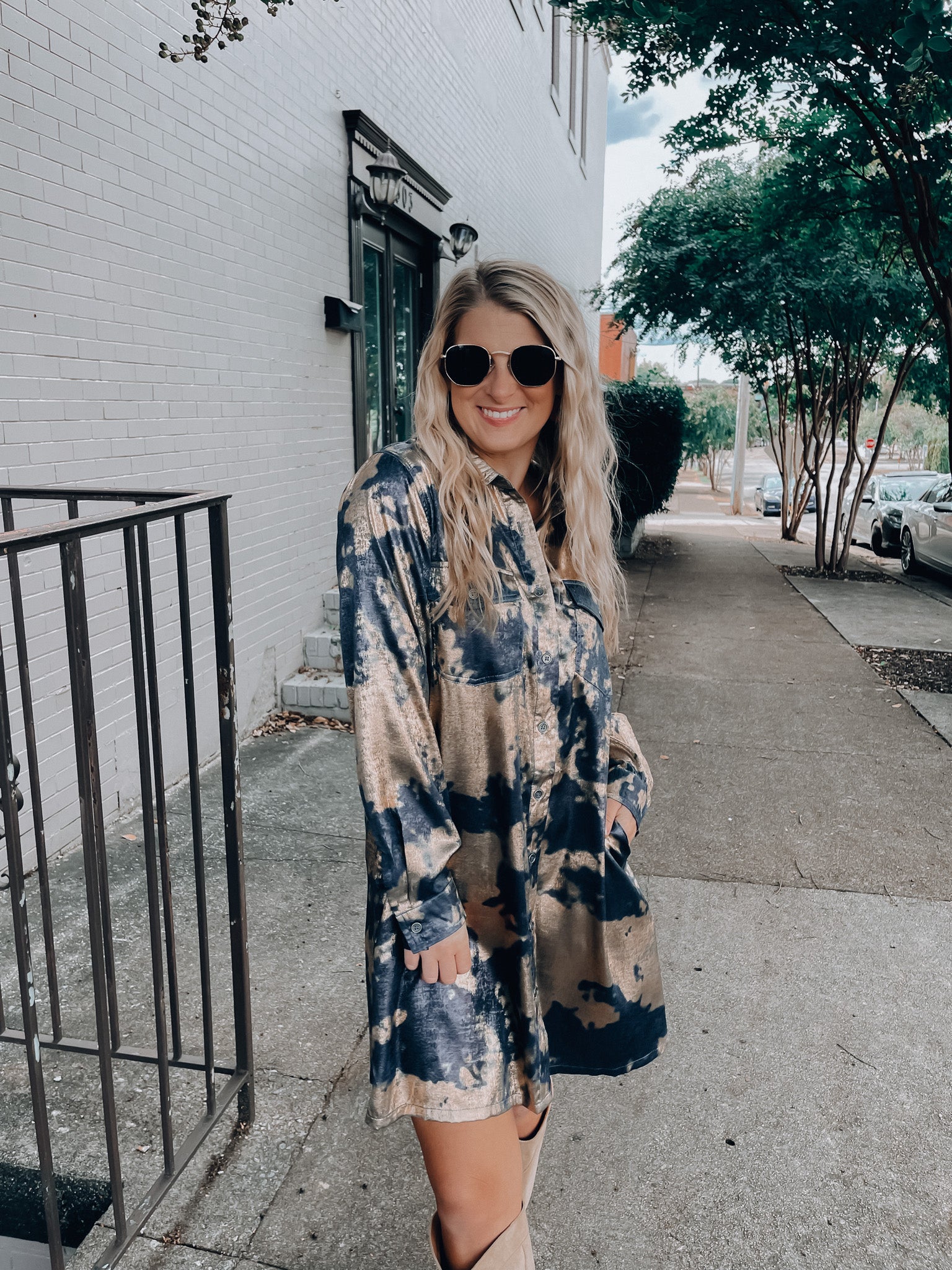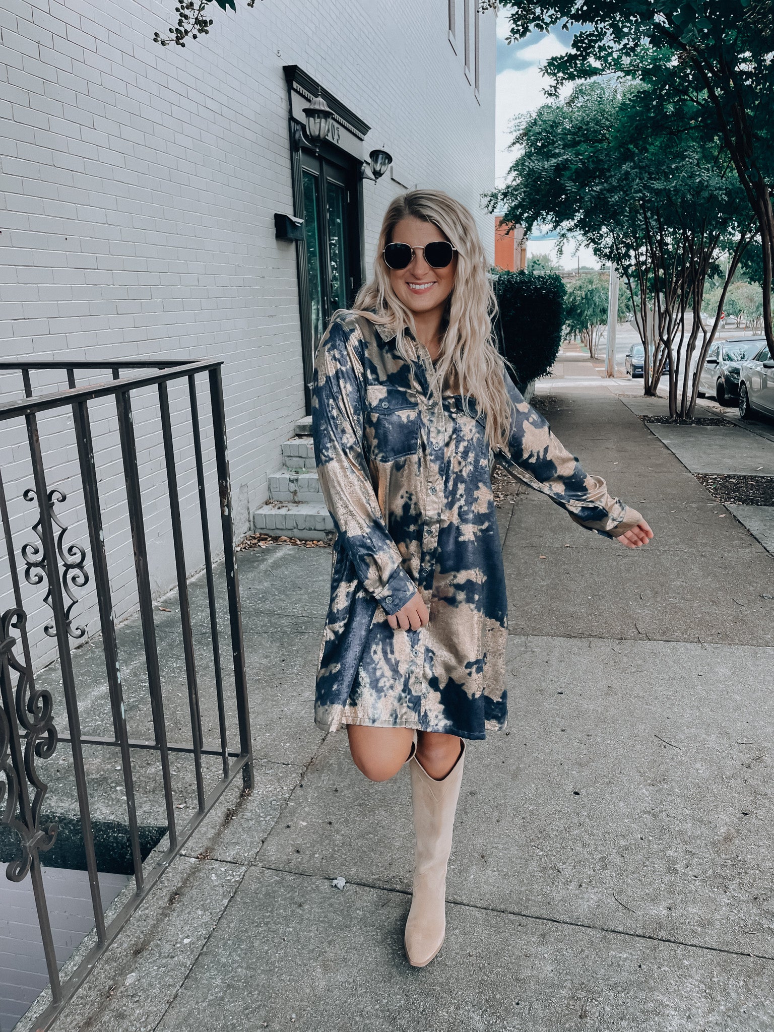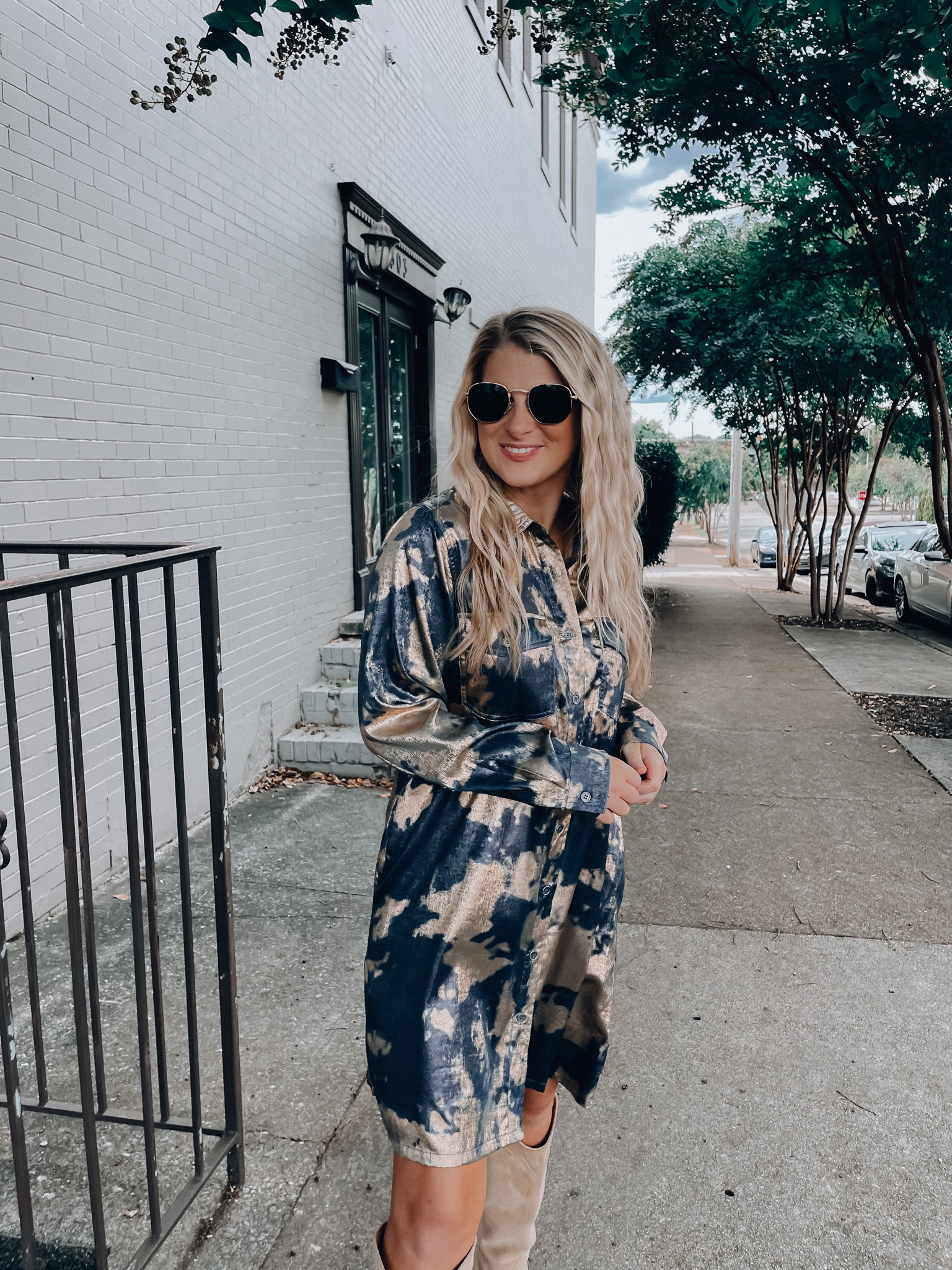 Elevate your style with the It's My Call Dress! This denim and gold colored dress features a stylish collar, convenient button down design, and practical pockets. Perfect for any occasion, add this dress to your wardrobe and exude confidence and sophistication.