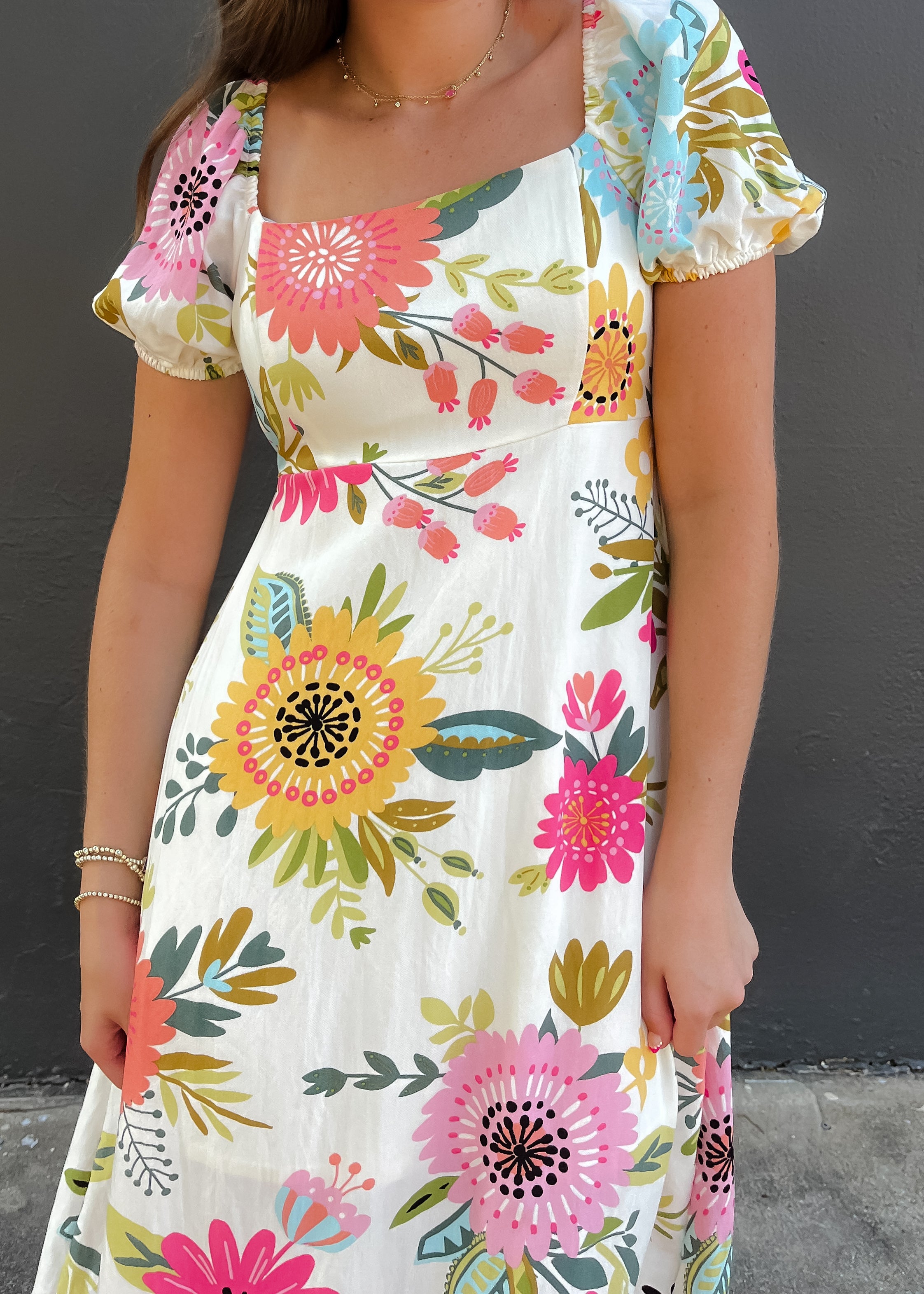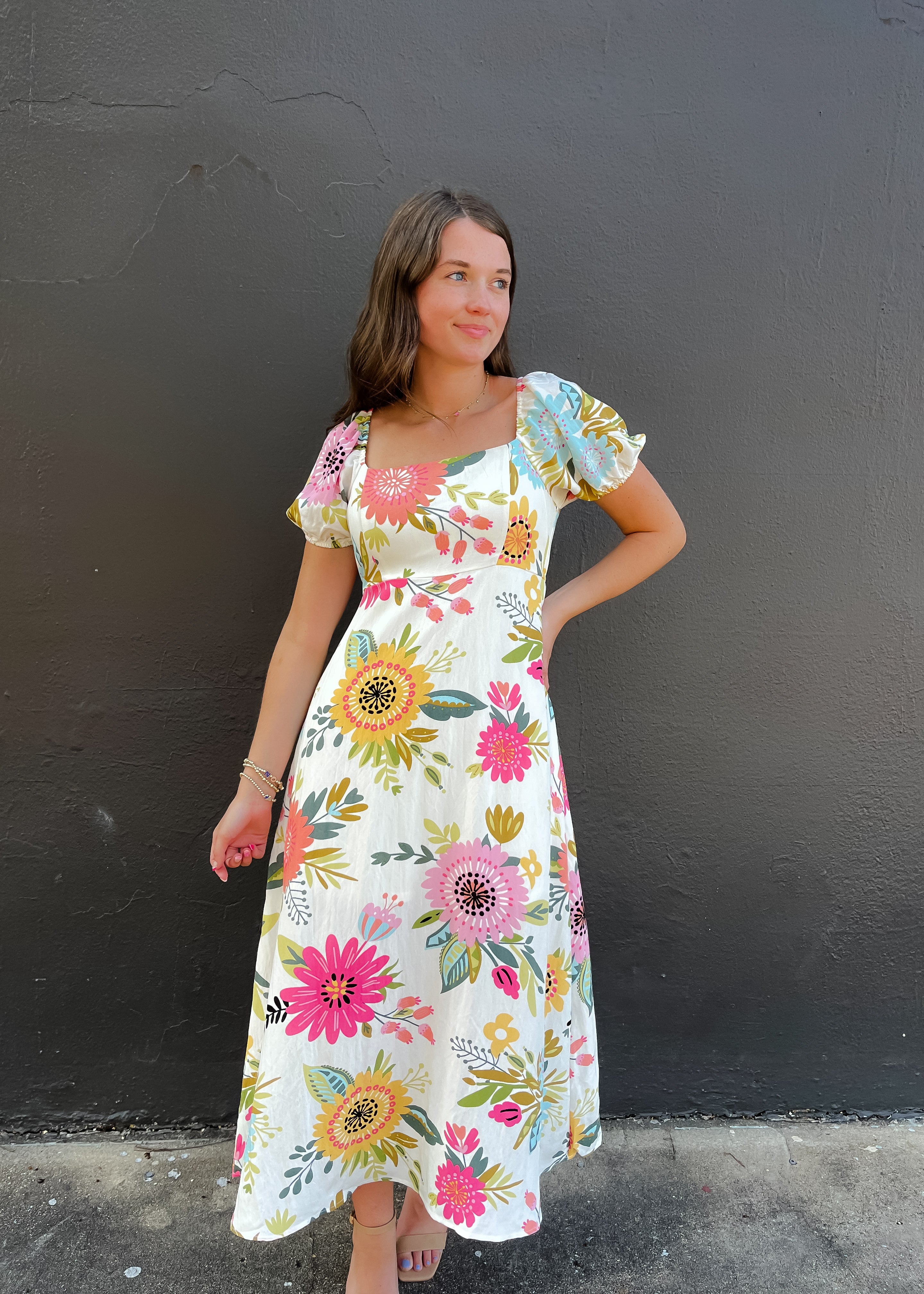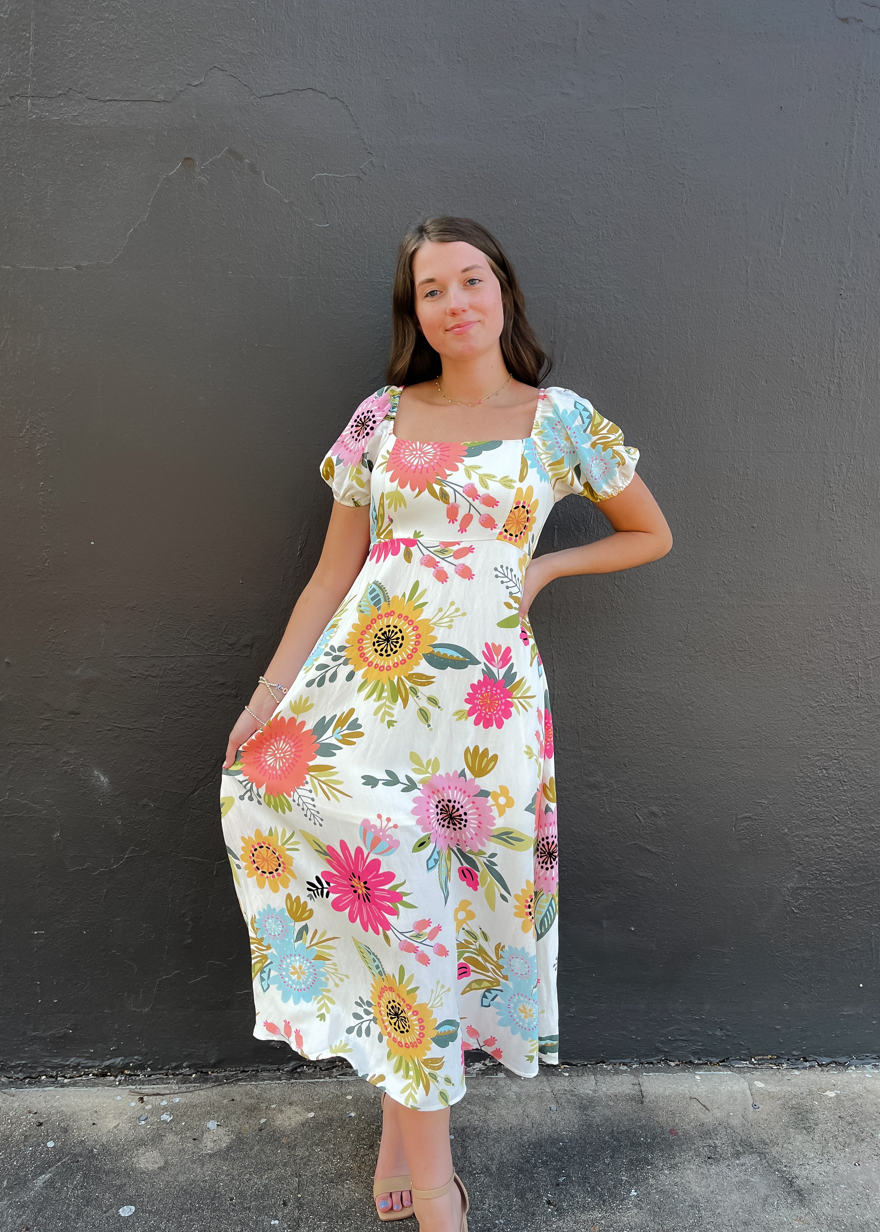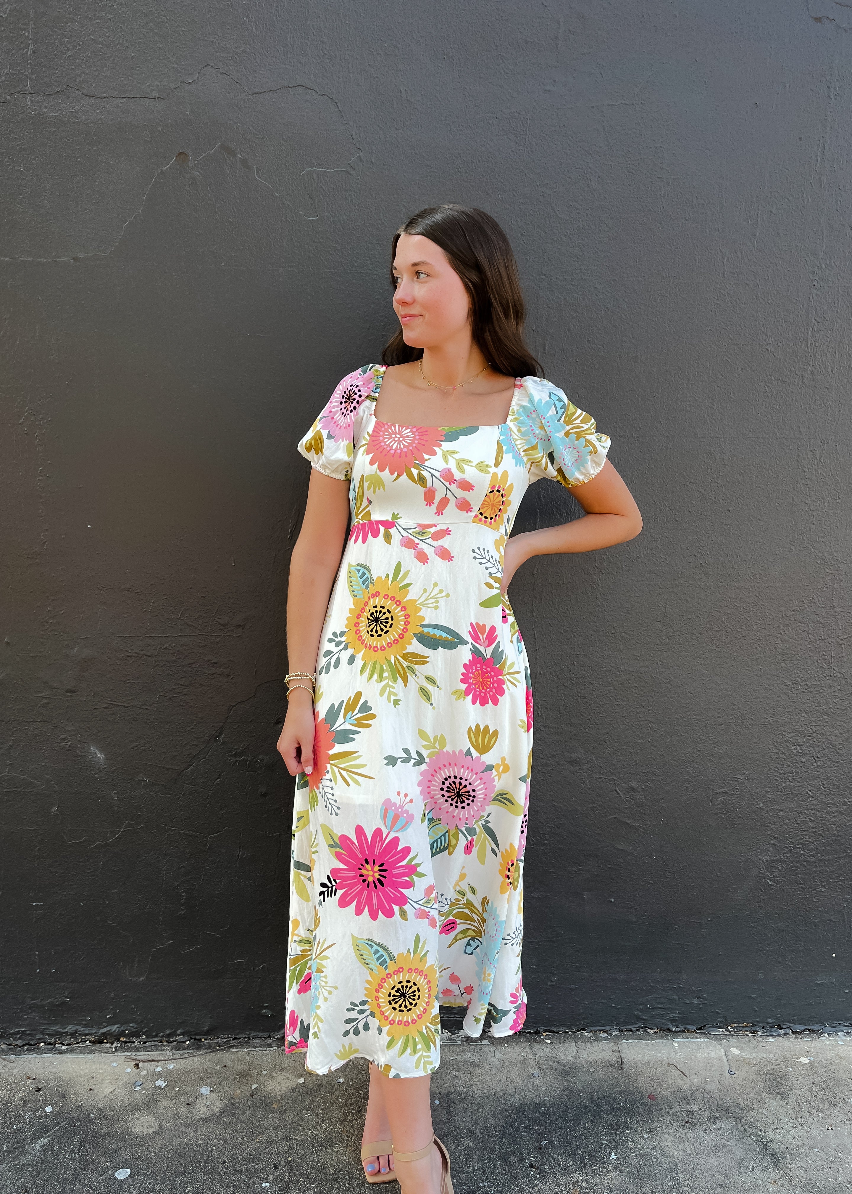 Elevate your style with the Just Look At Her Midi Dress, featuring a charming floral print and a flattering square neckline. The short puff sleeves with elastic cuffs add a playful touch, while the back smocking ensures a comfortable, tailored fit. Its A-line silhouette gracefully flows to a midi length, perfect for any occasion. This pink multicolored dress combines elegance and ease, making it a must-have for your wardrobe.