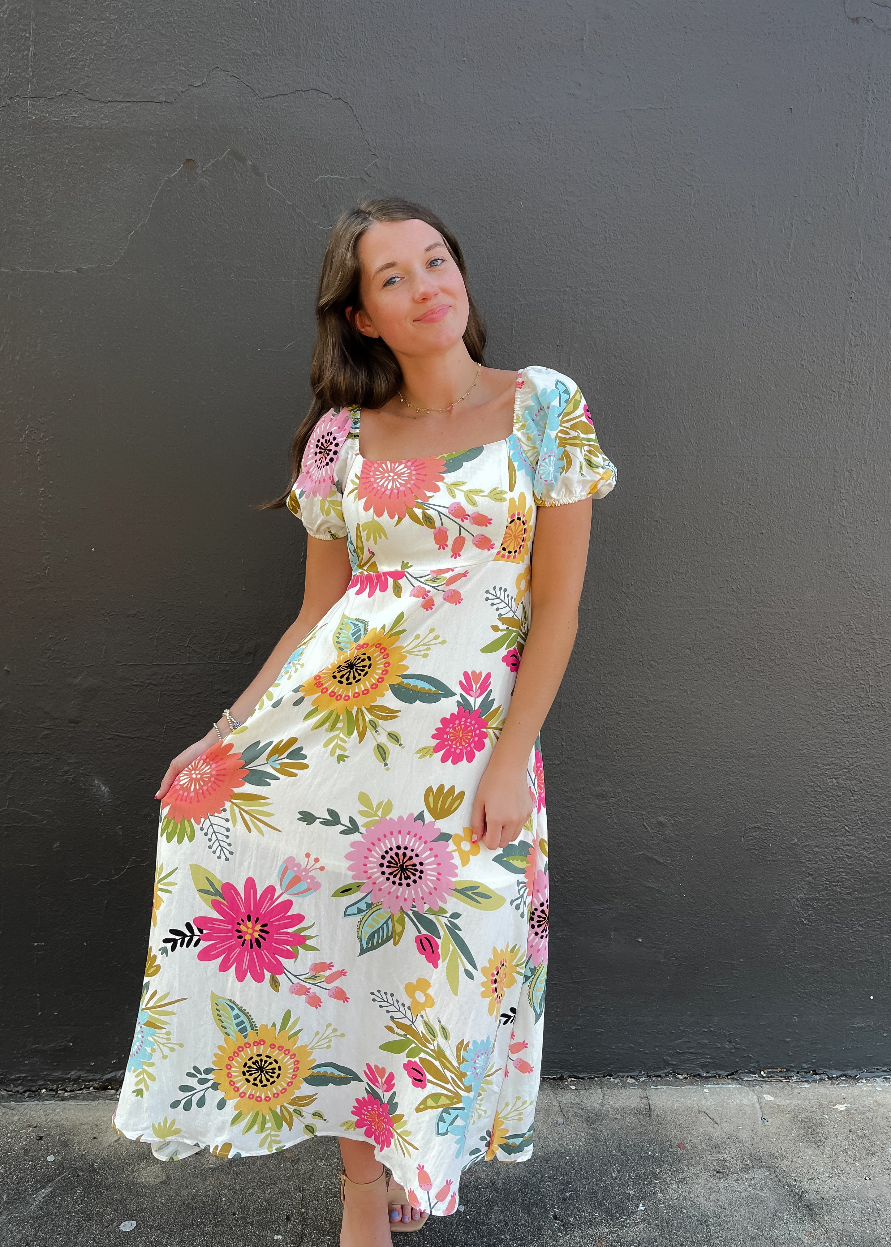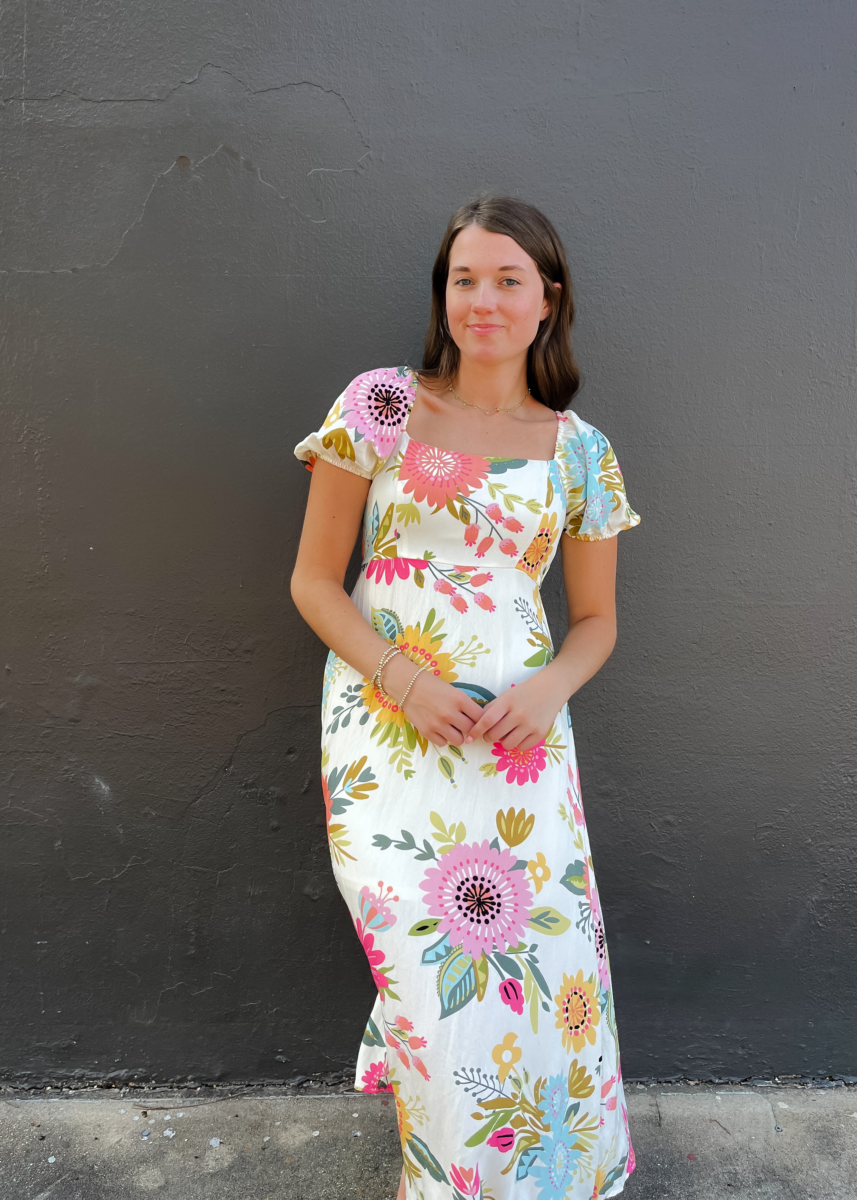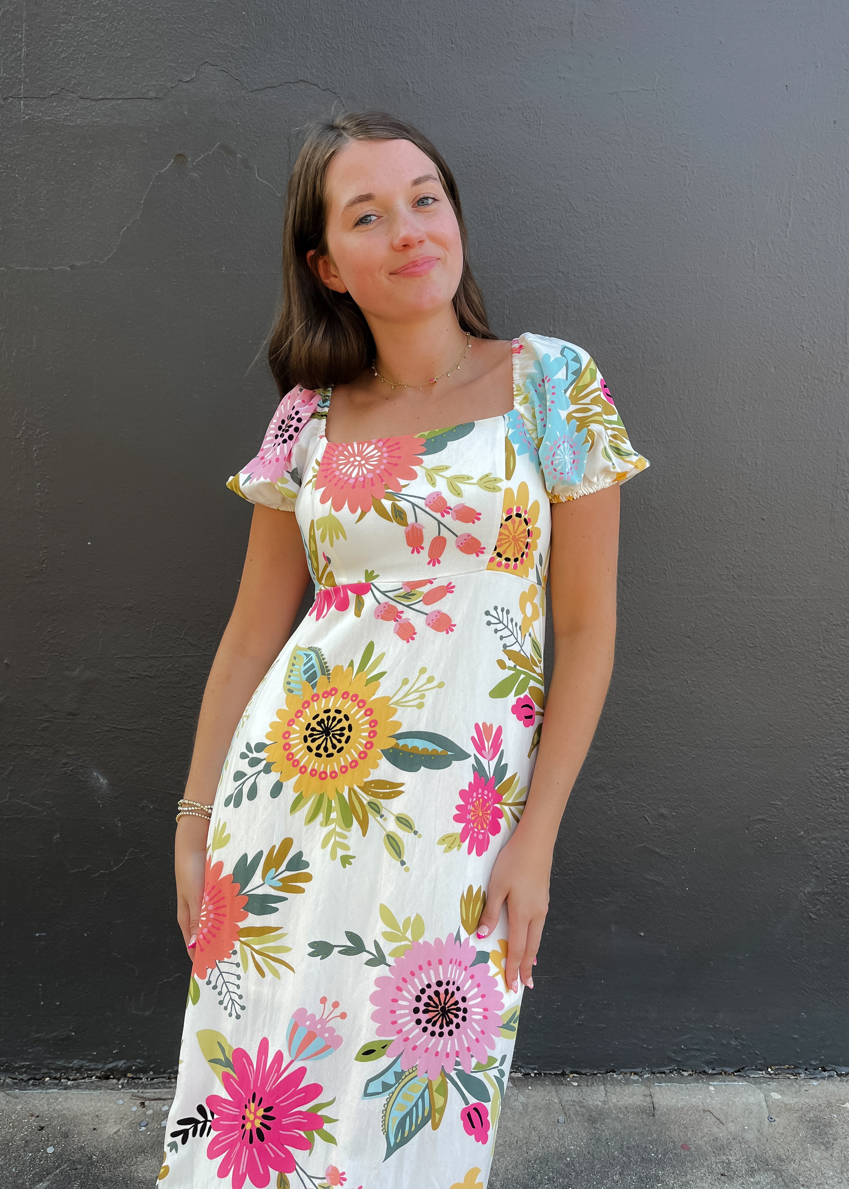 Elevate your style with the Just Look At Her Midi Dress, featuring a charming floral print and a flattering square neckline. The short puff sleeves with elastic cuffs add a playful touch, while the back smocking ensures a comfortable, tailored fit. Its A-line silhouette gracefully flows to a midi length, perfect for any occasion. This pink multicolored dress combines elegance and ease, making it a must-have for your wardrobe.