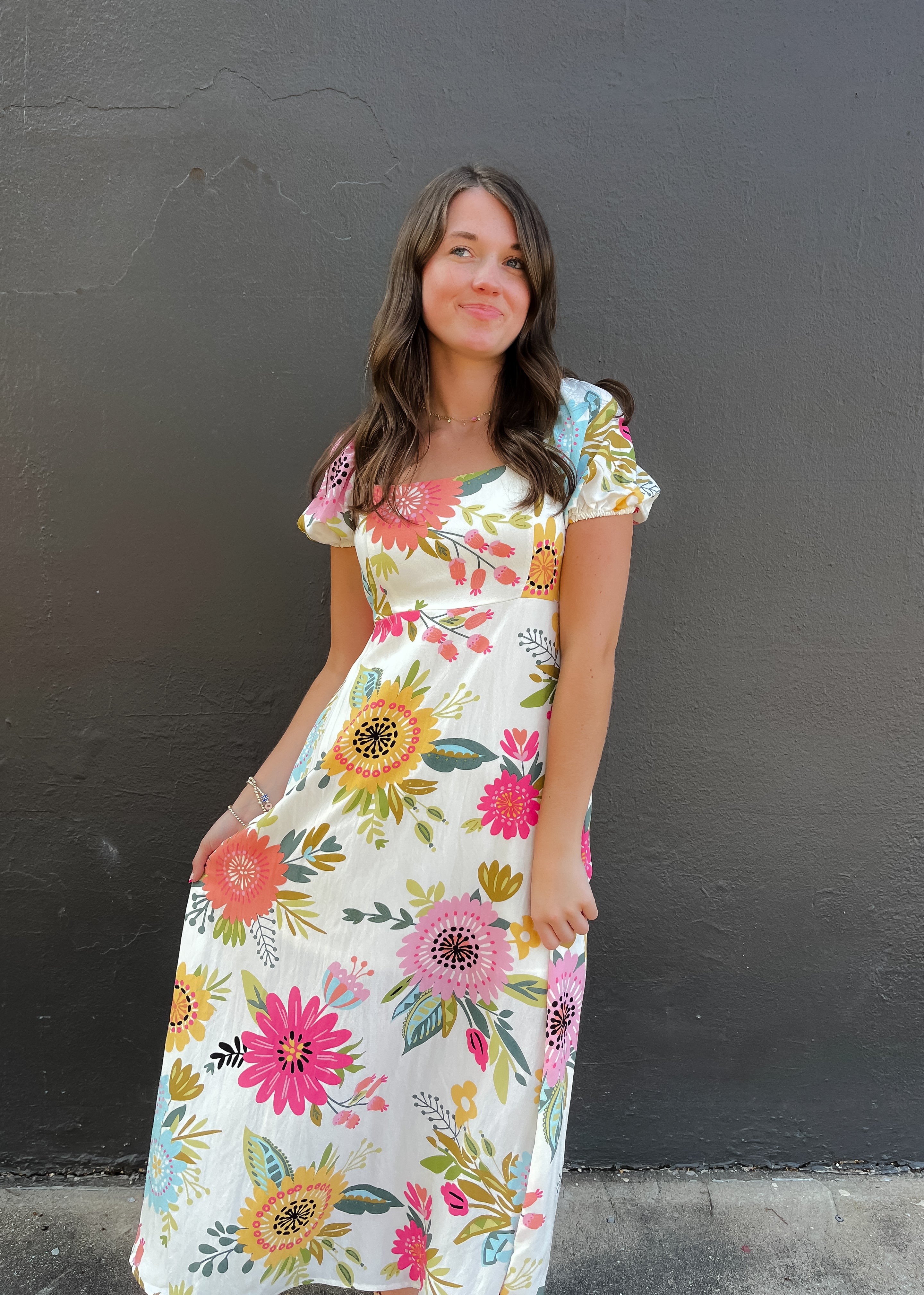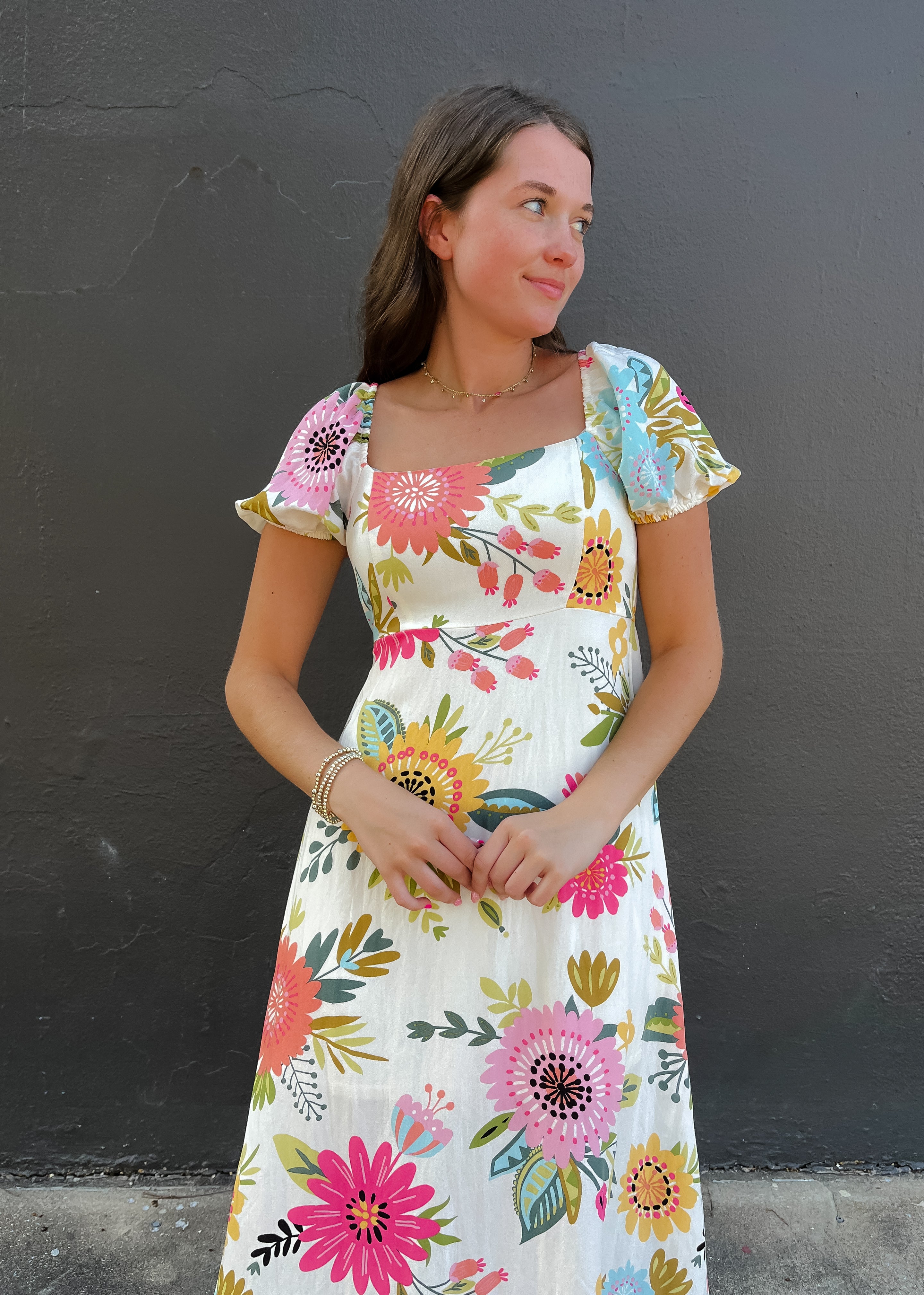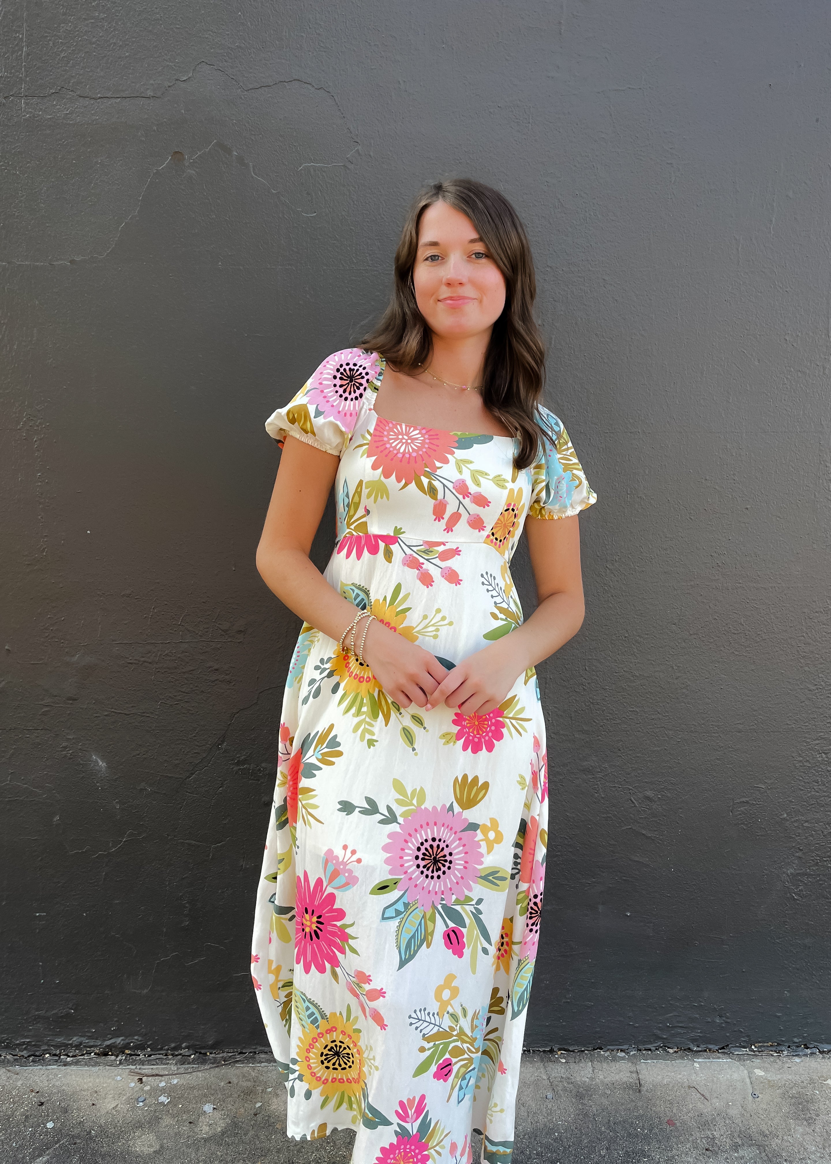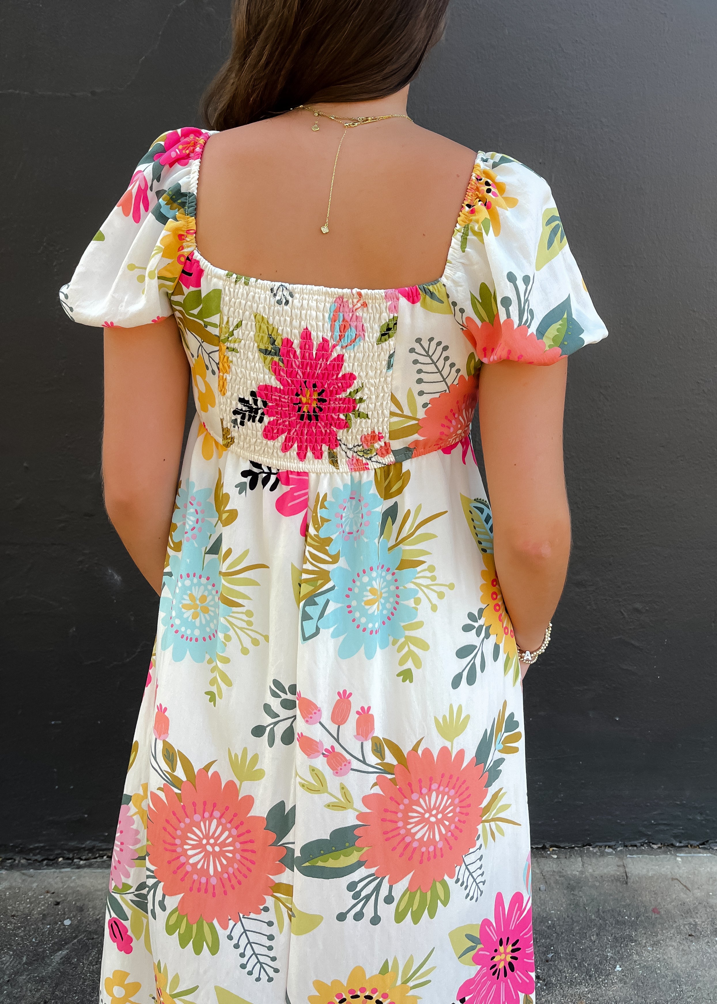 Elevate your style with the Just Look At Her Midi Dress, featuring a charming floral print and a flattering square neckline. The short puff sleeves with elastic cuffs add a playful touch, while the back smocking ensures a comfortable, tailored fit. Its A-line silhouette gracefully flows to a midi length, perfect for any occasion. This pink multicolored dress combines elegance and ease, making it a must-have for your wardrobe.