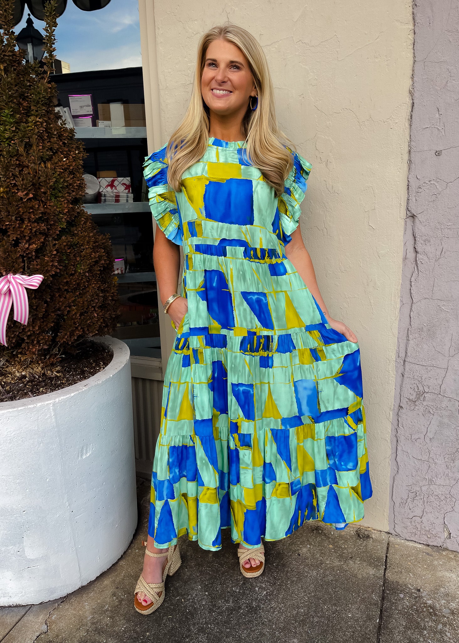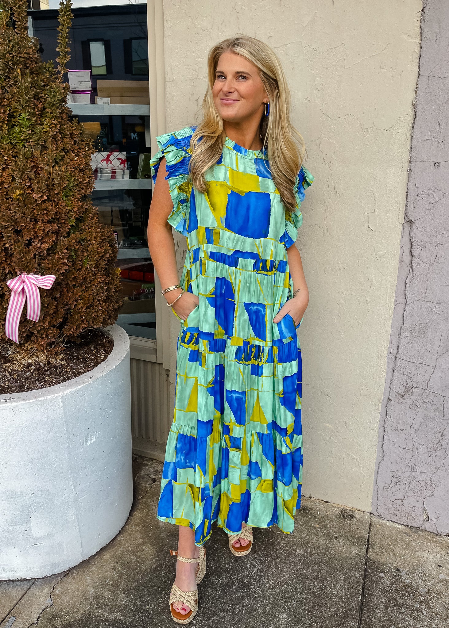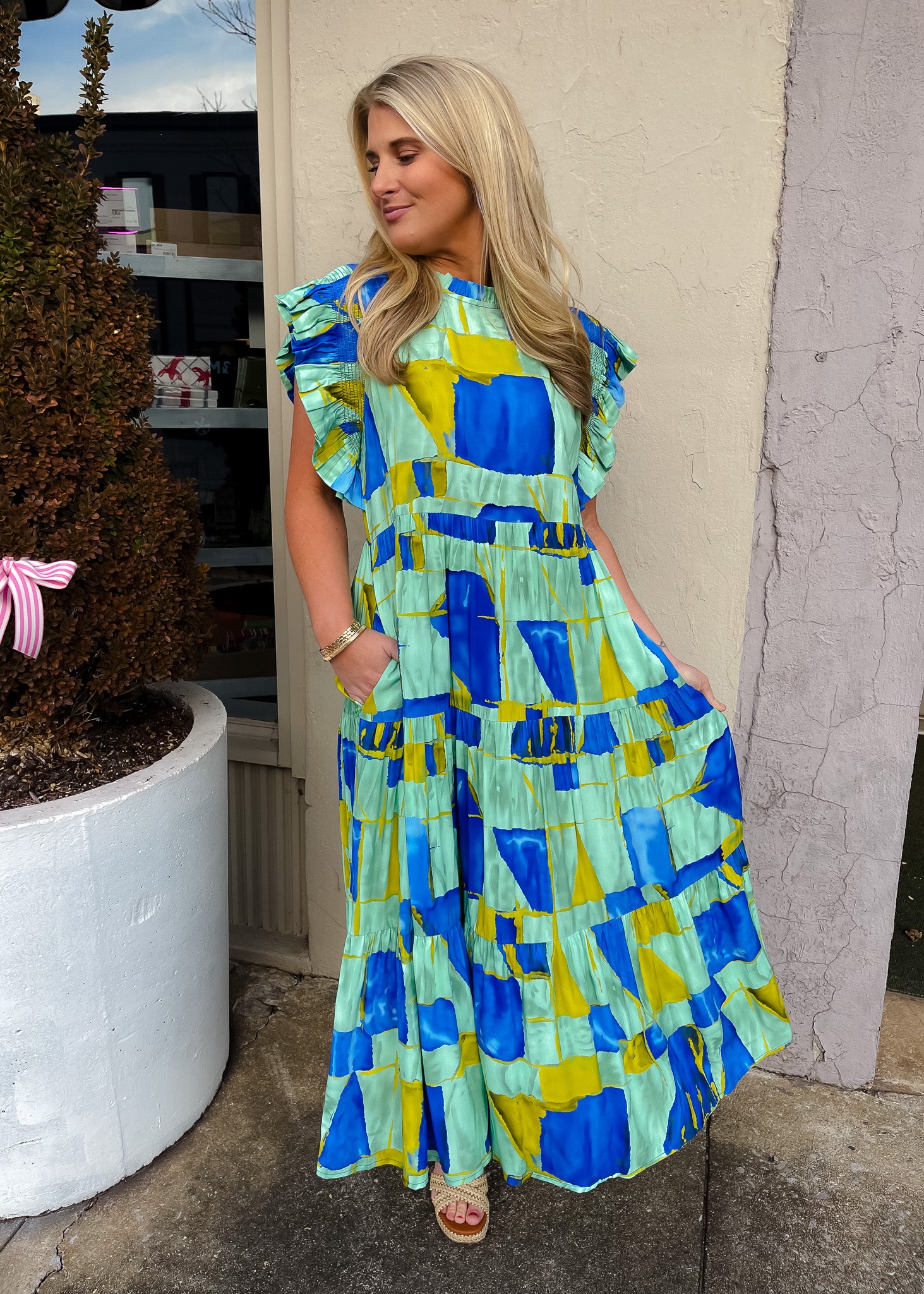 Get ready to twirl in the Keep Me Close Maxi Dress! This flowy maxi dress features a playful blue, lime green, and teal color scheme, charming cap ruffle sleeves, and a flirty keyhole back. The smocked detailing and oversized fit add a touch of whimsy to this must-have dress. This maxi dress is stylish and functional with pockets! Keep all your essentials close while looking fabulous. Perfect for any occasion, you'll never want to take it off.