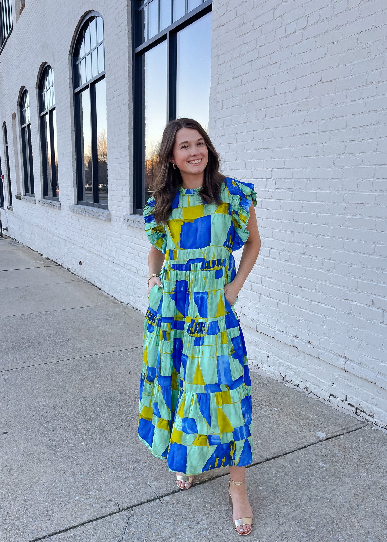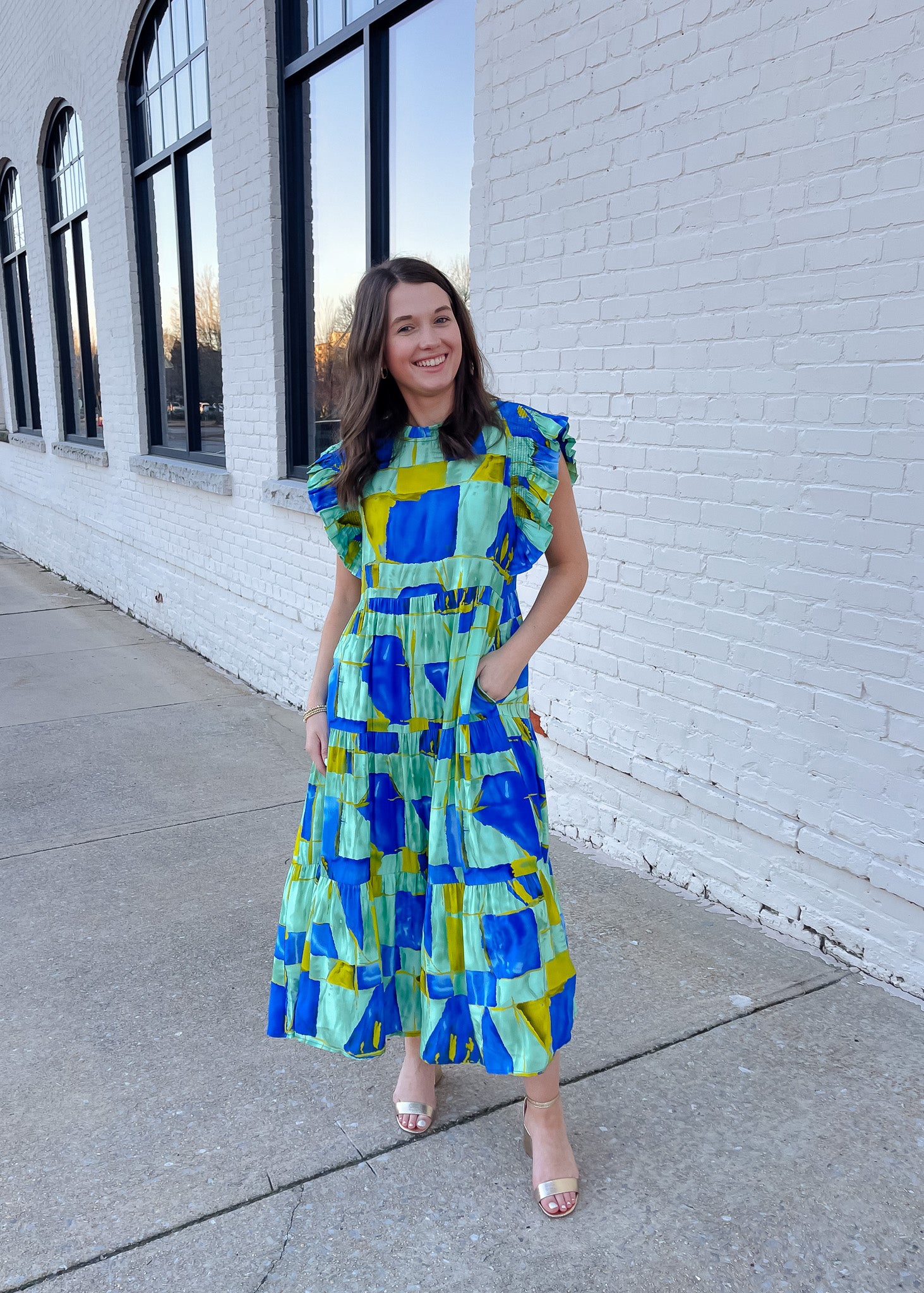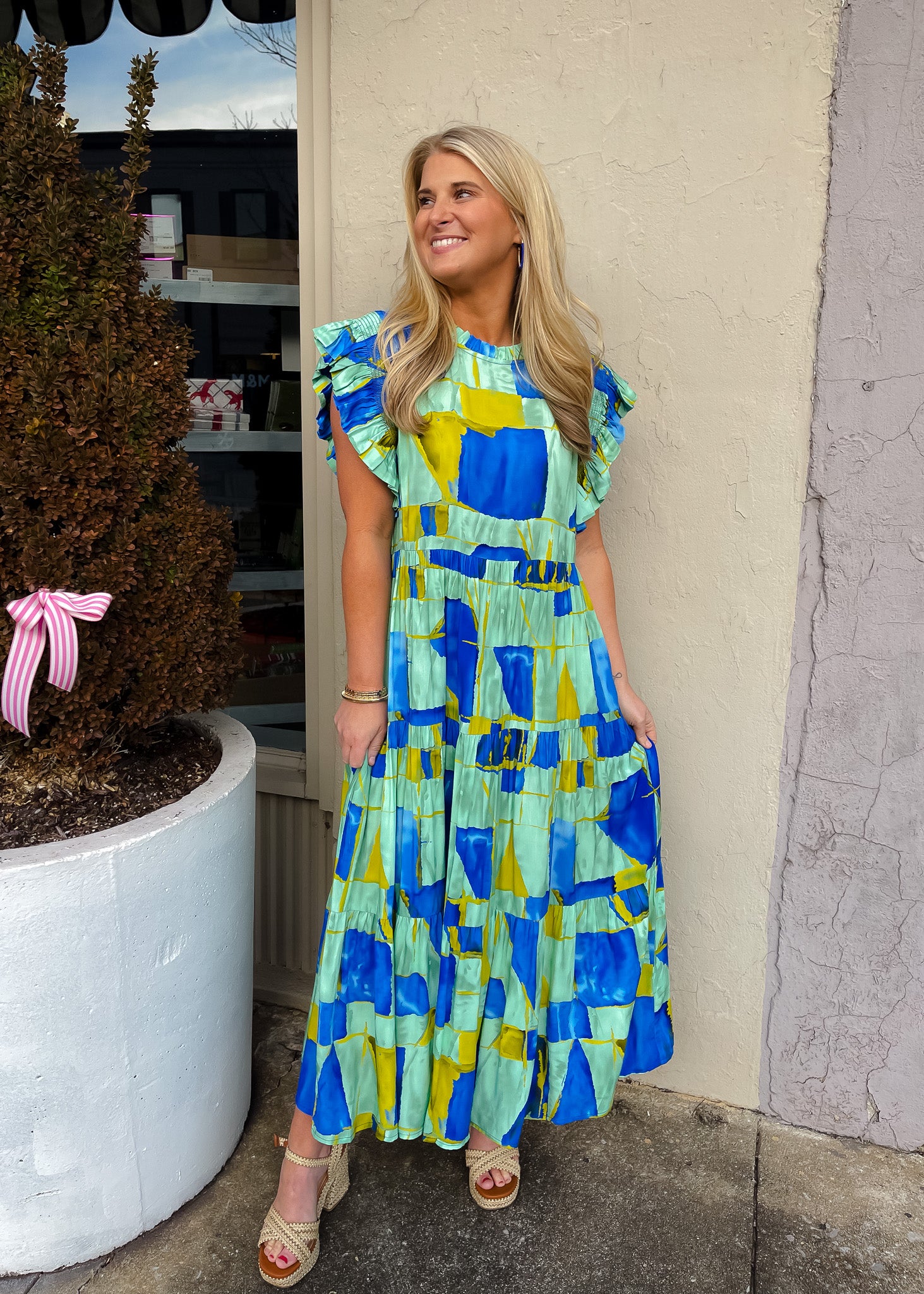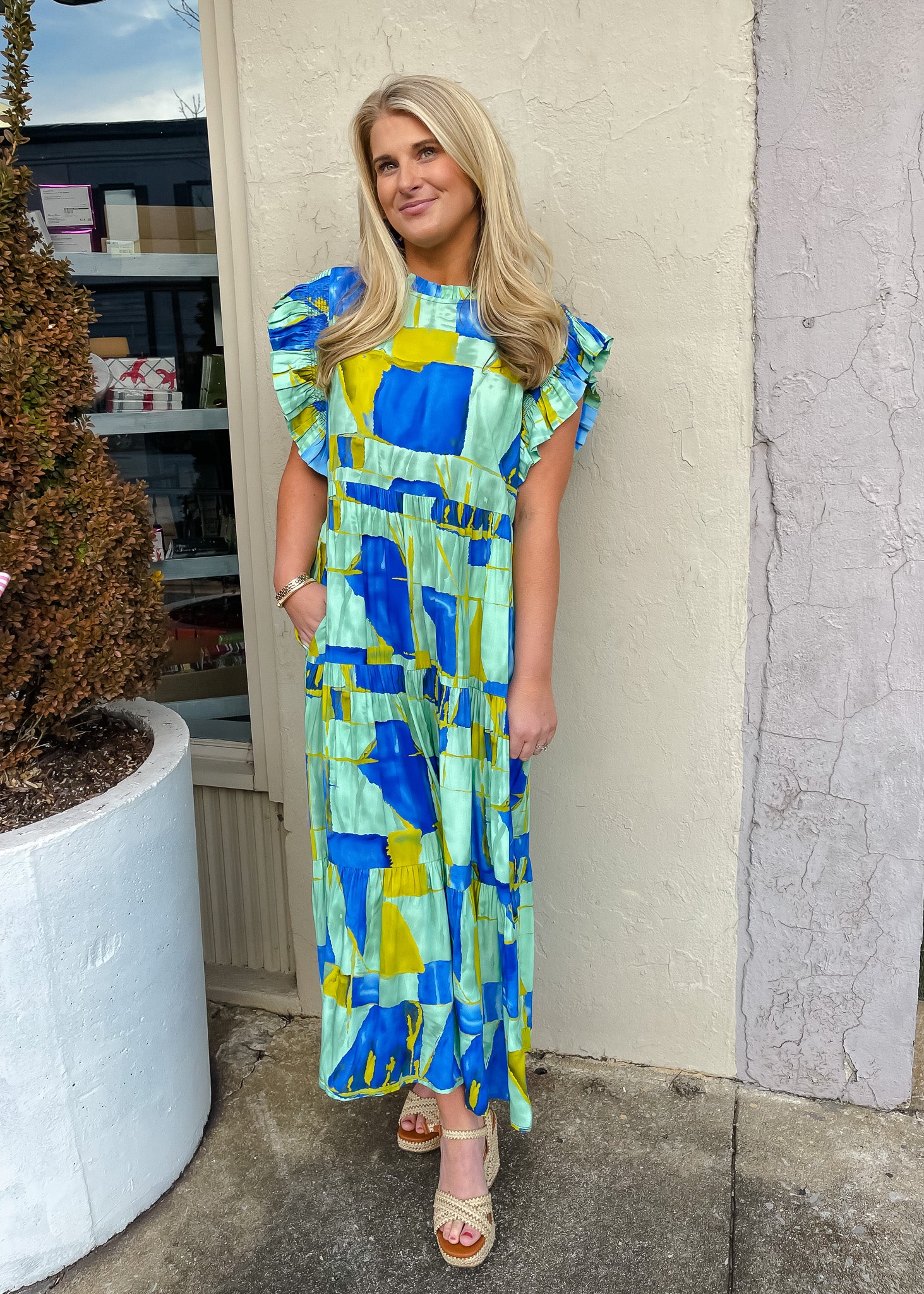 Get ready to twirl in the Keep Me Close Maxi Dress! This flowy maxi dress features a playful blue, lime green, and teal color scheme, charming cap ruffle sleeves, and a flirty keyhole back. The smocked detailing and oversized fit add a touch of whimsy to this must-have dress. This maxi dress is stylish and functional with pockets! Keep all your essentials close while looking fabulous. Perfect for any occasion, you'll never want to take it off.