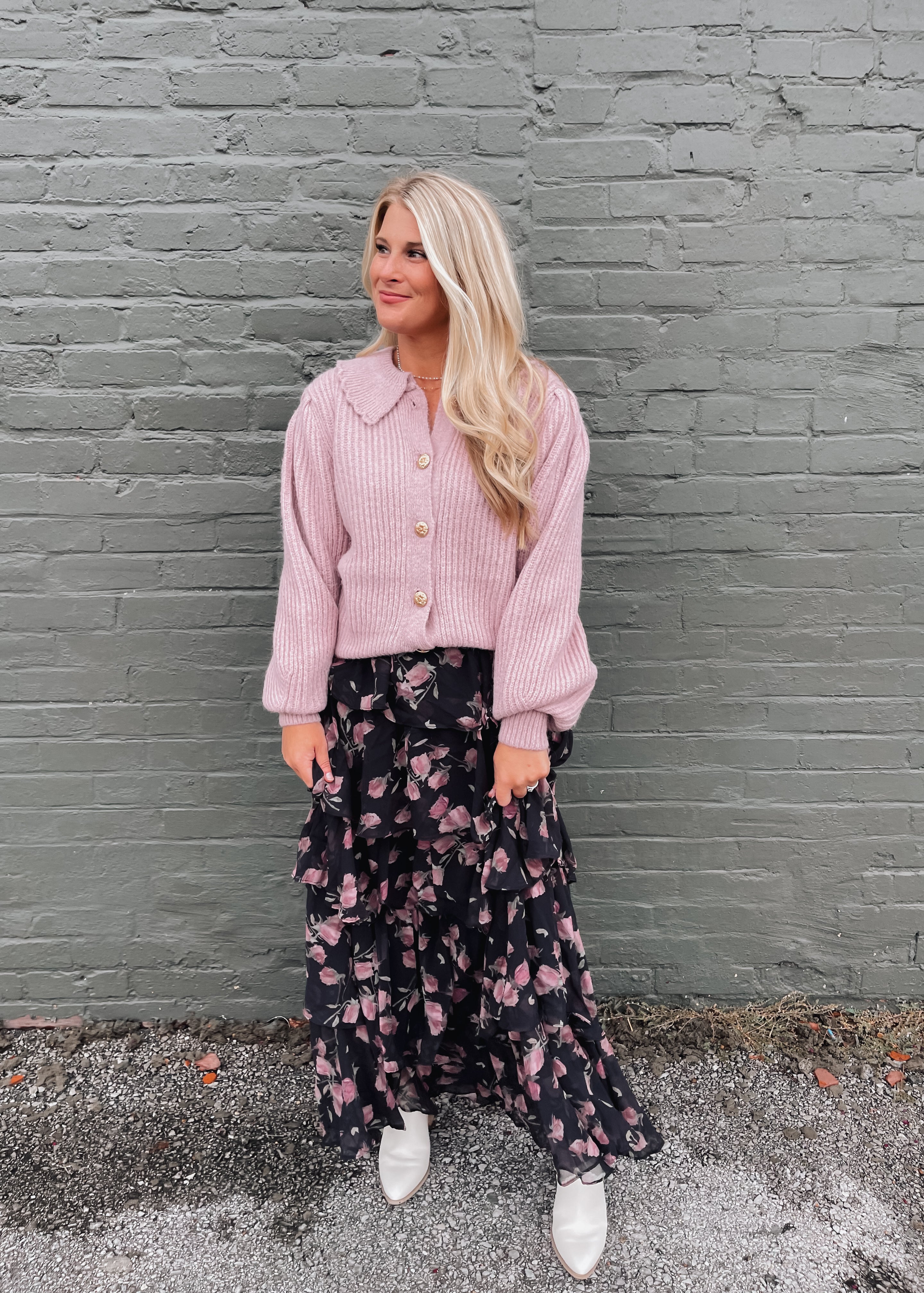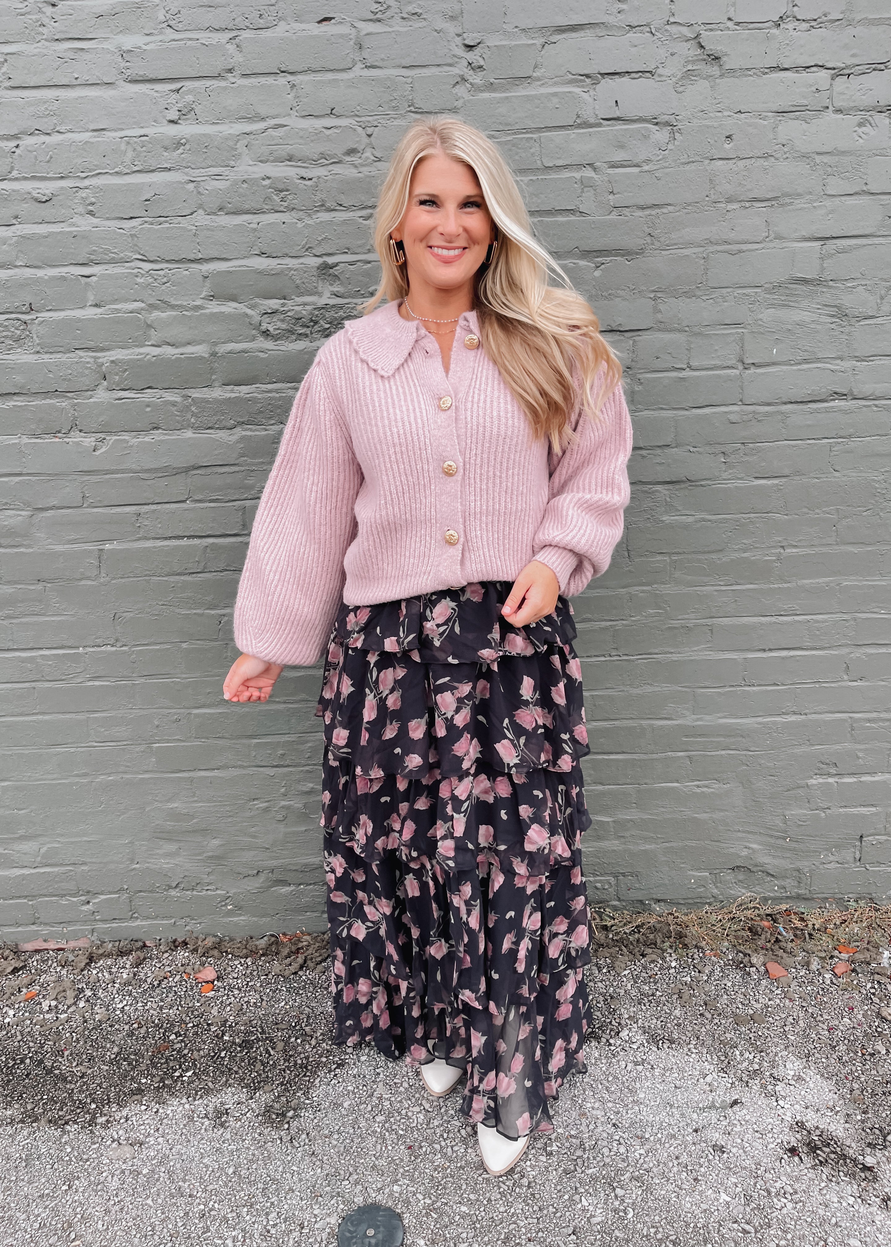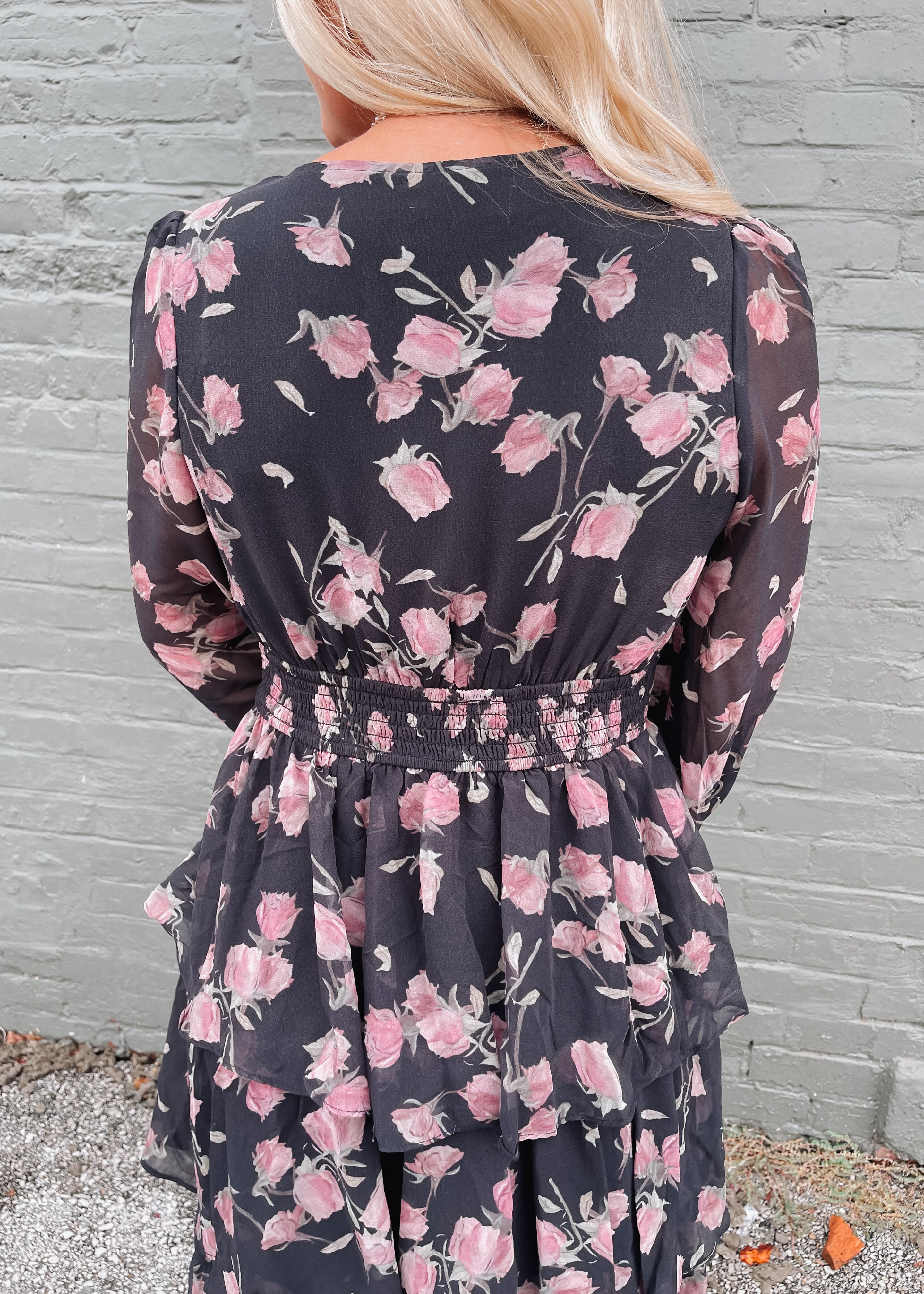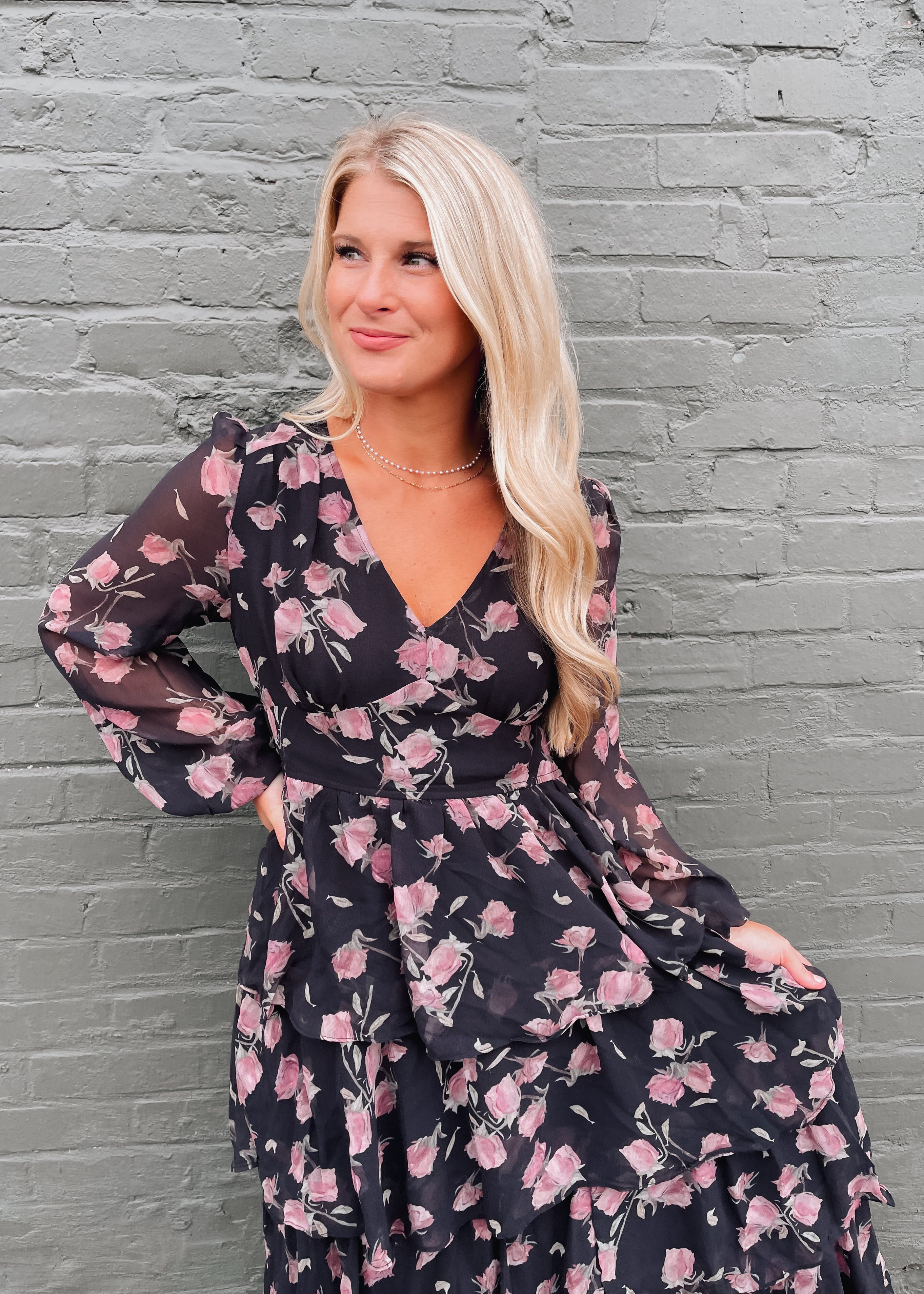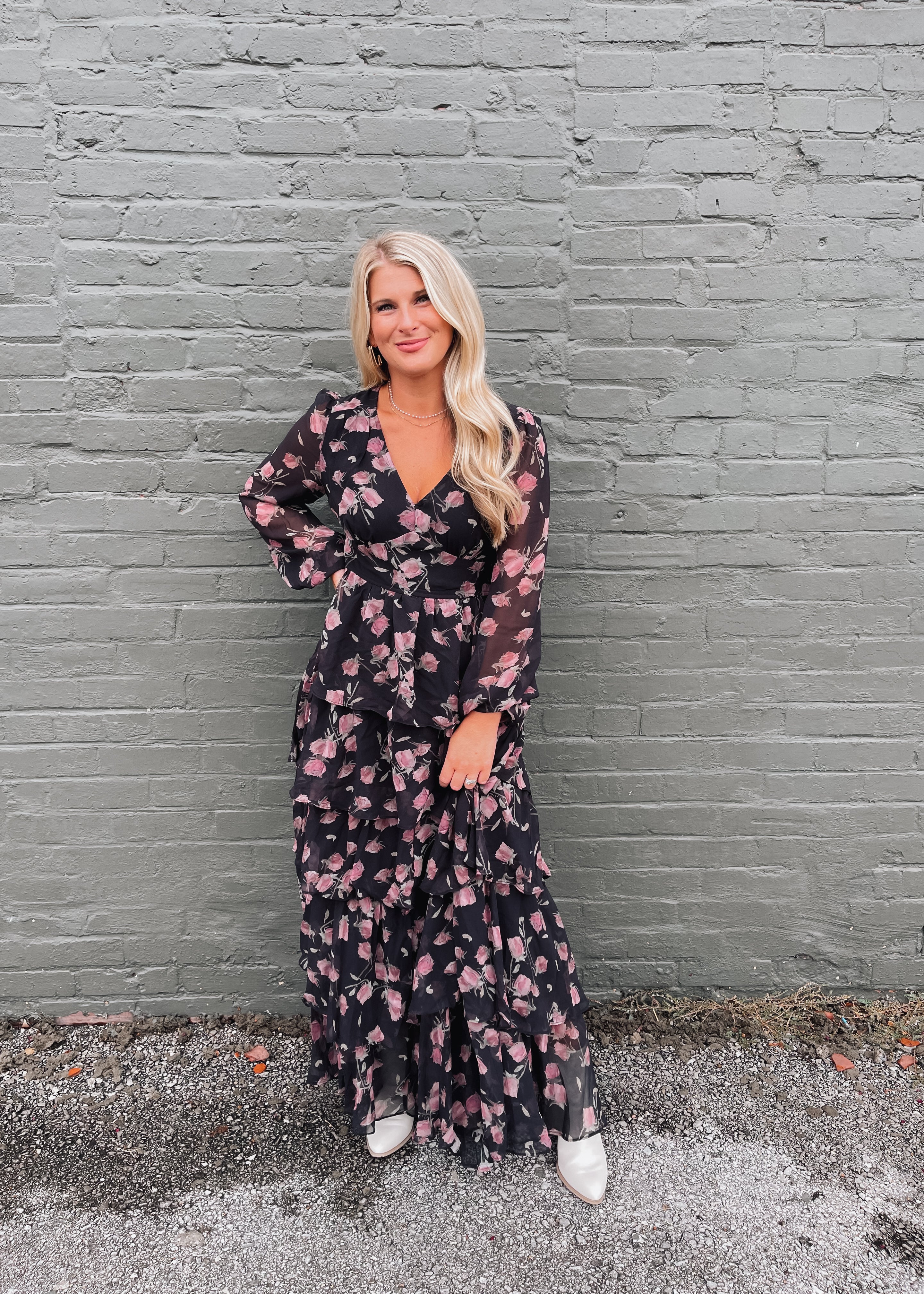 Elevate your wardrobe with the Let It Be Known Maxi Dress��a stunning midnight�tiered gown adorned with delicate purple flowers. Designed with a flattering V-neck and long sleeves, it features a hidden side zipper for a smooth silhouette and elegant smocked back detailing for added comfort and shape. Perfect for any occasion, this dress combines feminine charm with effortless style.�