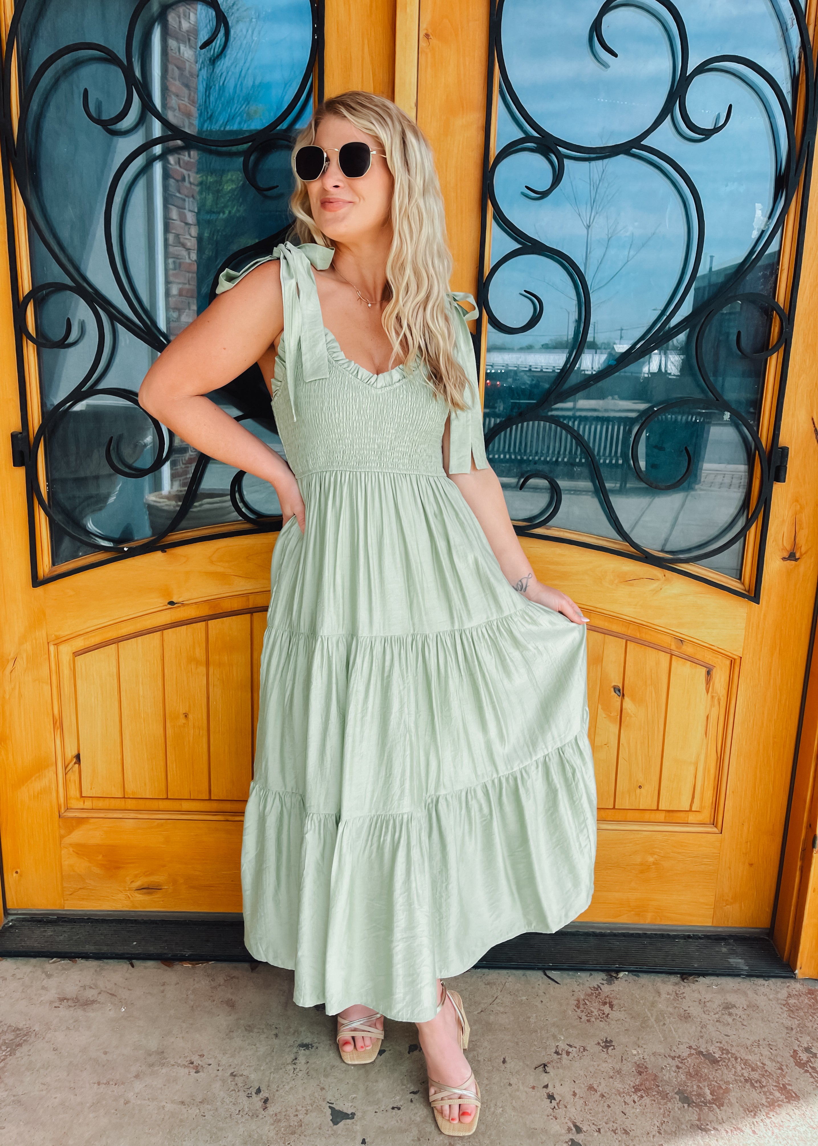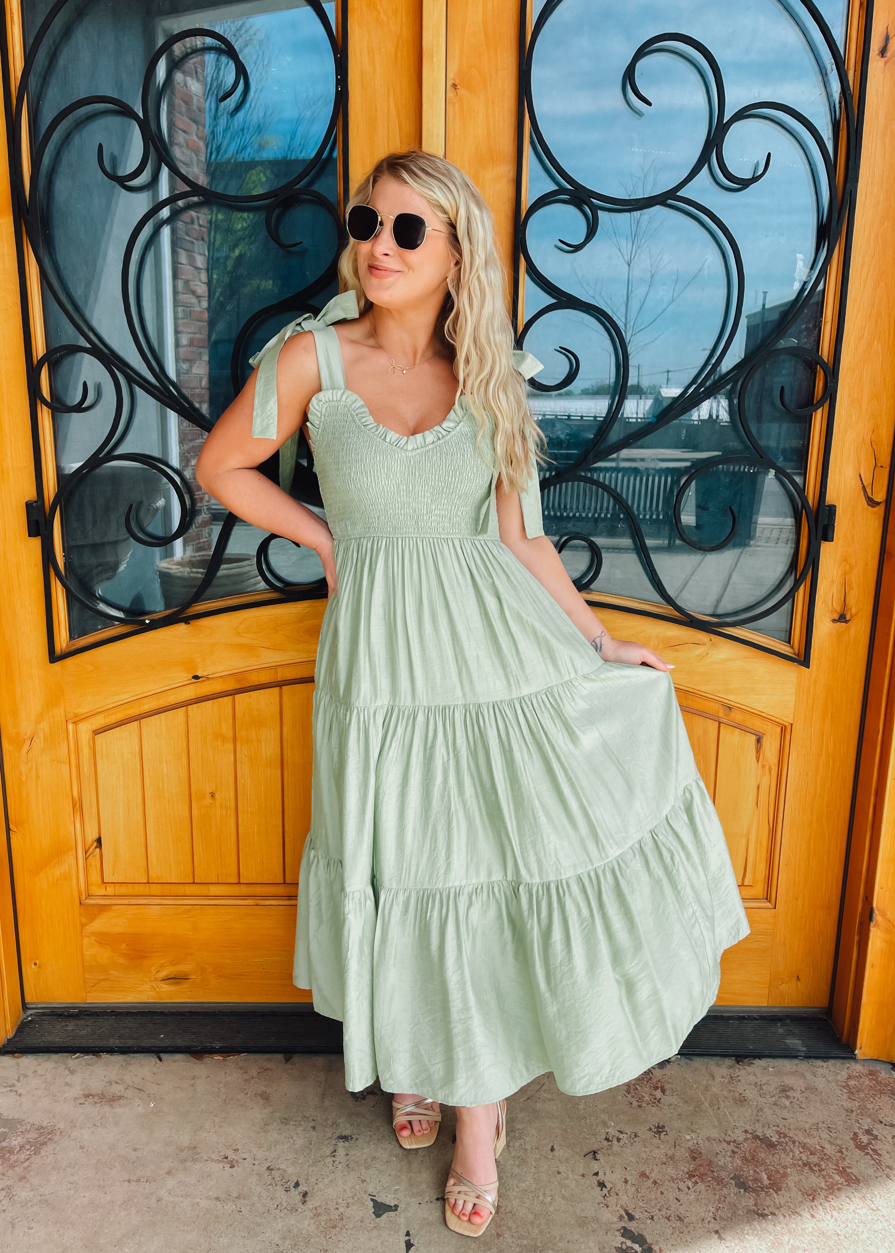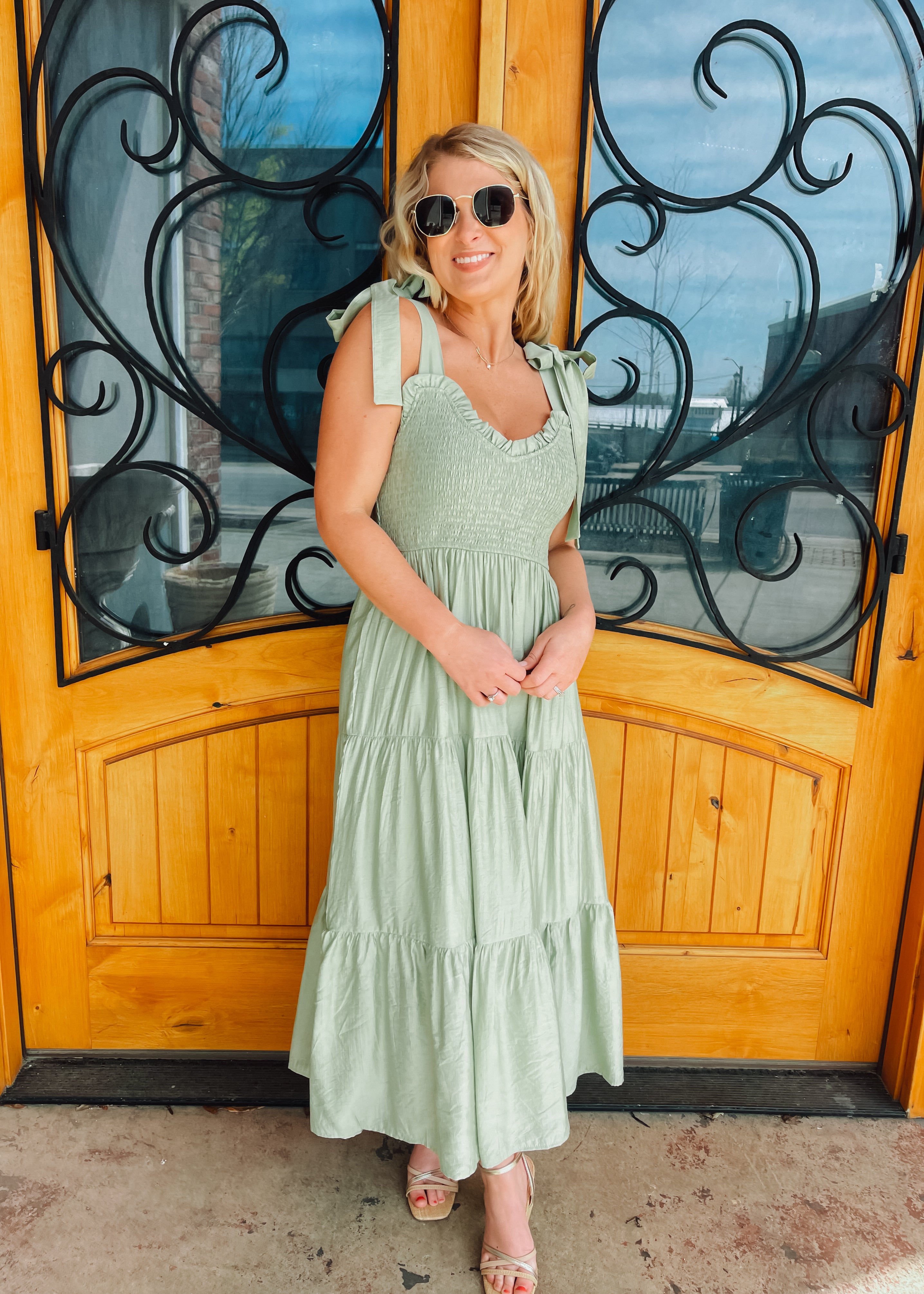 Ready to get going in style? This Let's Get Going Midi Dress in light green�will have you feeling sweet and chic with its sweetheart neckline, tie straps, smocked chest, and tiered design. Perfect for any occasion, this midi dress is a must-have for your wardrobe!