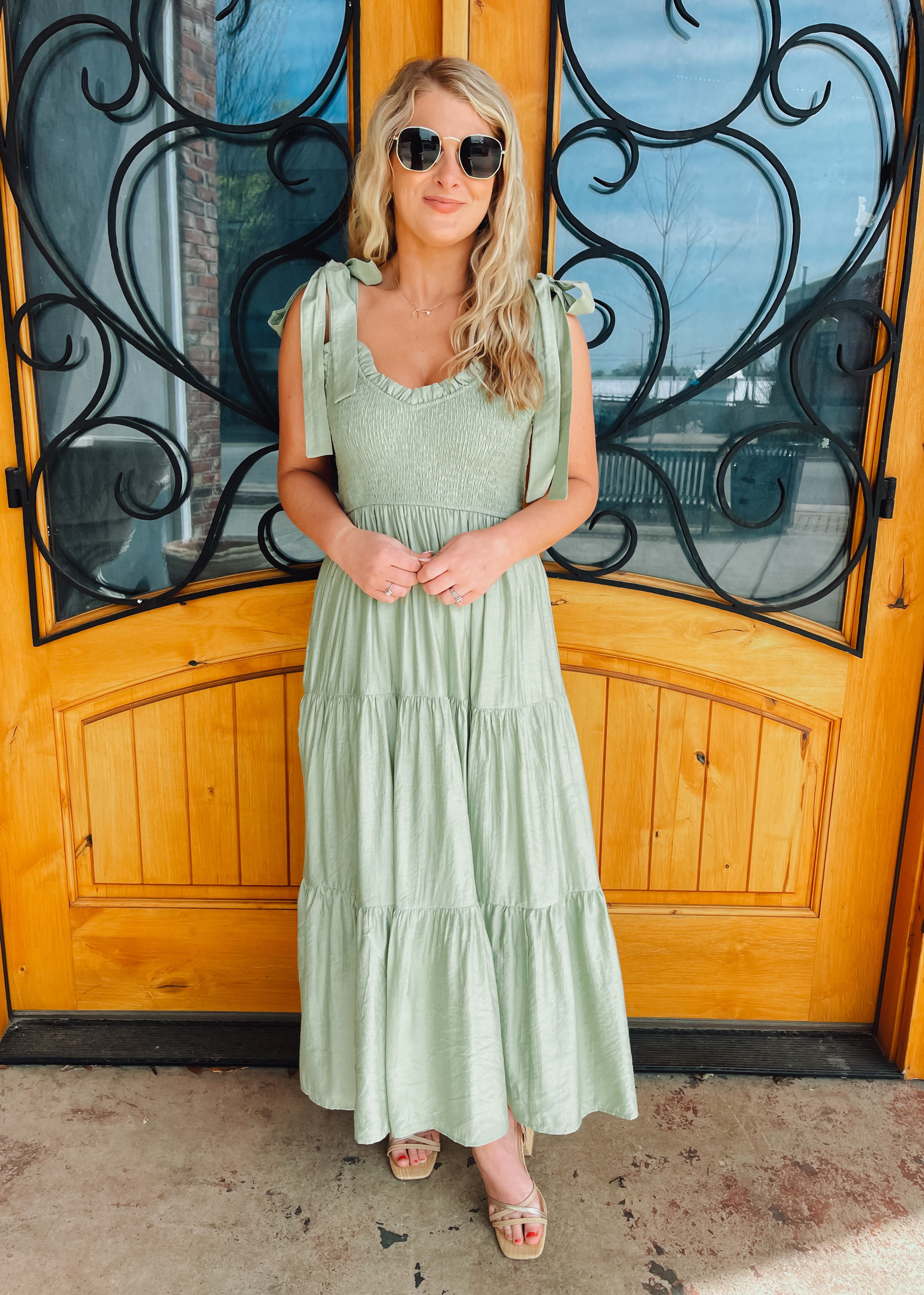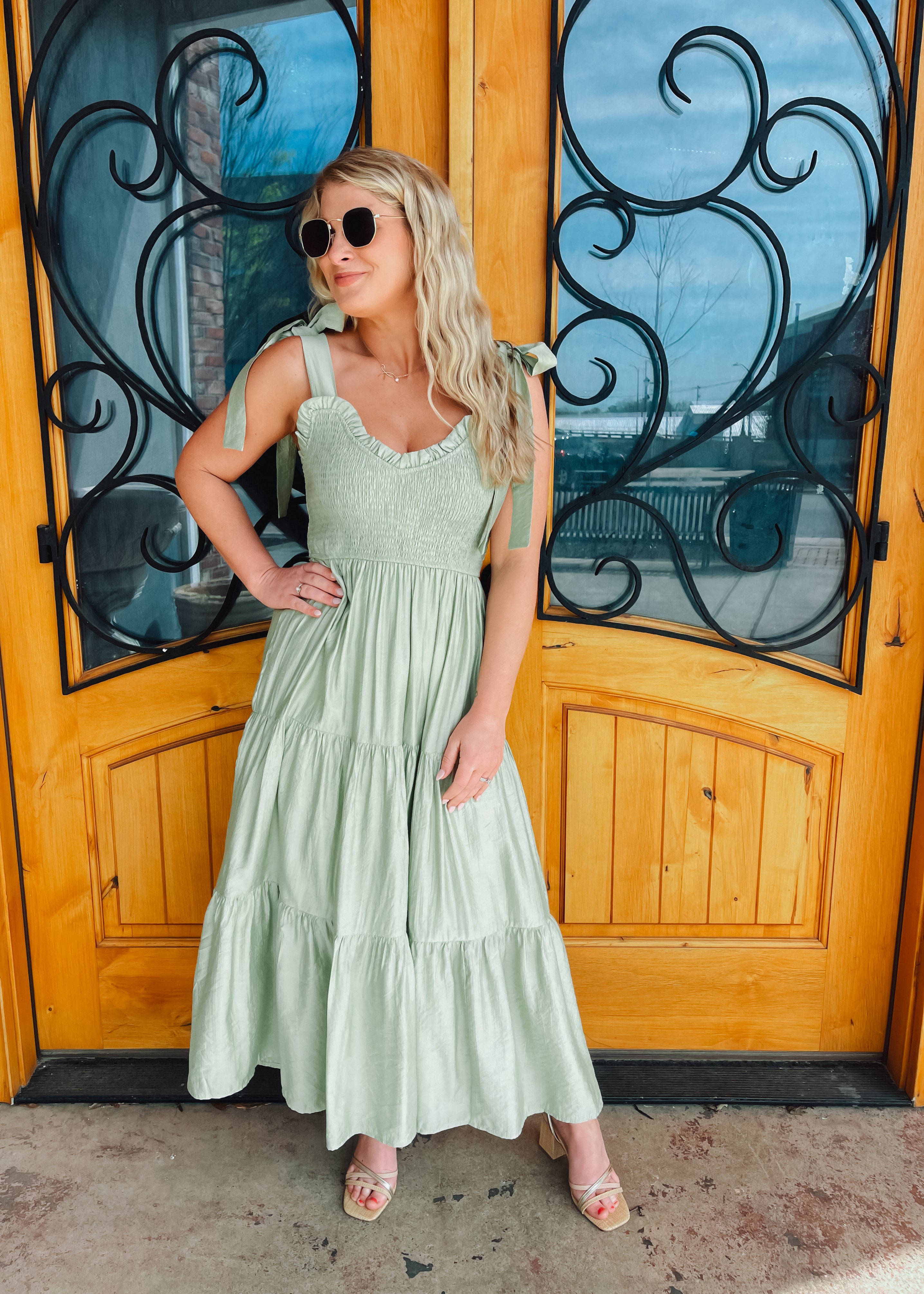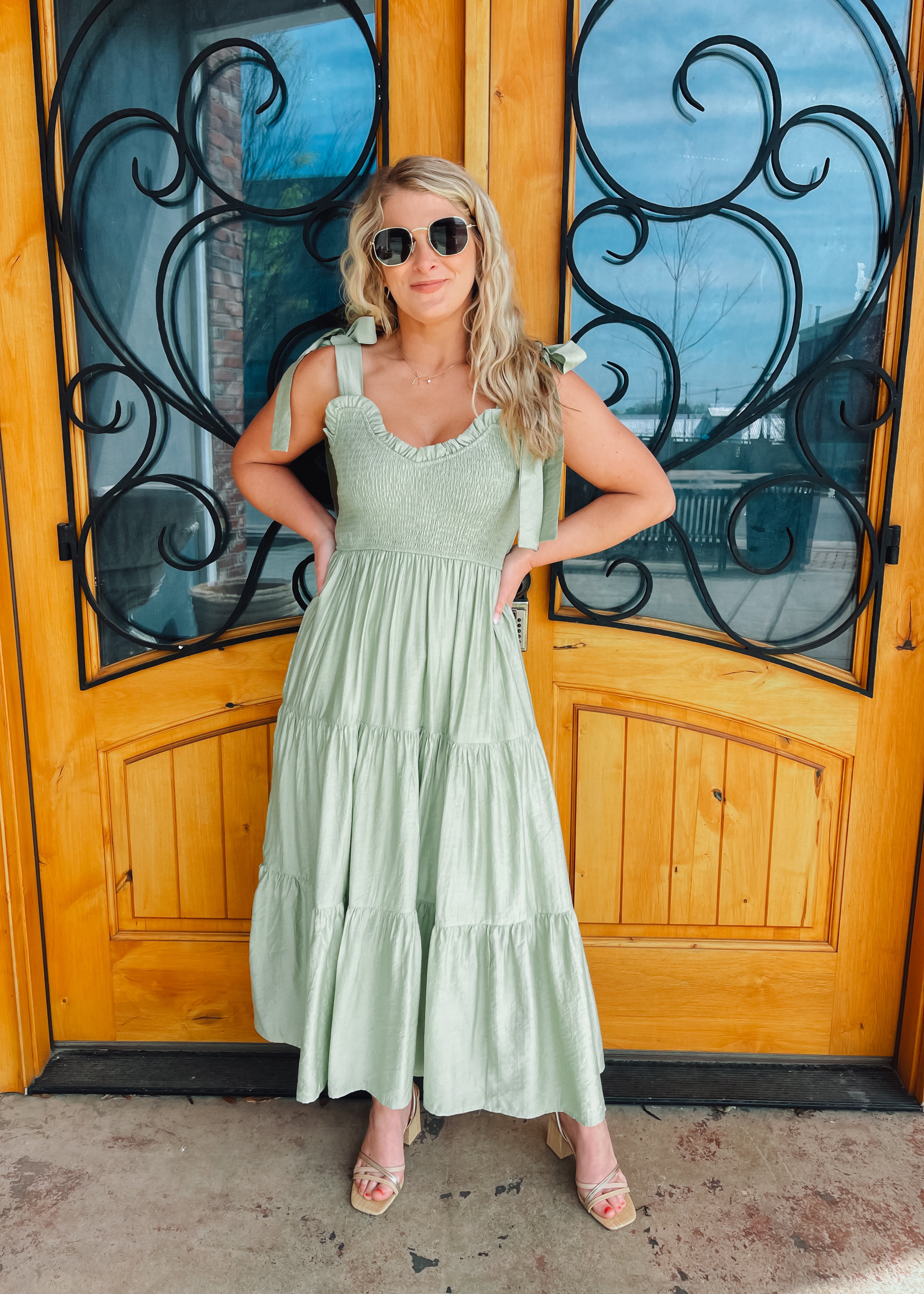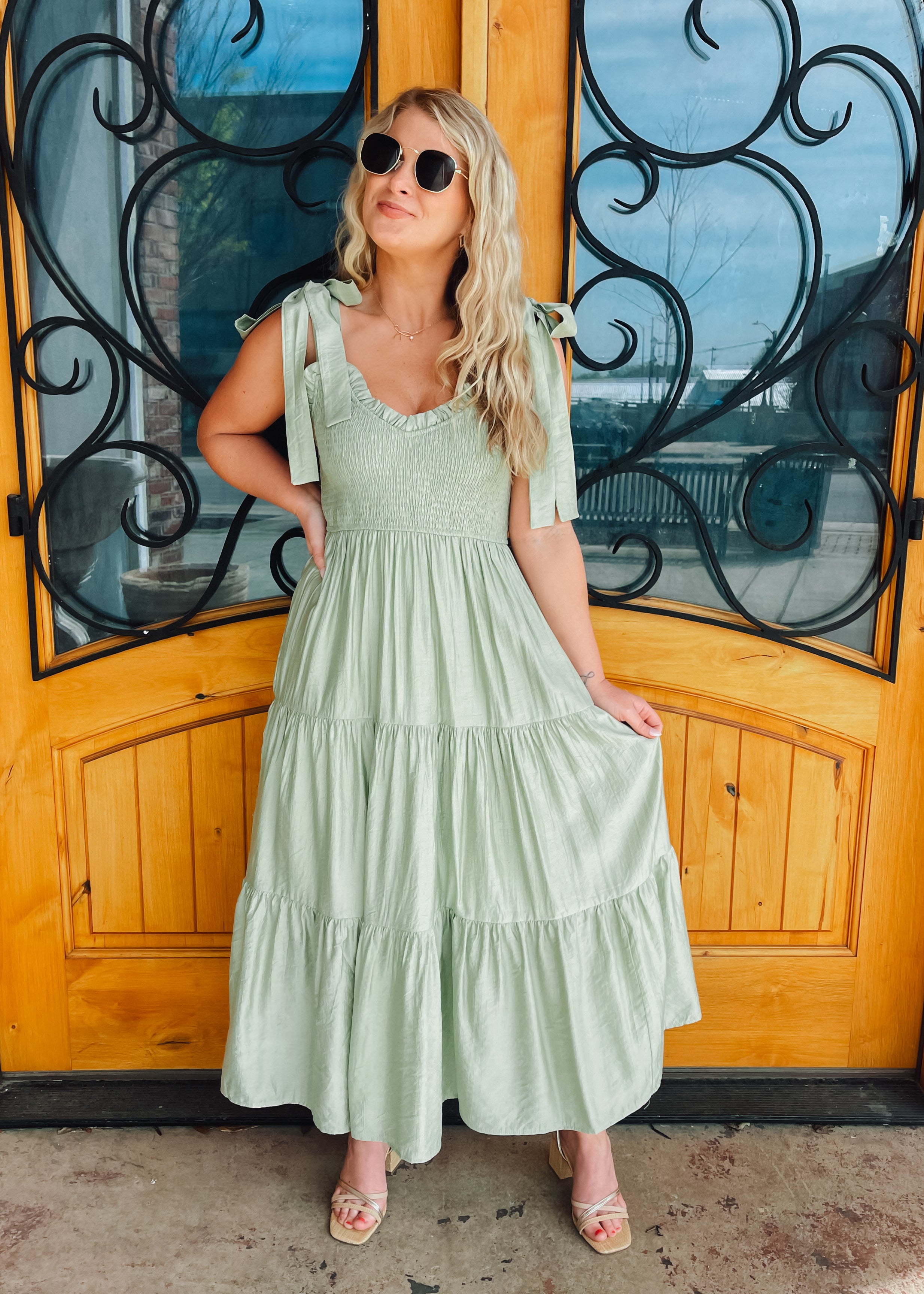 Ready to get going in style? This Let's Get Going Midi Dress in light green�will have you feeling sweet and chic with its sweetheart neckline, tie straps, smocked chest, and tiered design. Perfect for any occasion, this midi dress is a must-have for your wardrobe!