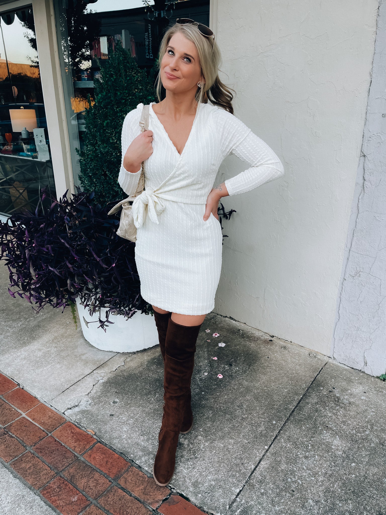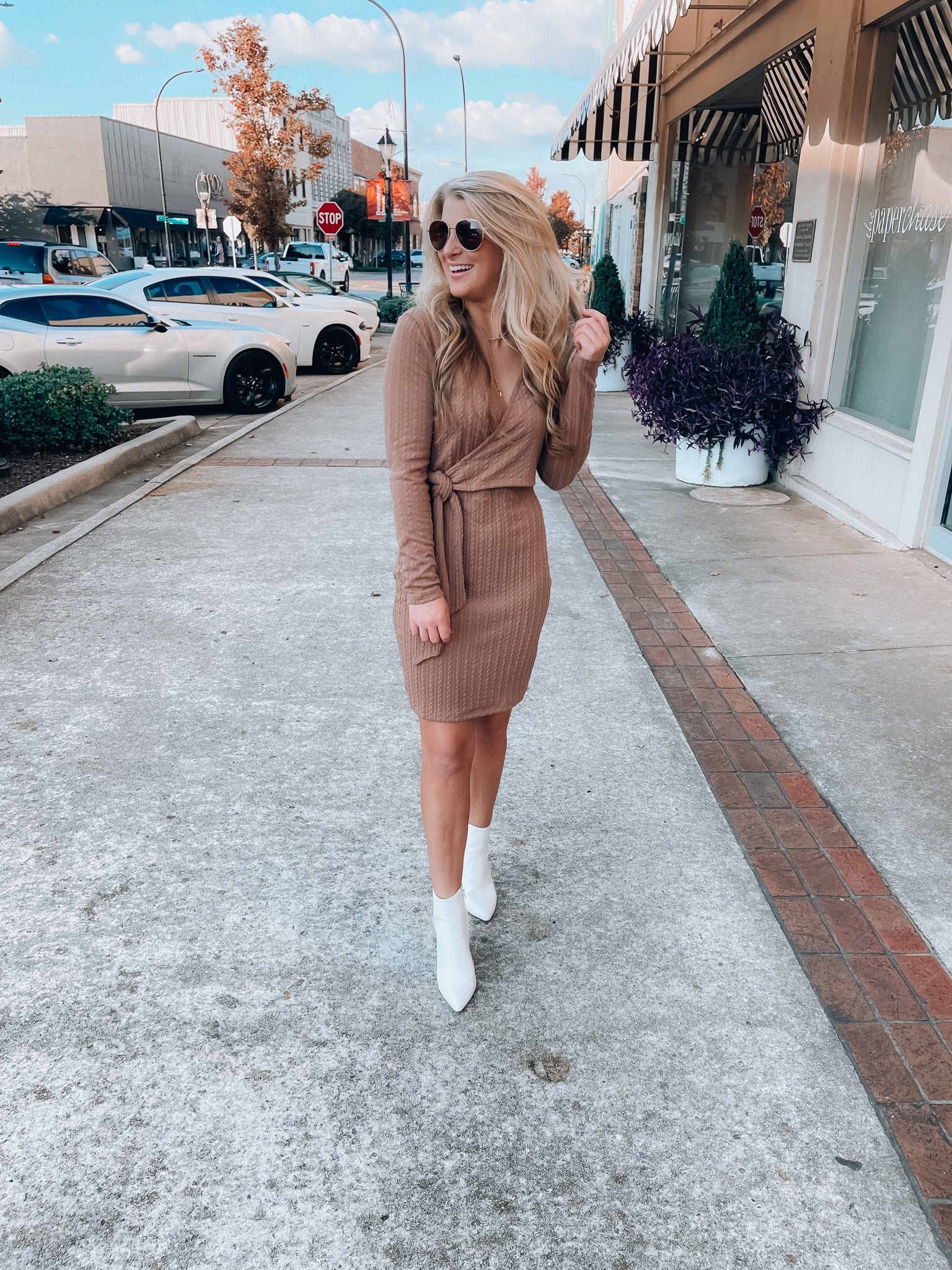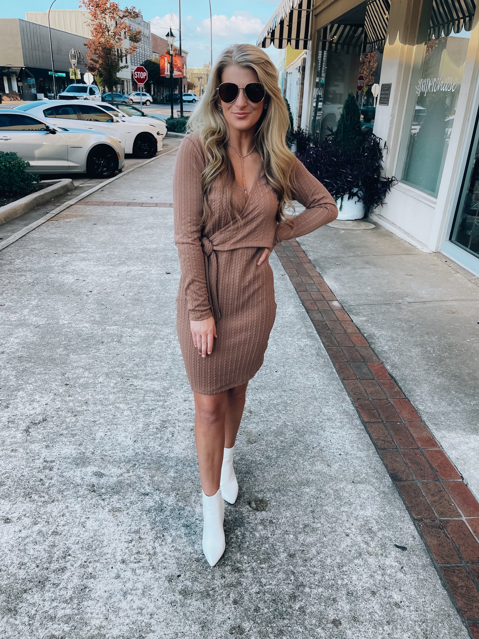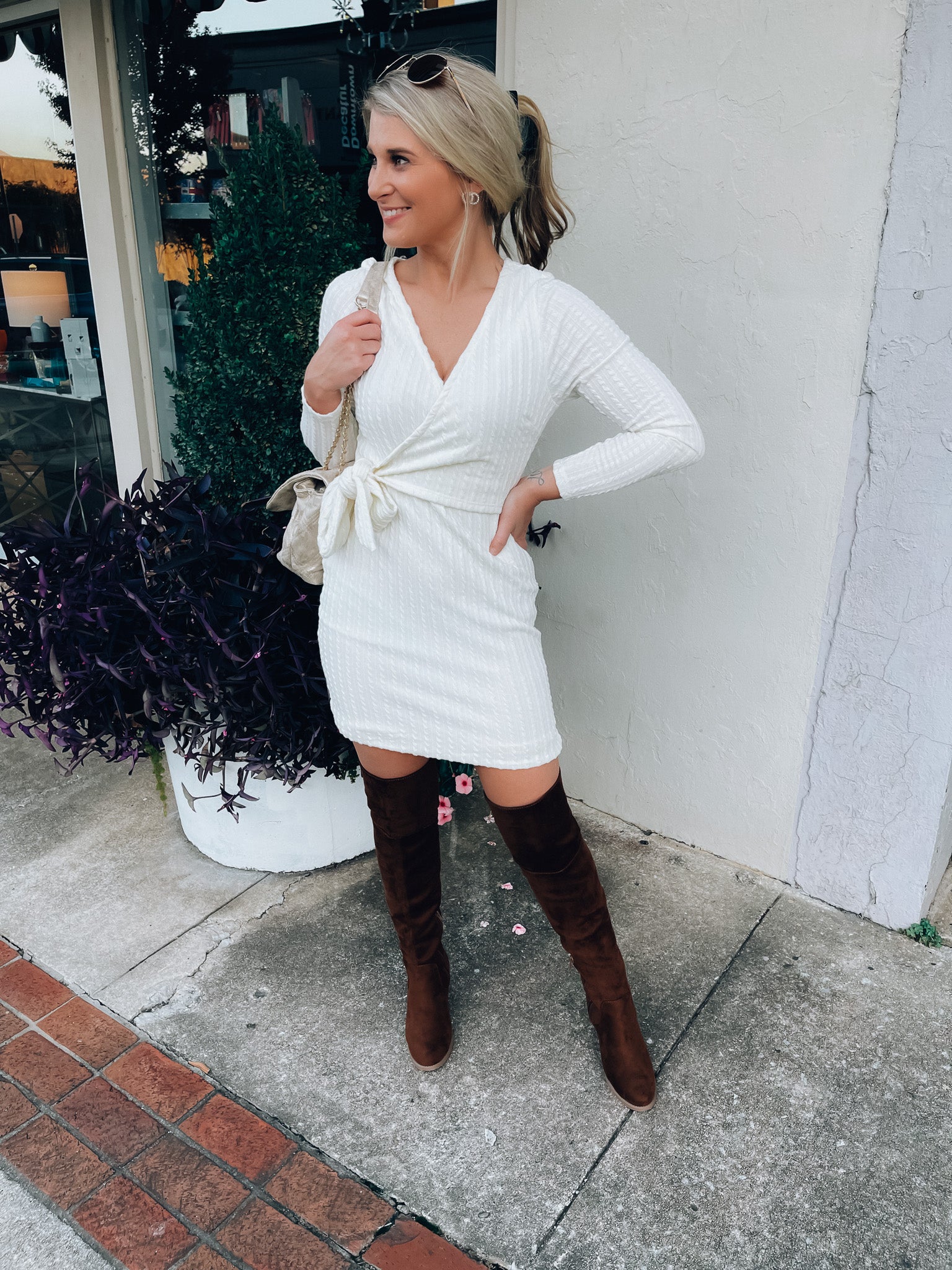 Dress features a solid base color, soft knit material, long sleeves, V-neck line, tie waist band, knee length and runs true to size with a true fitted shape!�