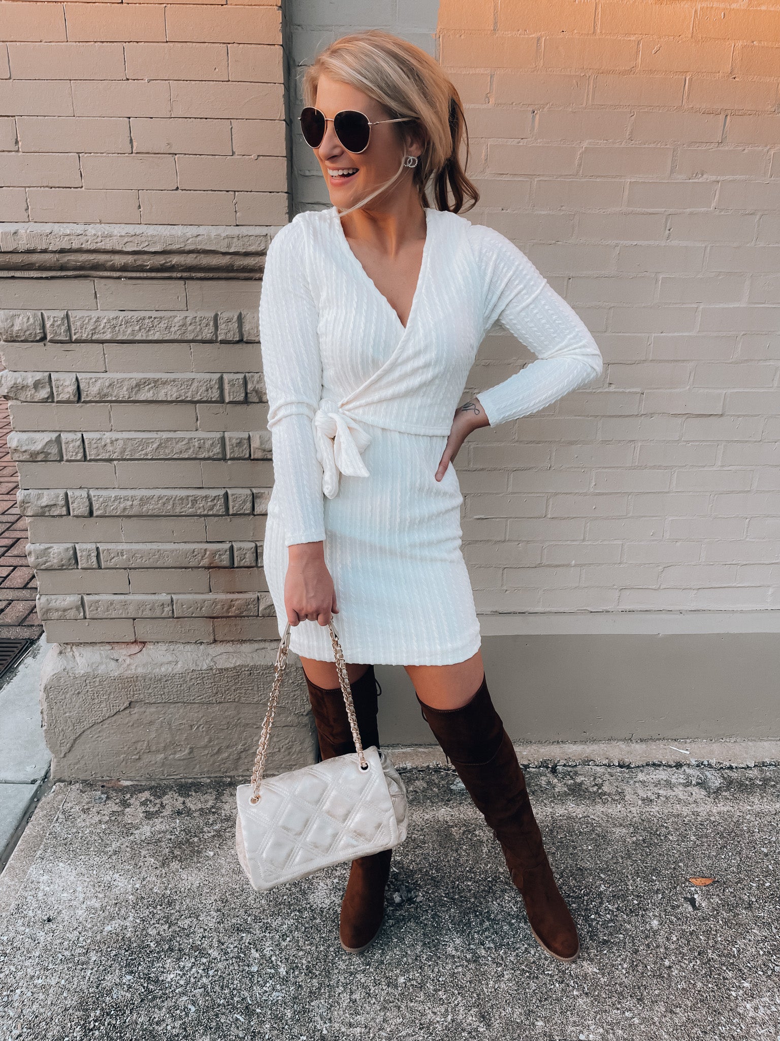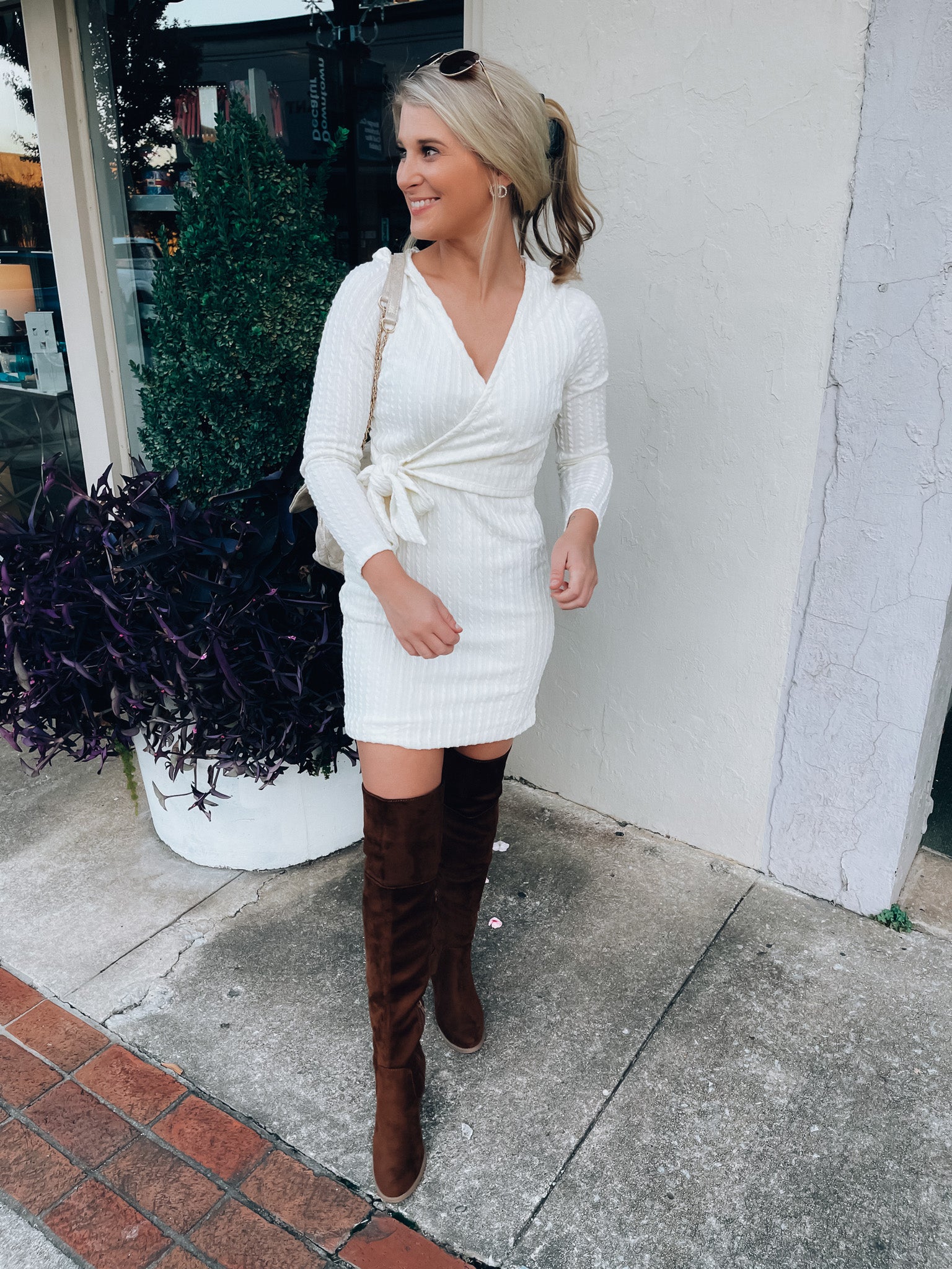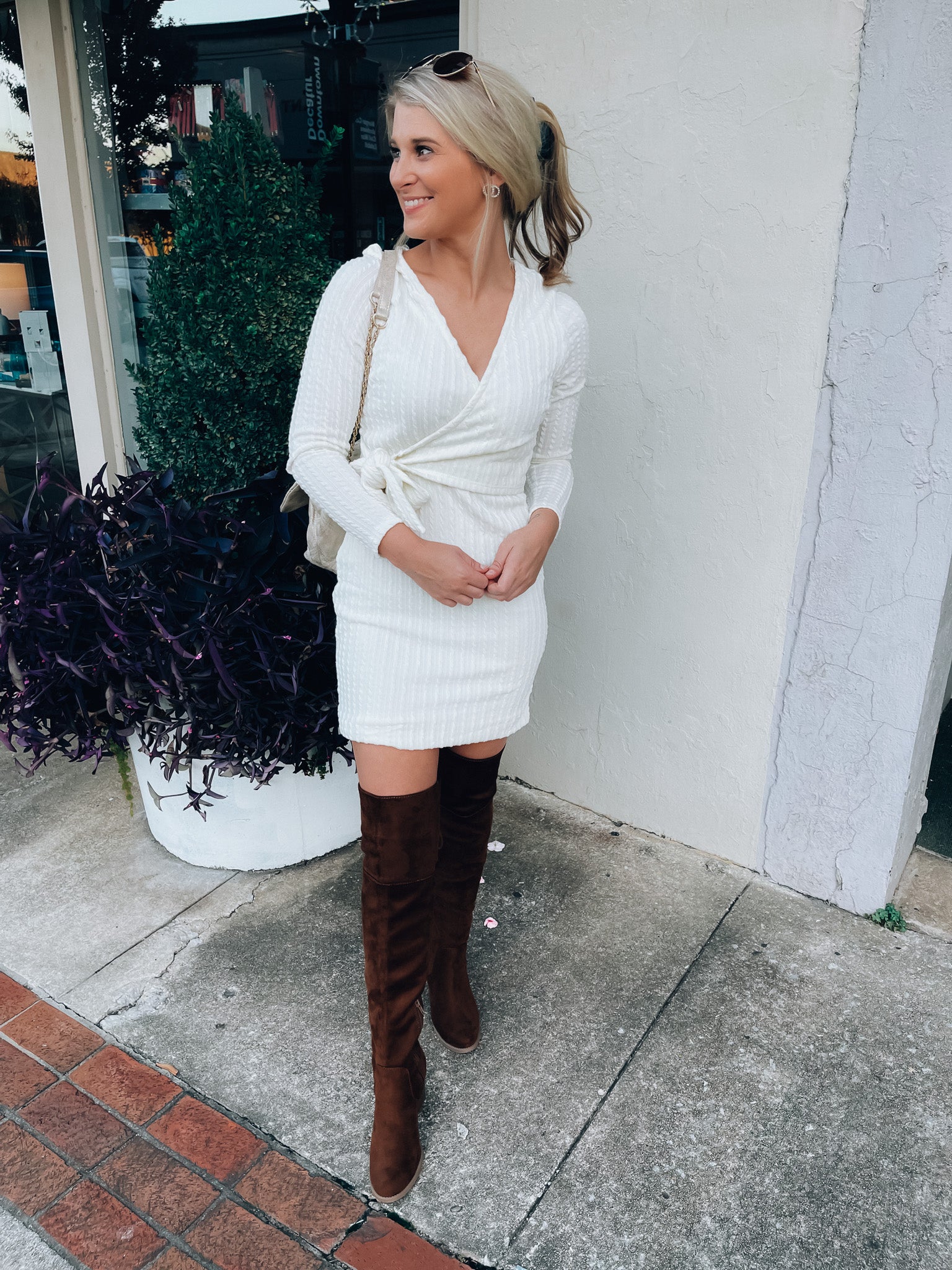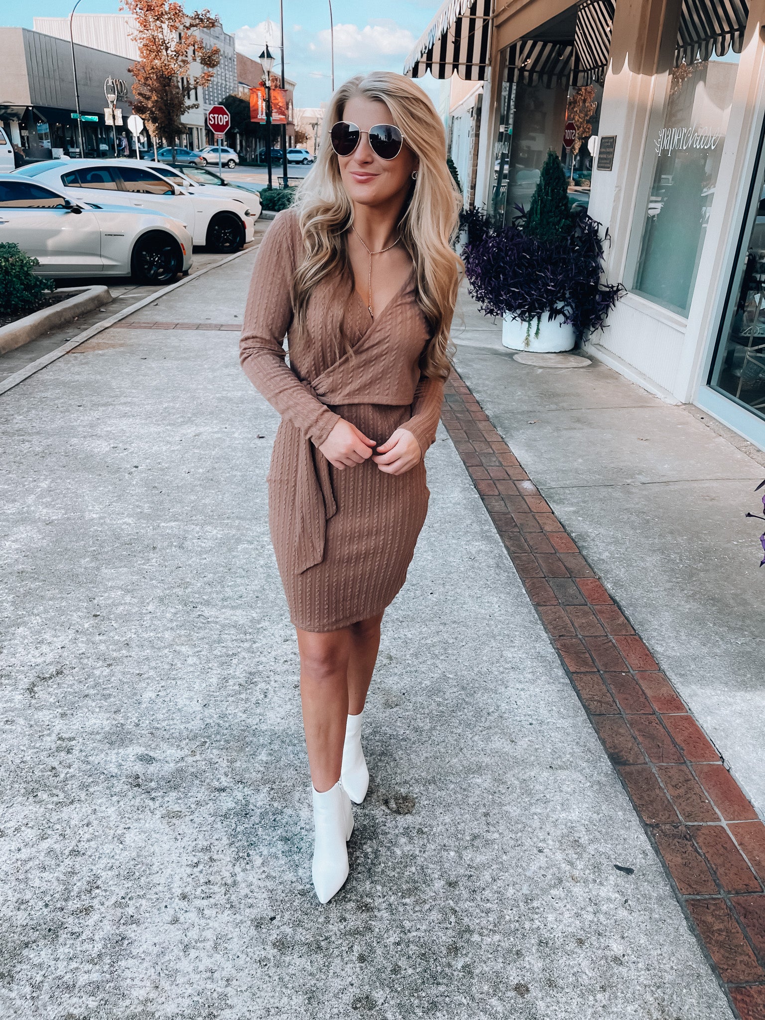 Dress features a solid base color, soft knit material, long sleeves, V-neck line, tie waist band, knee length and runs true to size with a true fitted shape!�