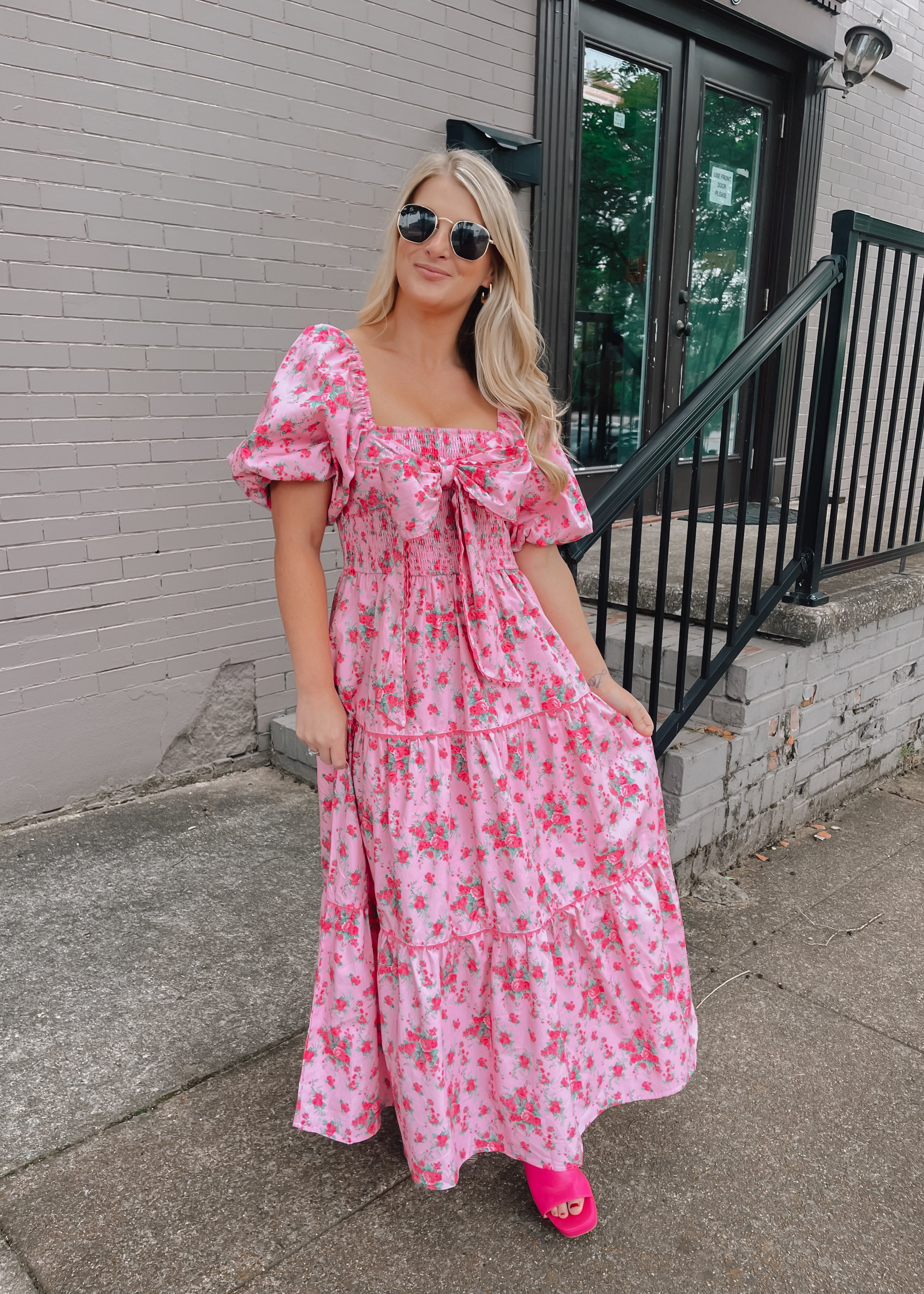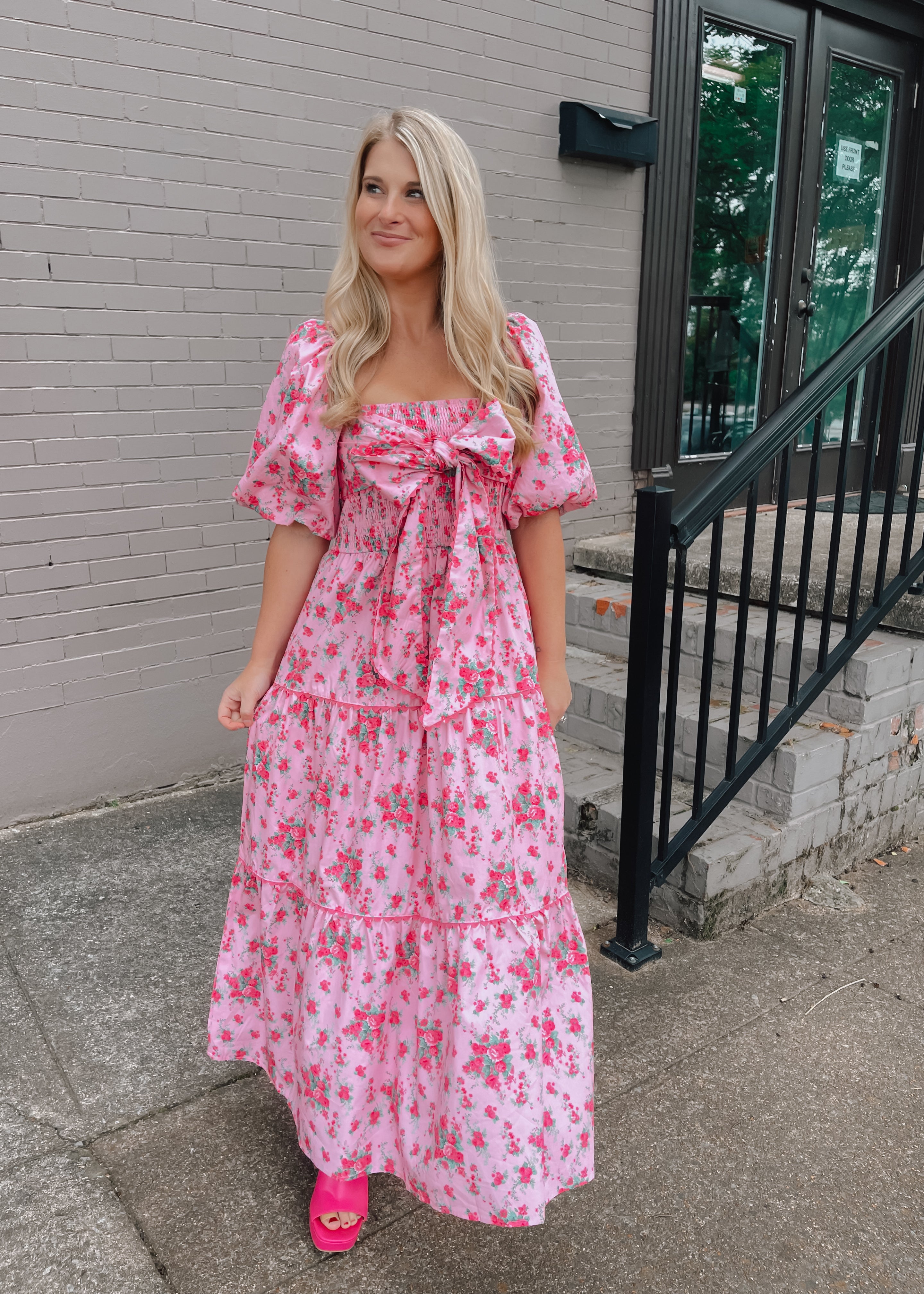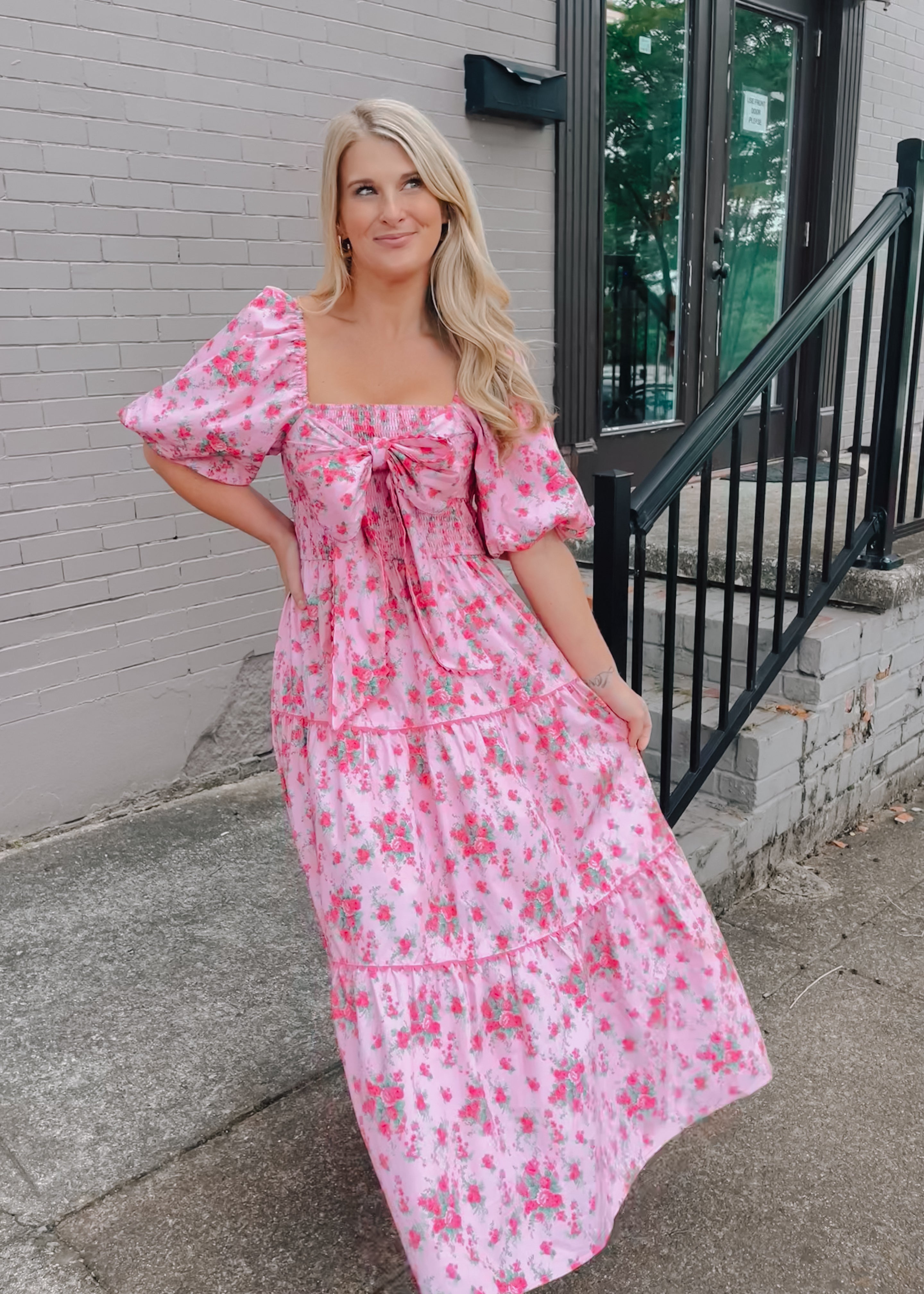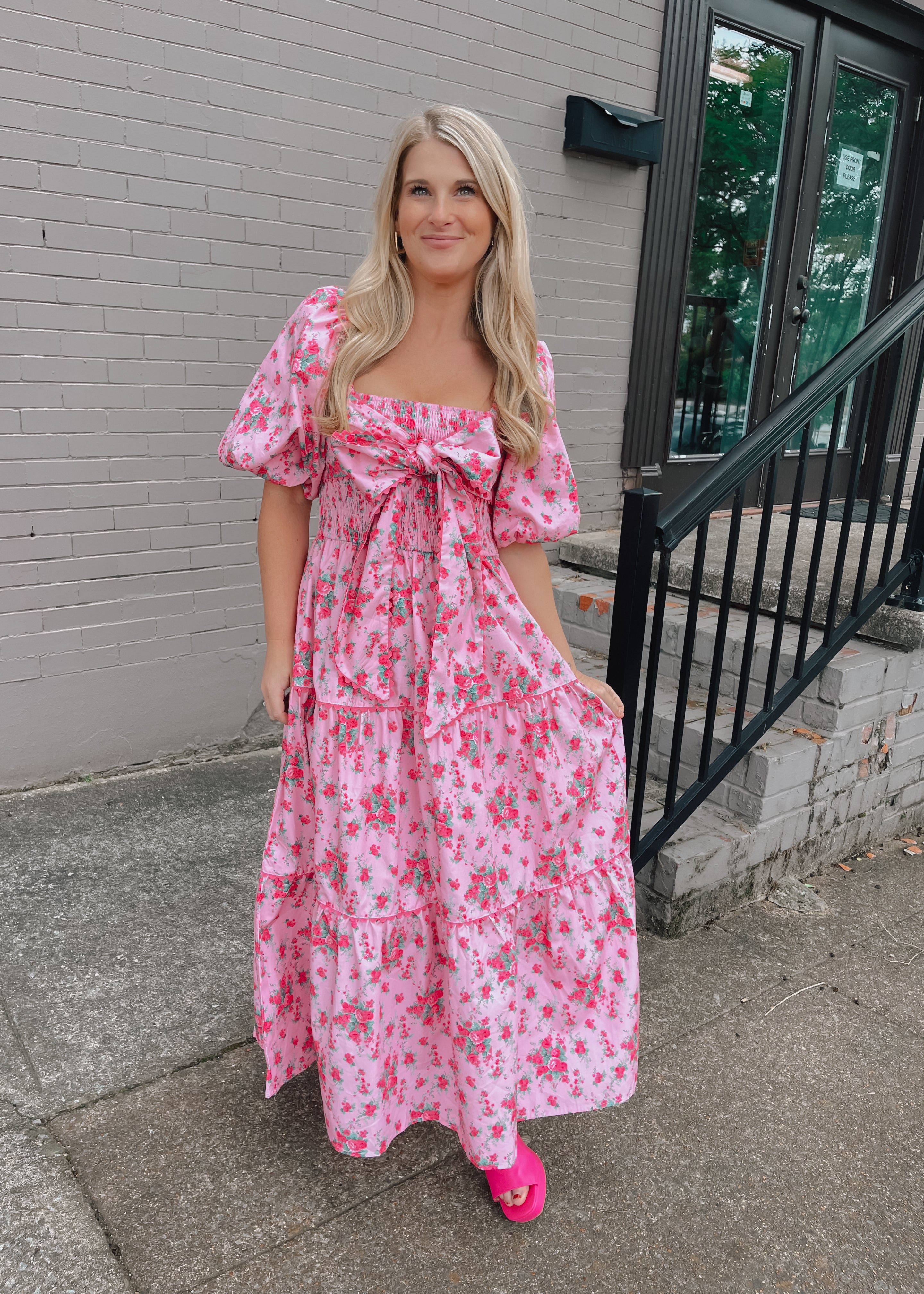 Step into full bloom with this pink cotton poplin maxi dress featuring a vibrant floral print, front bow detail, and short bubble sleeves. Embrace effortless elegance and feel like a free-spirited goddess in this flattering, flowy piece. Perfect for any occasion, this dress will add a touch of beauty and charm to your wardrobe.