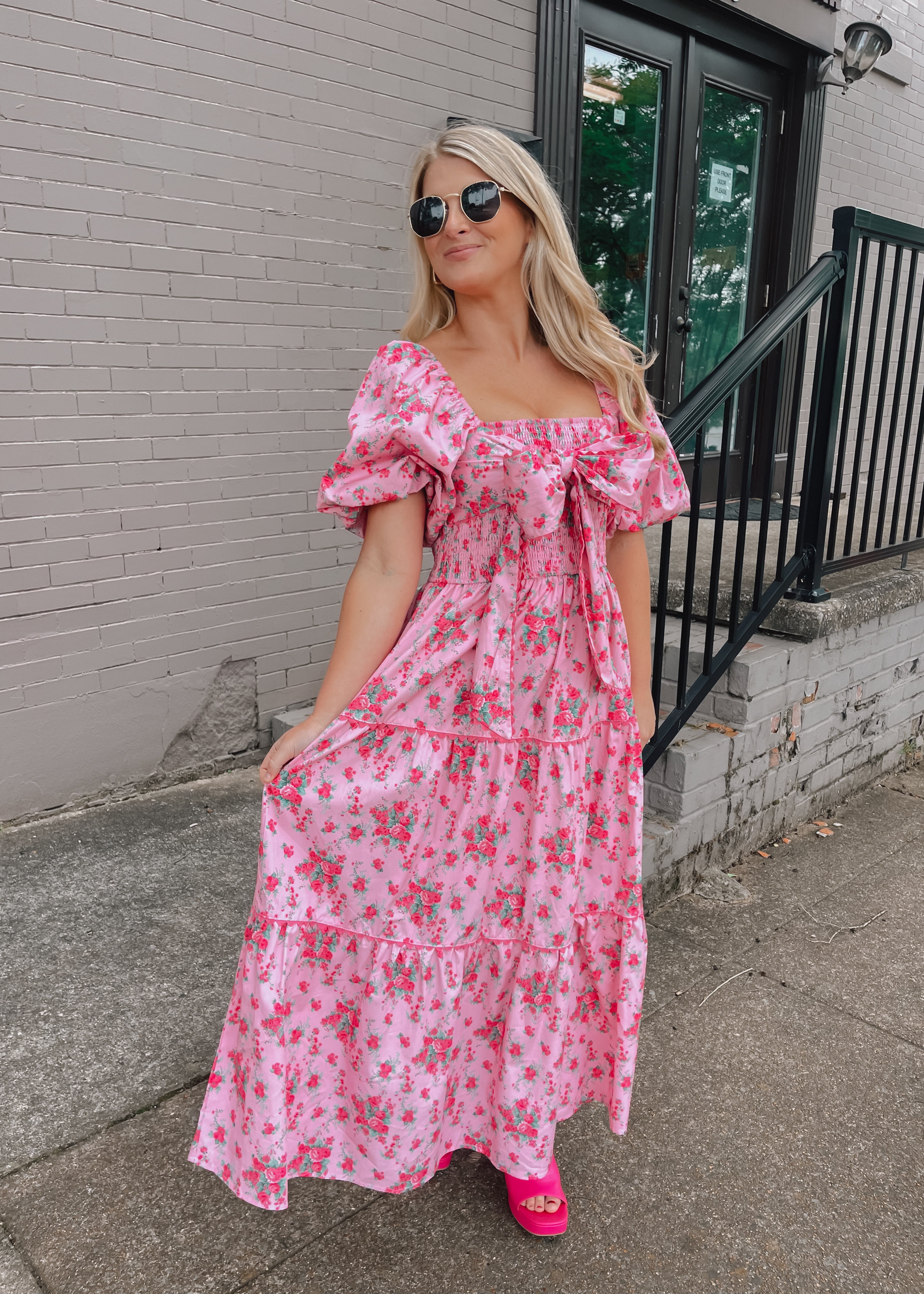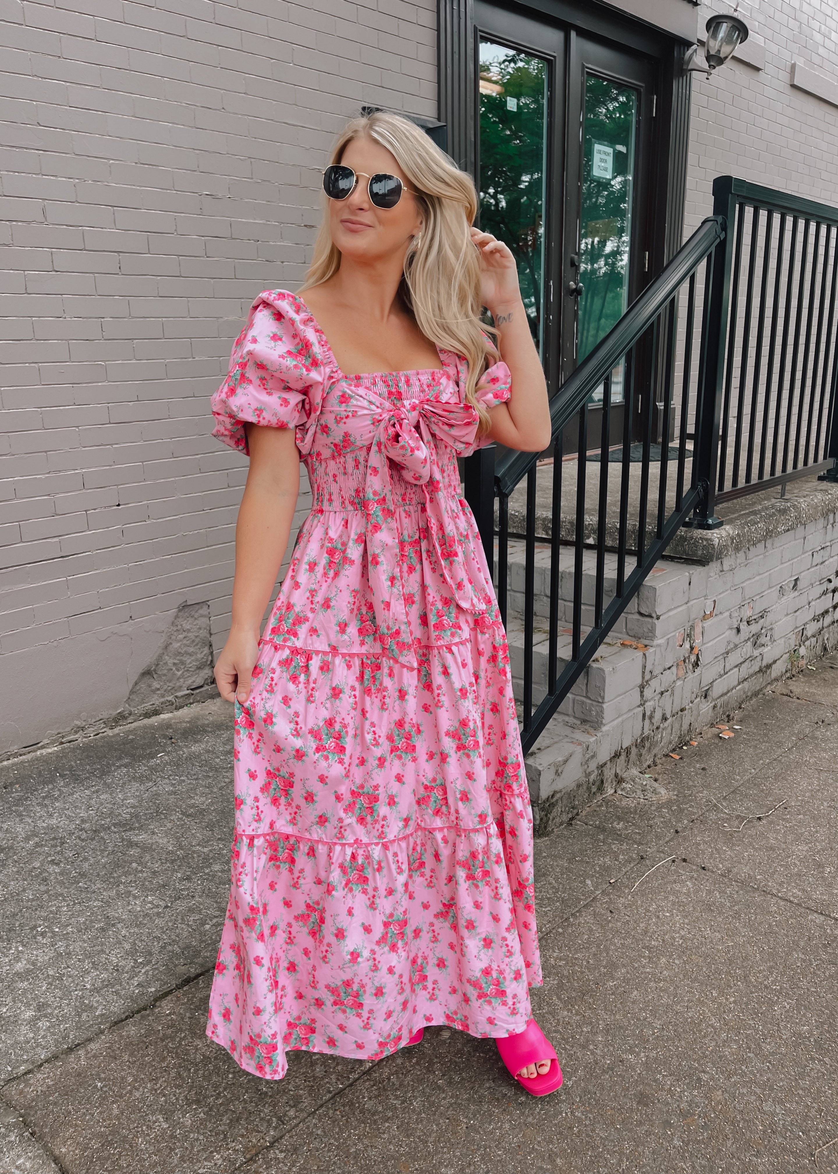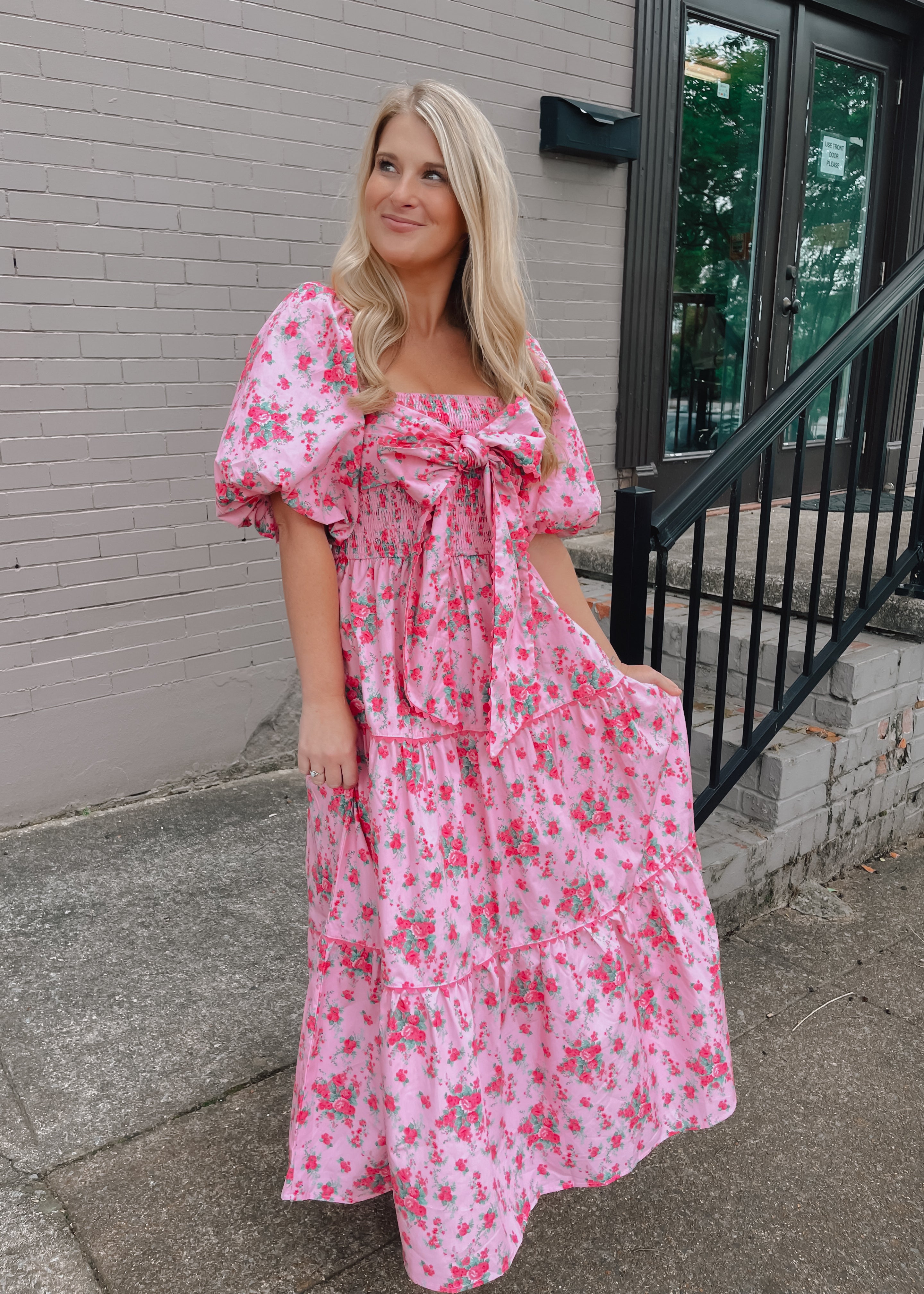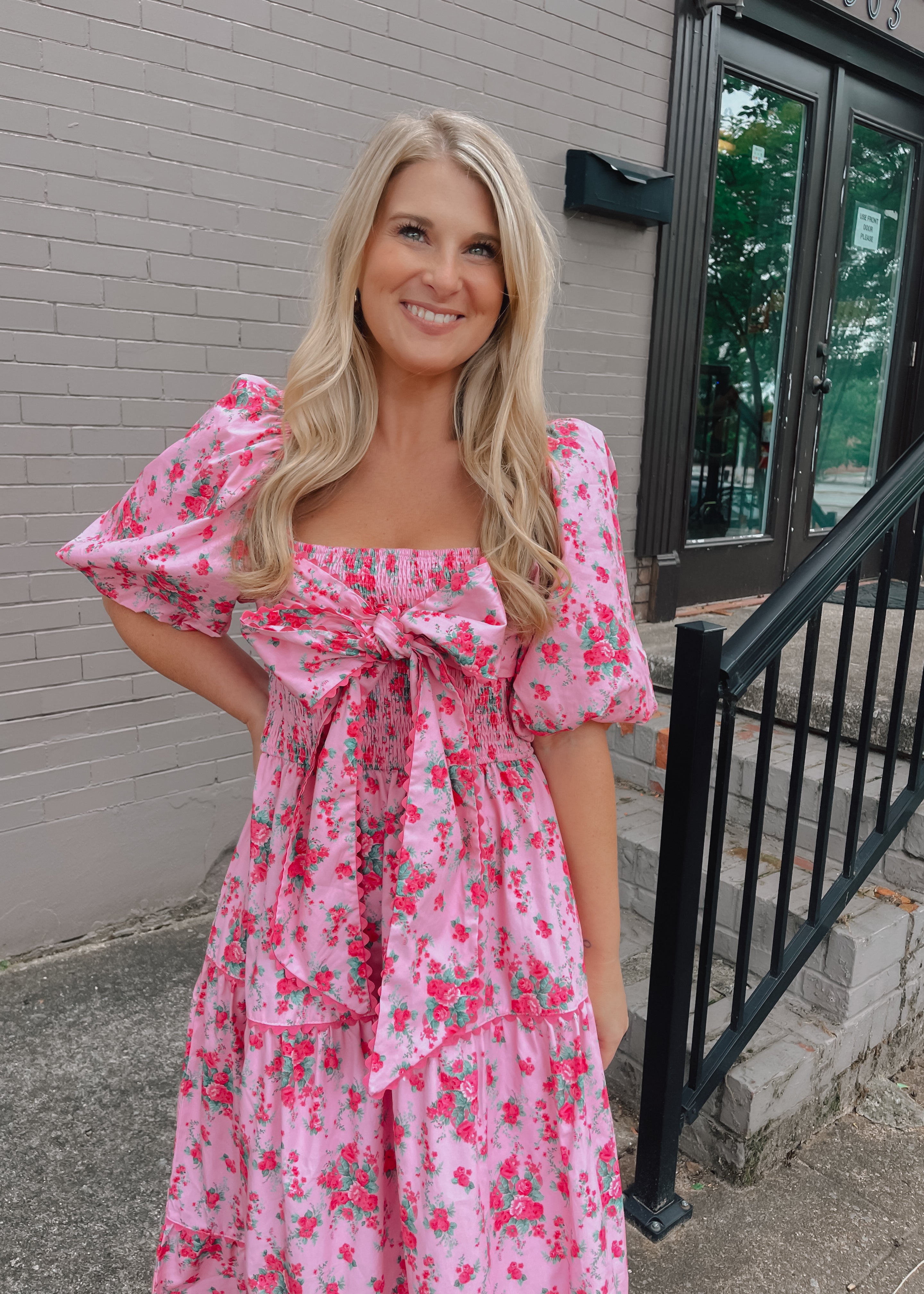 Step into full bloom with this pink cotton poplin maxi dress featuring a vibrant floral print, front bow detail, and short bubble sleeves. Embrace effortless elegance and feel like a free-spirited goddess in this flattering, flowy piece. Perfect for any occasion, this dress will add a touch of beauty and charm to your wardrobe.