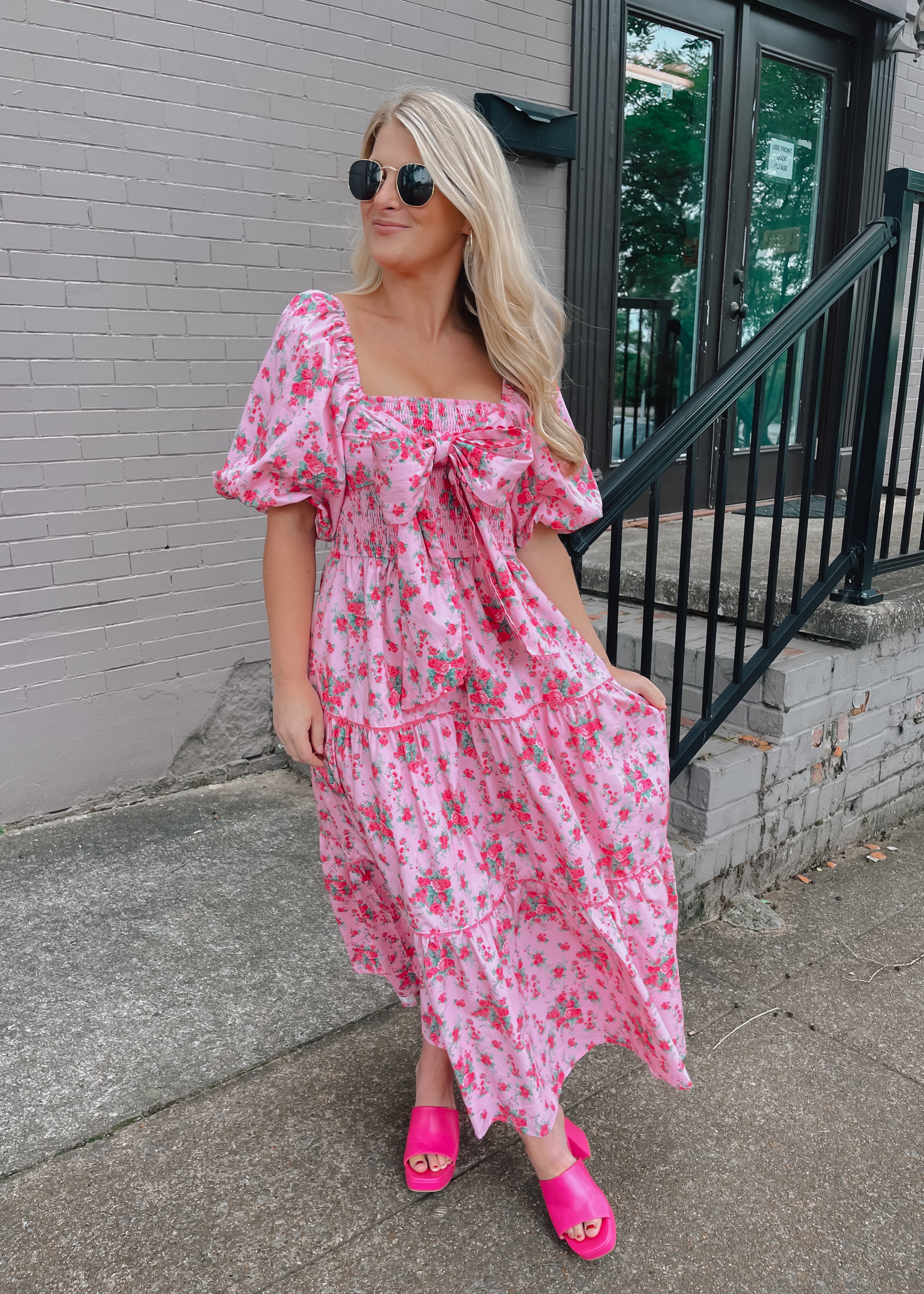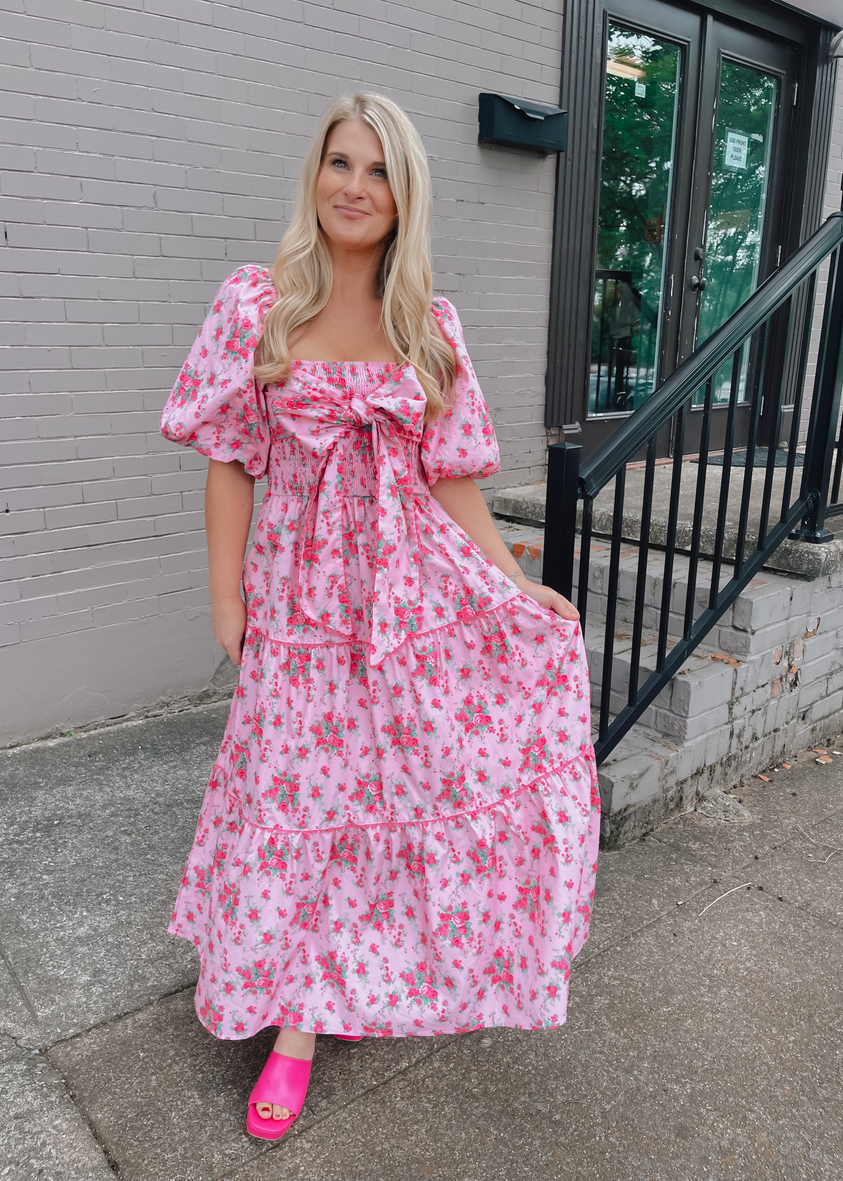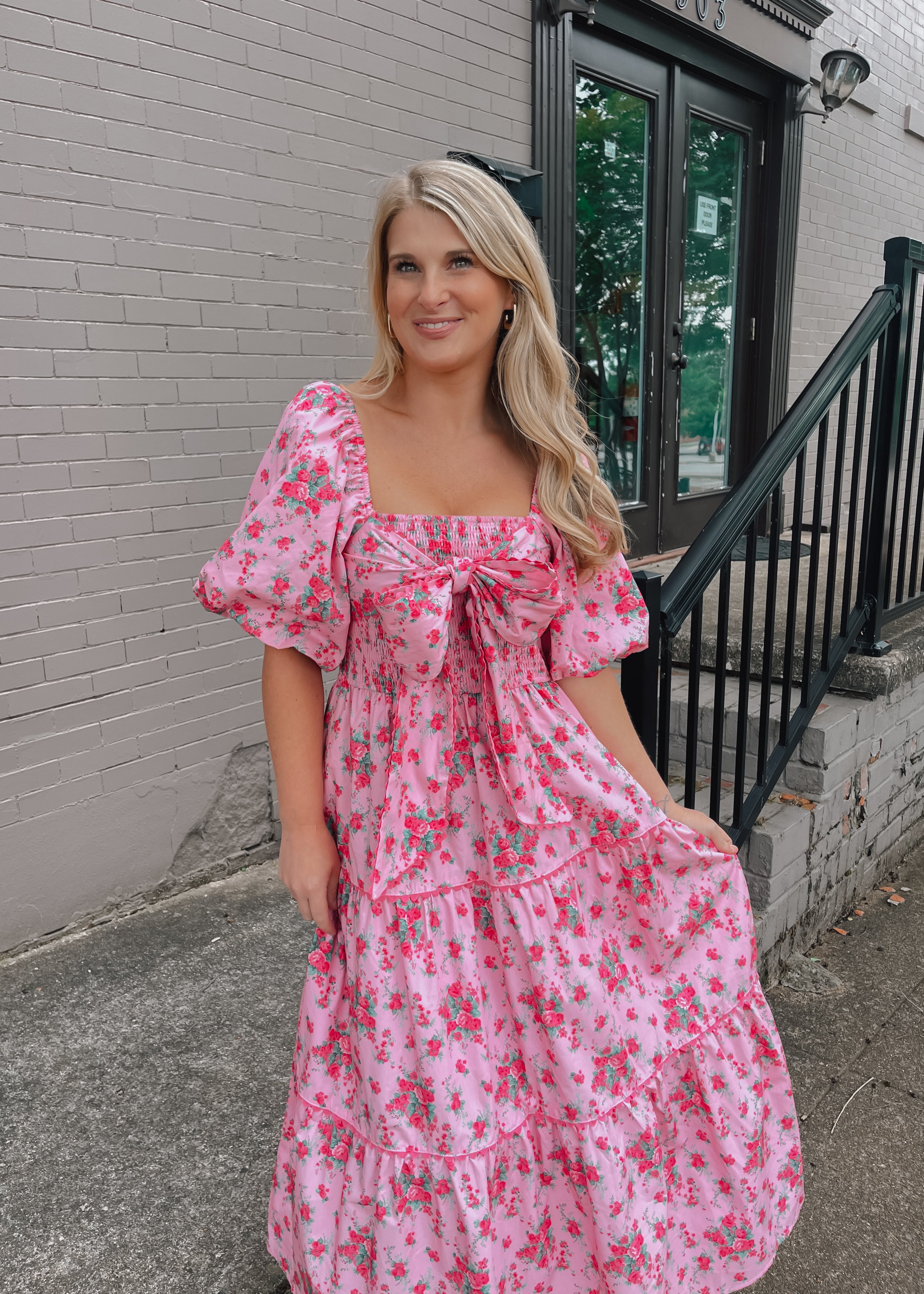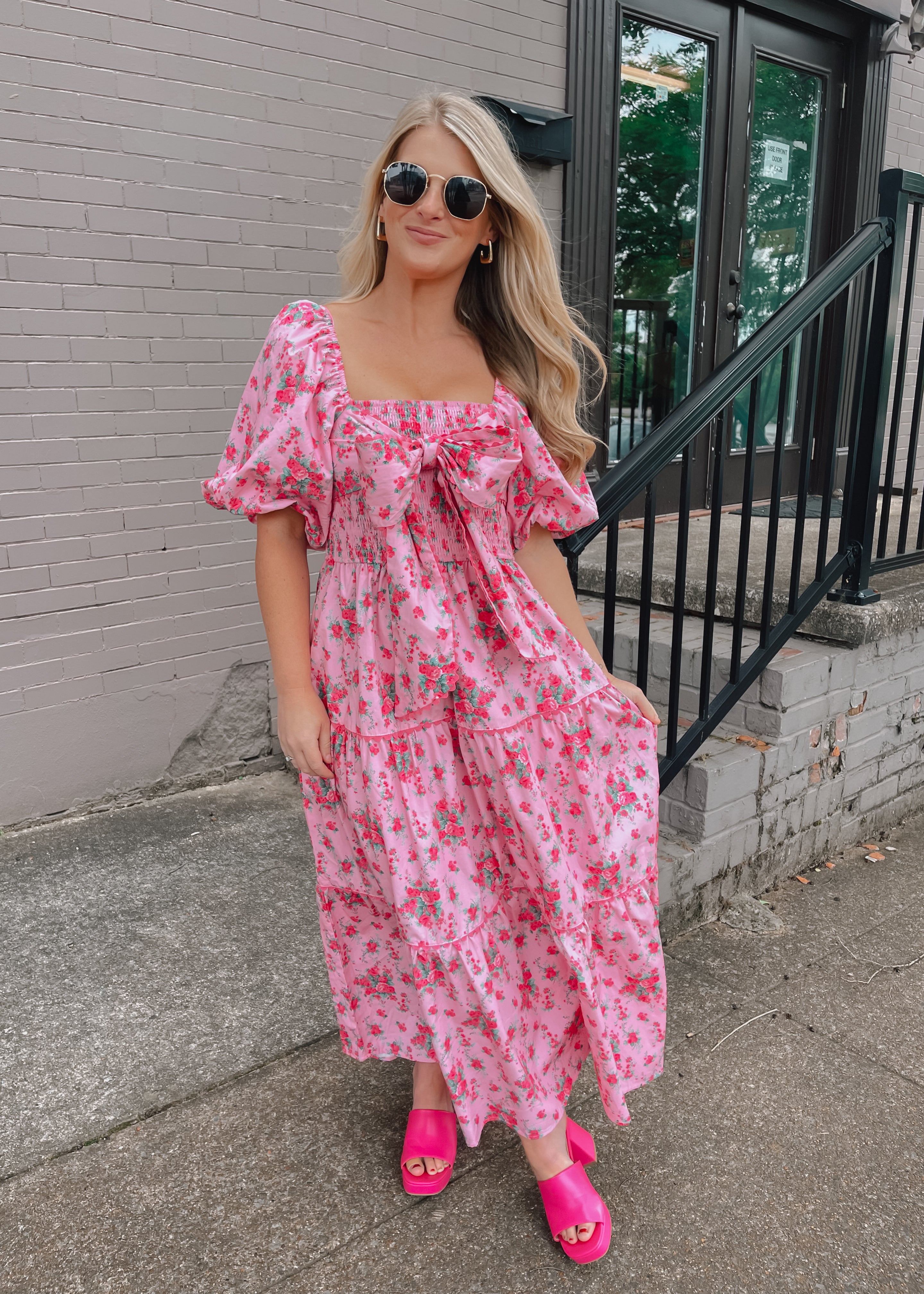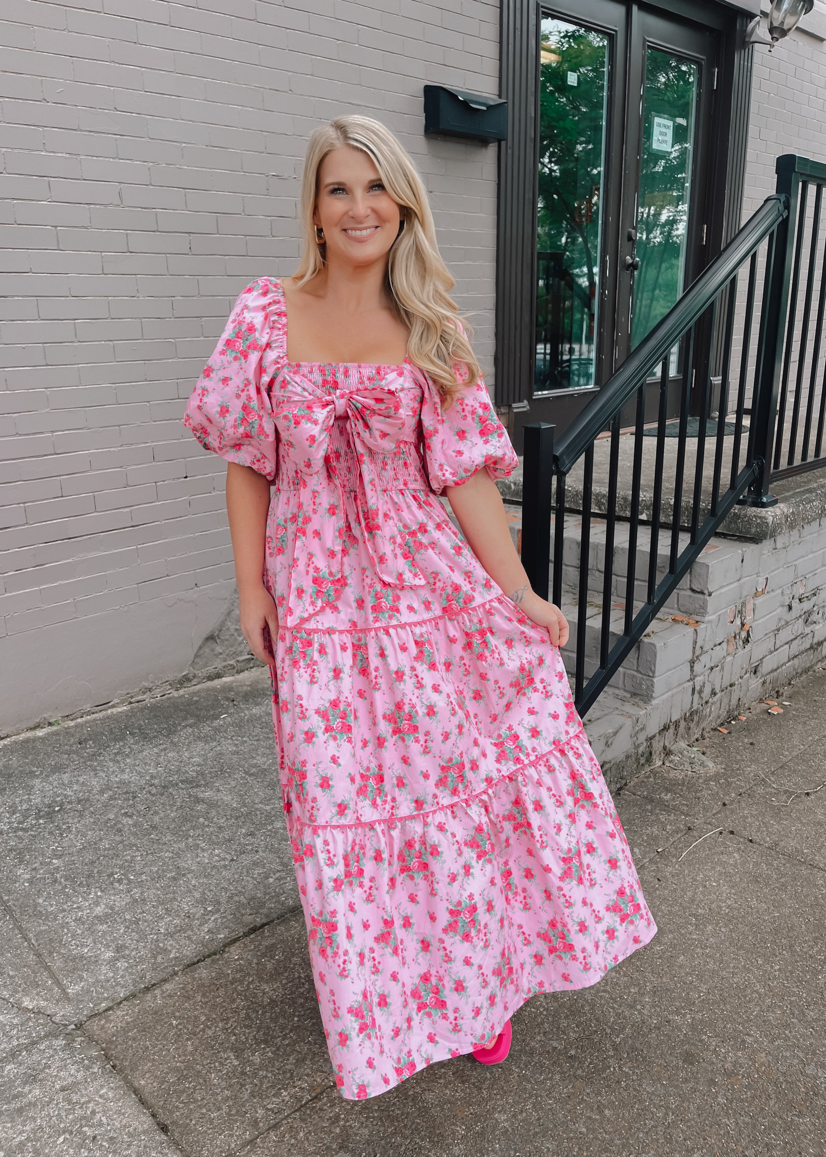 Step into full bloom with this pink cotton poplin maxi dress featuring a vibrant floral print, front bow detail, and short bubble sleeves. Embrace effortless elegance and feel like a free-spirited goddess in this flattering, flowy piece. Perfect for any occasion, this dress will add a touch of beauty and charm to your wardrobe.