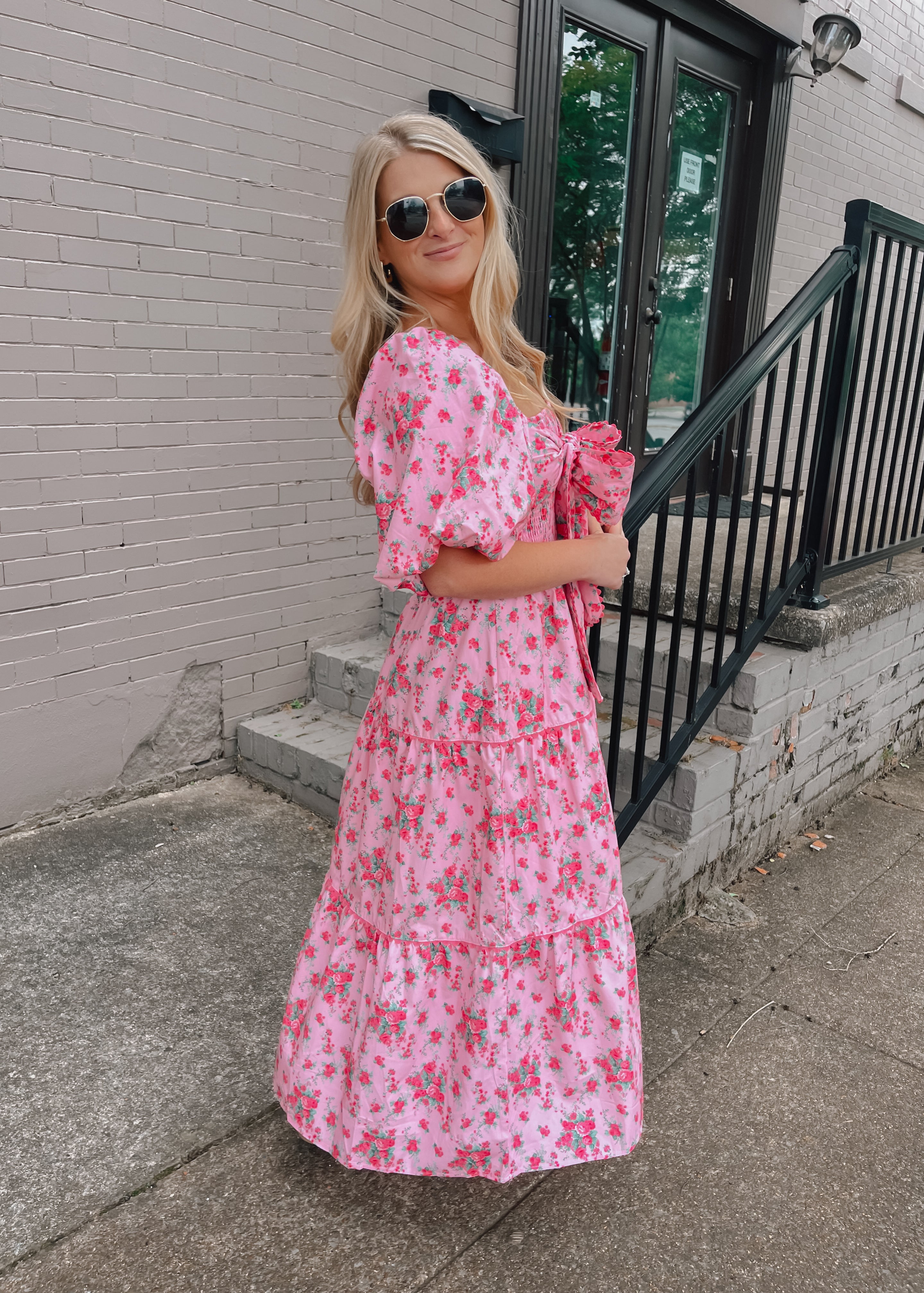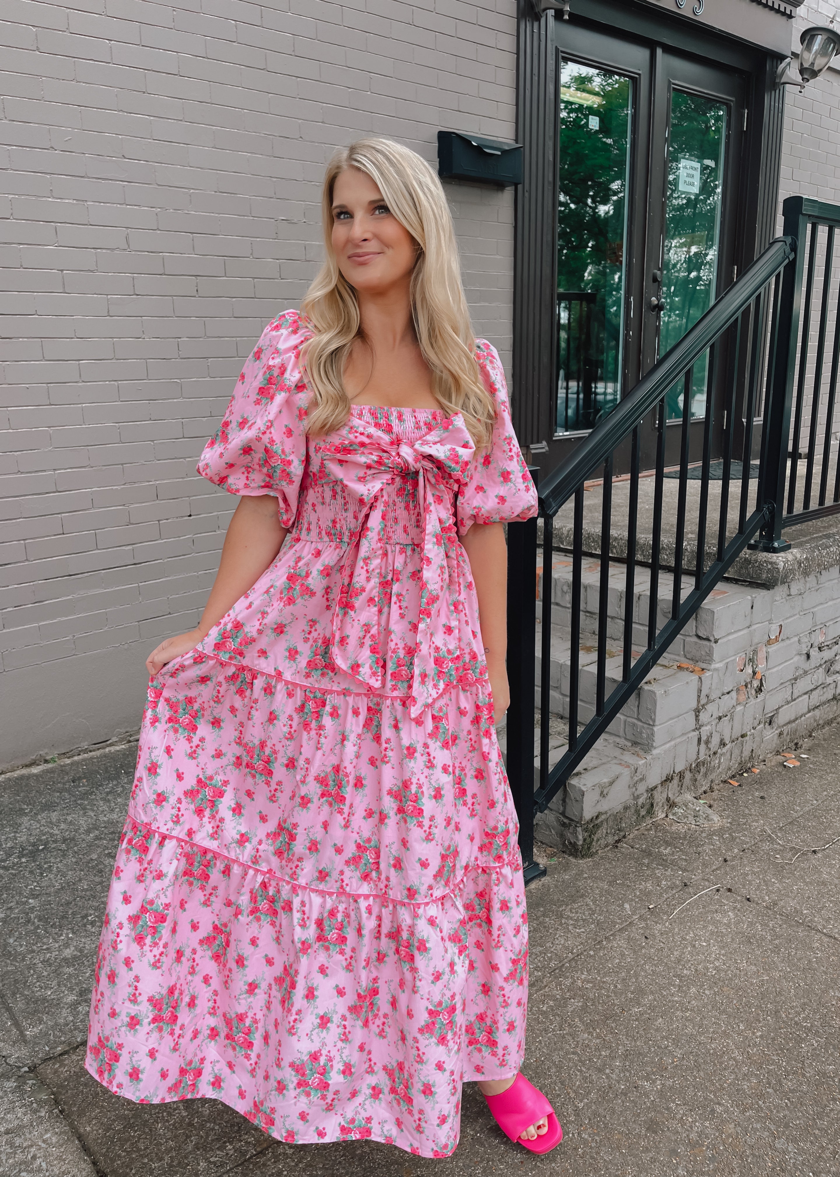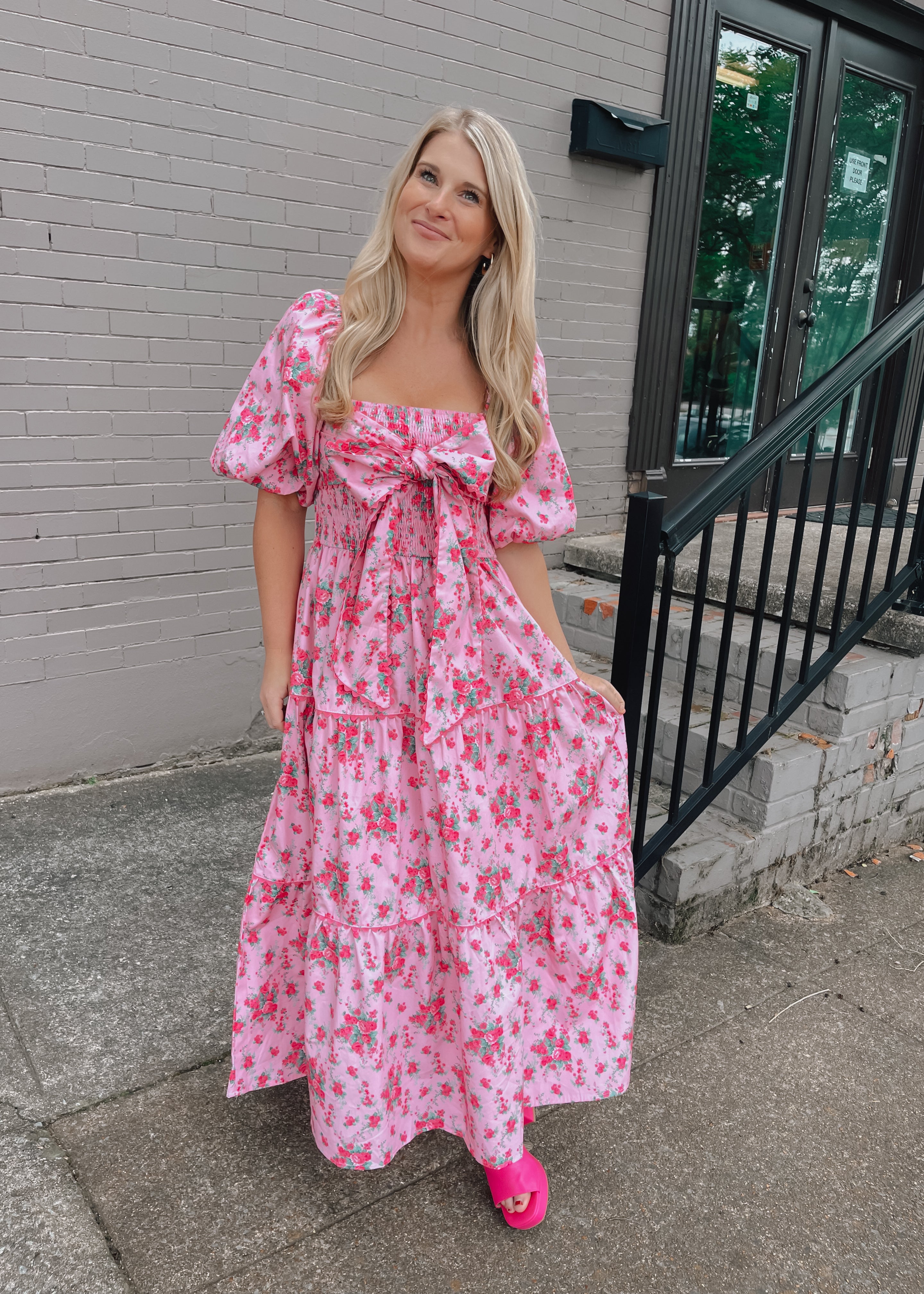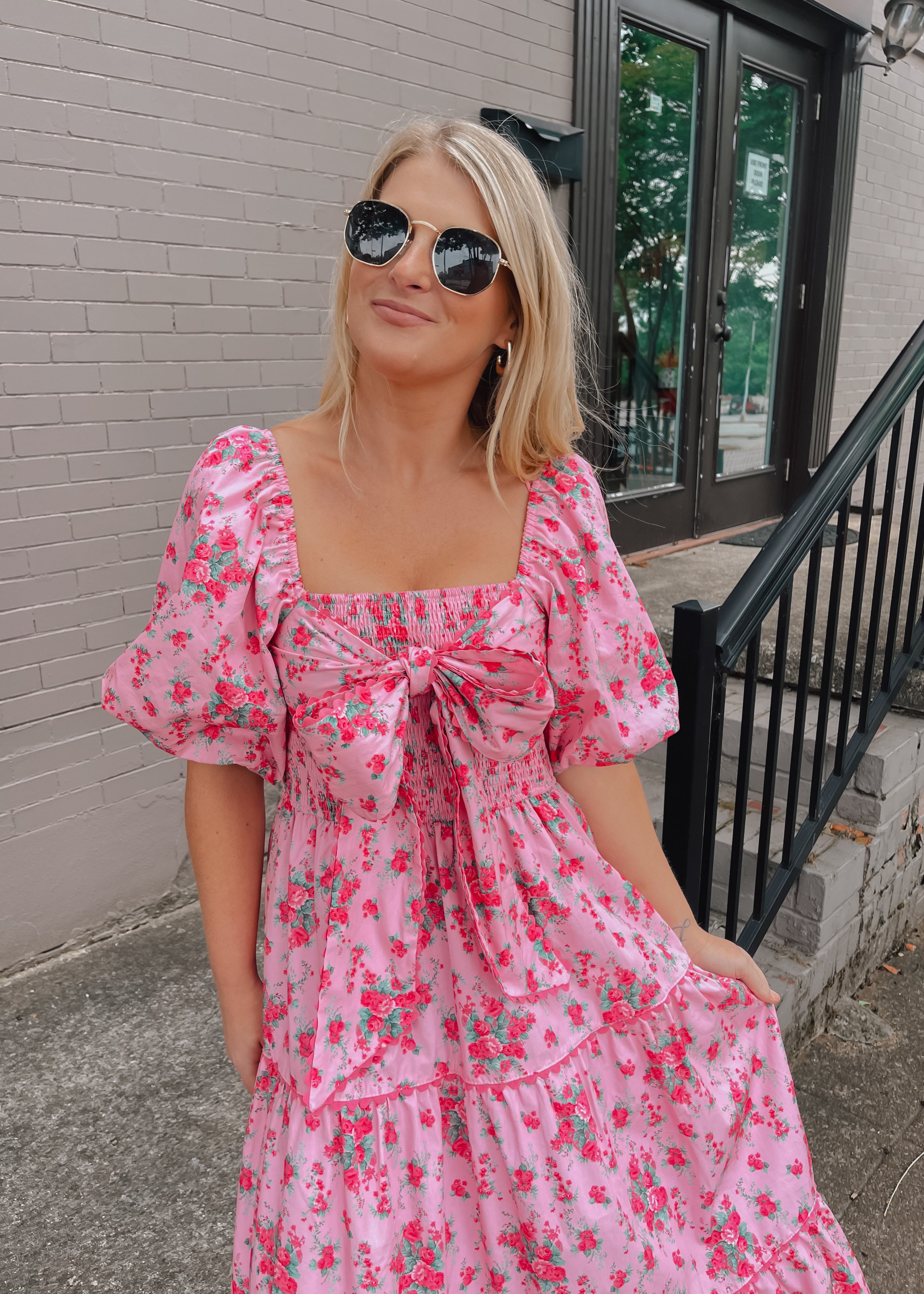 Step into full bloom with this pink cotton poplin maxi dress featuring a vibrant floral print, front bow detail, and short bubble sleeves. Embrace effortless elegance and feel like a free-spirited goddess in this flattering, flowy piece. Perfect for any occasion, this dress will add a touch of beauty and charm to your wardrobe.