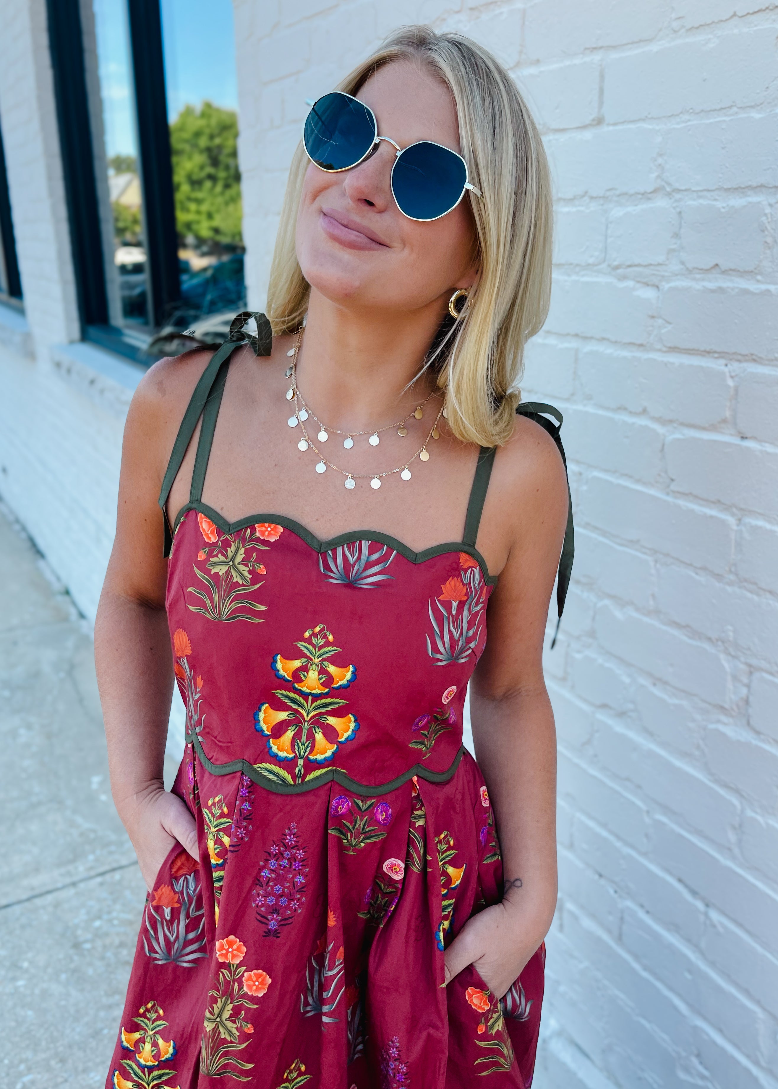 Elevate your wardrobe with the Live A Little Midi Dress, featuring adjustable tie straps for a perfect fit and a flattering smocked back. The wine-colored fabric is adorned with vibrant yellow, green, orange, and purple florals, contrasted beautifully by dark green scalloped trim and accents. This lined dress offers comfort and style with practical pockets and a distinctive separated top and skirt design highlighted by a delicate line. Perfect for any occasion, it effortlessly blends feminine charm with thoughtful details.