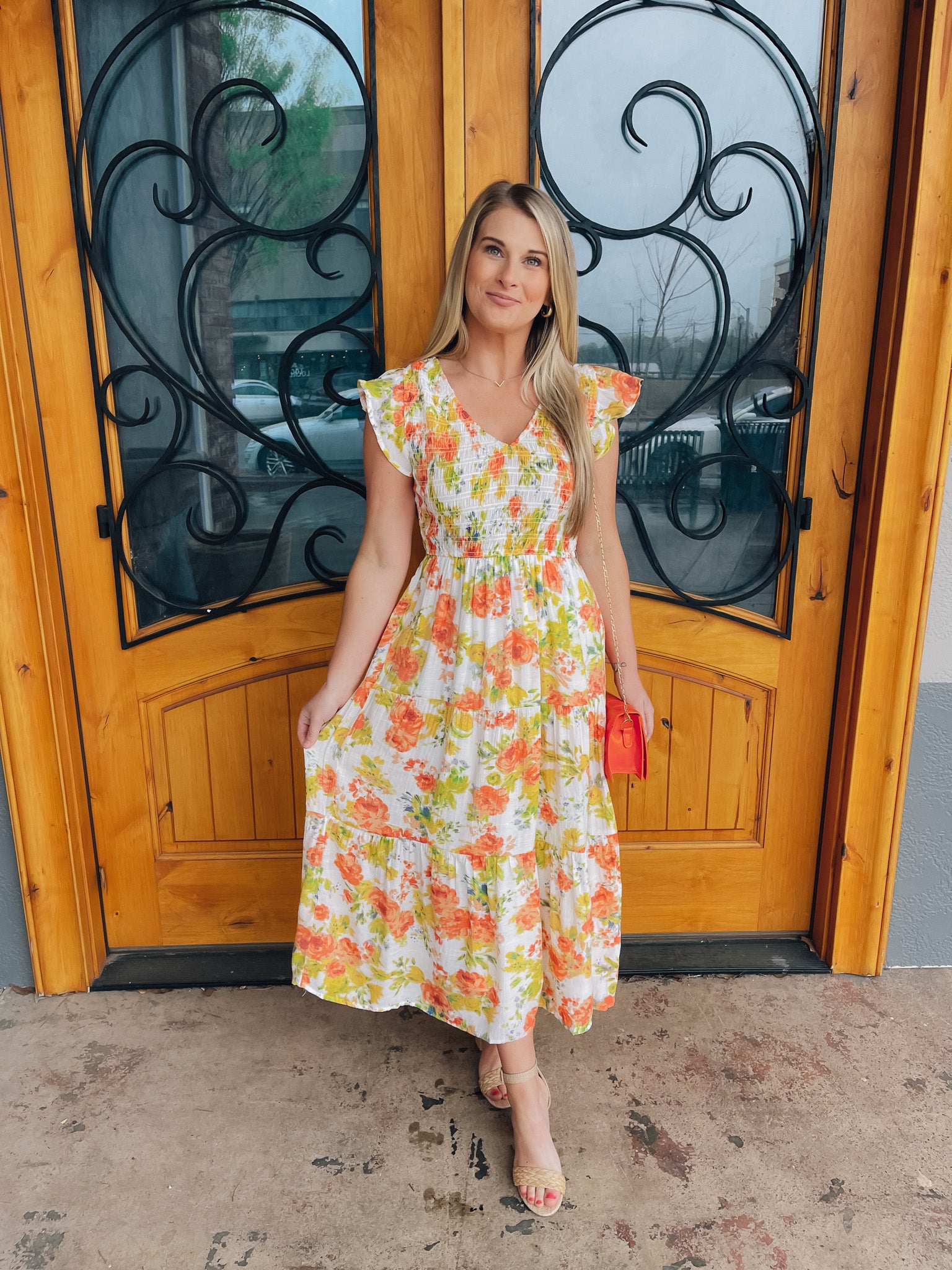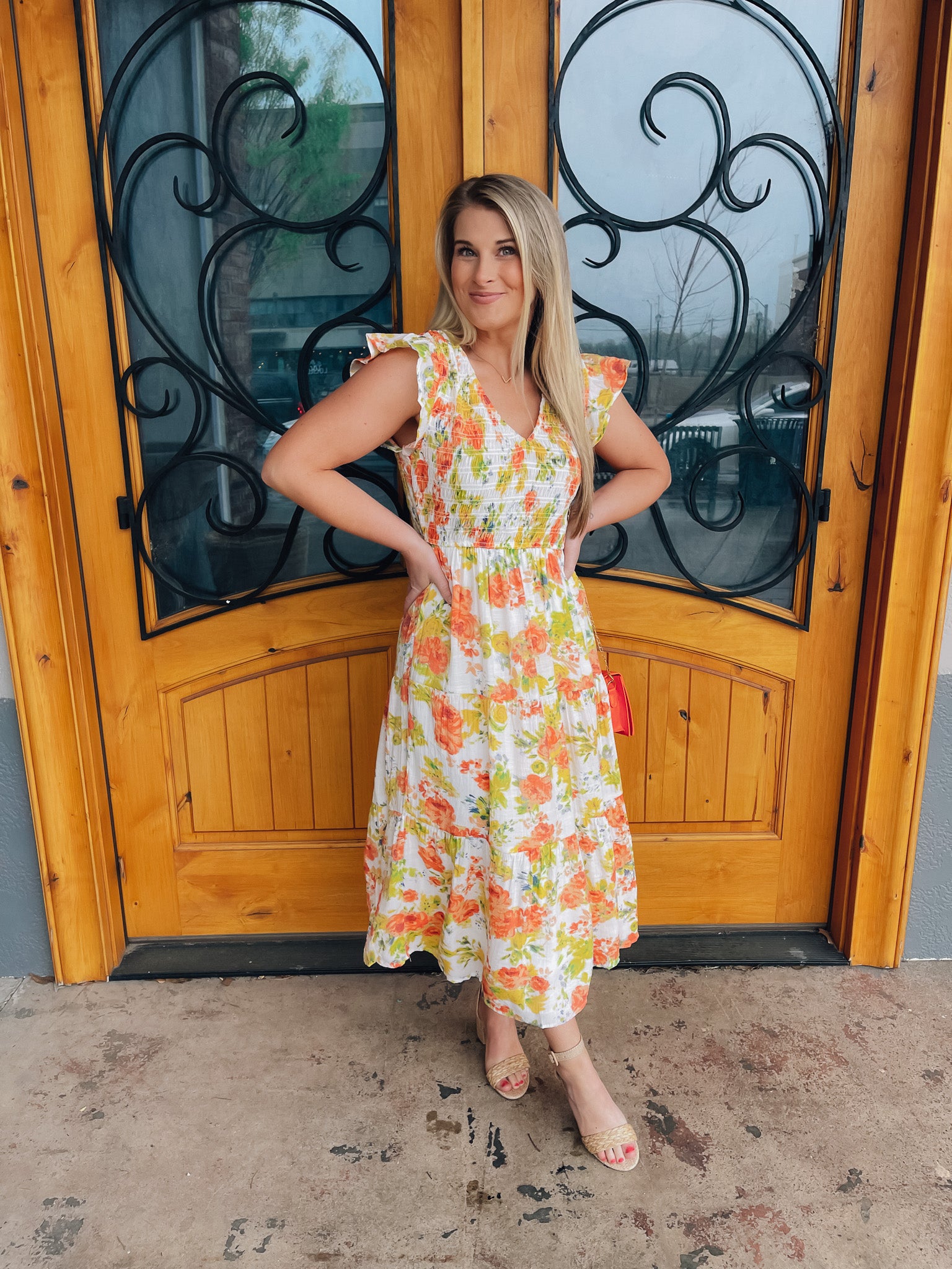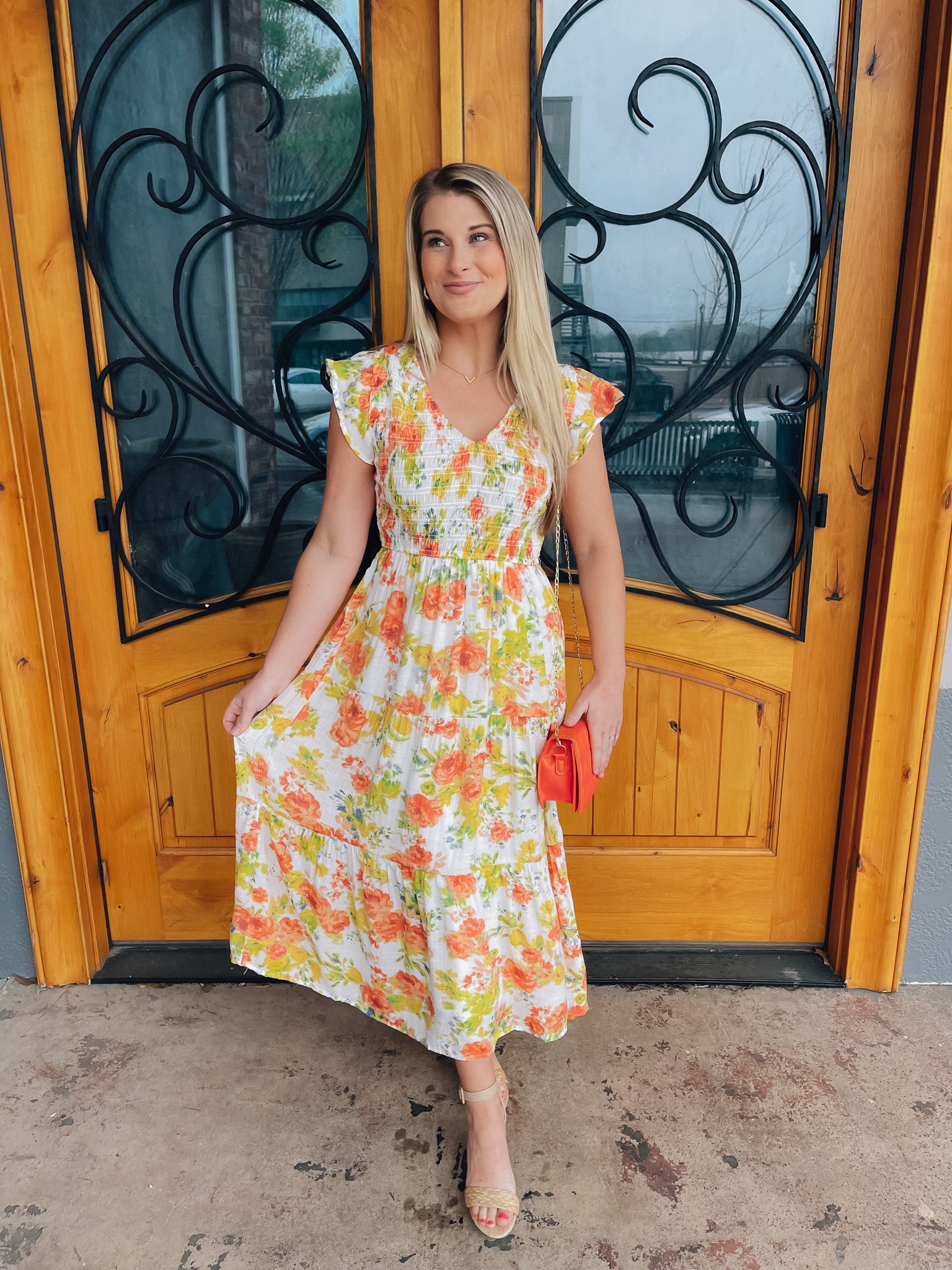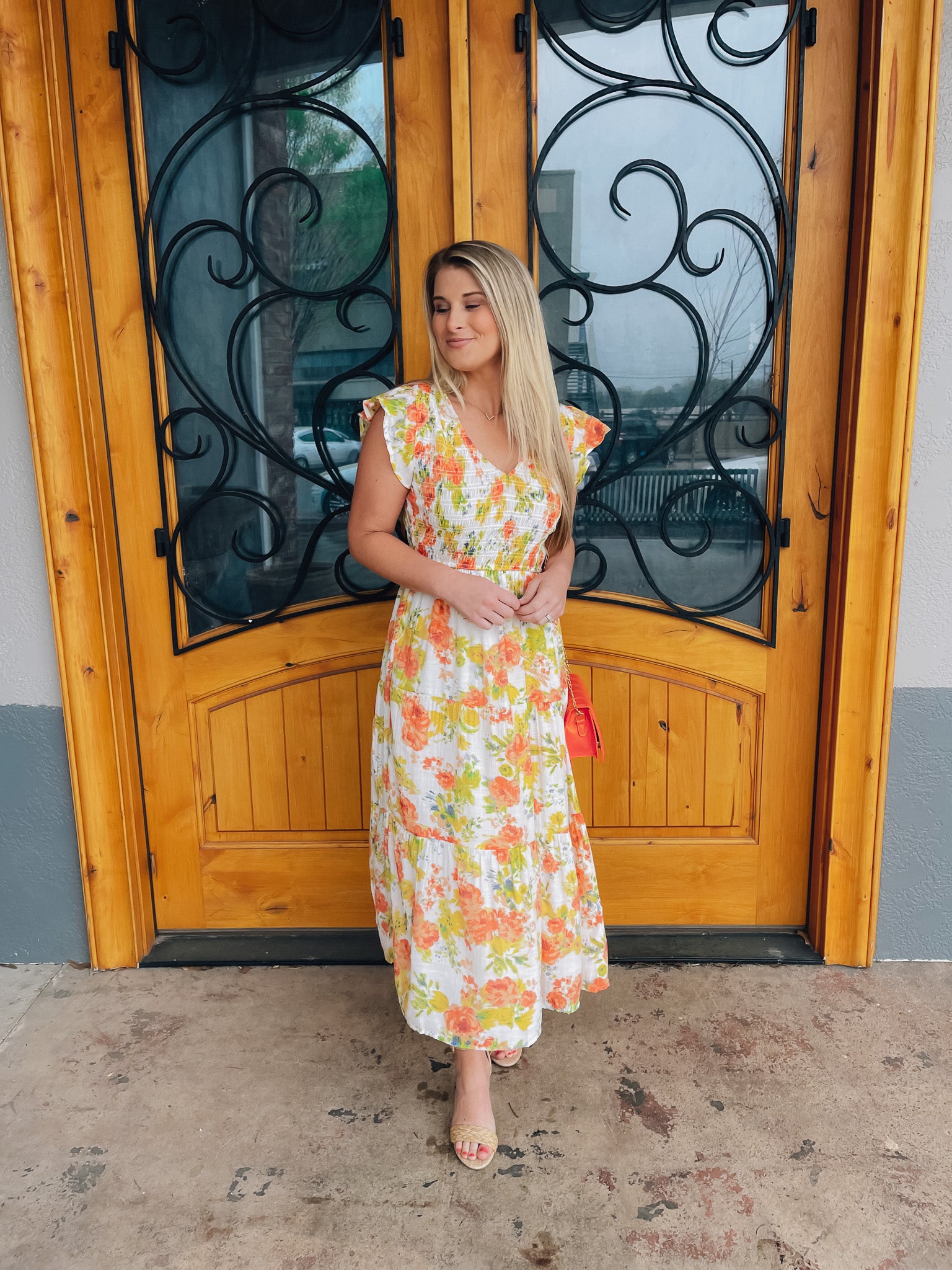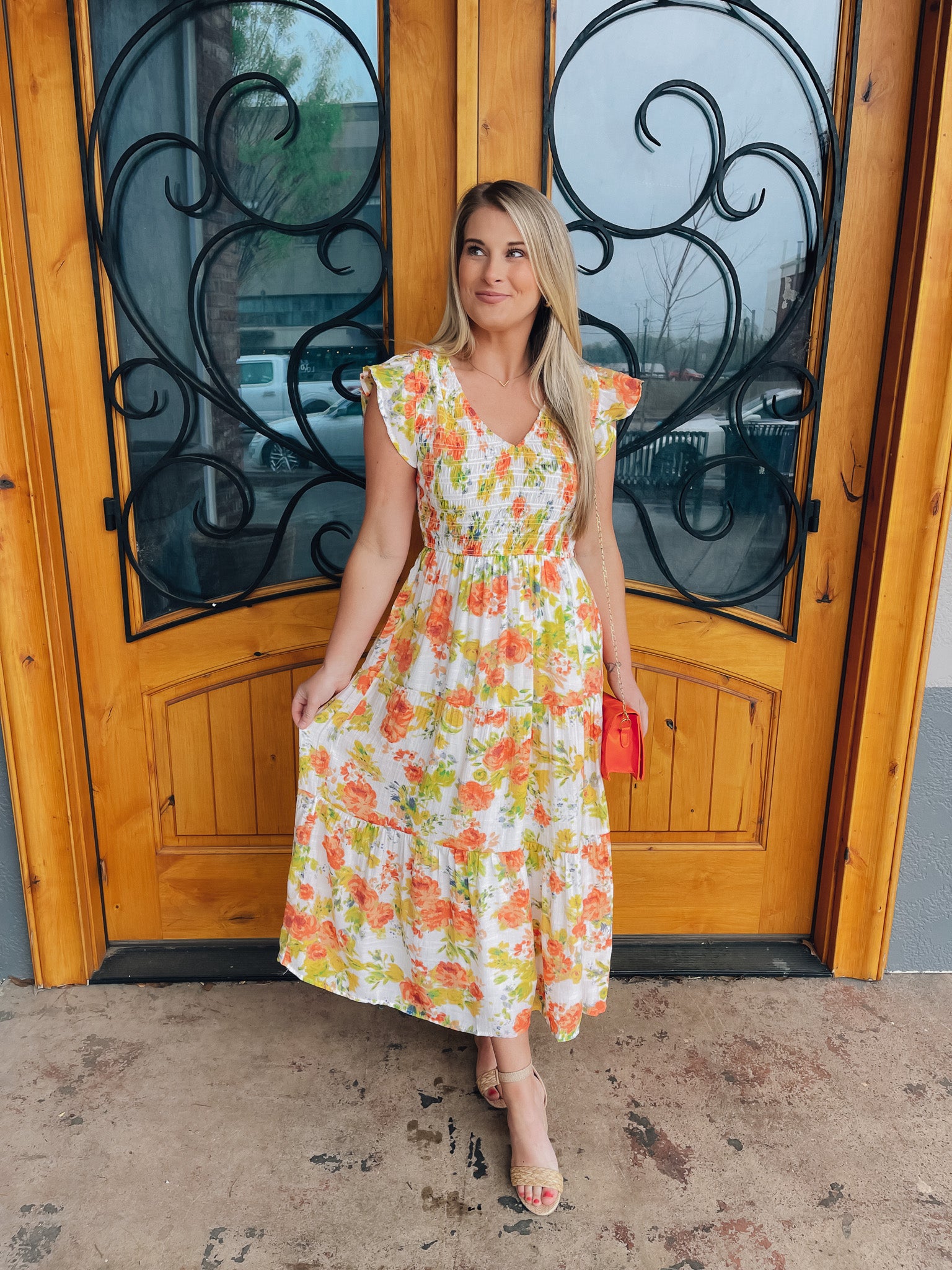 Experience the beauty of nature in our Love Grows Here Midi Dress. The v neck and flutter sleeves add a touch of femininity, while the yellow and orange floral print on an ivory background brings a vibrant burst of color. Perfect for any occasion, this midi dress is sure to make you feel confident and stylish.