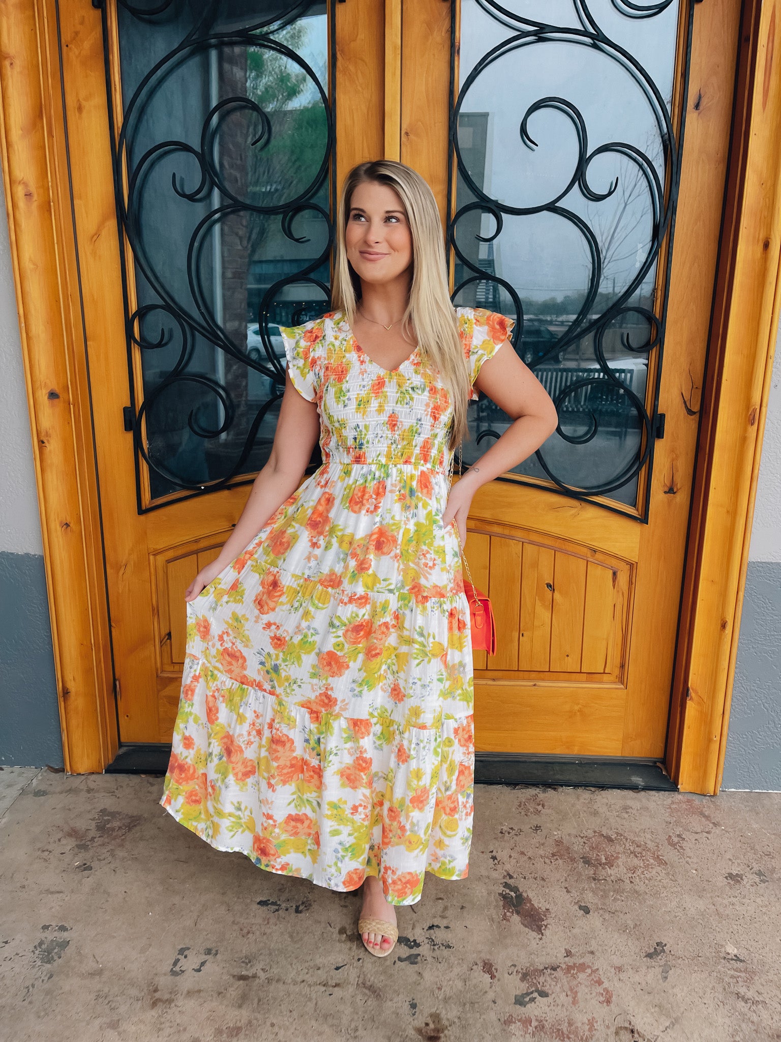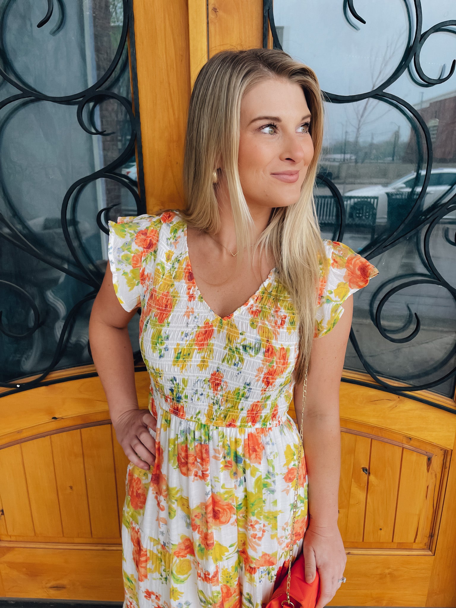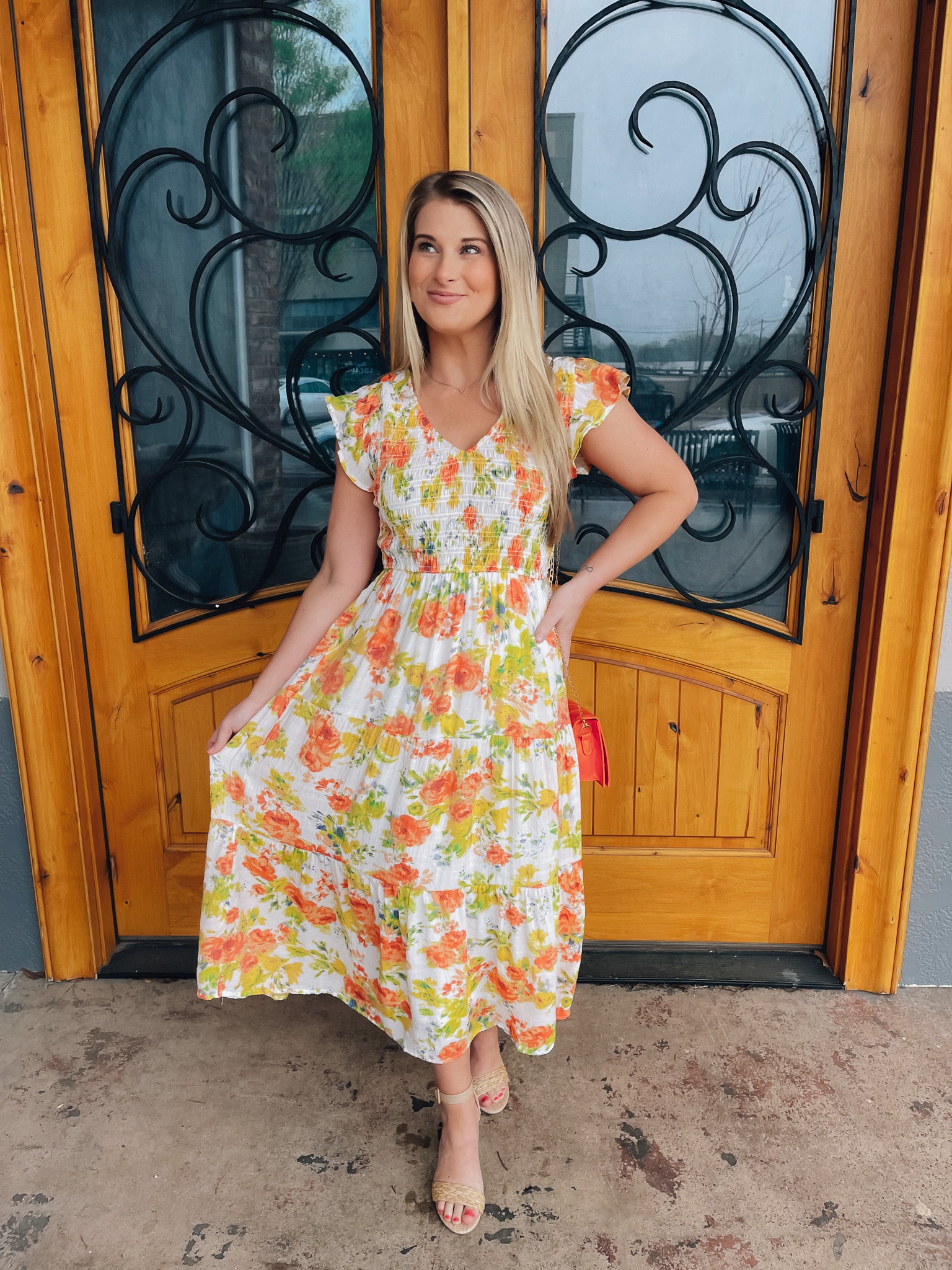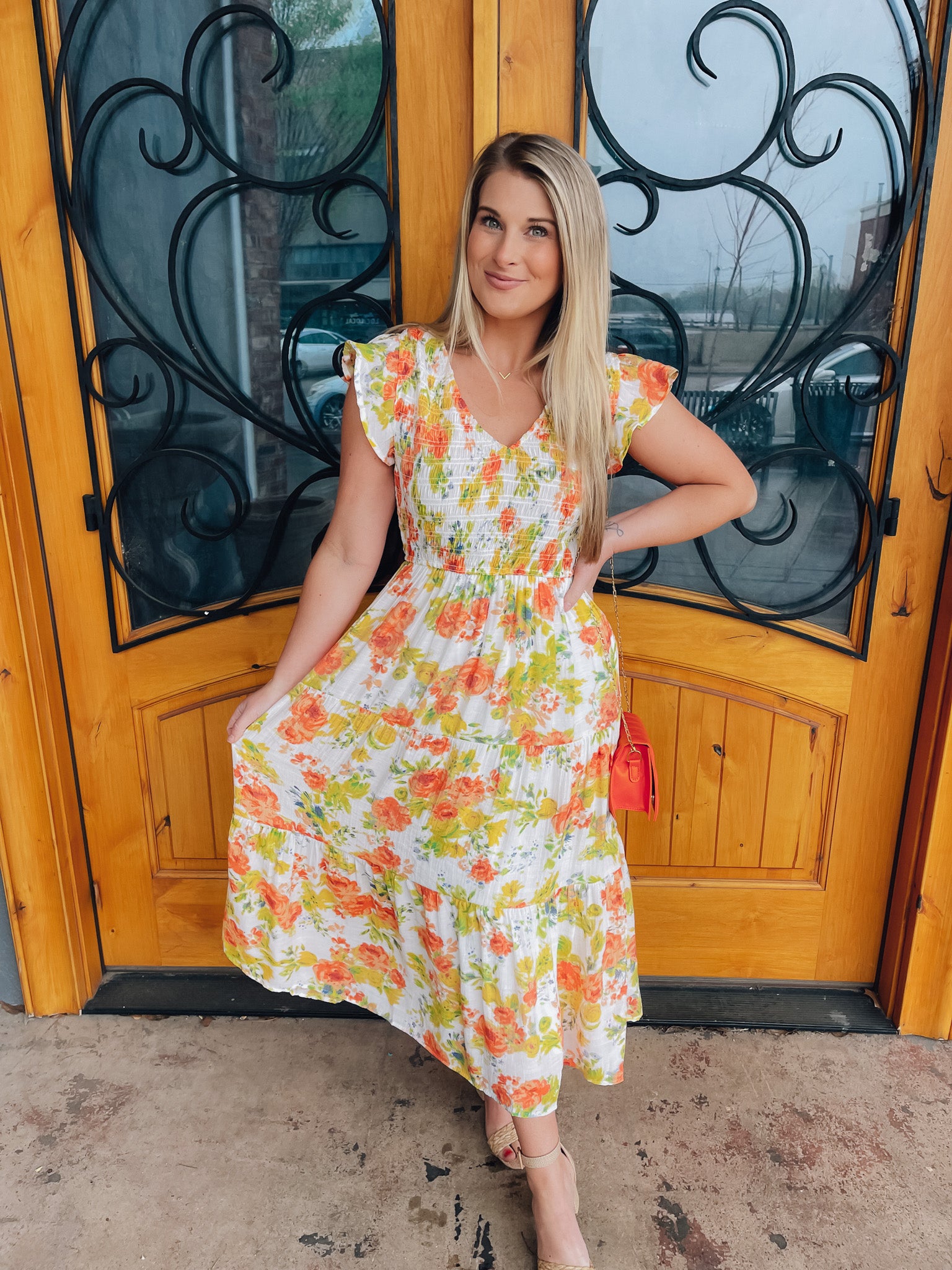 Experience the beauty of nature in our Love Grows Here Midi Dress. The v neck and flutter sleeves add a touch of femininity, while the yellow and orange floral print on an ivory background brings a vibrant burst of color. Perfect for any occasion, this midi dress is sure to make you feel confident and stylish.