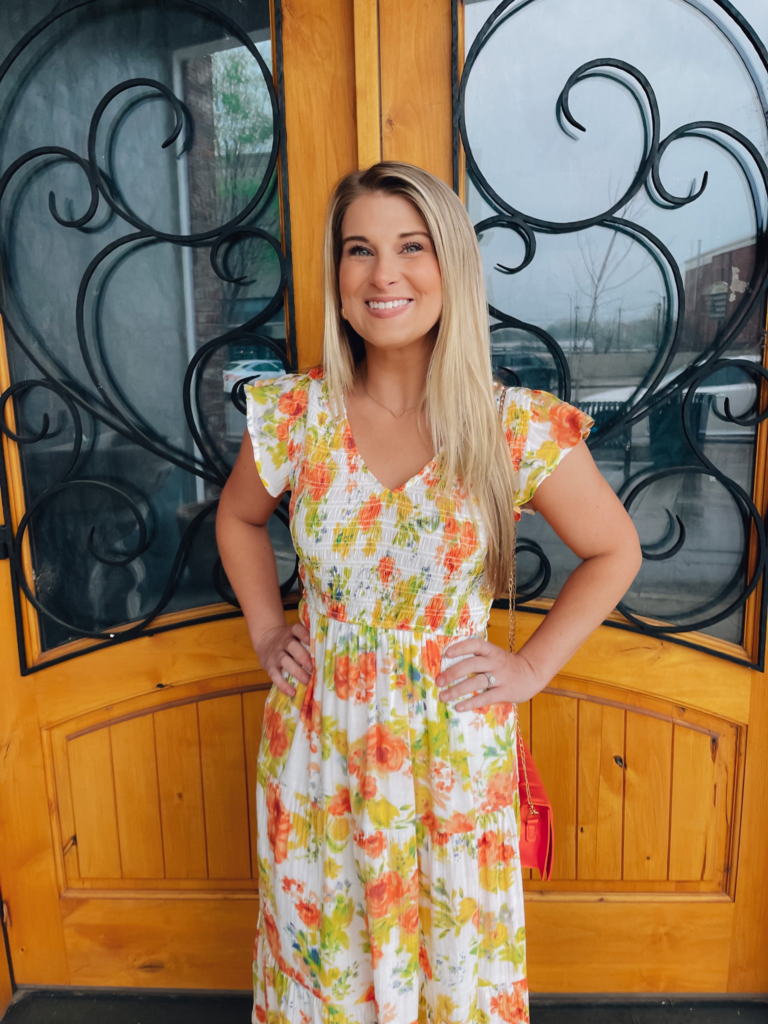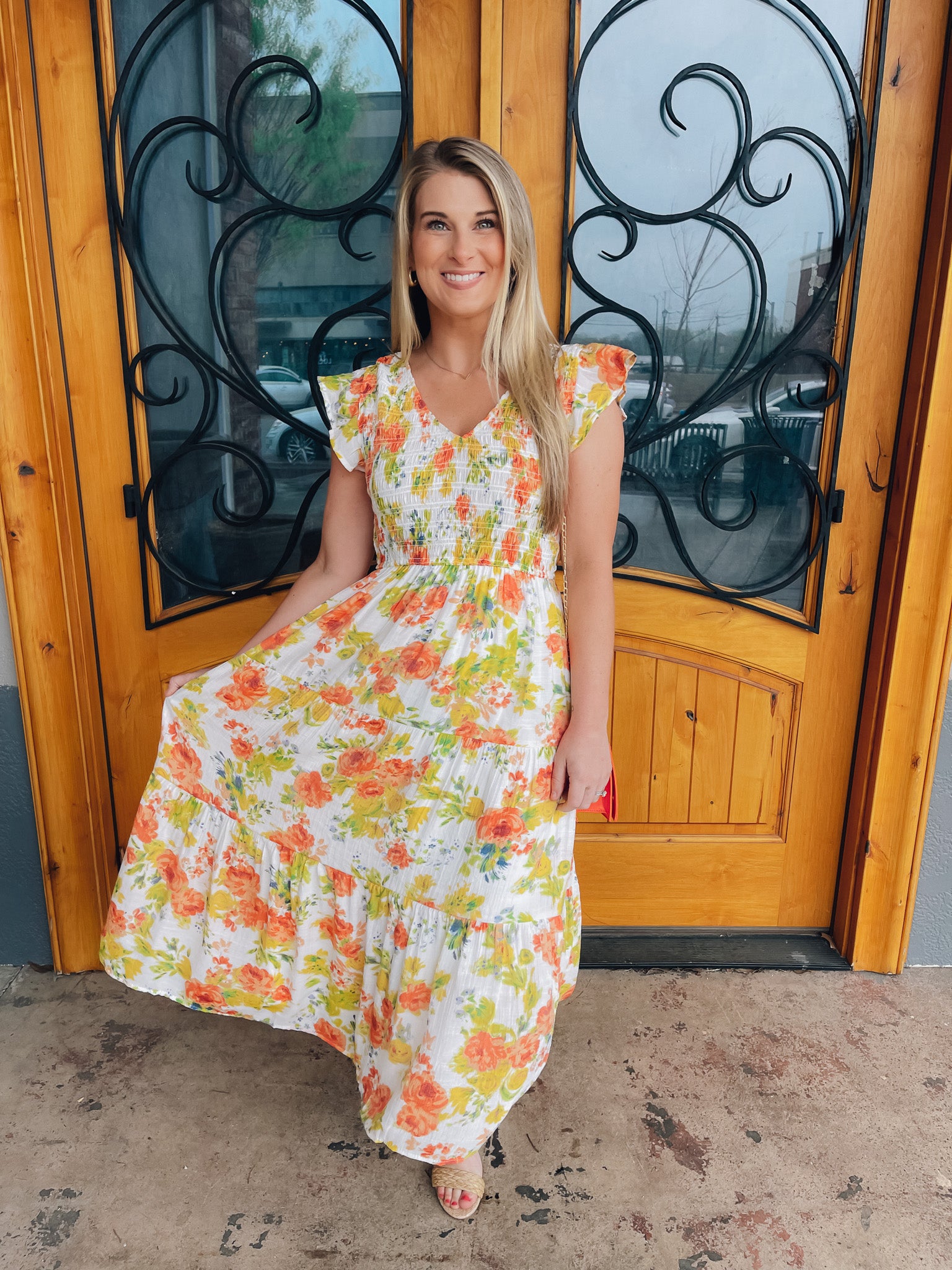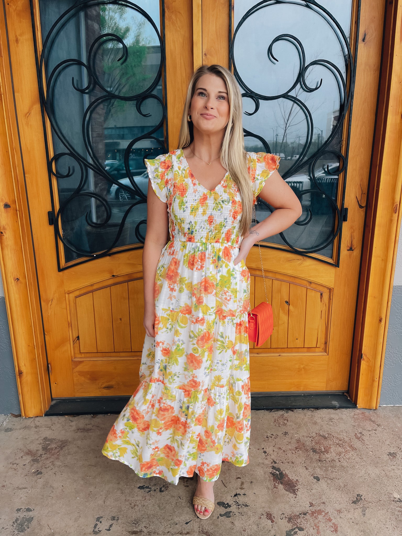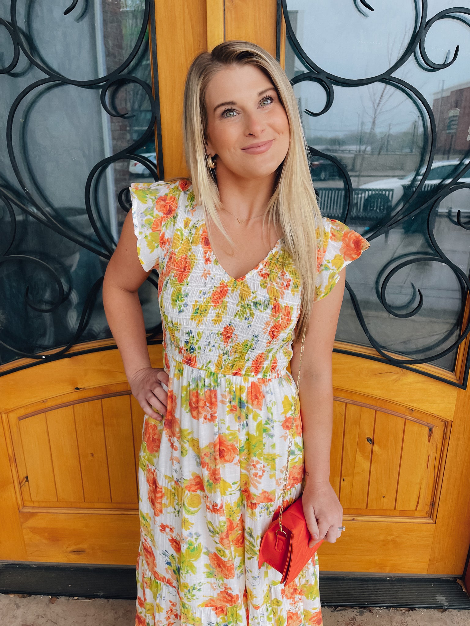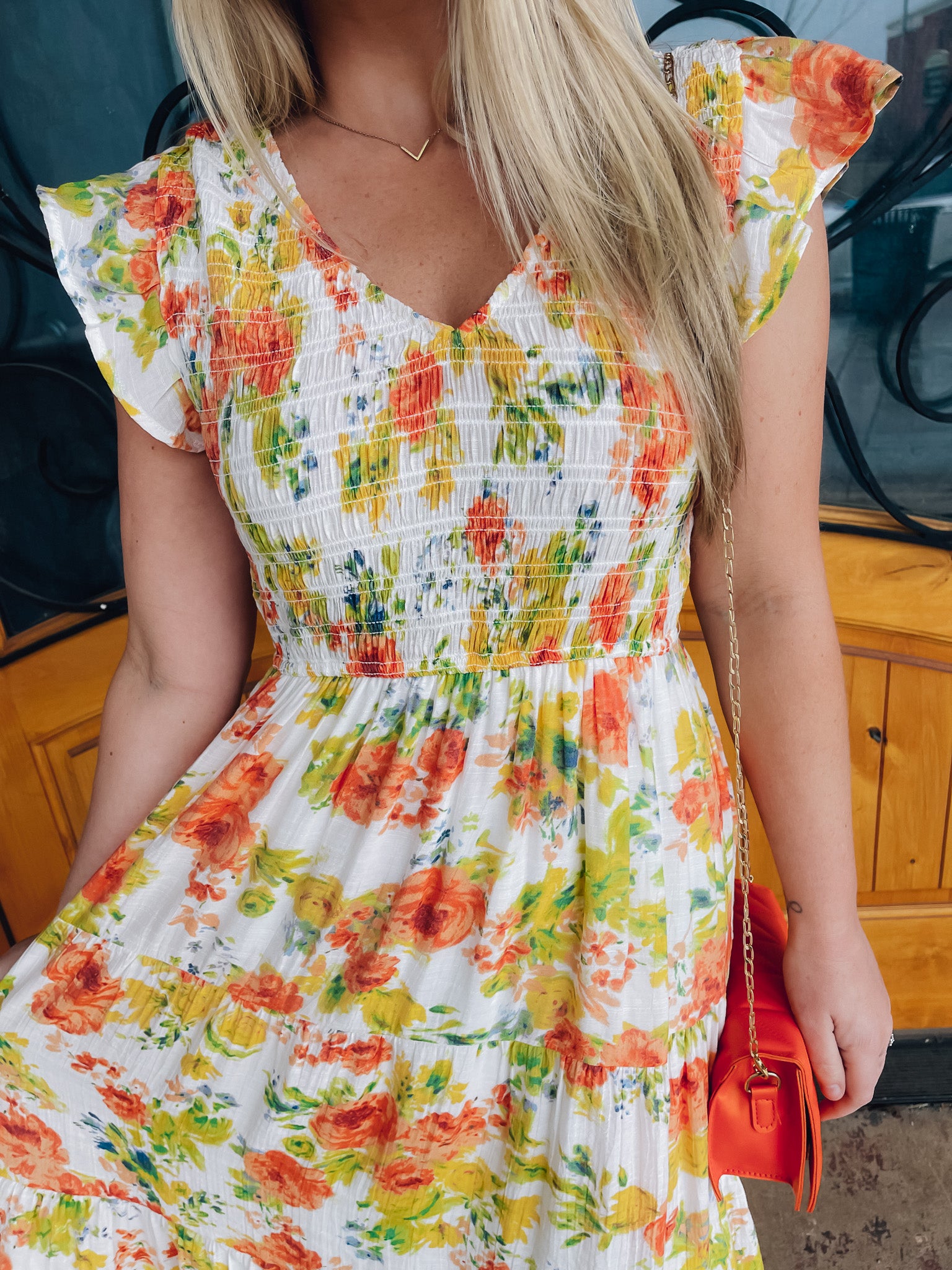Experience the beauty of nature in our Love Grows Here Midi Dress. The v neck and flutter sleeves add a touch of femininity, while the yellow and orange floral print on an ivory background brings a vibrant burst of color. Perfect for any occasion, this midi dress is sure to make you feel confident and stylish.