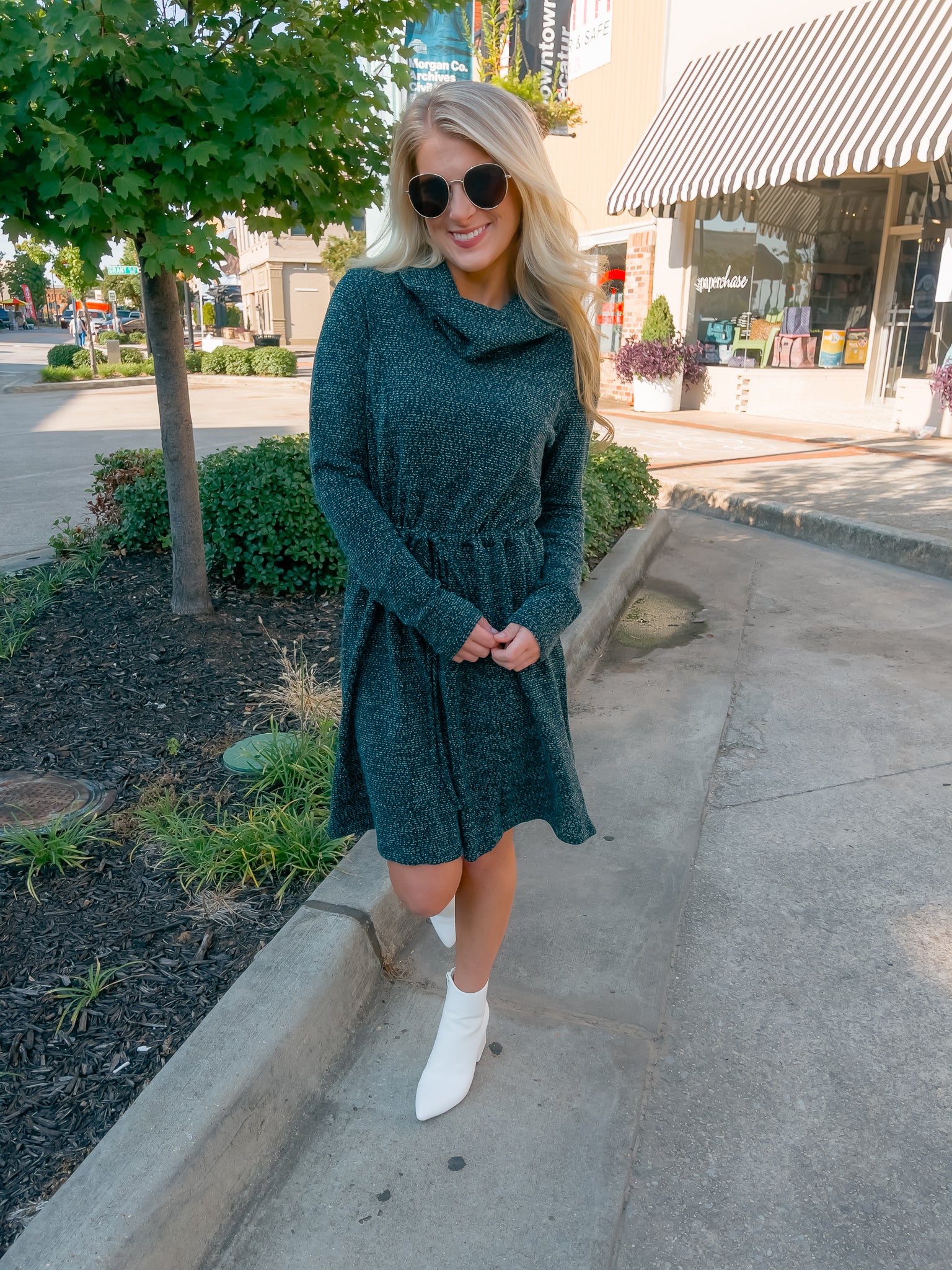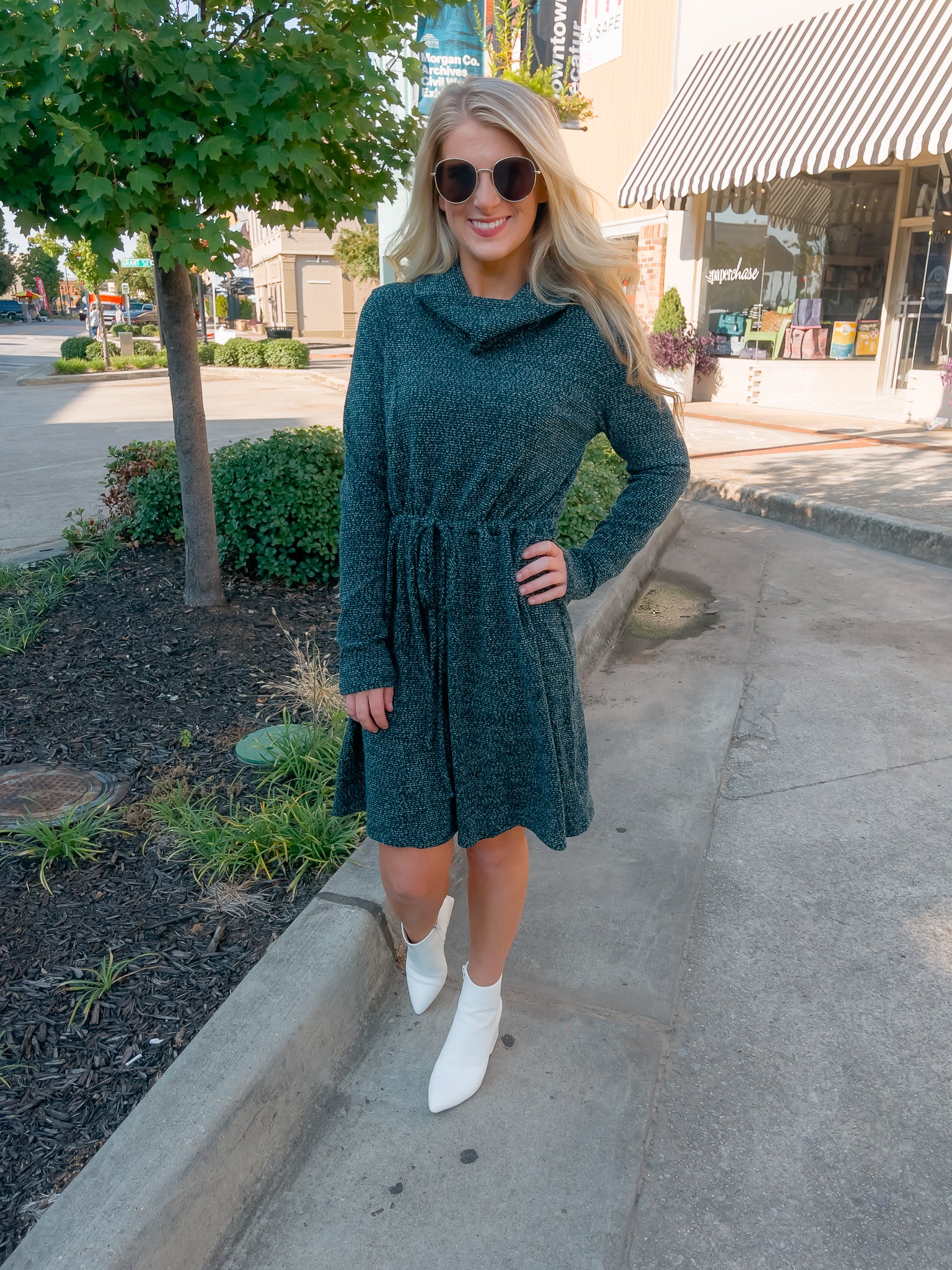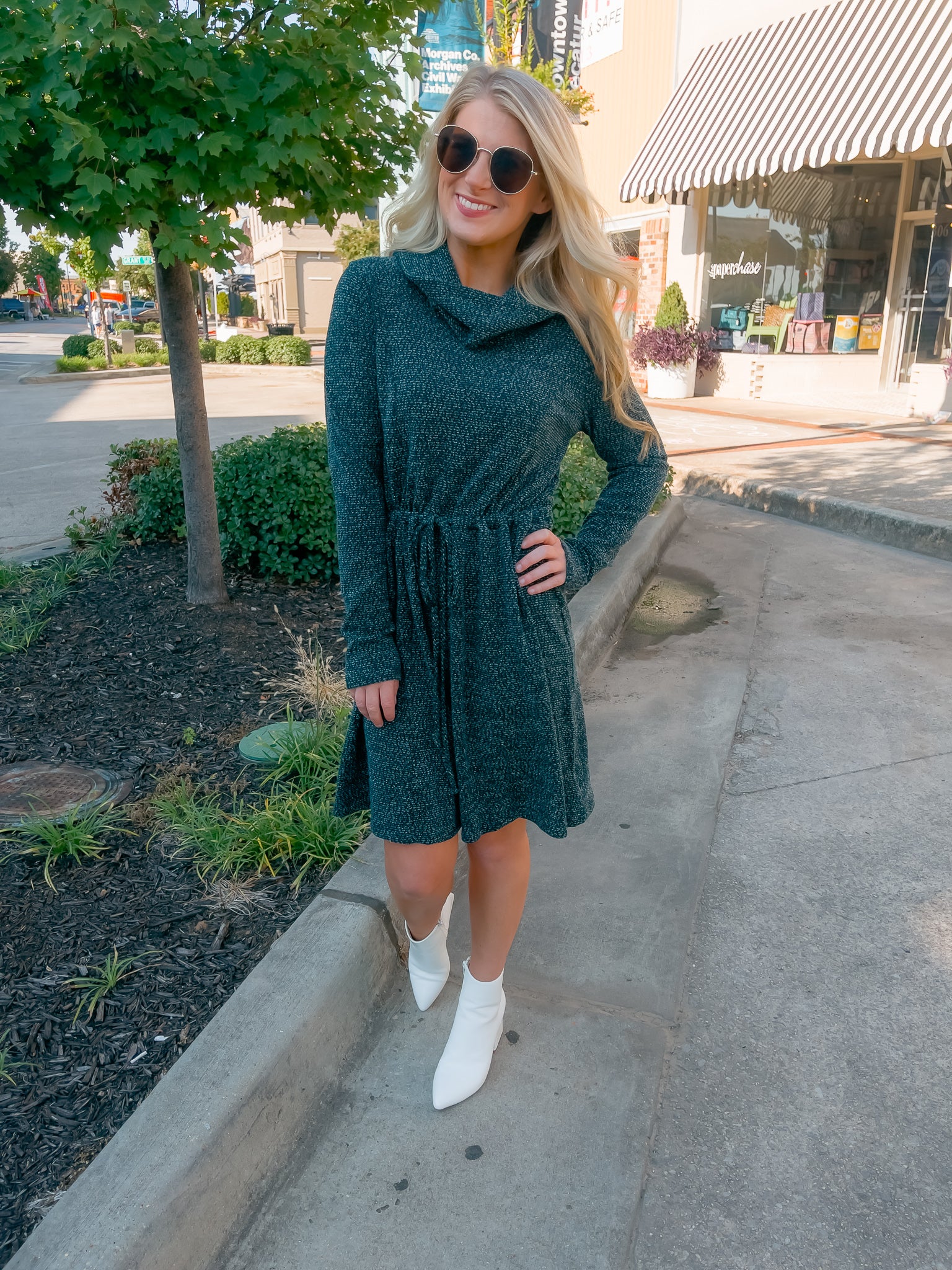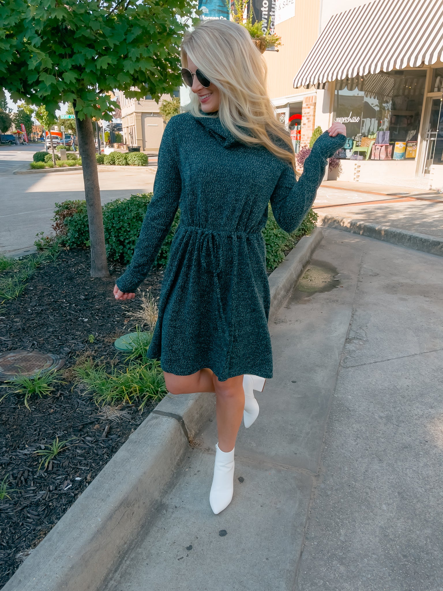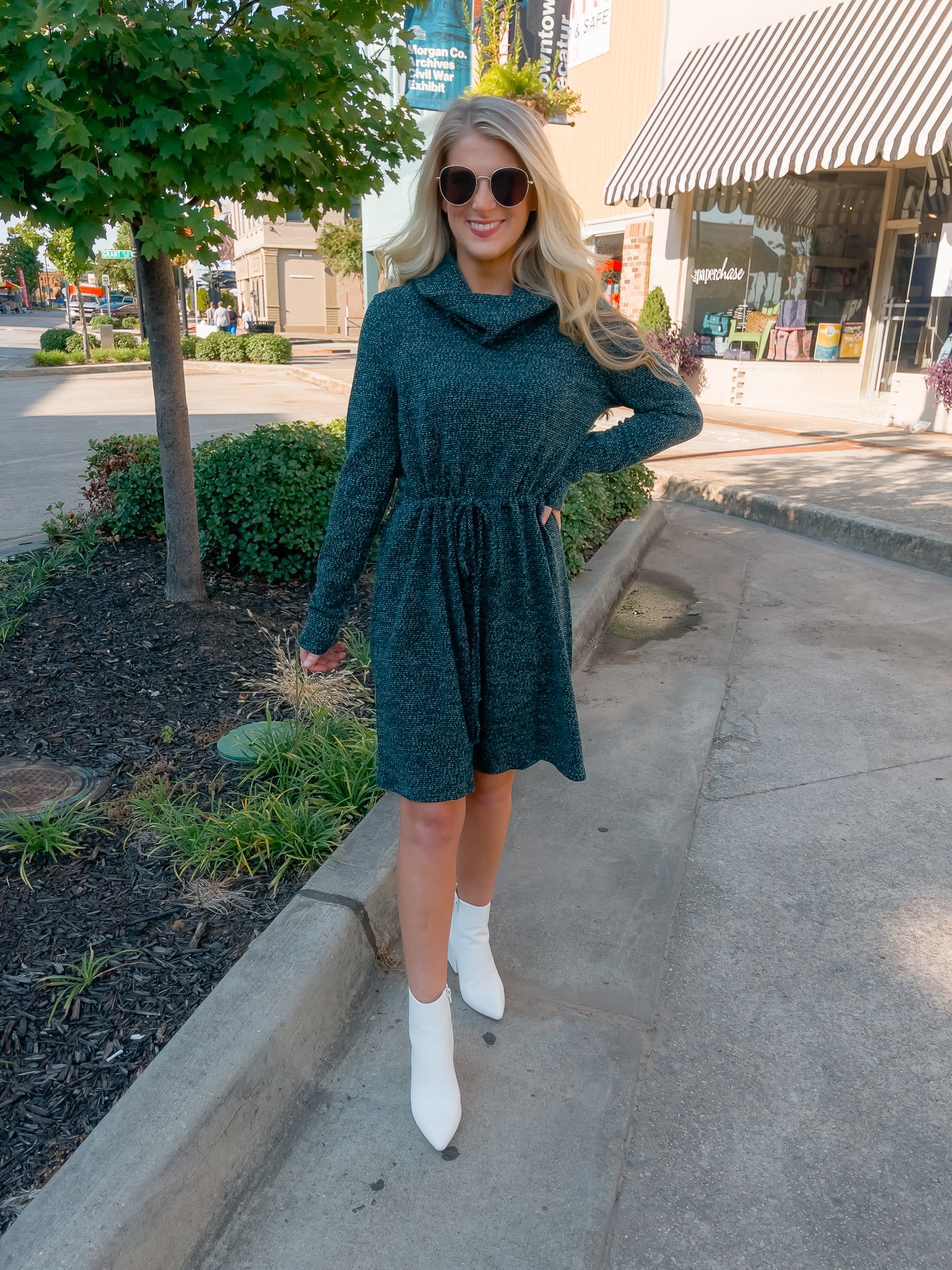 Dress features a deep hunter green color, soft sweater material, long sleeves, elastic tie drawstring, cowl neck line and runs true to size!�