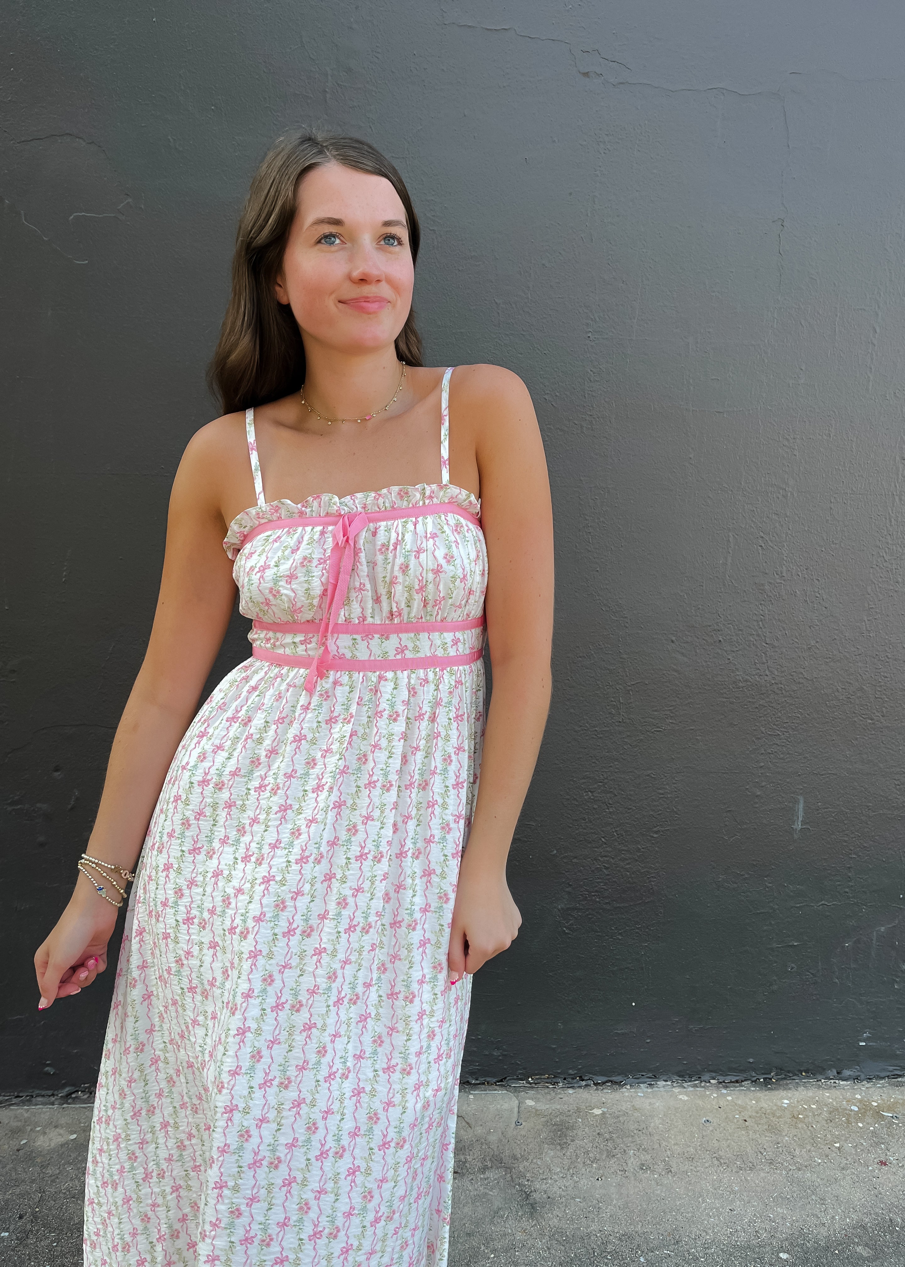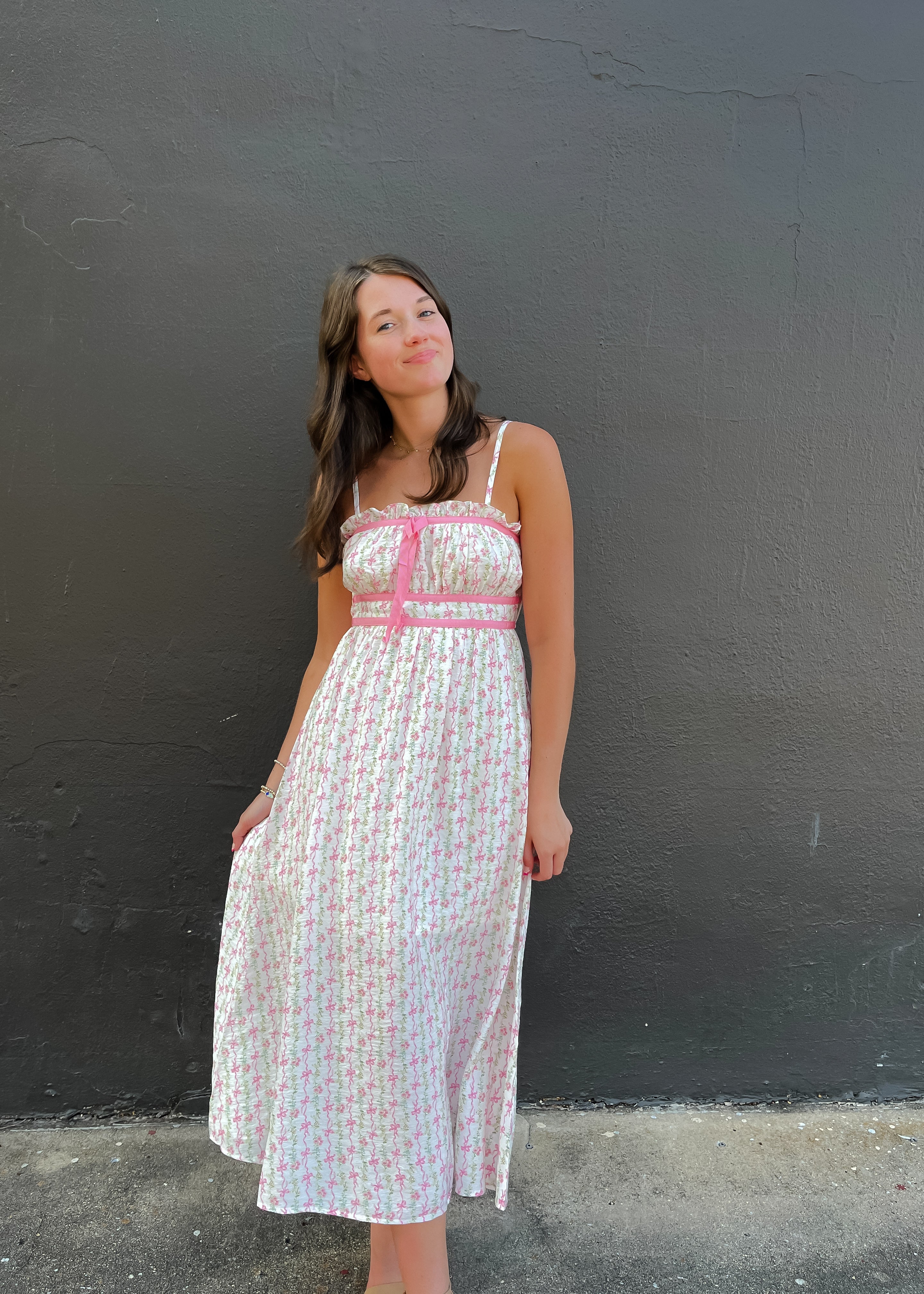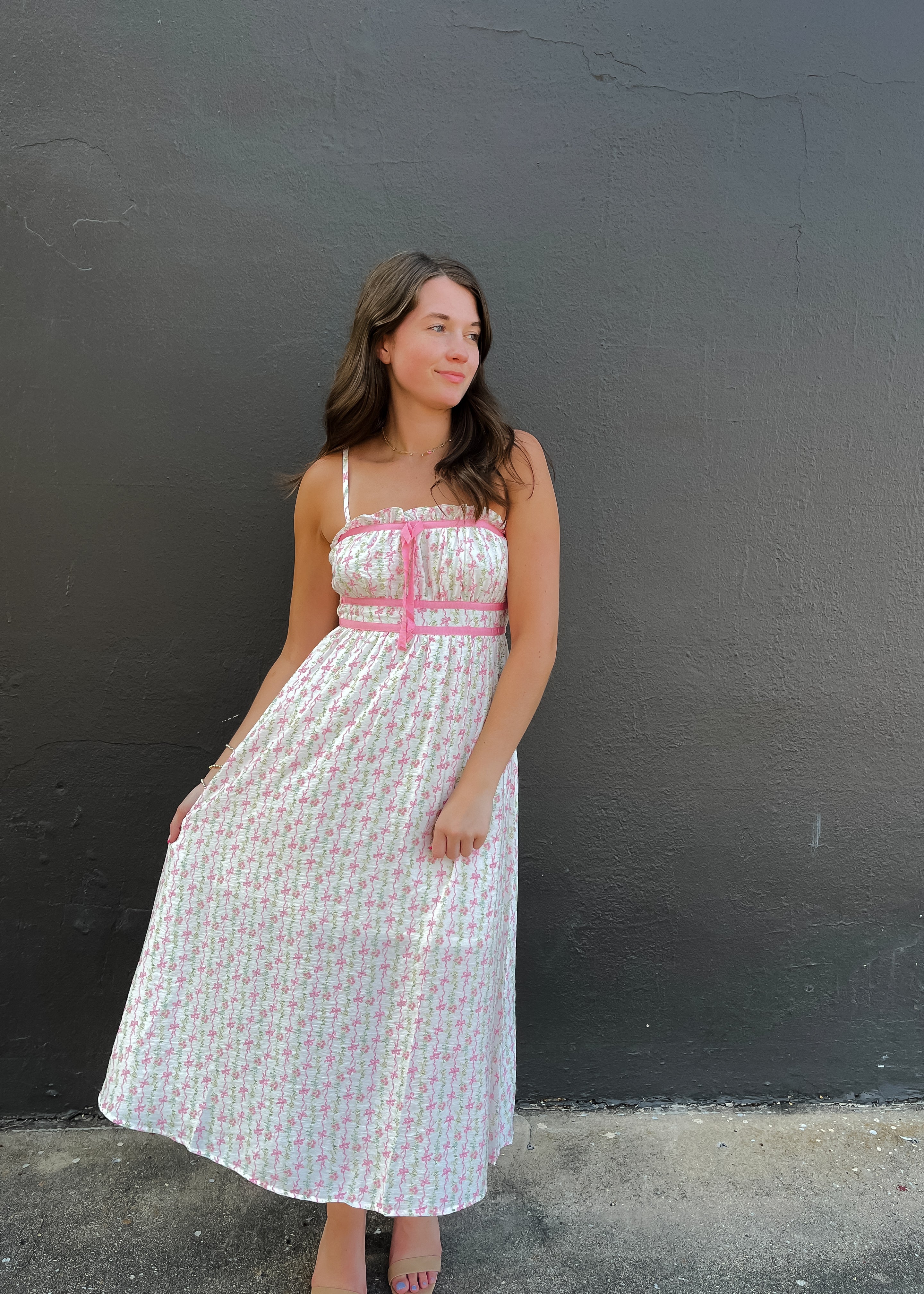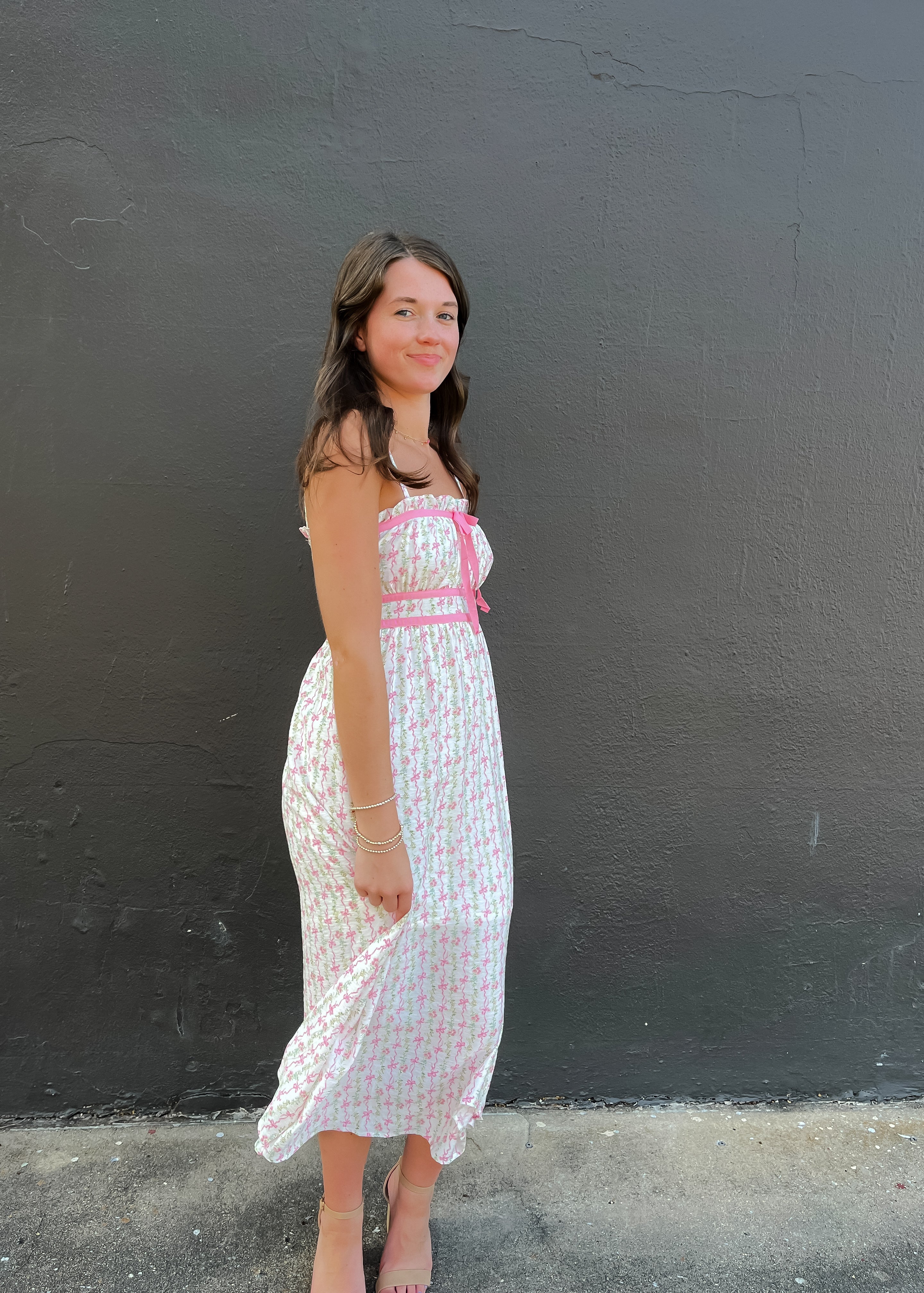 Step out in style with the Making An Entrance Midi Dress, featuring a charming floral bow pattern in vibrant pink multi tones. Its square neckline and ruffle trim add a delicate touch, while adjustable spaghetti straps ensure a perfect fit. The contrast front tie detail and elastic back waist provide flattering shaping and comfort. Fully lined for smooth wear, this midi dress combines breathable rayon and nylon with a polyester lining, making it ideal for warm days and special occasions. Elevate your wardrobe with this effortlessly feminine and flattering dress.