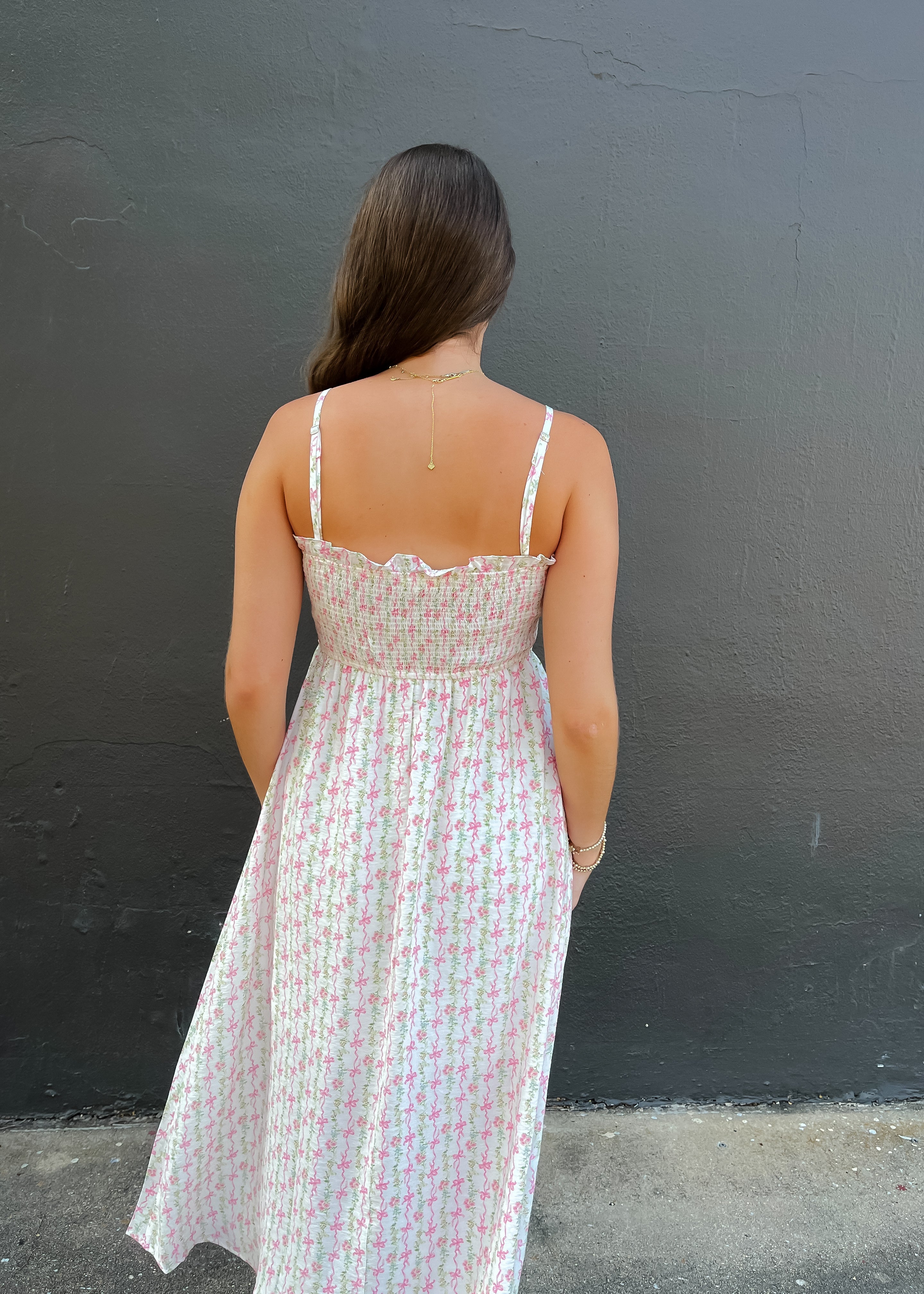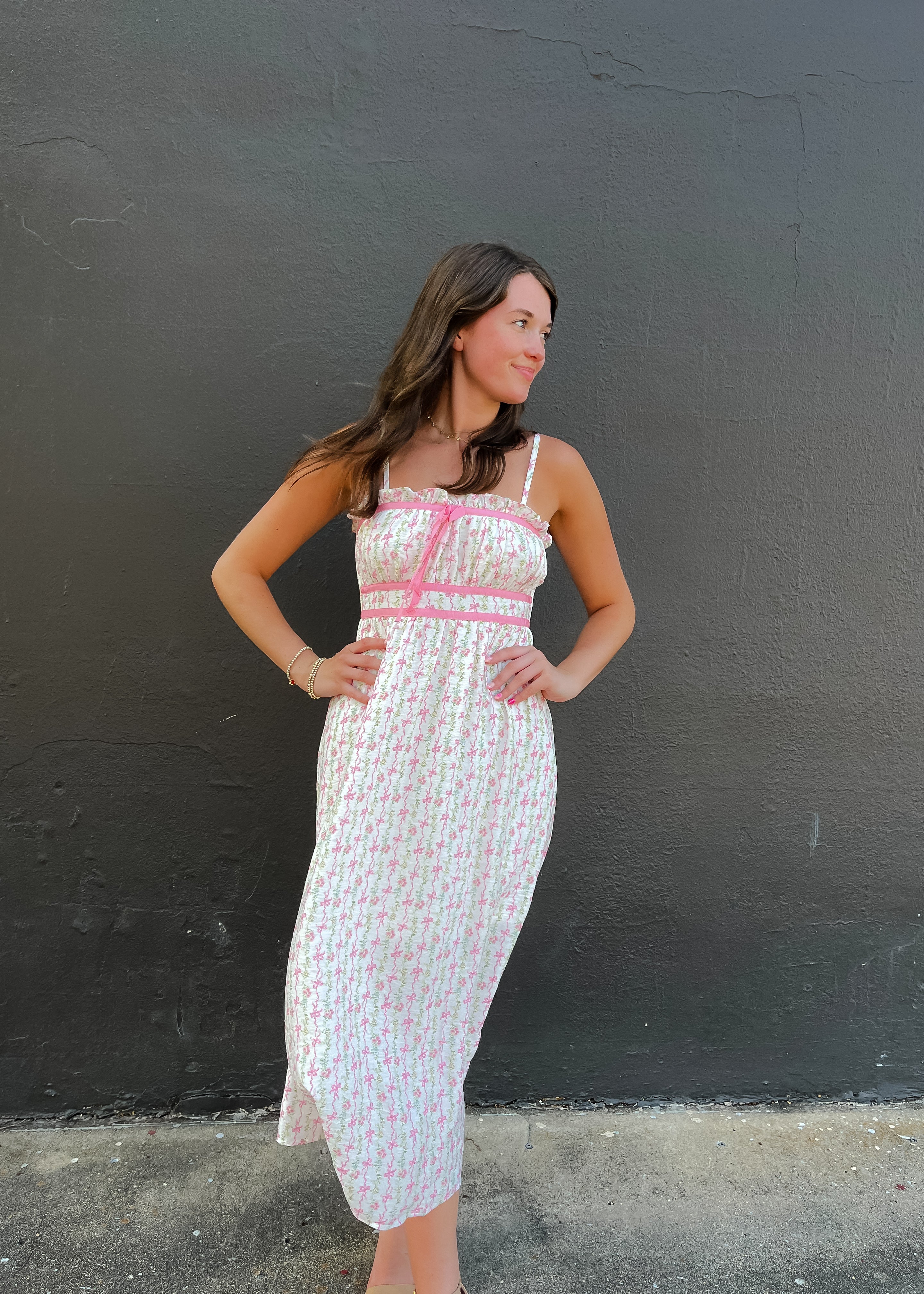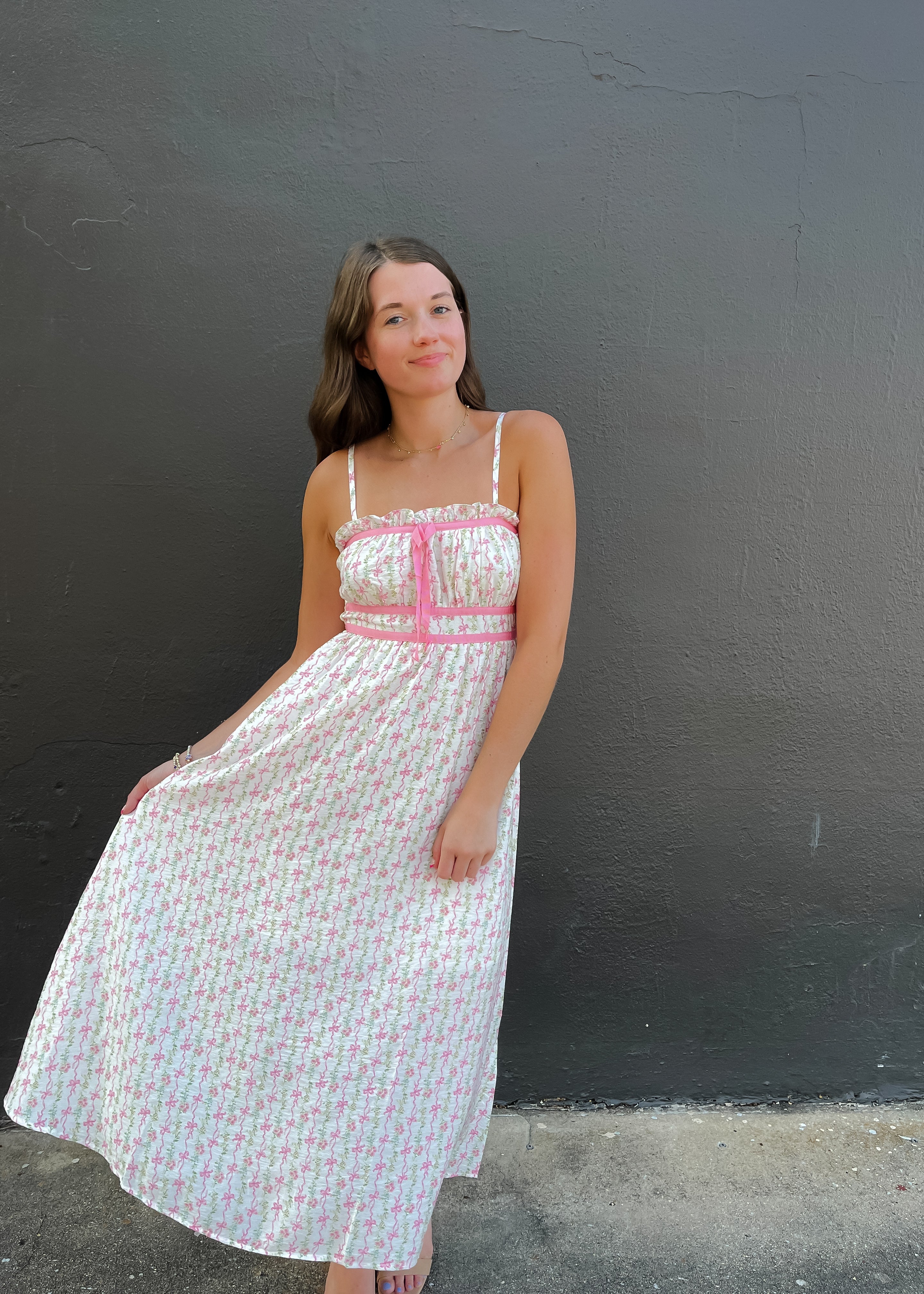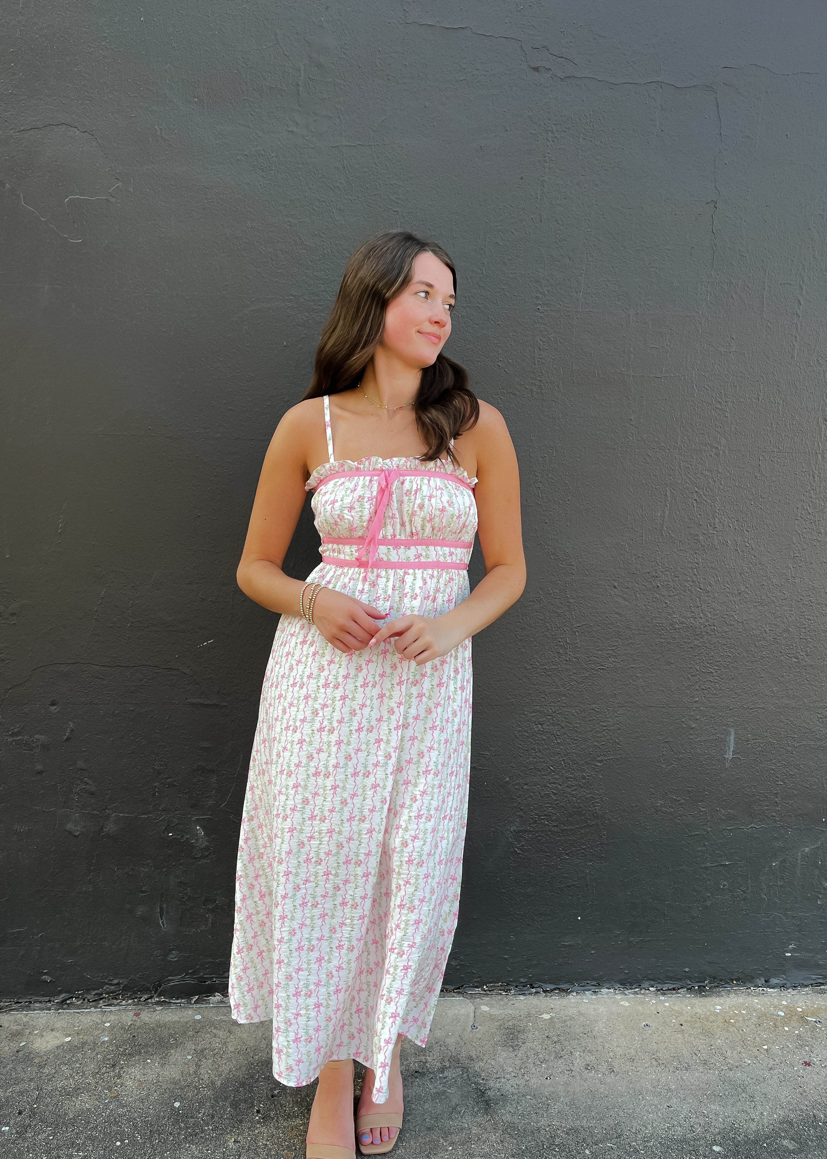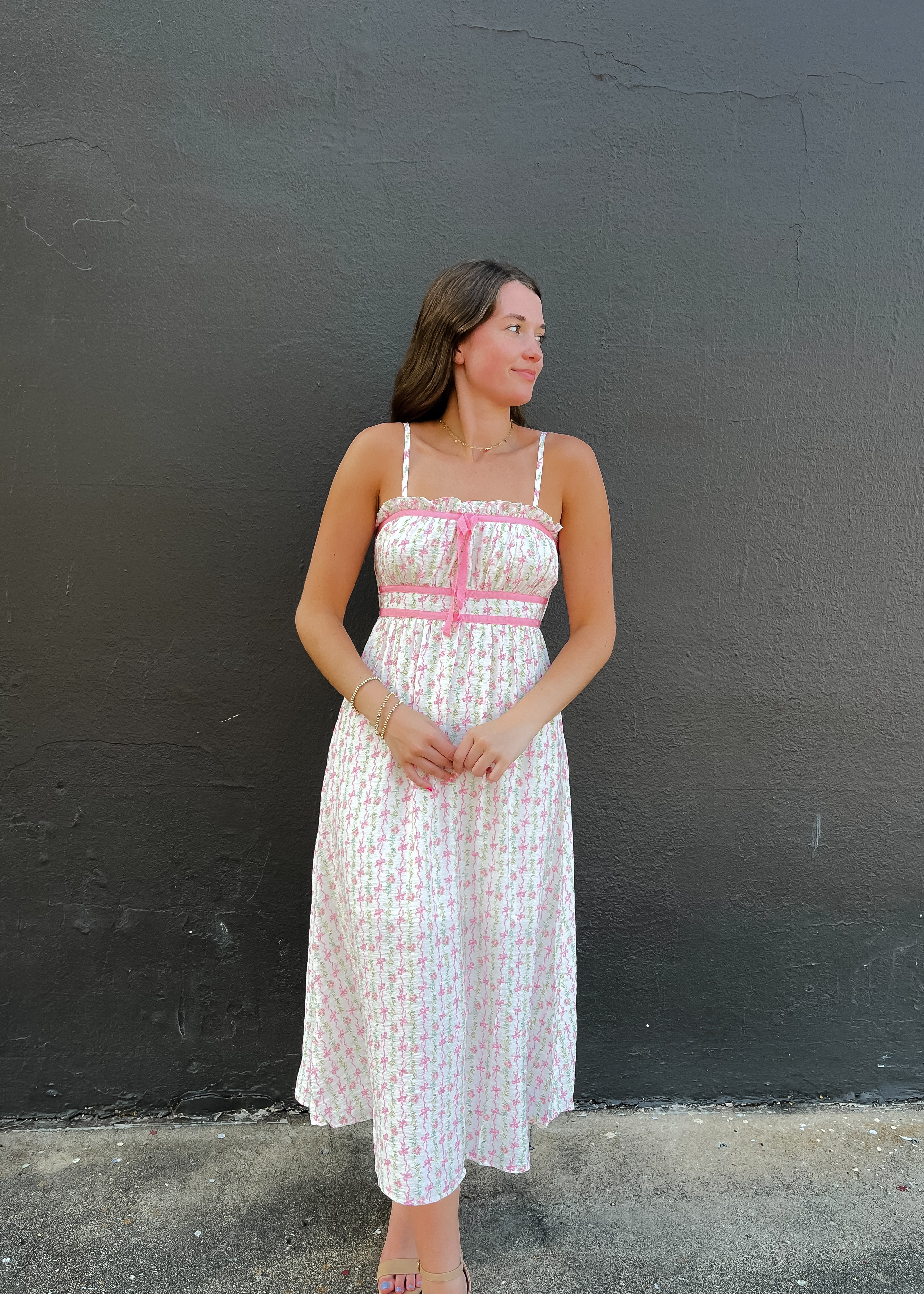 Step out in style with the Making An Entrance Midi Dress, featuring a charming floral bow pattern in vibrant pink multi tones. Its square neckline and ruffle trim add a delicate touch, while adjustable spaghetti straps ensure a perfect fit. The contrast front tie detail and elastic back waist provide flattering shaping and comfort. Fully lined for smooth wear, this midi dress combines breathable rayon and nylon with a polyester lining, making it ideal for warm days and special occasions. Elevate your wardrobe with this effortlessly feminine and flattering dress.