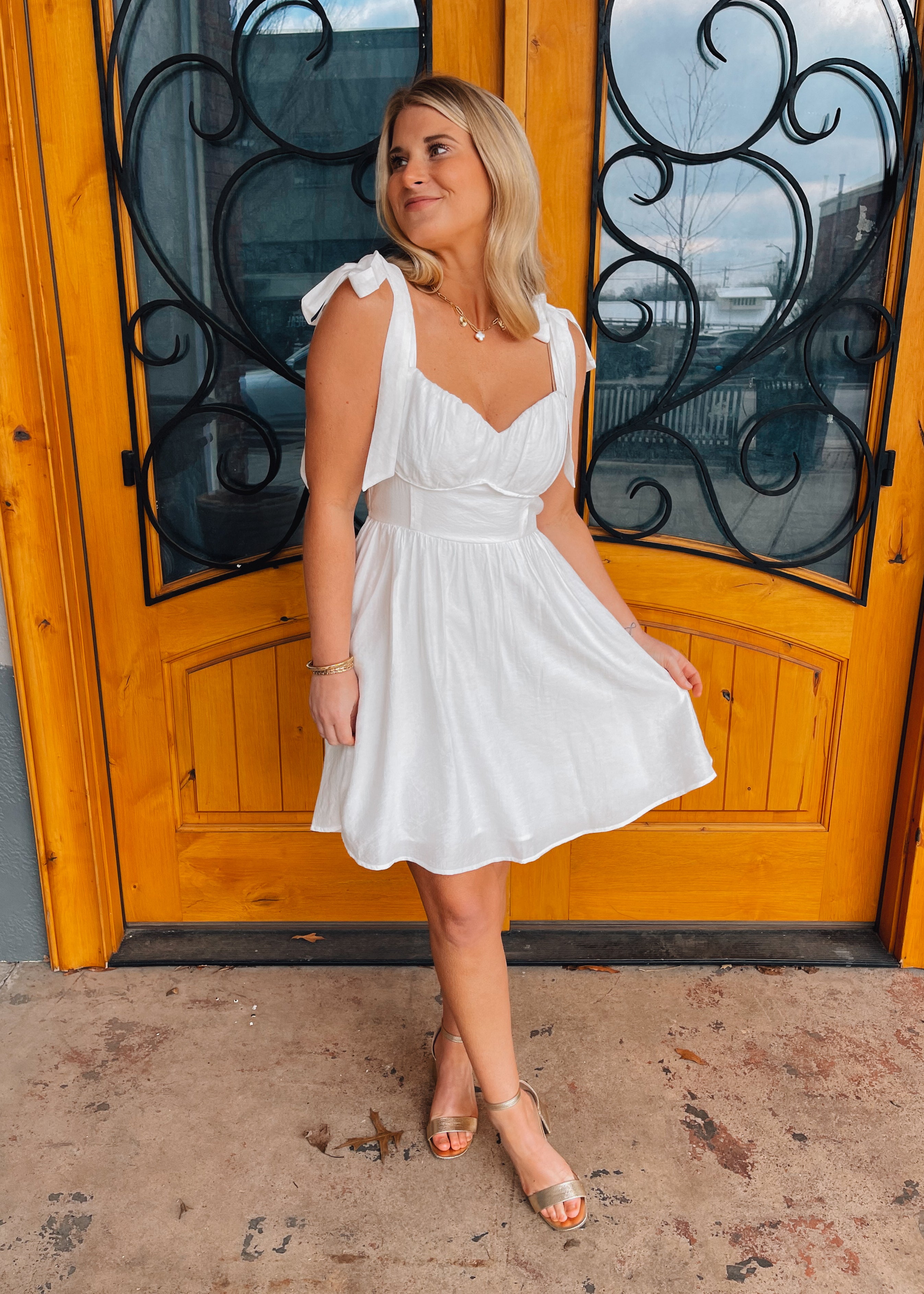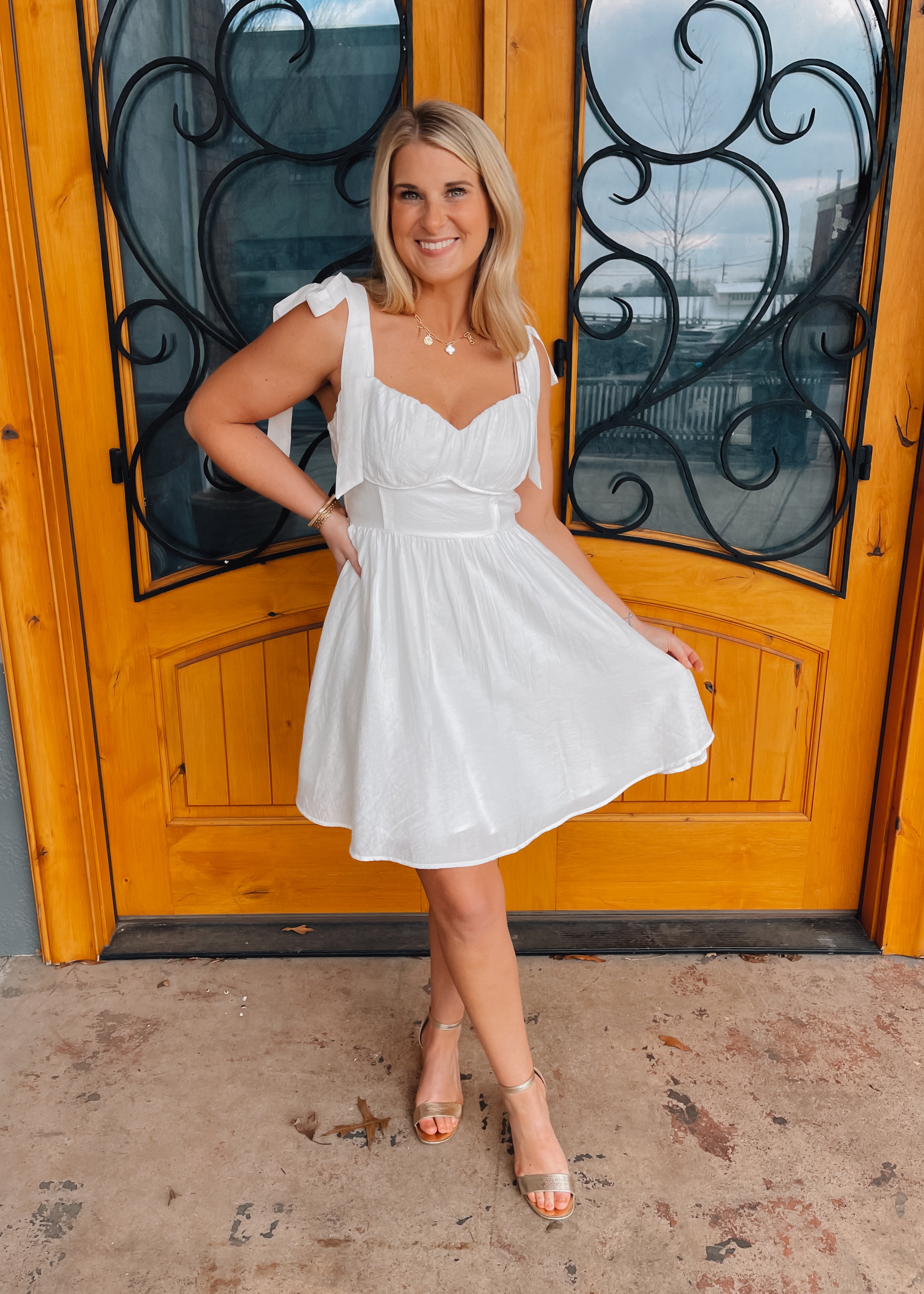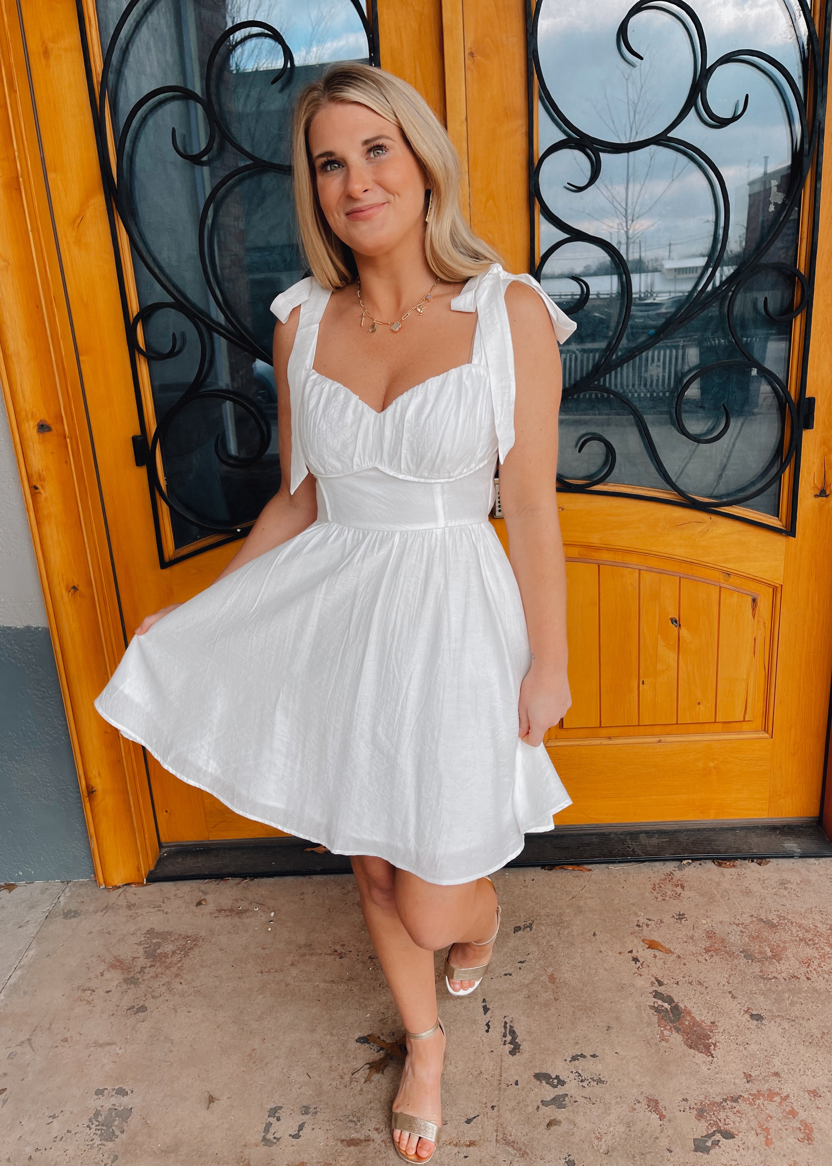 Elevate your style with our Making Promises dress, available in both light olive and white! This sleeveless mini dress features a delicate corset detail and tie strap, adding a touch of elegance to any occasion. Make a statement and turn heads with this must-have piece.