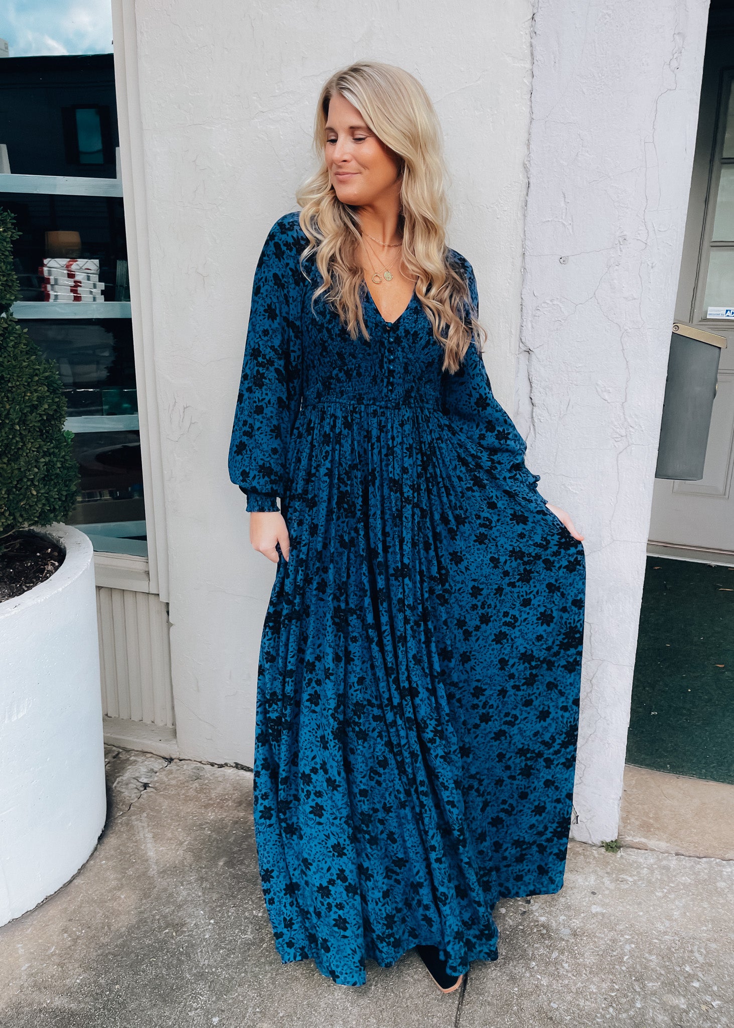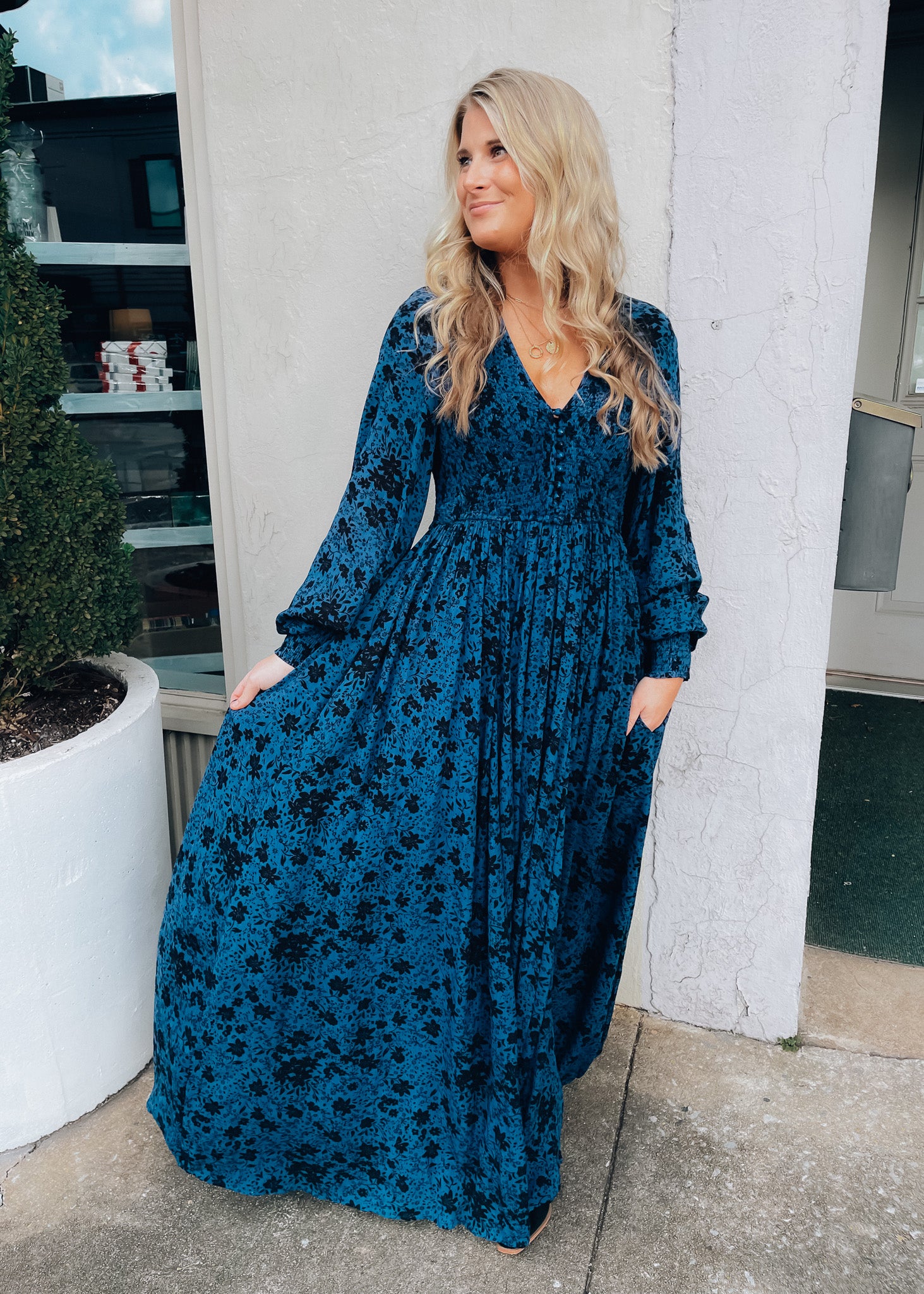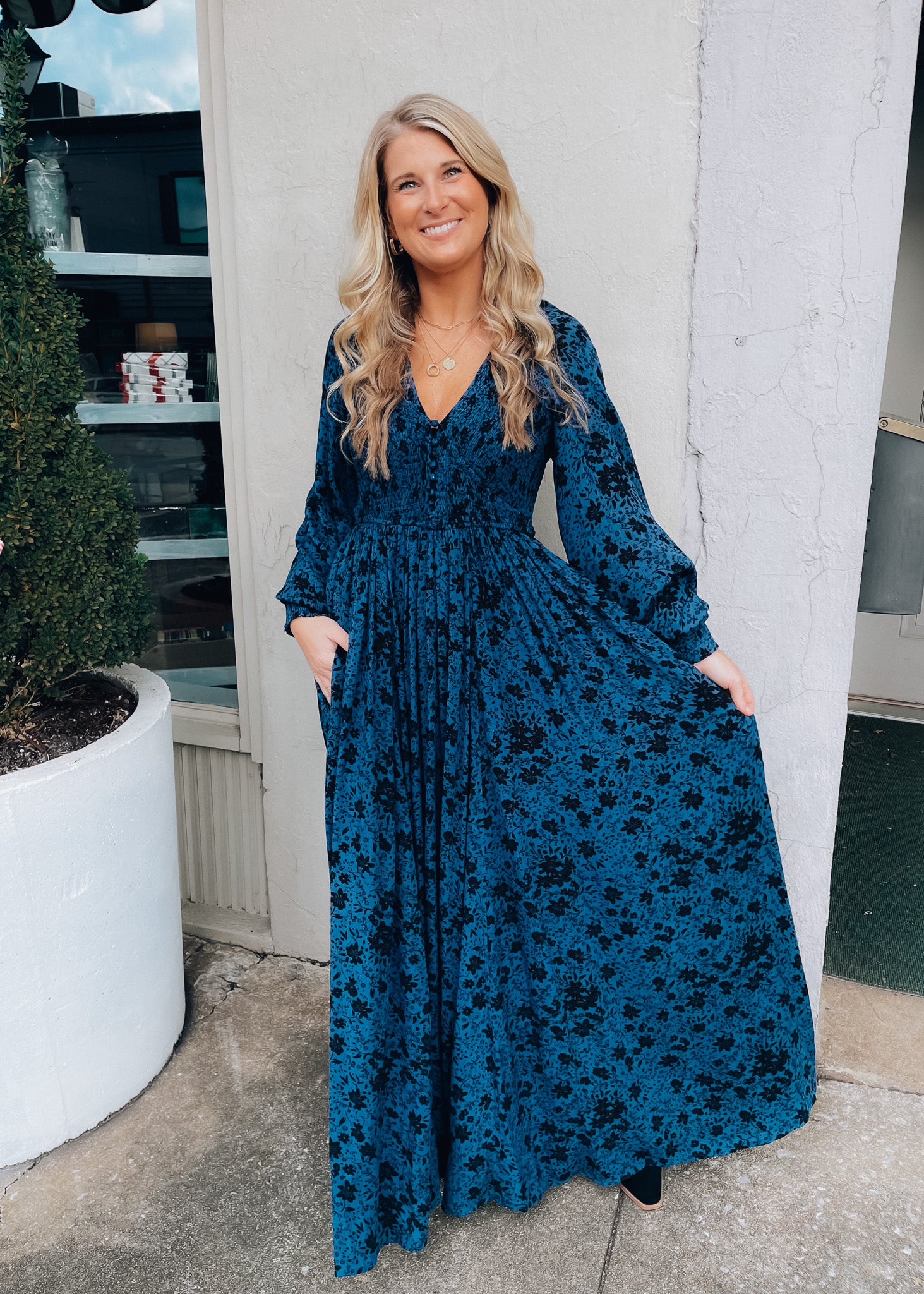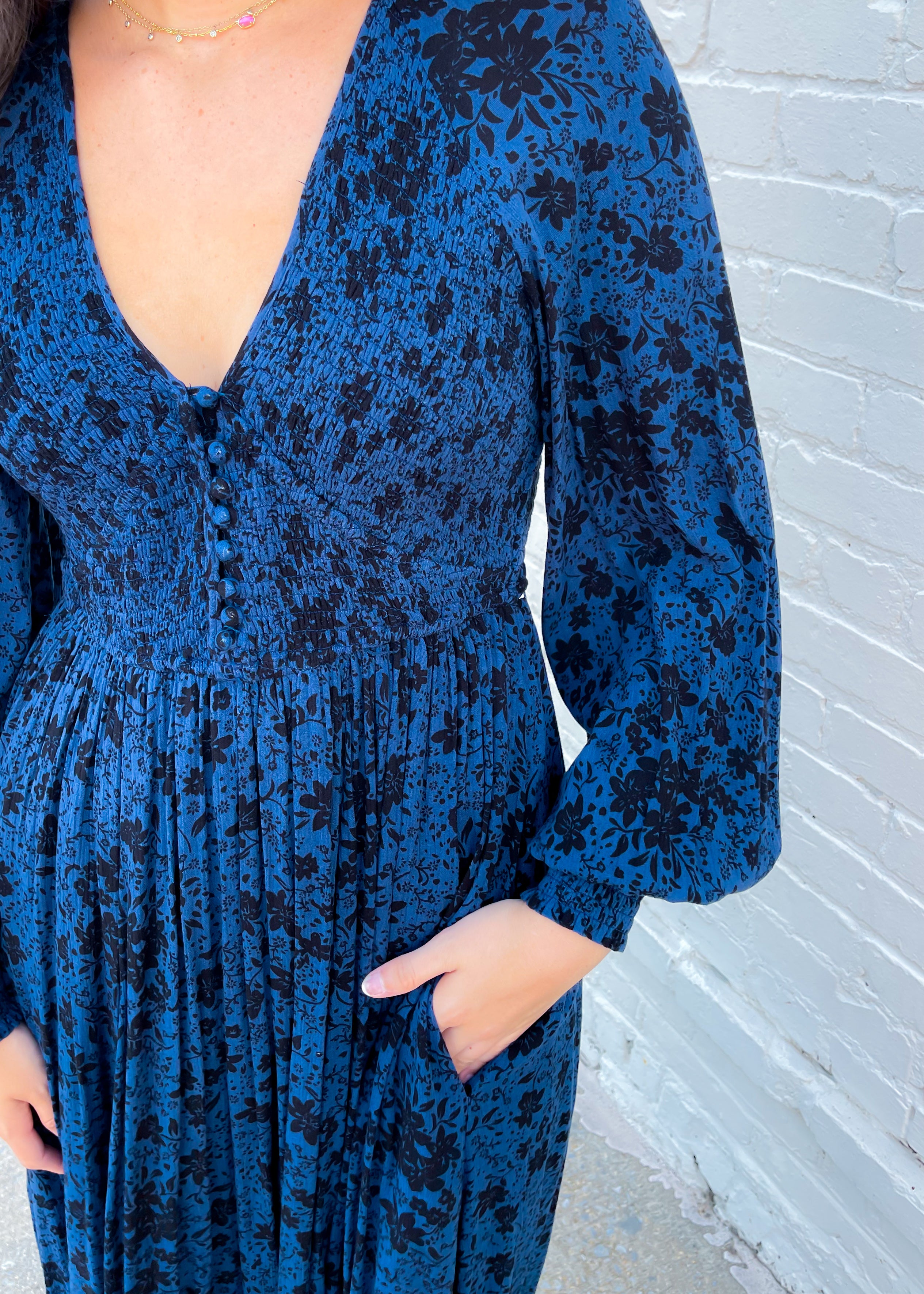 Indulge in the enchanting Midnight Magic Maxi Dress. This dark blue dress is smocked for a flattering fit, while the black floral pattern adds a touch of elegance. Button cuffed long sleeves complete the look, making it perfect for any occasion. Embrace effortless style and beauty with this must-have dress!